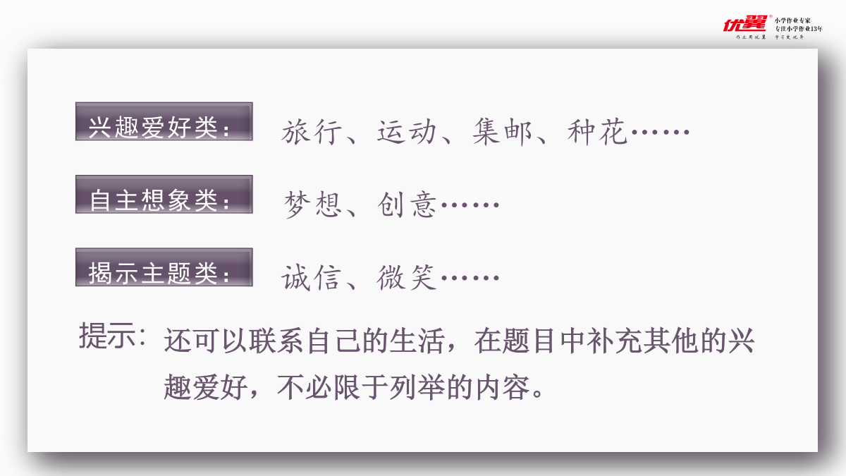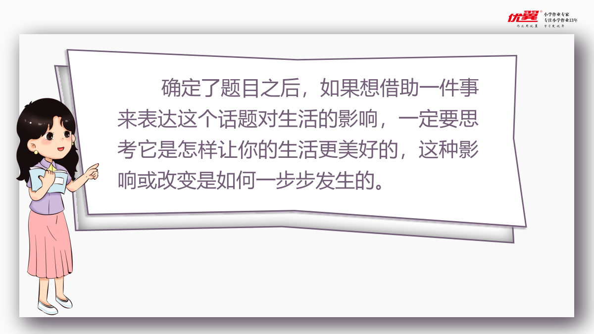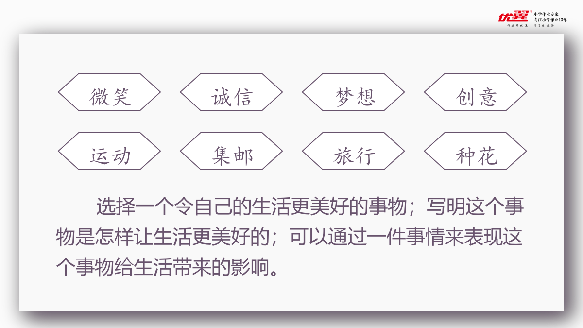 1.根据习作提示,选择一个自己感兴趣的话题进行习作。2.能围绕话题,精选典型事件,表达自己的切实感受。3.要抓住重点,突出所写事件是怎样影响自己的生活,让自己生活变得更美好的。________让生活更美好科技的发展给我们的生活带来了极大便利。现在去爷爷奶奶家可坐高铁了,比以前快了两个小时;妈妈买菜时,扫一扫二维码就能支付,非常方便、快捷。我想到的是音乐。听听音乐,唱唱歌,会让我放松、开心。我的答案是种花,把种子种下去,等它们发芽,看它们慢慢长大,很有成就感。在我们的生活当中,处处充满着爱,每时每刻都在上演
