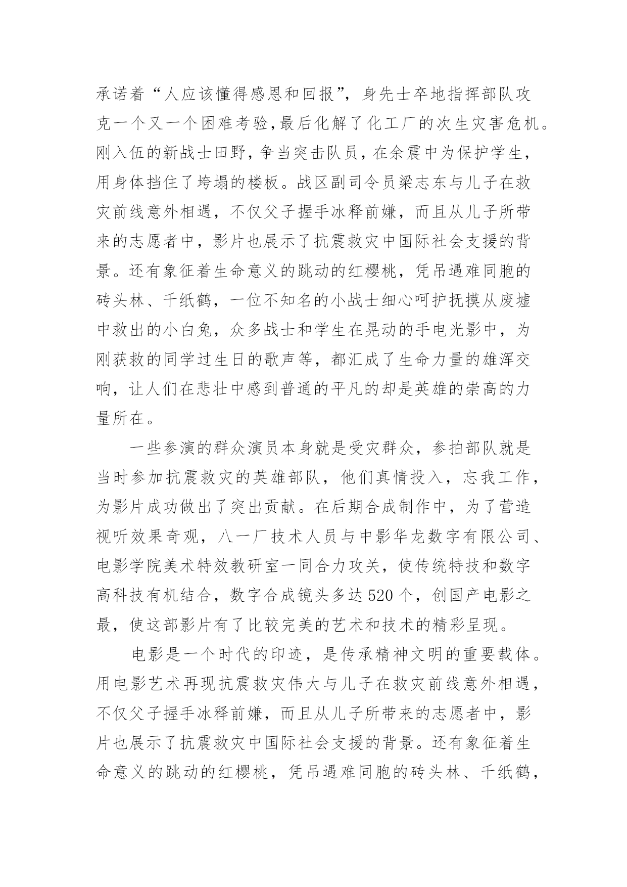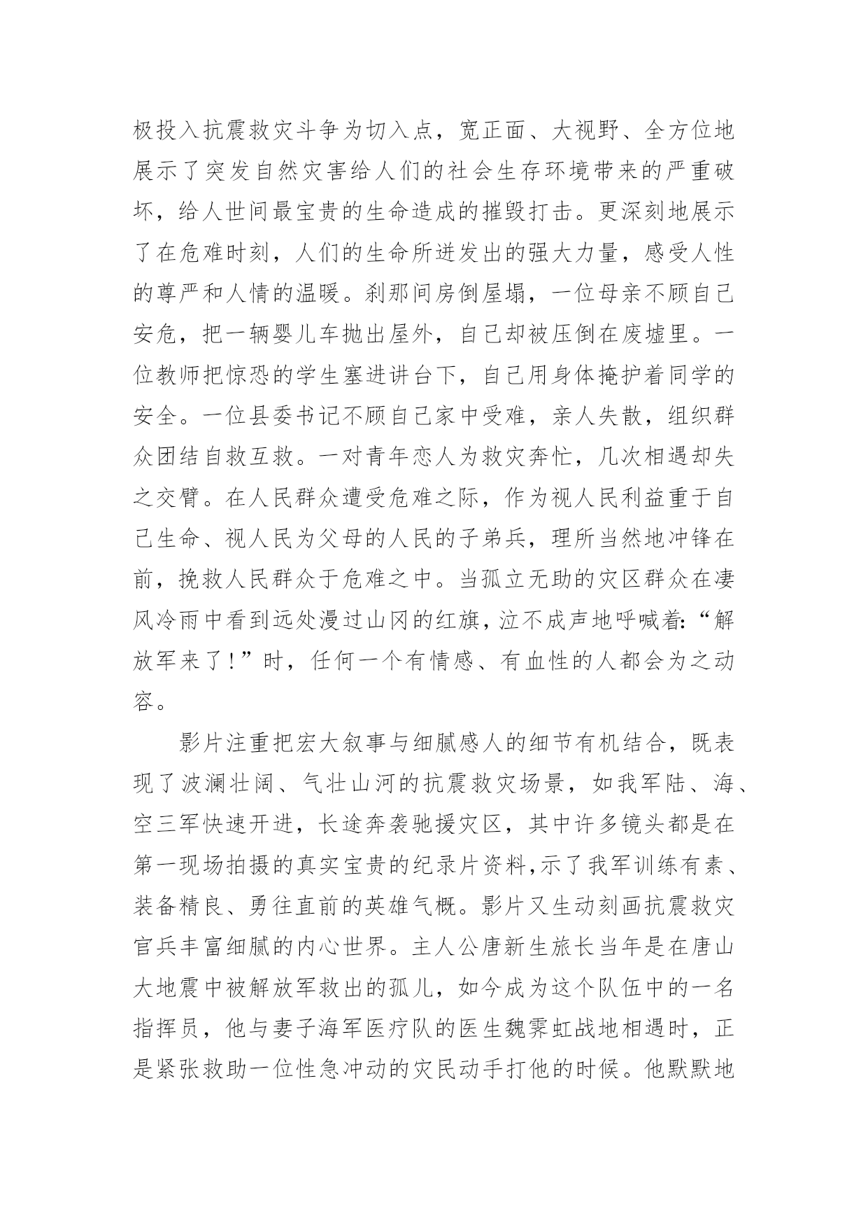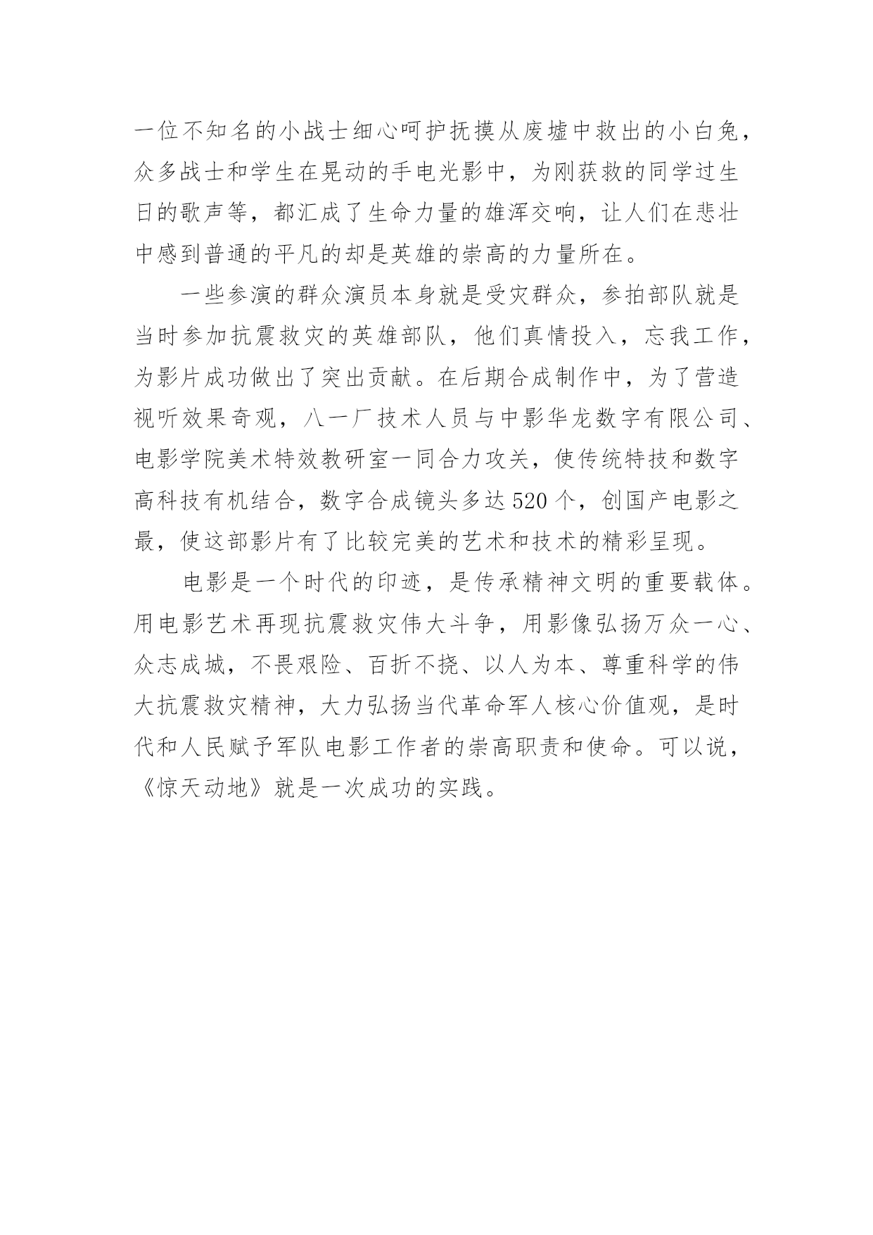 惊天动地观后感惊天动地观后感范文品味完一部作品后,这次观看让你有什么体会呢?此时需要认真地做好记录,写写观后感了。是不是无从下笔、没有头绪?下面是小编帮大家整理的惊天动地观后感范文,希望能够帮助到大家。中国成立60周年献礼故事片《惊天动地》(八一电影制片厂摄制),真实再现了去年汶川大地震的历史场景,深情展示了全国军民万众一心抗震救灾的英雄壮举和焕发出的巨大精神力量,给观众带来视觉的震撼、心灵的冲击和精神的激励。影片讲述的是我军某集团军摩托化步兵旅在进行信息化条件下作战训练演习中,突遇地震灾害,在通讯、交通中断,与上级失去联系的情况下,旅长唐新生毅然带领部队,视地震灾害为第一命令,视抢救人民生命为第一信号,历经艰难险阻,克服重重困难,在第一时间赶赴灾区,进行奋不顾身的生死救援。在战区和前线指挥部领导下,与后续赶来的各军兵种部队及专业工程技术人员一起奋战,舍生忘死地营救映川中学师生和羌寨沟受围群众,成功地化解七顶山堰塞湖险情和化工厂次生灾害危机的动人故事。影片以纪实的风格、平实的手法,从一个摩步旅官兵积极投入抗震救灾斗争为切入点,宽正面、大视野、全方位地展示了突发自然灾害给人们的社会生存环境带来的严重破坏,给人世间最宝贵的生命造成的摧毁打击。更深刻地展示了在危难时刻,人们的生命所迸发出的强大力量,感受人性的尊严和人情的温暖。刹那间房倒屋塌,一位母亲不顾自己安危,把一辆婴儿车抛出屋外,自己却被压倒在废墟里。一位教师把惊恐的学生塞进讲台下,自己用身体掩护着同学的安全。一位县委书记不顾自己家中受难,亲人失散,组织群众团结自救互救。一对青年恋人为救灾奔忙,几次相遇却失之交臂。在人民群众遭受危难之际,作为视人民利益重于自己生命、视人民为父母的人民的子弟兵,理所当然地冲锋在前,挽救人民群众于危难之中。当孤立无助的灾区群众在凄风冷雨中看到远处漫过山冈的红旗,泣不成声地呼喊着:“解放军来了!”时,任何一个有情感、有血性的人都会为之动容。影片注重把宏大叙事与细腻感人的细节有机结合,既表现了波澜壮阔、气壮山河的抗震救灾场景,如我军陆、海、空三军快速开进,长途奔袭驰援灾区,其中许多镜头都是在第一现场拍摄的真实宝贵的纪录片资料,示了我军训练有素、装备精良、勇往直前的英雄气概。影片又生动刻画抗震救灾官兵丰富细腻的内心世界。主人公唐新生旅长当年是在唐山大地震中被解放军救出的孤儿,如今成为这个队伍中的一名指挥员,他与妻子海军医疗队的医生魏霁虹战地相遇时,正是紧张救助一位性急冲动的灾民动手打他的时候。他默默地承诺着“人应该懂得感恩和回报”,身先士卒地指挥部队攻克一个又一个困难考验,最后化解了化工厂的次生灾害危机。刚入伍的新战士田野,争当突击队员,在余震中为保护学生,用身体挡住了垮塌的楼板。战区副司令员梁志东与儿子在救灾前线意外相遇,不仅父子握手冰释前嫌,而且从儿子所带来的志愿者中,影片也展示了抗震救灾中国际社会支援的背景。还有象征着生命意义的跳动的红樱桃,凭吊遇难同胞的砖头林、千纸鹤,一位不知名的小战士细心呵护抚摸从废墟中救出的小白兔,众多战士和学生在晃动的手电光影中,为刚获救的同学过生日的歌声等,都汇成了生命力量的雄浑交响,让人们在悲壮中感到普通的平凡的却是英雄的崇高的力量所在。一些参演的群众演员本身就是受灾群众,参拍部队就是当时参加抗震救灾的英雄部队,他们真情投入,忘我工作,为影片成功做出了突出贡献。在后期合成制作中,为了营造视听效果奇观,八一厂技术人员与中影华龙数字有限公司、电影学院美术特效教研室一同合力攻关,使传统特技和数字高科技有机结合,数字合成镜头多达520个,创国产电影之最,使这部影片有了比较完美的艺术和技术的精彩呈现。电影是一个时代的印迹,是传承精神文明的重要载体。用电影艺术再现抗震救灾伟大与儿子在救灾前线意外相遇,不仅父子握手冰释前嫌,而且从儿子所带来的志愿者中,影片也展示了抗震救灾中国际社会支援的背景。还有象征着生命意义的跳动的红樱桃,凭吊遇难同胞的砖头林、千纸鹤,一位不知名的小战士细心呵护抚摸从废墟中救出的小白兔,众多战士和学生在晃动的手电光影中,为刚获救的同学过生日的歌声等,都汇成了生命力量的雄浑交响,让人们在悲壮中感到普通的平凡的却是英雄的崇高的力量所在。一些参演的群众演员本身就是受灾群众,参拍部队就是当时参加抗震救灾的英雄部队,他们真情投入,忘我工作,为影片成功做出了突出贡献。在后期合成制作中,为了营造视听效果奇观,八一厂技术人员与中影华龙数字有限公司、电影学院美术特效教研室一同合力攻关,使传统特技和数字高科技有机结合,数字合成镜头多达520个,创国产电影之最,使这部影片有了比较完美的艺术和技术的精彩呈现。电影是一个时代的印迹,是传承精神文明的重要载体。用电影艺术再现抗震救灾伟大斗争,用影像弘扬万众一心、众志成城,不畏艰险、百折不