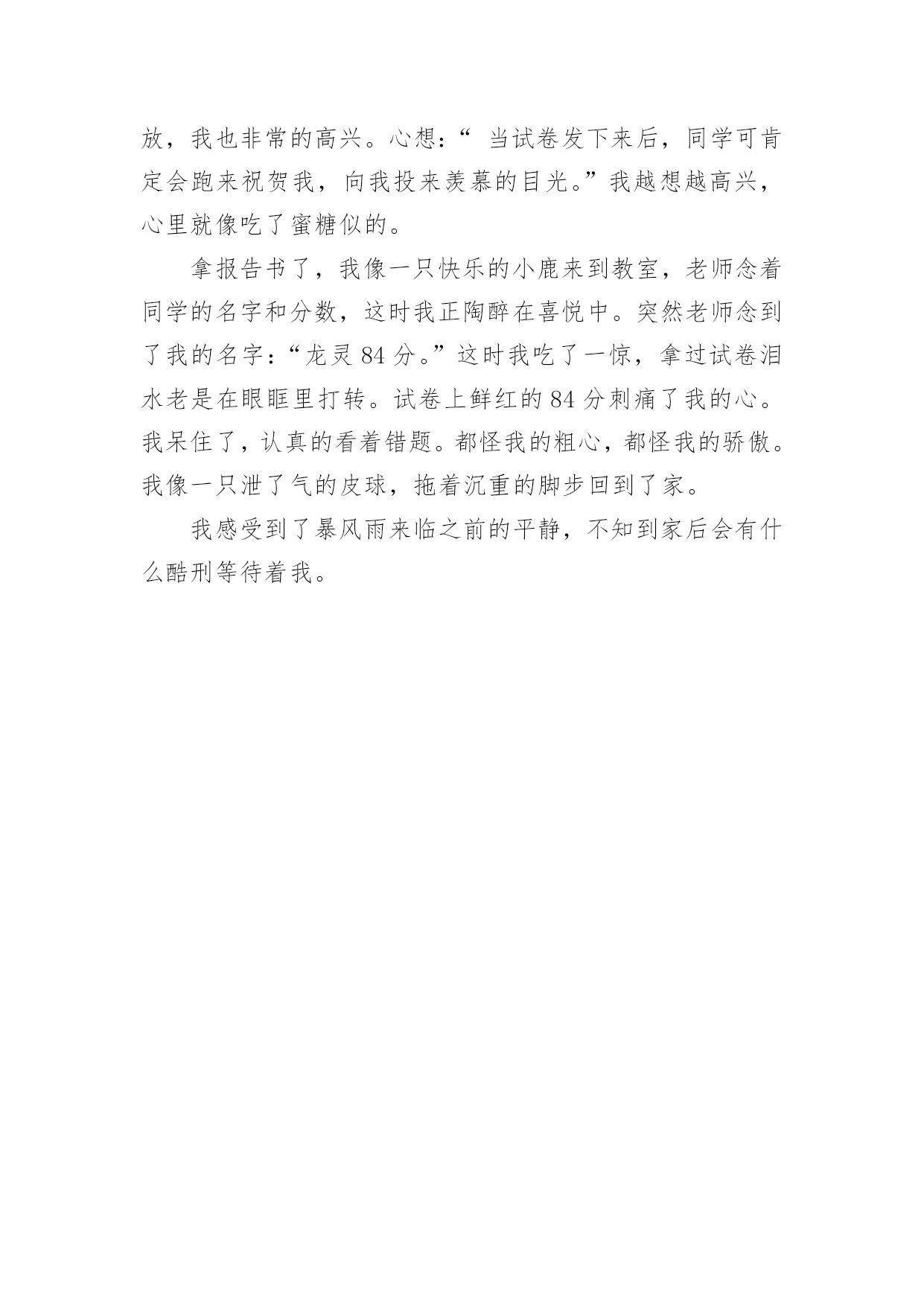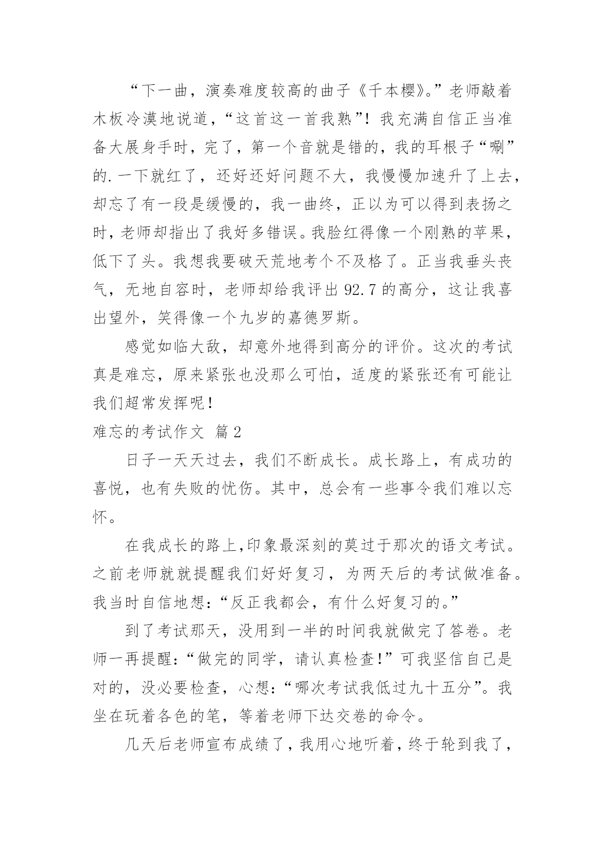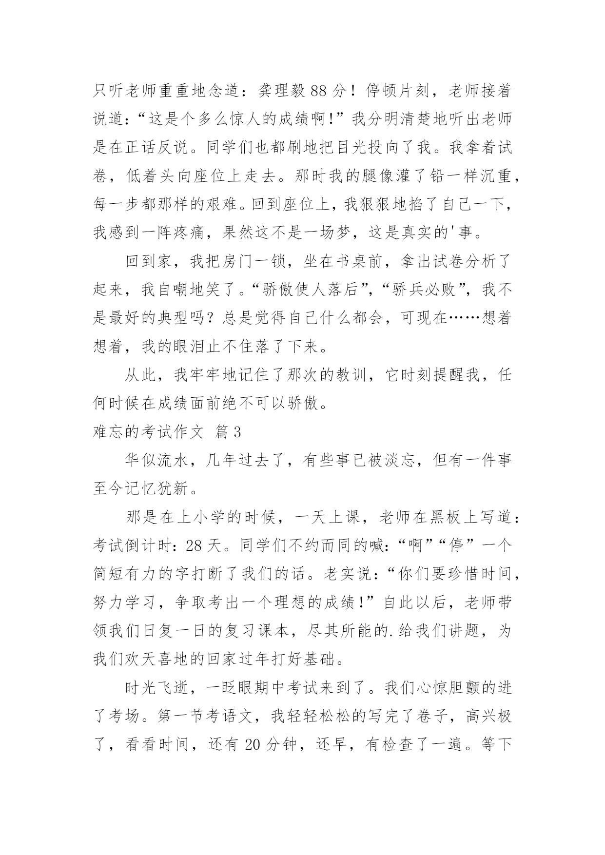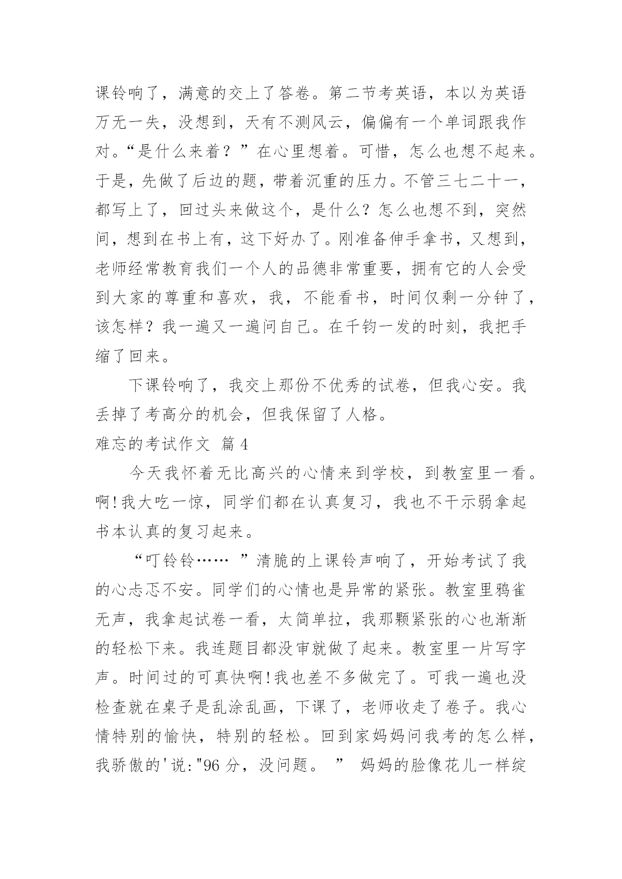 难忘的考试作文难忘的考试作文优秀(4篇)无论是在学校还是在社会中,大家总少不了接触作文吧,写作文是培养人们的观察力、联想力、想象力、思考力和记忆力的重要手段。相信写作文是一个让许多人都头痛的问题,以下是小编帮大家整理的难忘的考试作文4篇,希望对大家有所帮助。难忘的考试作文篇1人生中有无数个四十分钟,有人认为这个时间是短暂的,有人认为是漫长的,而我最难忘的那令我最紧张的四十分钟。那个星期天,我像以前一样来到琴行上课,不同的是,换成了何老师来教我。谁知老师一上来就考我钢琴曲的熟练度。我顿时觉得一团乌云在我的头上打转:糟糕,这段时间正好忙着期中考试,根本没有好好练琴,这下要出糗了。想到这,我的心跳不禁加快,像有一只小兔子在我的怀里还七上八下地跳。我一抬头,正好迎上何老师那充满期待的目光,只好硬着头皮来到钢琴面前,坐了下去。“先弹一下《贝加尔湖畔》。”什么?怕什么来什么,这是我最不熟的一首!我慢慢地将抖动的双手放在了琴键上,我望了望外面,按响了琴键……一曲终了,表面上风平浪静,毫无波澜,可内心却是波涛起伏,汹涌澎湃。我不给力的双脚还在不停抖动,我强烈按住双脚,奈何他依旧抖到不停,手心里也渗出了不少汗水。“下一曲,演奏难度较高的曲子《千本樱》。”老师敲着木板冷漠地说道,“这首这一首我熟”!我充满自信正当准备大展身手时,完了,第一个音就是错的,我的耳根子“唰”的.一下就红了,还好还好问题不大,我慢慢加速升了上去,却忘了有一段是缓慢的,我一曲终,正以为可以得到表扬之时,老师却指出了我好多错误。我脸红得像一个刚熟的苹果,低下了头。我想我要破天荒地考个不及格了。正当我垂头丧气,无地自容时,老师却给我评出92.7的高分,这让我喜出望外,笑得像一个九岁的嘉德罗斯。感觉如临大敌,却意外地得到高分的评价。这次的考试真是难忘,原来紧张也没那么可怕,适度的紧张还有可能让我们超常发挥呢!难忘的考试作文篇2日子一天天过去,我们不断成长。成长路上,有成功的喜悦,也有失败的忧伤。其中,总会有一些事令我们难以忘怀。在我成长的路上,印象最深刻的莫过于那次的语文考试。之前老师就就提醒我们好好复习,为两天后的考试做准备。我当时自信地想:“反正我都会,有什么好复习的。”到了考试那天,没用到一半的时间我就做完了答卷。老师一再提醒:“做完的同学,请认真检查!”可我坚信自己是对的,没必要检查,心想:“哪次考试我低过九十五分”。我坐在玩着各色的笔,等着老师下达交卷的命令。几天后老师宣布成绩了,我用心地听着,终于轮到我了,只听老师重重地念道:龚理毅88分!停顿片刻,老师接着说道:“这是个多么惊人的成绩啊!”我分明清楚地听出老师是在正话反说。同学们也都刷地把目光投向了我。我拿着试卷,低着头向座位上走去。那时我的腿像灌了铅一样沉重,每一步都那样的艰难。回到座位上,我狠狠地掐了自己一下,我感到一阵疼痛,果然这不是一场梦,这是真实的'事。回到家,我把房门一锁,坐在书桌前,拿出试卷分析了起来,我自嘲地笑了。“骄傲使人落后”,“骄兵必败”,我不是最好的典型吗?总是觉得自己什么都会,可现在……想着想着,我的眼泪止不住落了下来。从此,我牢牢地记住了那次的教训,它时刻提醒我,任何时候在成绩面前绝不可以骄傲。难忘的考试作文篇3华似流水,几年过去了,有些事已被淡忘,但有一件事至今记忆犹新。那是在上小学的时候,一天上课,老师在黑板上写道:考试倒计时:28天。同学们不约而同的喊:“啊”“停”一个简短有力的字打断了我们的话。老实说:“你们要珍惜时间,努力学习,争取考出一个理想的成绩!”自此以后,老师带领我们日复一日的复习课本,尽其所能的.给我们讲题,为我们欢天喜地的回家过年打好基础。时光飞逝,一眨眼期中考试来到了。我们心惊胆颤的进了考场。第一节考语文,我轻轻松松的写完了卷子,高兴极了,看看时间,还有20分钟,还早,有检查了一遍。等下课铃响了,满意的交上了答卷。第二节考英语,本以为英语万无一失,没想到,天有不测风云,偏偏有一个单词跟我作对。“是什么来着?”在心里想着。可惜,怎么也想不起来。于是,先做了后边的题,带着沉重的压力。不管三七二十一,都写上了,回过头来做这个,是什么?怎么也想不到,突然间,想到在书上有,这下好办了。刚准备伸手拿书,又想到,老师经常教育我们一个人的品德非常重要,拥有它的人会受到大家的尊重和喜欢,我,不能看书,时间仅剩一分钟了,该怎样?我一遍又一遍问自己。在千钧一发的时刻,我把手缩了回来。下课铃响了,我交上那份不优秀的试卷,但我心安。我丢掉了考高分的机会,但我保留了人格。难忘的考试作文篇4今天我怀着无比高兴的心情来到学校,到教室里一看。啊!我大吃一惊,同学们都在认真复习,我也不干示弱拿起书本认真的复习起来。“叮铃铃……”清脆的上课铃声响了,开始考试了我的心忐忑不安。同学们的心情也是异常的紧