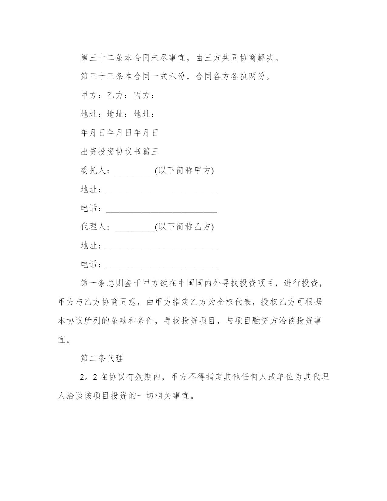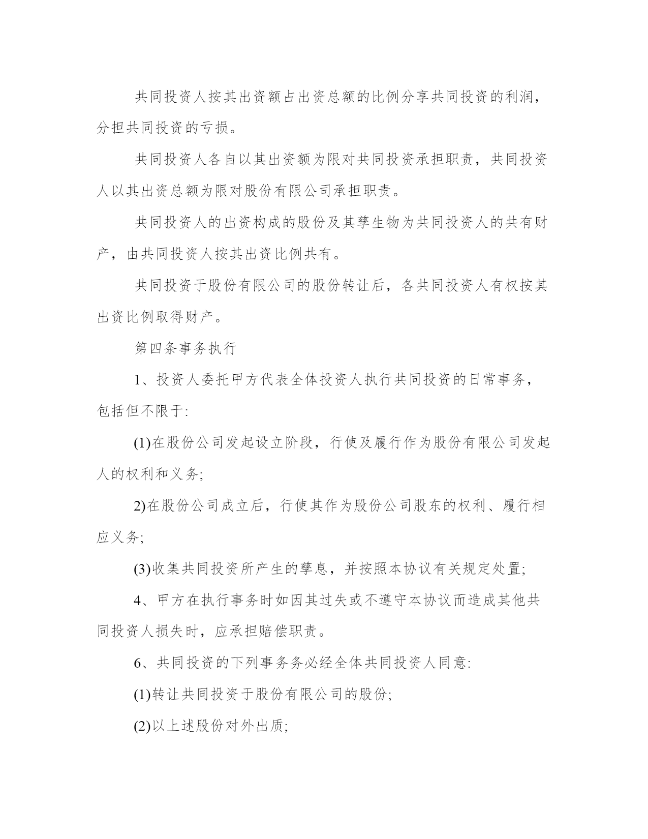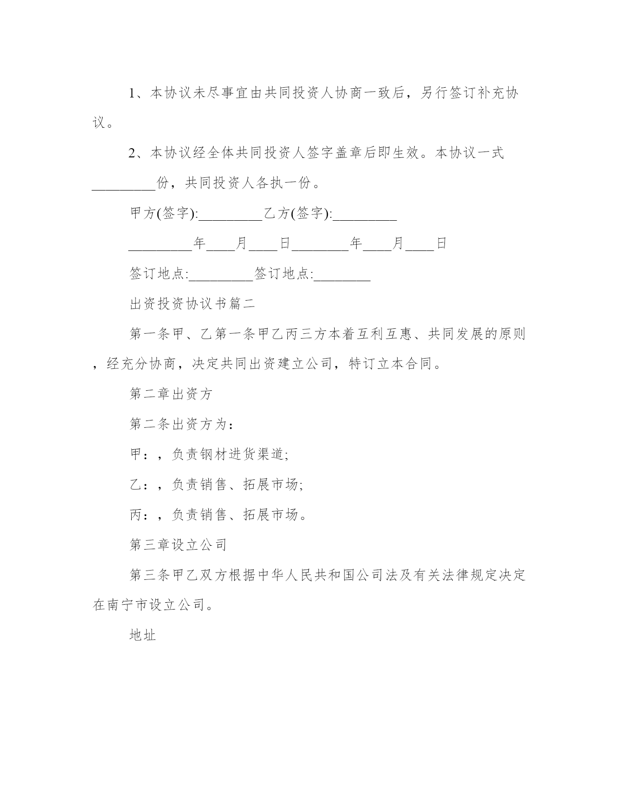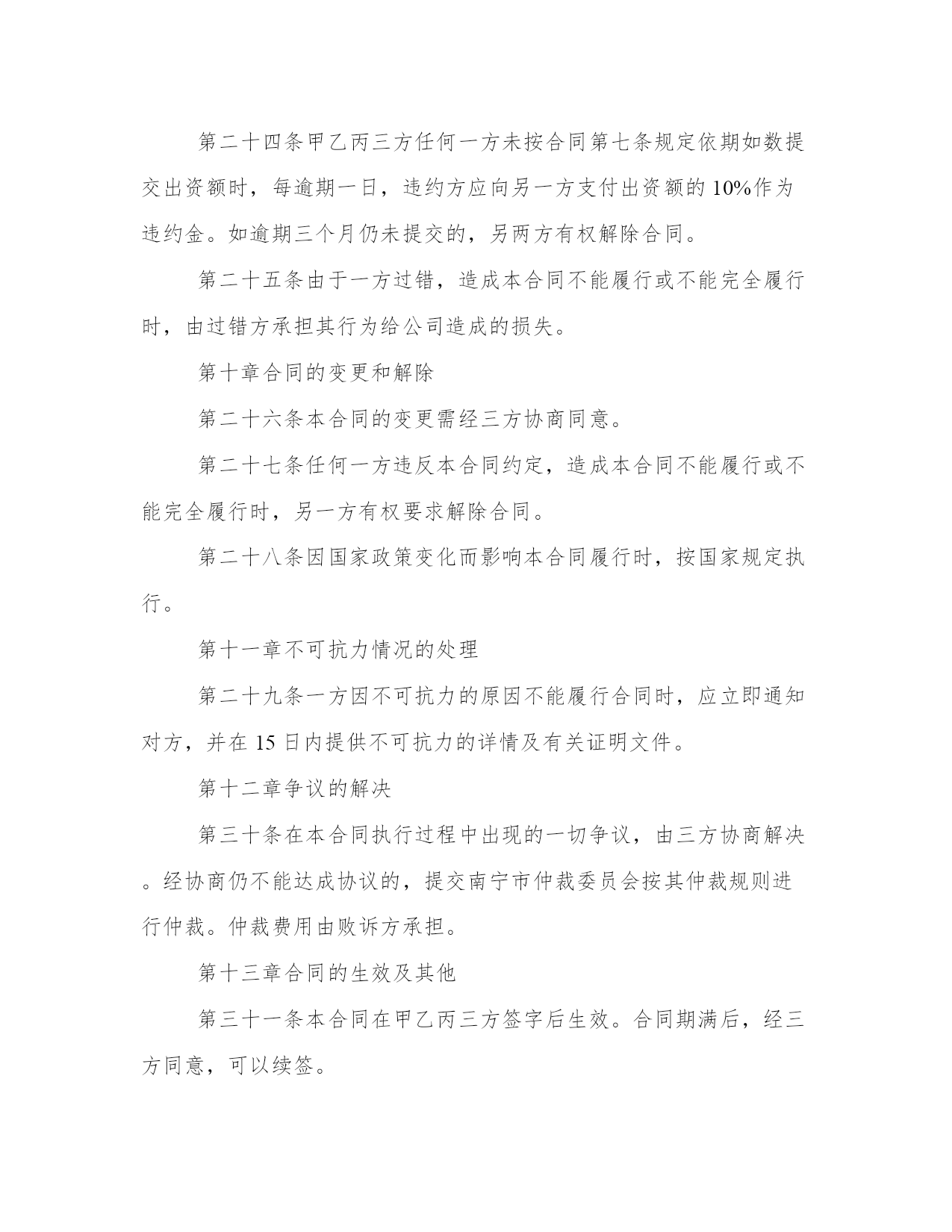 优质出资投资协议书(通用14篇)5.总结是对经验和教训进行归纳和分析的方式善于观察生活和思考问题,可以为写作提供丰富的素材和灵感。在撰写总结时,我们应该注意结构的合理性和表达的准确性,以达到更好的效果。出资投资协议书篇一第一条投资人的姓名及住所甲方:_________住所:_________乙方:_________住所:_________以上各方投资人经友好协商,根据中华人民共和国法律、法规的规定,就各方共同出资并由甲方以其名义受让_________股权,并作为发起人参与_________(暂定名,以下简称“股份公司”)的发起设立事宜,达成如下协议,以资共同遵守。第二条共同投资人的投资额和投资方式各方一致同意甲方用出资总额以10倍的溢价受让_________股权,并以该股权作为出资,参与股份公司的发起设立,共同投资人将持有股份公司股本总额的_________%。各共同投资人应于_________年_________月_________日前将上述出资额解入指定的银行:_________。第三条利润分享和亏损分担共同投资人按其出资额占出资总额的比例分享共同投资的利润,分担共同投资的亏损。共同投资人各自以其出资额为限对共同投资承担职责,共同投资人以其出资总额为限对股份有限公司承担职责。共同投资人的出资构成的股份及其孳生物为共同投资人的共有财产,由共同投资人按其出资比例共有。共同投资于股份有限公司的股份转让后,各共同投资人有权按其出资比例取得财产。第四条事务执行1、投资人委托甲方代表全体投资人执行共同投资的日常事务,包括但不限于:(1)在股份公司发起设立阶段,行使及履行作为股份有限公司发起人的权利和义务;2)在股份公司成立后,行使其作为股份公司股东的权利、履行相应义务;(3)收集共同投资所产生的孳息,并按照本协议有关规定处置;4、甲方在执行事务时如因其过失或不遵守本协议而造成其他共同投资人损失时,应承担赔偿职责。6、共同投资的下列事务务必经全体共同投资人同意:(1)转让共同投资于股份有限公司的股份;(2)以上述股份对外出质;(3)更换事务执行人。第五条投资的转让2、共同投资人之间转让在共同投资中的全部或部分投资额时,应当通知其他共同出资人;3、共同投资人依法转让其出资额的,在同等条件下,其他共同投资人有优先受让的权利。第六条其他权利和义务1、甲方及其他共同投资人不得私自转让或者处分共同投资的股份;2、共同投资人在股份有限公司登记之日起三年内,不得转让其持有的股份及出资额;3、股份有限公司成立后,任一共同投资人不得从共同投资中抽回出资额;4、股份有限公司不能成立时,对设立行为所产生的债务和费用按各共同投资人的出资比例分担。第七条违约职责为保证本协议的实际履行,甲方自愿带给其所有的向其他共同投资人带给担保。甲方承诺在其违约并造成其他共同投资人损失的状况下,以上述财产向其他共同投资人承担违约职责。第八条其他1、本协议未尽事宜由共同投资人协商一致后,另行签订补充协议。2、本协议经全体共同投资人签字盖章后即生效。本协议一式_________份,共同投资人各执一份。甲方(签字):_________乙方(签字):__________________年____月____日________年____月____日签订地点:_________签订地点:________出资投资协议书篇二第一条甲、乙第一条甲乙丙三方本着互利互惠、共同发展的原则,经充分协商,决定共同出资建立公司,特订立本合同。第二章出资方第二条出资方为:甲:,负责钢材进货渠道;乙:,负责销售、拓展市场;丙:,负责销售、拓展市场。第三章设立公司第三条甲乙双方根据中华人民共和国公司法及有关法律规定决定在南宁市设立公司。地址第四条公司为有限责任公司;甲乙丙三方以各自认缴的出资额对公司的债务承担责任;三方按各自的出资额在投资总额中所占的比例分享利润和分担风险及损失。第四章公司宗旨、经营项目和规模第五条公司的宗旨:互惠互利,共同发展。第六条公司的经营项目为:主营钢材,兼营。以企业法人营业执照核准的经营范围为准。第七条公司投资总额为人民币元,其中注册资金元。甲方投资万元,占投资总额%。乙方投资万元,占投资总额%。丙方投资万元,占投资总额%。合同签订后30日内甲乙丙三方将现金投资足额存入公司在银行开设的临时帐户;设备投资提供评估证明文件,并依法办理财产权的转移手续。第八条任何一方向第三方转让其部分或全部出资额时,须经另两方书面同意。任何一方转让其部分或全部出资额时,在同等条件下另两方有优先购买权。违反上述规定的,其转让无效。第五章权利义务第九条权利1、依照其所出资比例获得股利和其他