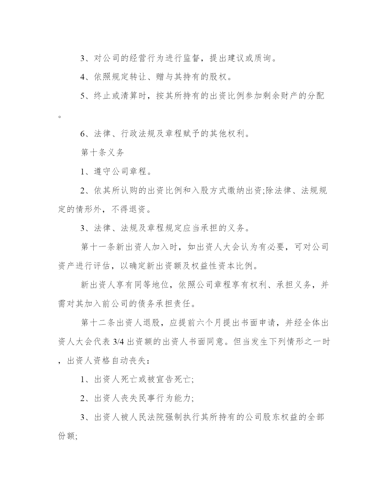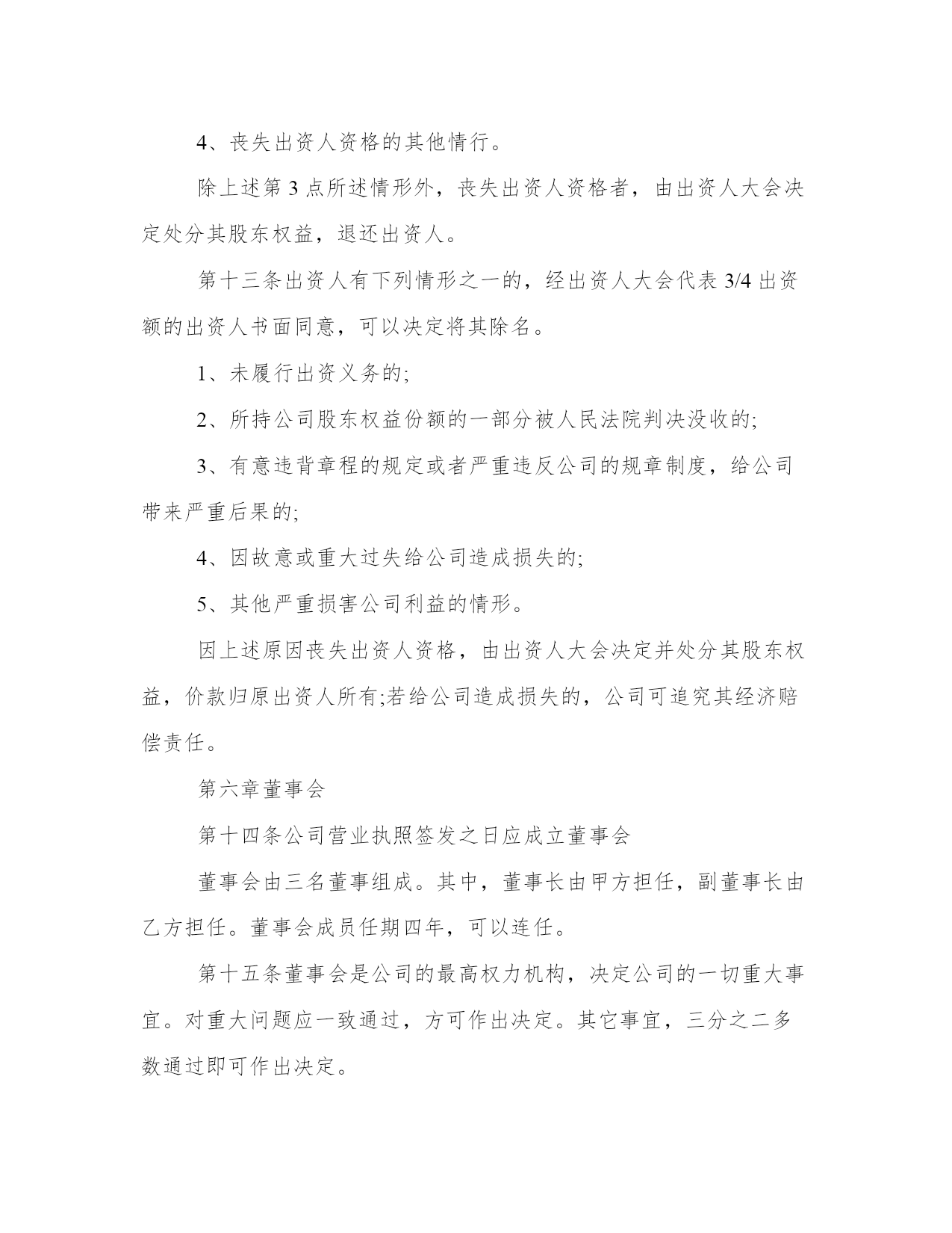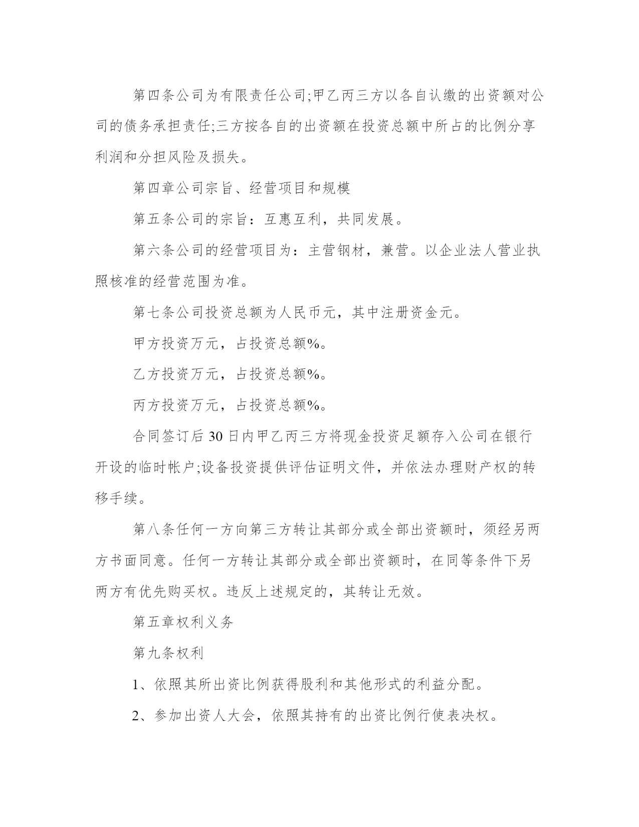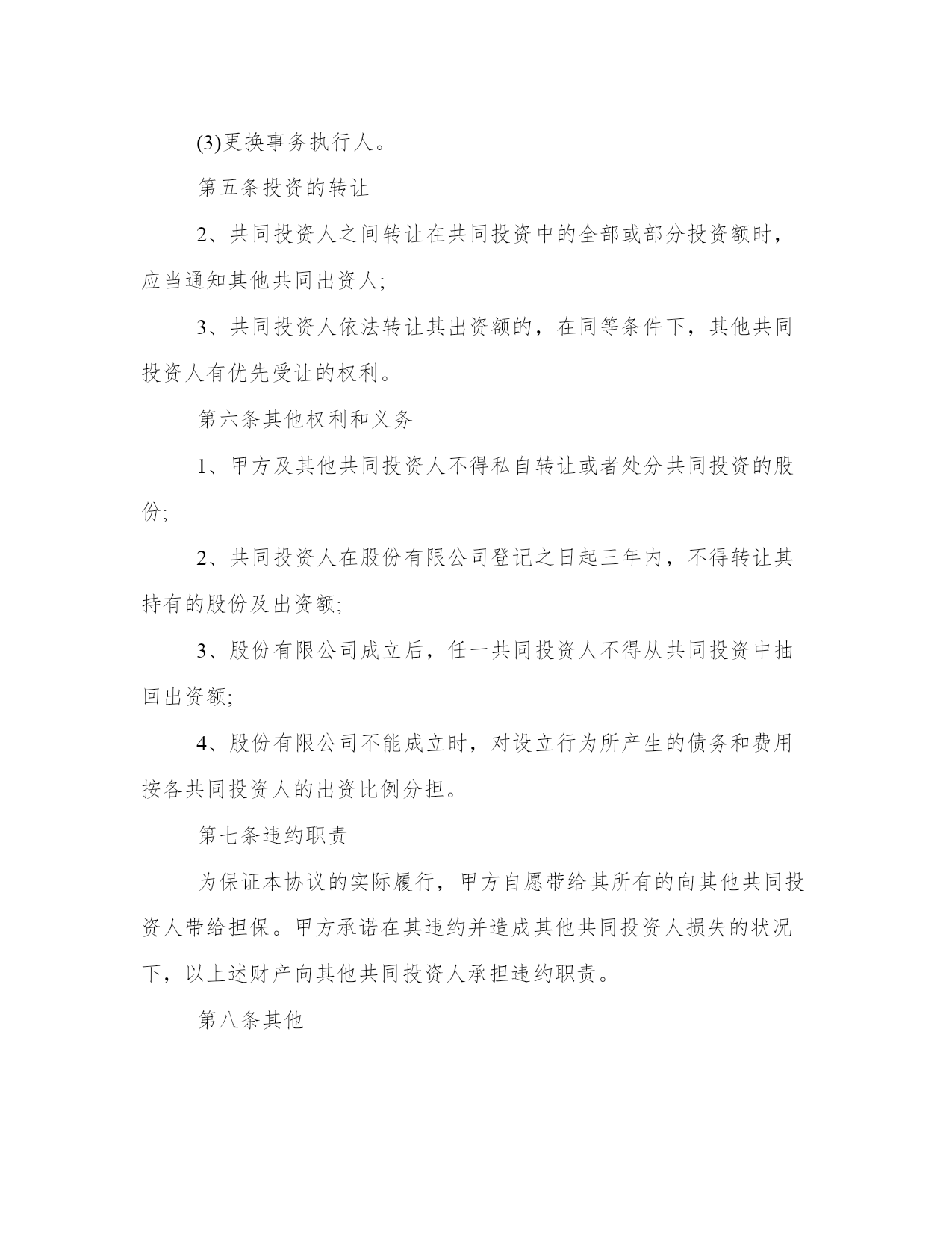 优质出资投资协议书(通用14篇)5.总结是对经验和教训进行归纳和分析的方式善于观察生活和思考问题,可以为写作提供丰富的素材和灵感。在撰写总结时,我们应该注意结构的合理性和表达的准确性,以达到更好的效果。出资投资协议书篇一第一条投资人的姓名及住所甲方:_________住所:_________乙方:_________住所:_________以上各方投资人经友好协商,根据中华人民共和国法律、法规的规定,就各方共同出资并由甲方以其名义受让_________股权,并作为发起人参与_________(暂定名,以下简称“股份公司”)的发起设立事宜,达成如下协议,以资共同遵守。第二条共同投资人的投资额和投资方式各方一致同意甲方用出资总额以10倍的溢价受让_________股权,并以该股权作为出资,参与股份公司的发起设立,共同投资人将持有股份公司股本总额的_________%。各共同投资人应于_________年_________月_________日前将上述出资额解入指定的银行:_________。第三条利润分享和亏损分担共同投资人按其出资额占出资总额的比例分享共同投资的利润,分担共同投资的亏损。共同投资人各自以其出资额为限对共同投资承担职责,共同投资人以其出资总额为限对股份有限公司承担职责。共同投资人的出资构成的股份及其孳生物为共同投资人的共有财产,由共同投资人按其出资比例共有。共同投资于股份有限公司的股份转让后,各共同投资人有权按其出资比例取得财产。第四条事务执行1、投资人委托甲方代表全体投资人执行共同投资的日常事务,包括但不限于:(1)在股份公司发起设立阶段,行使及履行作为股份有限公司发起人的权利和义务;2)在股份公司成立后,行使其作为股份公司股东的权利、履行相应义务;(3)收集共同投资所产生的孳息,并按照本协议有关规定处置;4、甲方在执行事务时如因其过失或不遵守本协议而造成其他共同投资人损失时,应承担赔偿职责。6、共同投资的下列事务务必经全体共同投资人同意:(1)转让共同投资于股份有限公司的股份;(2)以上述股份对外出质;(3)更换事务执行人。第五条投资的转让2、共同投资人之间转让在共同投资中的全部或部分投资额时,应当通知其他共同出资人;3、共同投资人依法转让其出资额的,在同等条件下,其他共同投资人有优先受让的权利。第六条其他权利和义务1、甲方及其他共同投资人不得私自转让或者处分共同投资的股份;2、共同投资人在股份有限公司登记之日起三年内,不得转让其持有的股份及出资额;3、股份有限公司成立后,任一共同投资人不得从共同投资中抽回出资额;4、股份有限公司不能成立时,对设立行为所产生的债务和费用按各共同投资人的出资比例分担。第七条违约职责为保证本协议的实际履行,甲方自愿带给其所有的向其他共同投资人带给担保。甲方承诺在其违约并造成其他共同投资人损失的状况下,以上述财产向其他共同投资人承担违约职责。第八条其他1、本协议未尽事宜由共同投资人协商一致后,另行签订补充协议。2、本协议经全体共同投资人签字盖章后即生效。本协议一式_________份,共同投资人各执一份。甲方(签字):_________乙方(签字):__________________年____月____日________年____月____日签订地点:_________签订地点:________出资投资协议书篇二第一条甲、乙第一条甲乙丙三方本着互利互惠、共同发展的原则,经充分协商,决定共同出资建立公司,特订立本合同。第二章出资方第二条出资方为:甲:,负责钢材进货渠道;乙:,负责销售、拓展市场;丙:,负责销售、拓展市场。第三章设立公司第三条甲乙双方根据中华人民共和国公司法及有关法律规定决定在南宁市设立公司。地址第四条公司为有限责任公司;甲乙丙三方以各自认缴的出资额对公司的债务承担责任;三方按各自的出资额在投资总额中所占的比例分享利润和分担风险及损失。第四章公司宗旨、经营项目和规模第五条公司的宗旨:互惠互利,共同发展。第六条公司的经营项目为:主营钢材,兼营。以企业法人营业执照核准的经营范围为准。第七条公司投资总额为人民币元,其中注册资金元。甲方投资万元,占投资总额%。乙方投资万元,占投资总额%。丙方投资万元,占投资总额%。合同签订后30日内甲乙丙三方将现金投资足额存入公司在银行开设的临时帐户;设备投资提供评估证明文件,并依法办理财产权的转移手续。第八条任何一方向第三方转让其部分或全部出资额时,须经另两方书面同意。任何一方转让其部分或全部出资额时,在同等条件下另两方有优先购买权。违反上述规定的,其转让无效。第五章权利义务第九条权利1、依照其所出资比例获得股利和其他