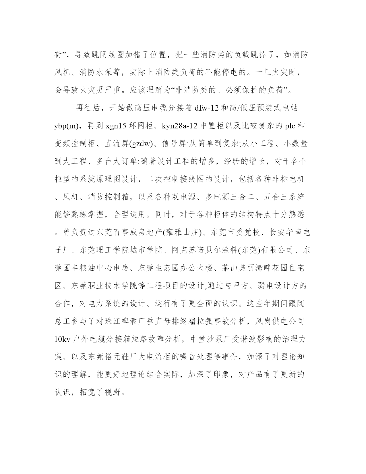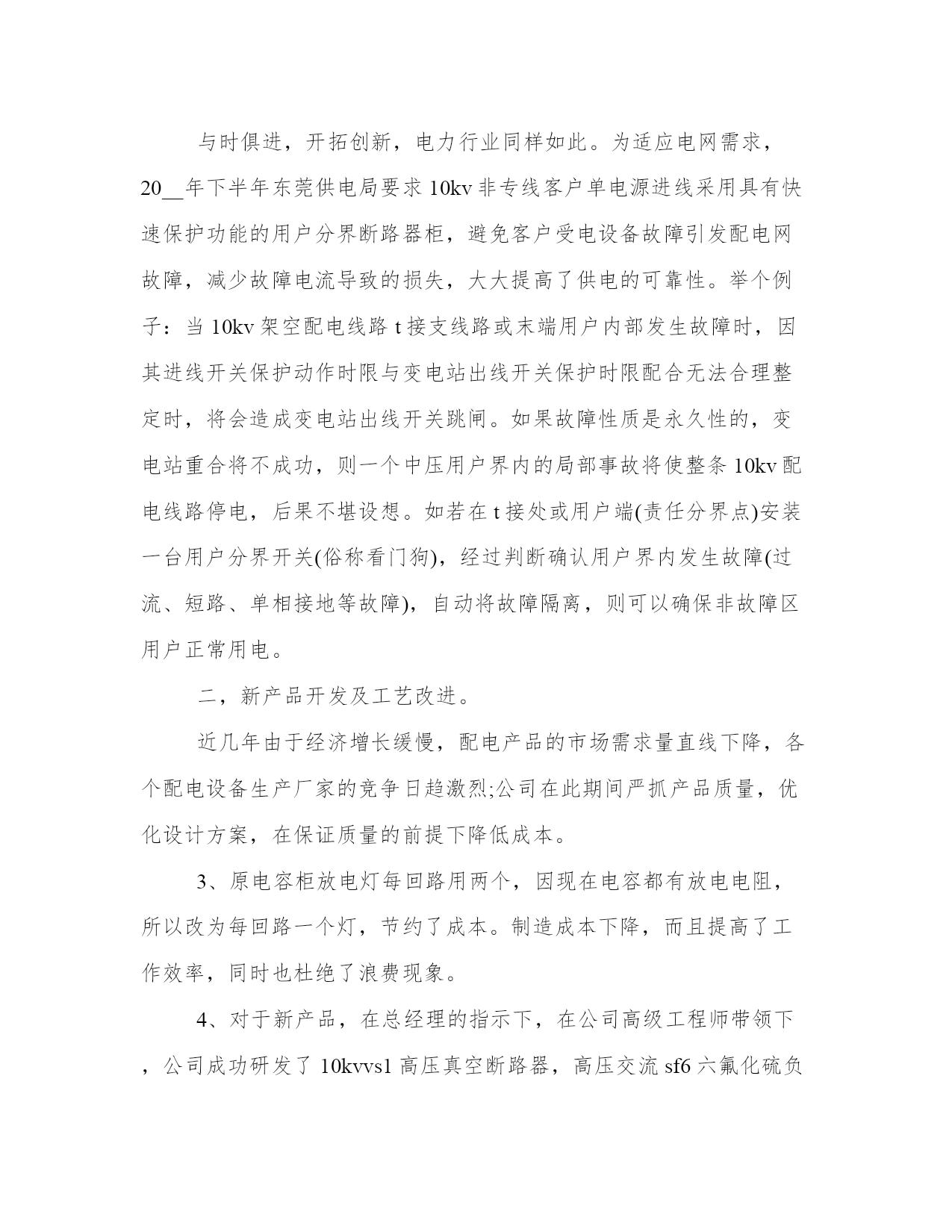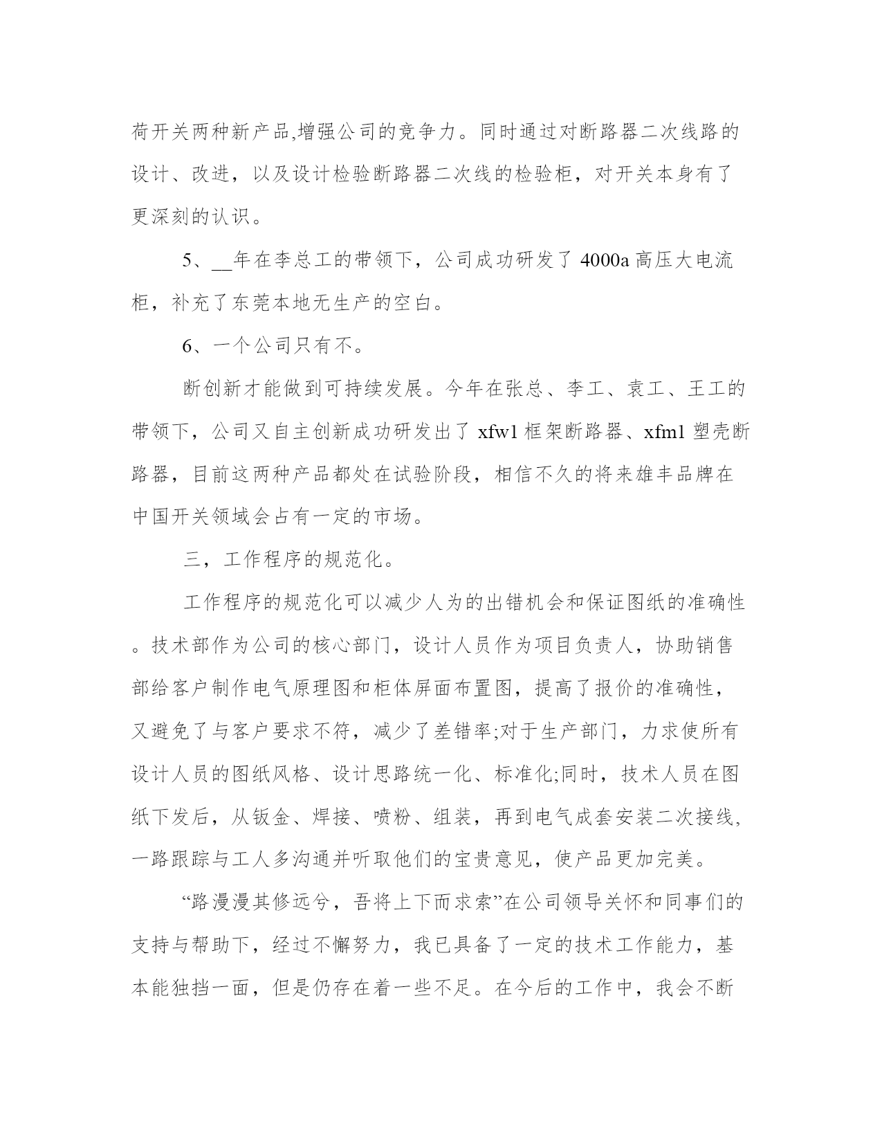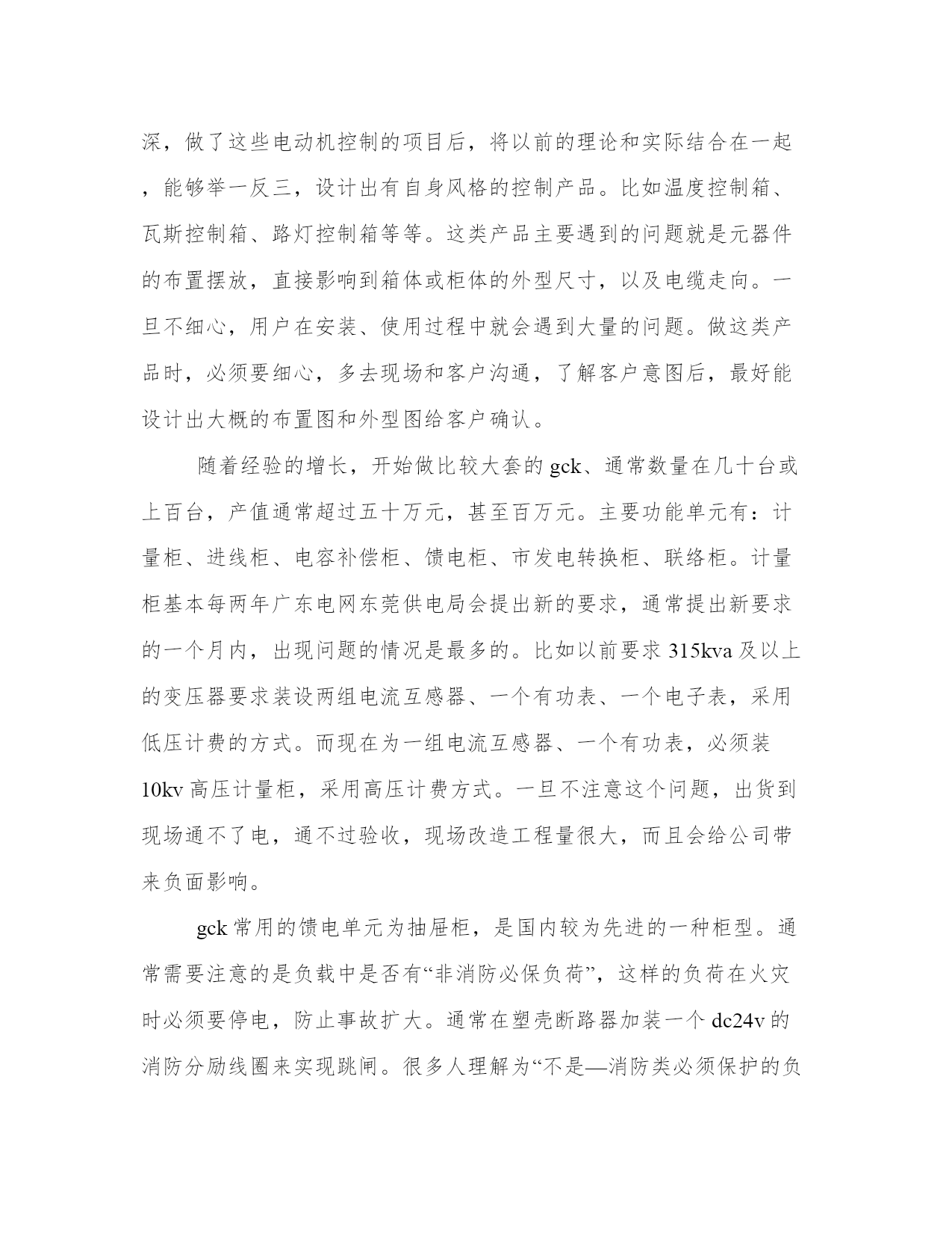 2023年工程师技术工作总结报告(优秀18篇)随着社会一步步向前发展,报告不再是罕见的东西,多数报告都是在事情做完或发生后撰写的。通过报告,人们可以获取最新的信息,深入分析问题,并采取相应的行动。下面是小编给大家带来的报告的范文模板,希望能够帮到你哟!工程师技术工作总结报告篇一时光匆匆,转眼之间已经毕业三年了。在__公司工作也已经有二年多的时间了,由于工作的需求和提高自身的技术水平,我进入__配电设备有限公司技术部学习和工作。在__公司工作至今两年多,已经成长为一名合格的电气工程师。一、成长过程。刚进公司时,必须去电气车间实习。期间主要是熟悉产品,为以后的设计打基础。实习结束后,我正式进入技术部工作。刚开始时,主要负责设计小箱、pgl、ggd、一些比较标准的xgn36(15)-12等一些小订单,通常数量在几台,或者产值不超过10万的订单。这段时间跟着总工和老工程师学习,晚上培训专业技能和基础知识,然后在订单上检验学习成果。这段时间的学习和工作给我留下了深刻的印象和影响。一些比较标准的工程订单,如星三角降压启动、全压启动、自耦降压启动、电机正反转等,这些都是在学校学习过的,但当时印象不深,做了这些电动机控制的项目后,将以前的理论和实际结合在一起,能够举一反三,设计出有自身风格的控制产品。比如温度控制箱、瓦斯控制箱、路灯控制箱等等。这类产品主要遇到的问题就是元器件的布置摆放,直接影响到箱体或柜体的外型尺寸,以及电缆走向。一旦不细心,用户在安装、使用过程中就会遇到大量的问题。做这类产品时,必须要细心,多去现场和客户沟通,了解客户意图后,最好能设计出大概的布置图和外型图给客户确认。随着经验的增长,开始做比较大套的gck、通常数量在几十台或上百台,产值通常超过五十万元,甚至百万元。主要功能单元有:计量柜、进线柜、电容补偿柜、馈电柜、市发电转换柜、联络柜。计量柜基本每两年广东电网东莞供电局会提出新的要求,通常提出新要求的一个月内,出现问题的情况是最多的。比如以前要求315kva及以上的变压器要求装设两组电流互感器、一个有功表、一个电子表,采用低压计费的方式。而现在为一组电流互感器、一个有功表,必须装10kv高压计量柜,采用高压计费方式。一旦不注意这个问题,出货到现场通不了电,通不过验收,现场改造工程量很大,而且会给公司带来负面影响。gck常用的馈电单元为抽屉柜,是国内较为先进的一种柜型。通常需要注意的是负载中是否有“非消防必保负荷”,这样的负荷在火灾时必须要停电,防止事故扩大。通常在塑壳断路器加装一个dc24v的消防分励线圈来实现跳闸。很多人理解为“不是—消防类必须保护的负荷”,导致跳闸线圈加错了位置,把一些消防类的负载跳掉了,如消防风机、消防水泵等,实际上消防类负荷的不能停电的。一旦火灾时,会导致火灾更严重。应该理解为“非消防类的、必须保护的负荷”。再往后,开始做高压电缆分接箱dfw-12和高/低压预装式电站ybp(m),再到xgn15环网柜、kyn28a-12中置柜以及比较复杂的plc和变频控制柜、直流屏(gzdw)、信号屏;从简单到复杂;从小工程、小数量到大工程、多台大订单;随着设计工程的增多,经验的增长,对于各个柜型的系统原理图设计,二次控制接线图的设计,包括各种非标电机、风机、消防控制箱,以及各种双电源、多电源三合二、五合三系统能够熟练掌握,合理运用。同时,对于各种柜体的结构特点十分熟悉。曾负责过东莞百事威房地产(雍雅山庄)、东莞市委党校、长安华南电子厂、东莞理工学院城市学院、阿克苏诺贝尔涂料(东莞)有限公司、东莞国丰粮油中心电房、东莞生态园办公大楼、茶山美丽湾畔花园住宅区、东莞职业技术学院等工程项目的设计;通过与甲方、弱电设计方的合作,对电力系统的设计、运行有了更全面的认识。这些年期间跟随总工参与了对珠江啤酒厂垂直母排终端拉弧事故分析,风岗供电公司10kv户外电缆分接箱短路故障分析,中堂沙泵厂受谐波影响的治理方案、以及东莞裕元鞋厂大电流柜的噪音处理等事件,加深了对理论知识的理解,能更好地理论结合实际,加深了印象,对产品有了更新的认识,拓宽了视野。与时俱进,开拓创新,电力行业同样如此。为适应电网需求,20__年下半年东莞供电局要求10kv非专线客户单电源进线采用具有快速保护功能的用户分界断路器柜,避免客户受电设备故障引发配电网故障,减少故障电流导致的损失,大大提高了供电的可靠性。举个例子:当10kv架空配电线路t接支线路或末端用户内部发生故障时,因其进线开关保护动作时限与变电站出线开关保护时限配合无法合理整定时,将会造成变电站出线开关跳闸。如果故障性质是永久性的,变电站重合将不成功,则一个中压用户界内的局部事故将使整条10kv配电线路停电,后果不堪设想。如若在t接处或用户端(责任分界点)安装一台用户分界开
