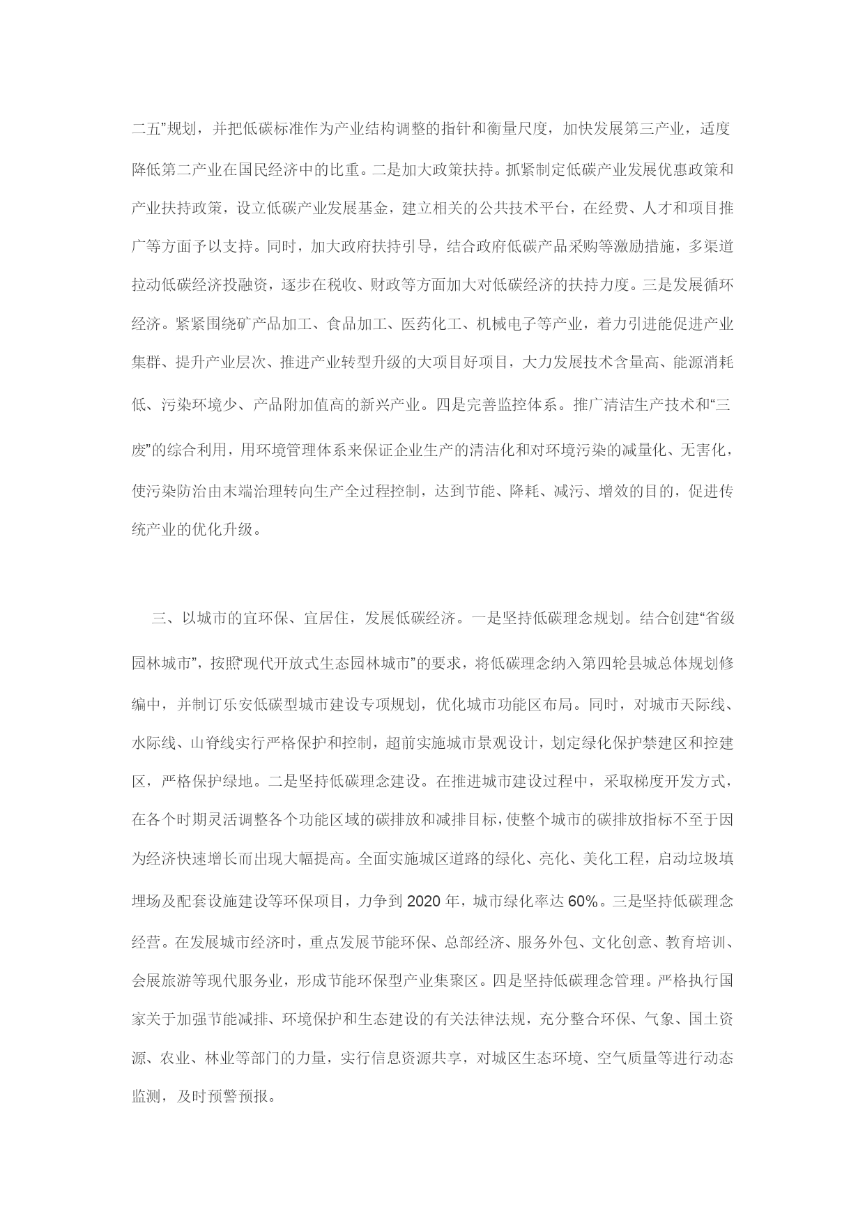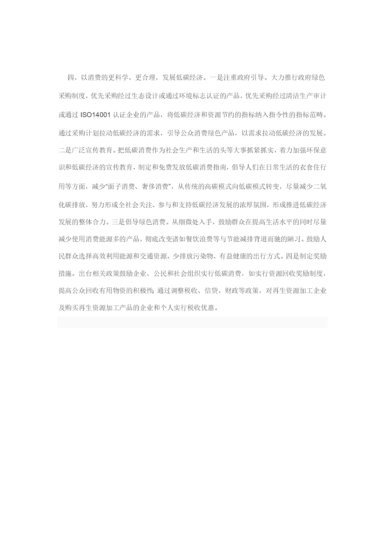低碳经济与可持续发展气候变化是关系到人类生存和发展的根本问题,对我国的影响也是长远的、全方位的;HYPERLINK"http://baike.baidu.com/view/2149638.htm"\t"_blank"应对气候变化的低碳经济创新是关系到国家竞争力的重大问题,也推动了低碳技术创新。当前,发展低碳经济是保护环境、HYPERLINK"http://baike.baidu.com/view/3366759.htm"\t"_blank"调整经济结构和产业结构、实现经济增长的重要契机,成为从中央到地方各级领导的重要工作。低碳经济是以低能耗、低污染、低排放为基础的经济模式,是人类社会继农业文明、工业文明之后的又一次重大进步。在这场被认为继蒸汽机、电力和互联网之后引导“第四次工业革命”低碳经济发展模式中,中国站在了与发达国家同一起跑线上,怎样在这次工业革命中,顺势而动,抢得发展先机,赢得发展主动,值得深思。一、以观念的大突破、大转变,发展低碳经济。具体来说,一方面,要破除三种观念。即破除以GDP为硬道理,片面追求经济增长的观念;破除以粗放型经营为主要模式,忽视可持续发展的观念;破除以物质享受为幸福标准,追求高消费的生活观念。另一方面,要做到“四个坚持”。即坚持生态环境也是生产力,环境与人、经济与社会协调统一的整体生态发展观,认识保护生态环境就是保护生产力,改善生态环境,也能发展生产力;坚持经济效益、社会效益与生态效益协调统一的辨证观,把“经济要发展,生态更要保护”,“既要金山银山,更要绿水青山”等科学理念贯穿到乐安经济社会发展的始终;坚持发挥政府、企业和广大群众多方联动的合力观;坚持突出重点、量力而行、分步实施的统筹兼顾观,着力解决环境保护和生态建设中的突出问题,坚持治理与保护并重,防止出现新的污染和破坏。二、以产业的强关联、强聚集,发展低碳经济。一是制定产业规划。将发展低碳产业列入乐安“十二五”产业发展规划,在产业结构调整、区域布局、技术进步和基础设施建设等方面,为向低碳经济转型创造条件。特别是在产业结构调整方面,应将低碳战略全面融入“十二五”规划,并把低碳标准作为产业结构调整的指针和衡量尺度,加快发展第三产业,适度降低第二产业在国民经济中的比重。二是加大政策扶持。抓紧制定低碳产业发展优惠政策和产业扶持政策,设立低碳产业发展基金,建立相关的公共技术平台,在经费、人才和项目推广等方面予以支持。同时,加大政府扶持引导,结合政府低碳产品采购等激励措施,多渠道拉动低碳经济投融资,逐步在税收、财政等方面加大对低碳经济的扶持力度。三是发展循环经济。紧紧围绕矿产品加工、食品加工、医药化工、机械电子等产业,着力引进能促进产业集群、提升产业层次、推进产业转型升级的大项目好项目,大力发展技术含量高、能源消耗低、污染环境少、产品附加值高的新兴产业。四是完善监控体系。推广清洁生产技术和“三废”的综合利用,用环境管理体系来保证企业生产的清洁化和对环境污染的减量化、无害化,使污染防治由末端治理转向生产全过程控制,达到节能、降耗、减污、增效的目的,促进传统产业的优化升级。三、以城市的宜环保、宜居住,发展低碳经济。一是坚持低碳理念规划。结合创建“省级园林城市”,按照“现代开放式生态园林城市”的要求,将低碳理念纳入第四轮县城总体规划修编中,并制订乐安低碳型城市建设专项规划,优化城市功能区布局。同时,对城市天际线、水际线、山脊线实行严格保护和控制,超前实施城市景观设计,划定绿化保护禁建区和控建区,严格保护绿地。二是坚持低碳理念建设。在推进城市建设过程中,采取梯度开发方式,在各个时期灵活调整各个功能区域的碳排放和减排目标,使整个城市的碳排放指标不至于因为经济快速增长而出现大幅提高。全面实施城区道路的绿化、亮化、美化工程,启动垃圾填埋场及配套设施建设等环保项目,力争到2020年,城市绿化率达60%。三是坚持低碳理念经营。在发展城市经济时,重点发展节能环保、总部经济、服务外包、文化创意、教育培训、会展旅游等现代服务业,形成节能环保型产业集聚区。四是坚持低碳理念管理。严格执行国家关于加强节能减排、环境保护和生态建设的有关法律法规,充分整合环保、气象、国土资源、农业、林业等部门的力量,实行信息资源共享,对城区生态环境、空气质量等进行动态监测,及时预警预报。四、以消费的更科学、更合理,发展低碳经济。一是注重政府引导。大力推行政府绿色采购制度,优先采购经过生态设计或通过环境标志认证的产品,优先采购经过清洁生产审计或通过ISO14001认证企业的产品,将低碳经济和资源节约的指标纳入指令性的指标范畴。通过采购计划拉动低碳经济的需求,引导公众消费绿色产品,以需求拉动低碳经济的发展。二是广泛宣传教育。把低碳消费作为社会生产和生活的头等大事抓紧抓实,着力加强环保意
