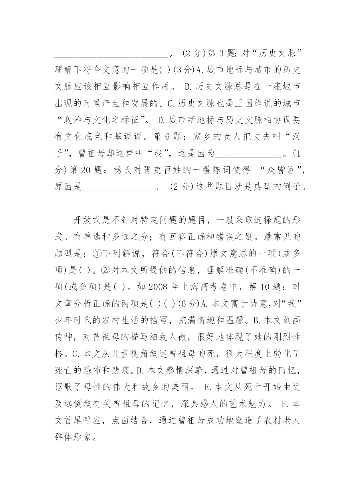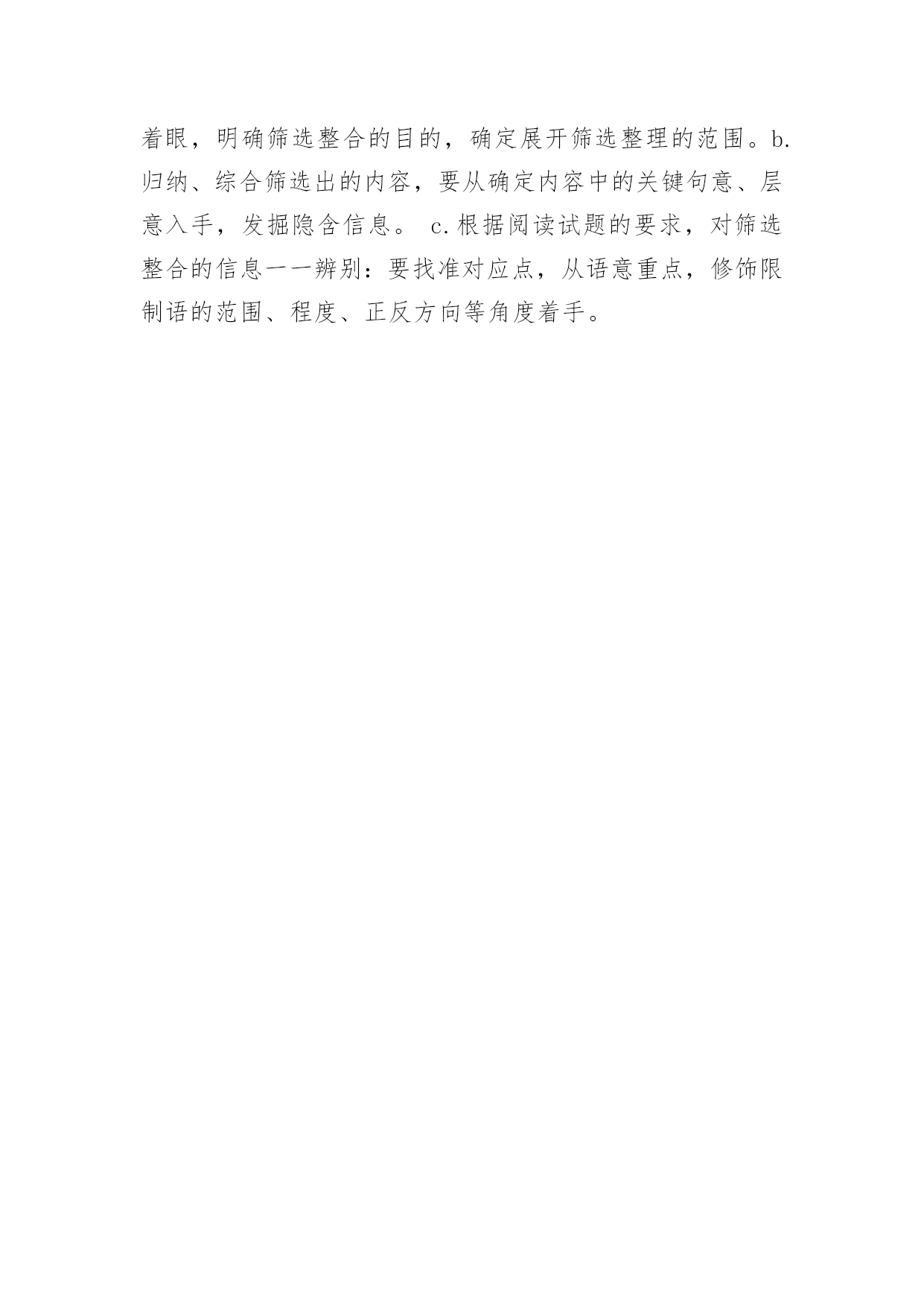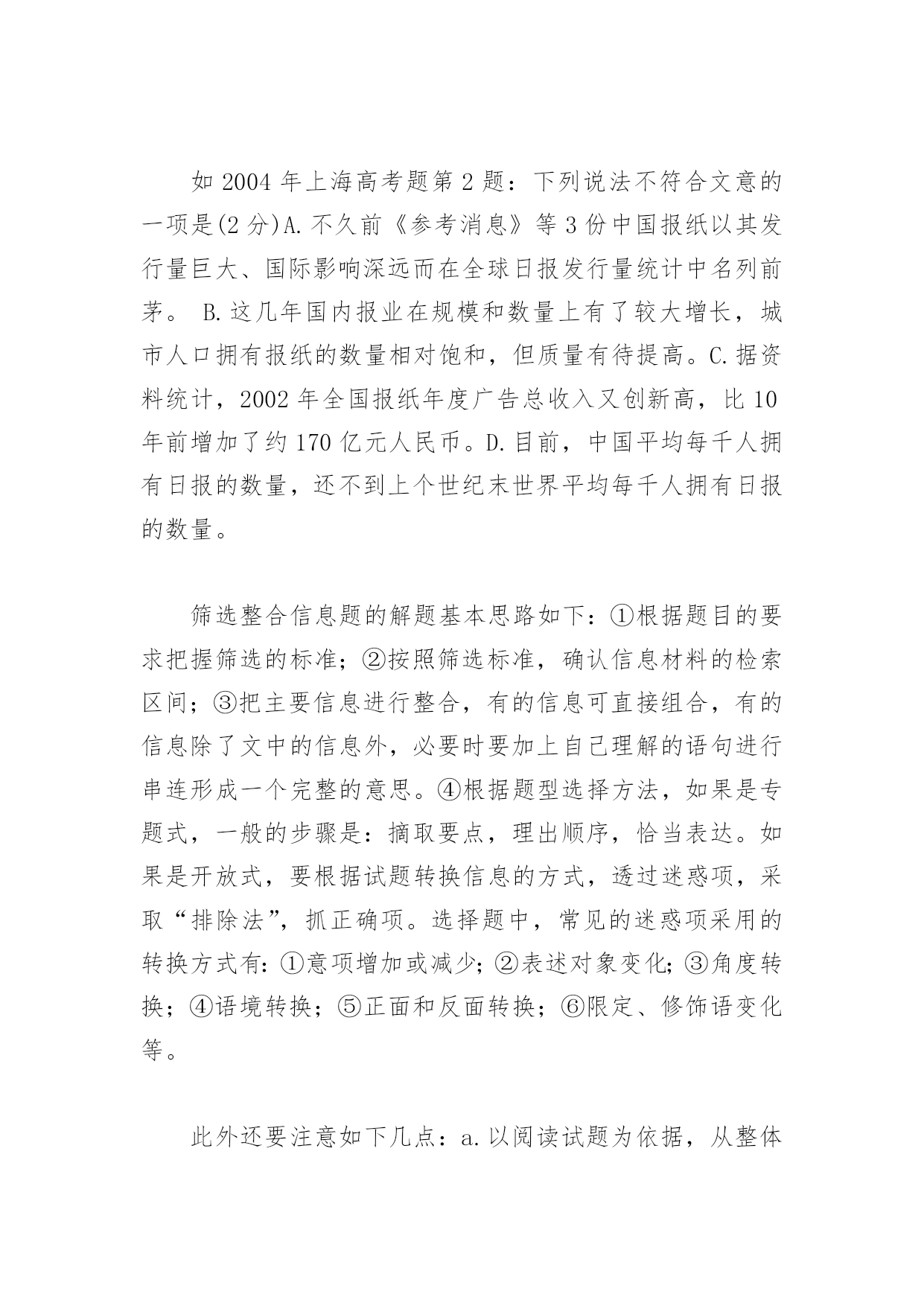 高考语文指导:如何解答筛选整合信息题筛选整合文中的信息,是语文高考阅读题中重要的阅读能力,是三个层级六个能力点中理解、分析、综合能力的具体体现,它在试卷中占的比例越来越大。所谓“筛选”,指的是从纷繁的语言材料中找出信息,提取主要信息,筛掉次要信息。其实也就是对词语、句子、段落、篇章的理解。所谓“整合”,是指根据试题提出的条件,对筛选出来的信息源进行分类集中、重新组合、粗略概括。文中哪些信息是值得筛选的呢?从答题的要求来说,符合答题要求的就是重要信息。一般就文章本身来看,重要信息主要有:①文中的基本概念和新的知识;②对重要概念的解释和阐述;③表达文章主旨的语句;④文中的概括句;⑤文中的过渡句;⑥文章的标题;⑦文后的注释等。从试题的形式来看,筛选整合信息题在考题中往往用专题式和开放式两种。专题式一般是针对一个具体问题,集中筛选整合,是分散的信息向一点聚集。如:2008年上海高考卷中,第1题:第②段中列举了我国多处城市景观,用意是________________________。(2分)第3题:对“历史文脉”理解不符合文意的一项是()(3分)A.城市地标与城市的历史文脉应该相互影响相互作用。B.历史文脉总是在一座城市出现的时候产生和发展的。C.历史文脉也是王国维说的城市“政治与文化之标征”。D.城市新地标与历史文脉相协调要有文化底色和基调调。第6题:家乡的女人把丈夫叫“汉子”,曾祖母却这样叫“我”,这是因为______________。(1分)第20题:杨氏对胥吏百姓的一番陈词使得“众皆泣”,原因是_______________。(2分)这些题目就是典型的例子。开放式是不针对特定问题的题目,一般采取选择题的形式。有单选和多选之分;有回答正确和错误之别。最常见的题型是:①下列解说,符合(不符合)原文意思的一项(或多项)是()。②对本文所提供的信息,理解准确(不准确)的一项(或多项)是()。如2008年上海高考卷中,第10题:对文章分析正确的两项是()()(6分)A.本文富于诗意,对“我”少年时代的农村生活的描写,充满情趣和温馨。B.本文刻画传神,对曾祖母的描写细致人微,很好地体现了她的刚烈性格。C.本文从儿童视角叙述曾祖母的死,很大程度上弱化了死亡的恐怖和悲哀。D.本文感情深挚,通过对曾祖母的回忆,讴歌了母性的伟大和故乡的美丽。E.本文从死亡开始由近及远倒叙有关曾祖母的记忆,深具感人的艺术魅力。F.本文首尾呼应,点面结合,通过曾祖母成功地塑造了农村老人群体形象。如2004年上海高考题第2题:下列说法不符合文意的一项是(2分)A.不久前《参考消息》等3份中国报纸以其发行量巨大、国际影响深远而在全球日报发行量统计中名列前茅。B.这几年国内报业在规模和数量上有了较大增长,城市人口拥有报纸的数量相对饱和,但质量有待提高。C.据资料统计,2002年全国报纸年度广告总收入又创新高,比10年前增加了约170亿元人民币。D.目前,中国平均每千人拥有日报的数量,还不到上个世纪末世界平均每千人拥有日报的数量。筛选整合信息题的解题基本思路如下:①根据题目的要求把握筛选的标准;②按照筛选标准,确认信息材料的检索区间;③把主要信息进行整合,有的信息可直接组合,有的信息除了文中的信息外,必要时要加上自己理解的语句进行串连形成一个完整的意思。④根据题型选择方法,如果是专题式,一般的步骤是:摘取要点,理出顺序,恰当表达。如果是开放式,要根据试题转换信息的方式,透过迷惑项,采取“排除法”,抓正确项。选择题中,常见的迷惑项采用的转换方式有:①意项增加或减少;②表述对象变化;③角度转换;④语境转换;⑤正面和反面转换;⑥限定、修饰语变化等。此外还要注意如下几点:a.以阅读试题为依据,从整体着眼,明确筛选整合的目的,确定展开筛选整理的范围。b.归纳、综合筛选出的内容,要从确定内容中的关键句意、层意入手,发掘隐含信息。c.根据阅读试题的要求,对筛选整合的信息一一辨别:要找准对应点,从语意重点,修饰限制语的范围、程度、正反方向等角度着手。