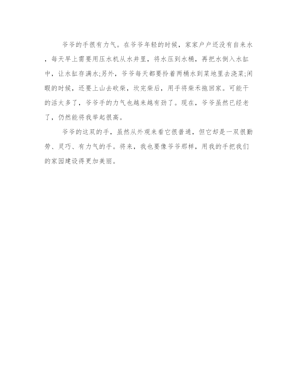 2024年爷爷的手工作报告和我握过的手,不计其数,但是给我留下印象最深的手,那就是爷爷的那双大手。爷爷的手很大,很粗糙。手部呈黄色,还略有些黑色。手掌有很多老茧,手背的毛细血管爬满了表面。五根手指又粗又壮,手指上留下了许多划痕,我知道,所有这些,都是辛苦劳动所留下的痕迹。爷爷的手是一双勤劳的手。每天早上,天不亮就把院子打扫得干干净净;到了播种时,爷爷早早就到地里给土地松土,除草。播种后,还要经常给庄稼浇水、施肥、锄草;抽空还要给果树剪枝、打药,在秋天收获的时候,地里仍然能看到爷爷忙碌的身影。每当秋天看到树枝上挂着红彤彤的果实,家里收获了一堆堆金黄的玉米,就让我想到了爷爷那双勤劳的手。爷爷的手虽然很粗糙,但那时一双灵巧的手。爷爷在种菜时,能将一粒粒的小种子,快速地将种子种入泥土里。在春天的时候,爷爷用柳树的枝条,给我做哨;在夏天的时候,爷爷用枝条,给我和弟弟编织小小的帽子;在收获的季节里,爷爷用他的那双手,熟练地掰着玉米,捡起那小小的栗子……,看着那收获的粮食,爷爷脸上总是露出丰收的微笑,好象日常所有的劳累都一扫而光;在寒冷的冬天,爷爷仍然没忘给我们用木头做小冰车。有时,爷爷还会给我们做一些木制的玩具。爷爷的手很有力气。在爷爷年轻的时候,家家户户还没有自来水,每天早上需要用压水机从水井里,将水压到水桶,再把水倒入水缸中,让水缸存满水;另外,爷爷每天都要拎着两桶水到菜地里去浇菜;闲暇的时候,还要上山去砍柴,坎完柴后,用手将柴禾拖回家。可能干的活太多了,爷爷手的力气也越来越有劲了。现在,爷爷虽然已经老了,仍然能将我举起很高。爷爷的这双的手,虽然从外观来看它很普通,但它却是一双很勤劳、灵巧、有力气的手。将来,我也要像爷爷那样,用我的手把我们的家园建设得更加美丽。