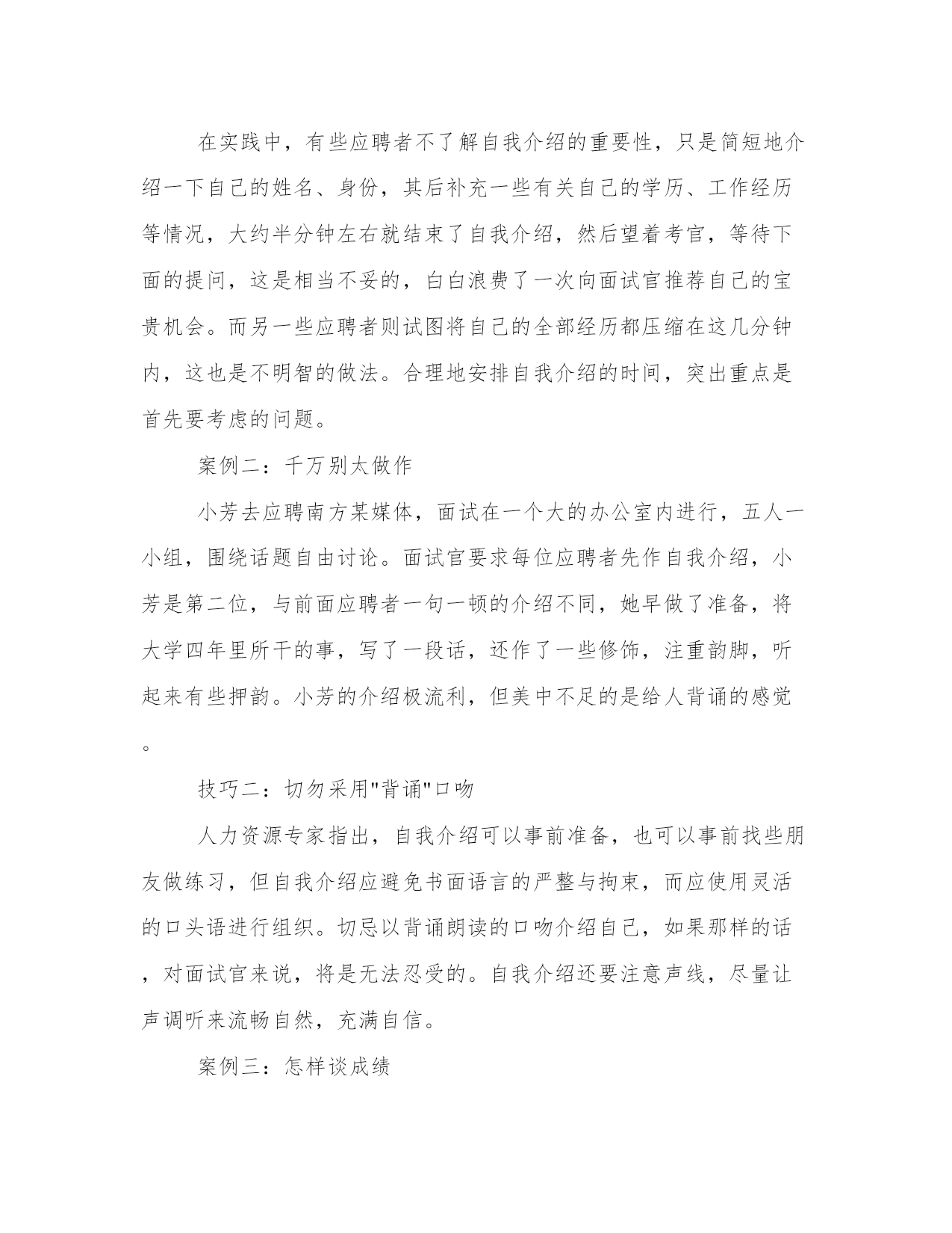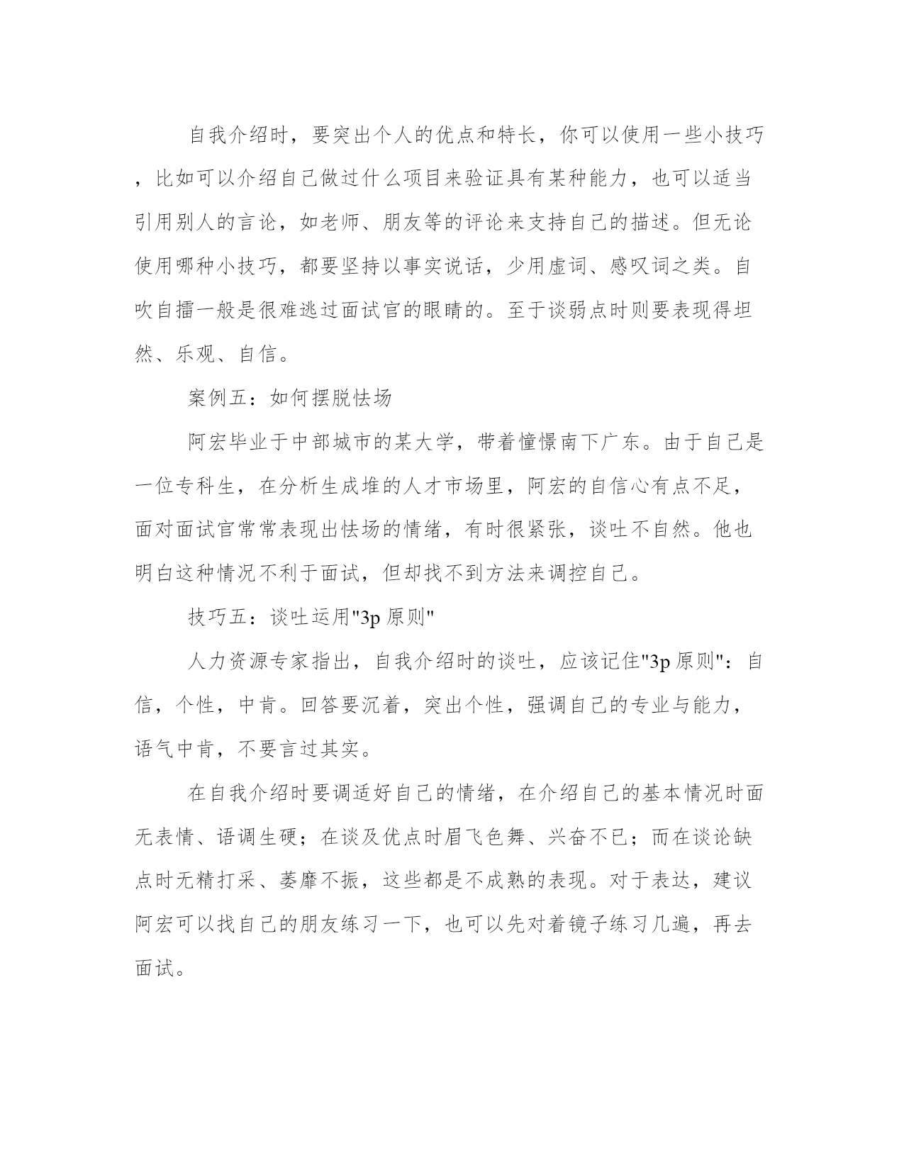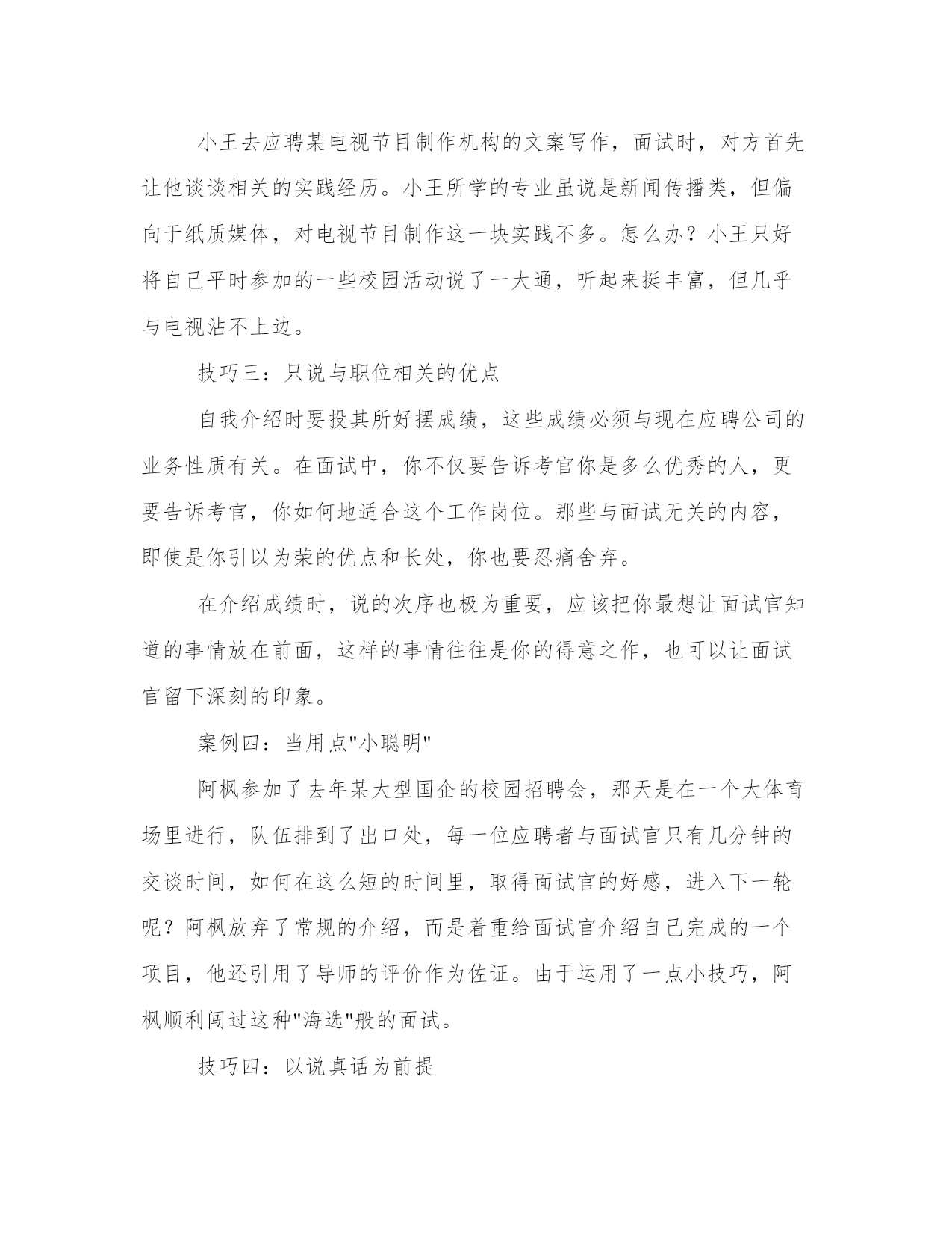 自我介绍无懈可击的技巧自我介绍也被称为"面试第一问"。在自我介绍中,面试官可以借机考察应聘者的语言表达能力、应变能力;应聘者也可以主动向面试官推荐自己,展示才华。自我介绍的时间一般为3分钟左右,有些外企仅为1分钟。在如此短的时间内,毕业生如何"秀"出自己呢?该做哪些准备?有什么问题值得注意?我们专门采访了一些实例,希望能给大家提供一些就业指导。案例一:如何把握时间分析生毕业的小刘很健谈,口才甚佳,对自我介绍,他自认为不在话下,所以他从来不准备,看什么人说什么话。他的求职目标是地产策划,有一次,应聘本地一家大型房地产公司,在自我介绍时,他大谈起了房地产行业的走向,由于跑题太远,面试官不得不把话题收回来。自我介绍也只能"半途而止"。技巧一:一分钟谈一项内容自我介绍的时间一般为3分钟,在时间的分配上,第一分钟可谈谈学历等个人基本情况,第二分钟可谈谈工作经历,对于应届毕业生而言可谈相关的社会实践,第三分钟可谈对本职位的理想和对于本行业的看法。如果自我介绍要求在1分钟内完成,自我介绍就要有所侧重,突出一点,不及其余。在实践中,有些应聘者不了解自我介绍的重要性,只是简短地介绍一下自己的姓名、身份,其后补充一些有关自己的学历、工作经历等情况,大约半分钟左右就结束了自我介绍,然后望着考官,等待下面的提问,这是相当不妥的,白白浪费了一次向面试官推荐自己的宝贵机会。而另一些应聘者则试图将自己的全部经历都压缩在这几分钟内,这也是不明智的做法。合理地安排自我介绍的时间,突出重点是首先要考虑的问题。案例二:千万别太做作小芳去应聘南方某媒体,面试在一个大的办公室内进行,五人一小组,围绕话题自由讨论。面试官要求每位应聘者先作自我介绍,小芳是第二位,与前面应聘者一句一顿的介绍不同,她早做了准备,将大学四年里所干的事,写了一段话,还作了一些修饰,注重韵脚,听起来有些押韵。小芳的介绍极流利,但美中不足的是给人背诵的感觉。技巧二:切勿采用"背诵"口吻人力资源专家指出,自我介绍可以事前准备,也可以事前找些朋友做练习,但自我介绍应避免书面语言的严整与拘束,而应使用灵活的口头语进行组织。切忌以背诵朗读的口吻介绍自己,如果那样的话,对面试官来说,将是无法忍受的。自我介绍还要注意声线,尽量让声调听来流畅自然,充满自信。案例三:怎样谈成绩小王去应聘某电视节目制作机构的文案写作,面试时,对方首先让他谈谈相关的实践经历。小王所学的专业虽说是新闻传播类,但偏向于纸质媒体,对电视节目制作这一块实践不多。怎么办?小王只好将自己平时参加的一些校园活动说了一大通,听起来挺丰富,但几乎与电视沾不上边。技巧三:只说与职位相关的优点自我介绍时要投其所好摆成绩,这些成绩必须与现在应聘公司的业务性质有关。在面试中,你不仅要告诉考官你是多么优秀的人,更要告诉考官,你如何地适合这个工作岗位。那些与面试无关的内容,即使是你引以为荣的优点和长处,你也要忍痛舍弃。在介绍成绩时,说的次序也极为重要,应该把你最想让面试官知道的事情放在前面,这样的事情往往是你的得意之作,也可以让面试官留下深刻的印象。案例四:当用点"小聪明"阿枫参加了去年某大型国企的校园招聘会,那天是在一个大体育场里进行,队伍排到了出口处,每一位应聘者与面试官只有几分钟的交谈时间,如何在这么短的时间里,取得面试官的好感,进入下一轮呢?阿枫放弃了常规的介绍,而是着重给面试官介绍自己完成的一个项目,他还引用了导师的评价作为佐证。由于运用了一点小技巧,阿枫顺利闯过这种"海选"般的面试。技巧四:以说真话为前提自我介绍时,要突出个人的优点和特长,你可以使用一些小技巧,比如可以介绍自己做过什么项目来验证具有某种能力,也可以适当引用别人的言论,如老师、朋友等的评论来支持自己的描述。但无论使用哪种小技巧,都要坚持以事实说话,少用虚词、感叹词之类。自吹自擂一般是很难逃过面试官的眼睛的。至于谈弱点时则要表现得坦然、乐观、自信。案例五:如何摆脱怯场阿宏毕业于中部城市的某大学,带着憧憬南下广东。由于自己是一位专科生,在分析生成堆的人才市场里,阿宏的自信心有点不足,面对面试官常常表现出怯场的情绪,有时很紧张,谈吐不自然。他也明白这种情况不利于面试,但却找不到方法来调控自己。技巧五:谈吐运用"3p原则"人力资源专家指出,自我介绍时的谈吐,应该记住"3p原则":自信,个性,中肯。回答要沉着,突出个性,强调自己的专业与能力,语气中肯,不要言过其实。在自我介绍时要调适好自己的情绪,在介绍自己的基本情况时面无表情、语调生硬;在谈及优点时眉飞色舞、兴奋不已;而在谈论缺点时无精打采、萎靡不振,这些都是不成熟的表现。对于表达,建议阿宏可以找自己的朋友练习一下,也可以先对着镜子练习几遍,再去面试。