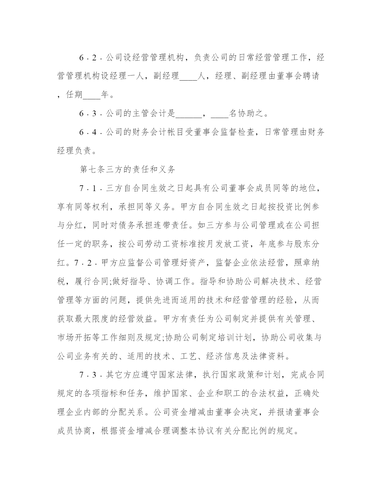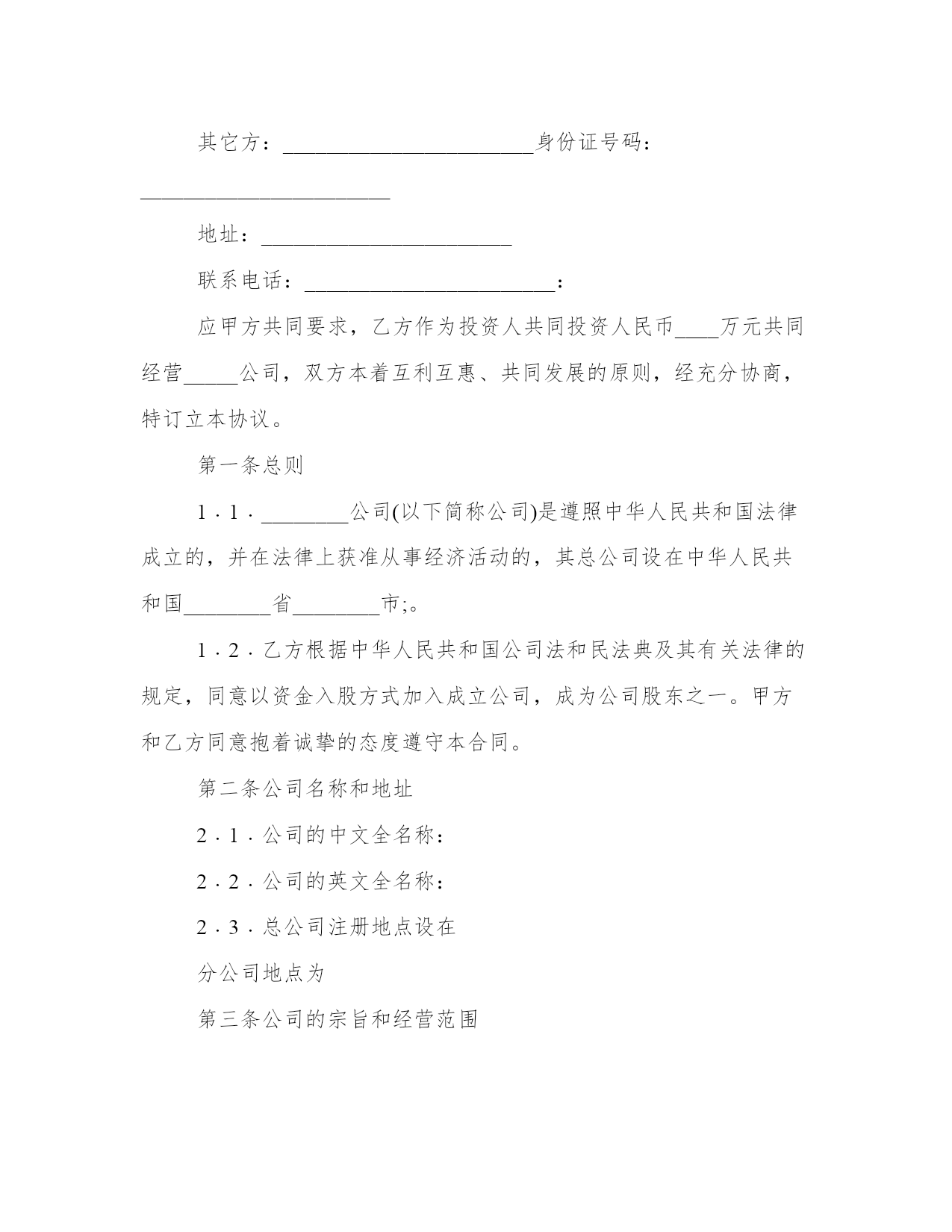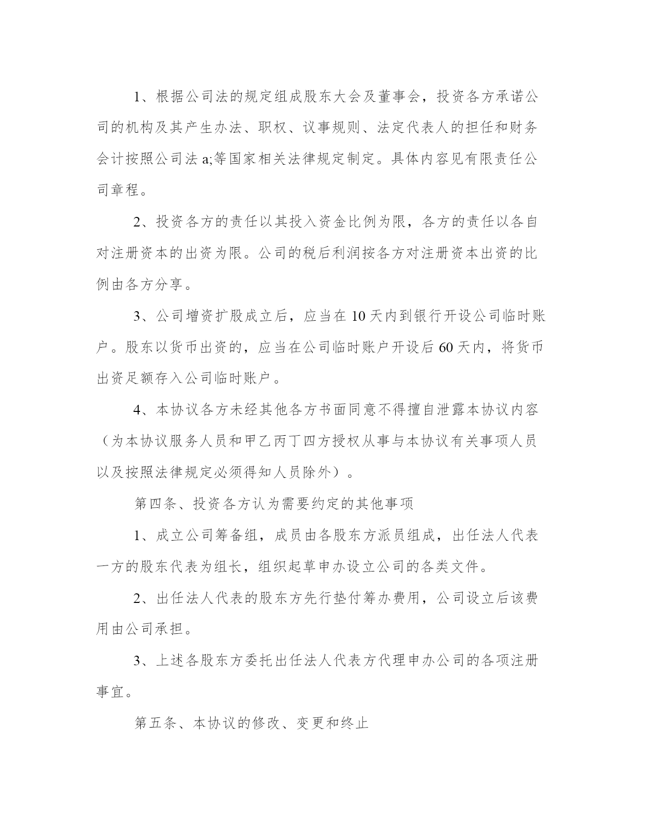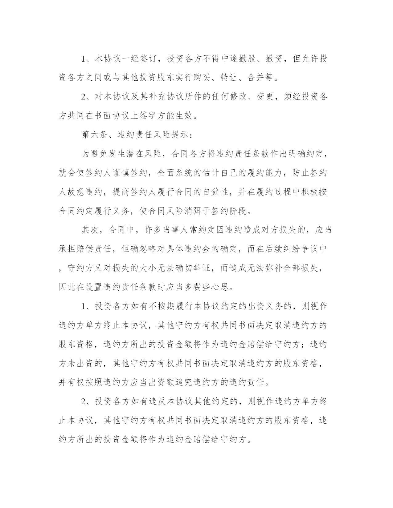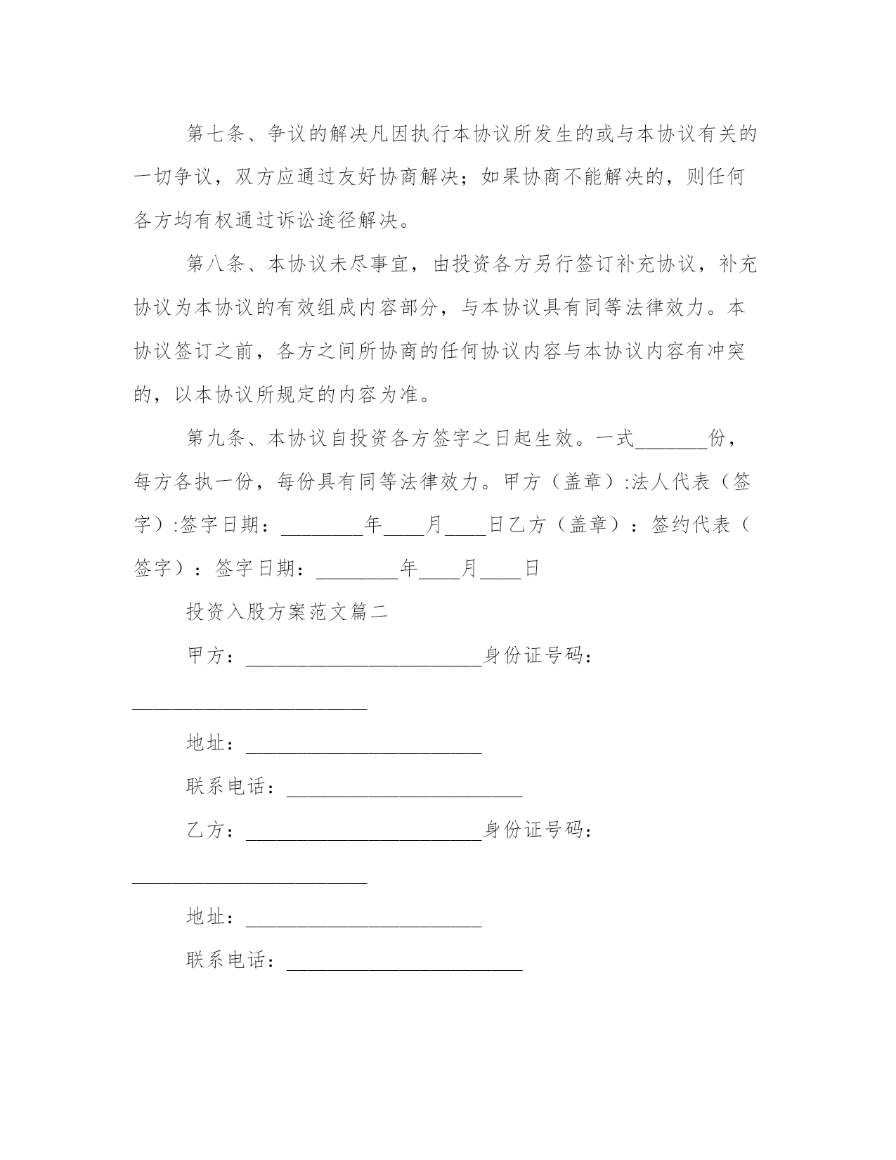 2024年投资入股方案范文(15篇)为了确定工作或事情顺利开展,常常需要预先制定方案,方案是为某一行动所制定的具体行动实施办法细则、步骤和安排等。方案对于我们的帮助很大,所以我们要好好写一篇方案。以下是小编为大家收集的方案范文,欢迎大家分享阅读。投资入股方案范文篇一第一条、乙方自愿入股甲方投入_____产业。风险提示:投资协议最重要的部分便是出资问题,因此一定要在协议中载明出资的方式,以此方式认缴的出资额是多少,确定该出资额所占的出资比例等。其中,最为重要的是,出资实际缴付的时间确定。实践中不乏有投资人在签订出资协议后,因各种原因而迟迟不予缴付出资,从而导致整个合作项目进程延缓。若未在协议中对此约定,或使迟延履行出资义务人逃脱责任。第二条、公司注册资本为人民币_____万元。本次将公司资本金增加至_____万元人民币。公司现有股东实持资本金_____万元人民币,本次各股东出资额_____万元人民币,出资方式为:现金方式。投资各方的出资方式、出资额和占股比例:甲方以_____作为出资,出资额_____万元人民币,占公司注册资本的_____%。乙方以_____作为出资,出资额_____万元人民币,占公司注册资本的_____%。第三条、本协议各方的权利和义务1、根据公司法的规定组成股东大会及董事会,投资各方承诺公司的机构及其产生办法、职权、议事规则、法定代表人的担任和财务会计按照公司法a;等国家相关法律规定制定。具体内容见有限责任公司章程。2、投资各方的责任以其投入资金比例为限,各方的责任以各自对注册资本的出资为限。公司的税后利润按各方对注册资本出资的比例由各方分享。3、公司增资扩股成立后,应当在10天内到银行开设公司临时账户。股东以货币出资的,应当在公司临时账户开设后60天内,将货币出资足额存入公司临时账户。4、本协议各方未经其他各方书面同意不得擅自泄露本协议内容(为本协议服务人员和甲乙丙丁四方授权从事与本协议有关事项人员以及按照法律规定必须得知人员除外)。第四条、投资各方认为需要约定的其他事项1、成立公司筹备组,成员由各股东方派员组成,出任法人代表一方的股东代表为组长,组织起草申办设立公司的各类文件。2、出任法人代表的股东方先行垫付筹办费用,公司设立后该费用由公司承担。3、上述各股东方委托出任法人代表方代理申办公司的各项注册事宜。第五条、本协议的修改、变更和终止1、本协议一经签订,投资各方不得中途撤股、撤资,但允许投资各方之间或与其他投资股东实行购买、转让、合并等。2、对本协议及其补充协议所作的任何修改、变更,须经投资各方共同在书面协议上签字方能生效。第六条、违约责任风险提示:为避免发生潜在风险,合同各方将违约责任条款作出明确约定,就会使签约人谨慎签约,全面系统的估计自己的履约能力,防止签约人故意违约,提高签约人履行合同的自觉性,并在履约过程中积极按合同约定履行义务,使合同风险消弭于签约阶段。其次,合同中,许多当事人常约定因违约造成对方损失的,应当承担赔偿责任,但确忽略对具体违约金的确定,而在后续纠纷争议中,守约方又对损失的大小无法确切举证,而造成无法弥补全部损失,因此在设置违约责任条款时应当多费些心思。1、投资各方如有不按期履行本协议约定的出资义务的,则视作违约方单方终止本协议,其他守约方有权共同书面决定取消违约方的股东资格,违约方所出的投资金额将作为违约金赔偿给守约方;违约方未出资的,其他守约方有权共同书面决定取消违约方的股东资格,并有权按照违约方应当出资额追究违约方的违约责任。2、投资各方如有违反本协议其他约定的,则视作违约方单方终止本协议,其他守约方有权共同书面决定取消违约方的股东资格,违约方所出的投资金额将作为违约金赔偿给守约方。第七条、争议的解决凡因执行本协议所发生的或与本协议有关的一切争议,双方应通过友好协商解决;如果协商不能解决的,则任何各方均有权通过诉讼途径解决。第八条、本协议未尽事宜,由投资各方另行签订补充协议,补充协议为本协议的有效组成内容部分,与本协议具有同等法律效力。本协议签订之前,各方之间所协商的任何协议内容与本协议内容有冲突的,以本协议所规定的内容为准。第九条、本协议自投资各方签字之日起生效。一式_______份,每方各执一份,每份具有同等法律效力。甲方(盖章):法人代表(签字):签字日期:________年____月____日乙方(盖章):签约代表(签字):签字日期:________年____月____日投资入股方案范文篇二甲方:_______________________身份证号码:_______________________地址:_______________________联系电话:_______________________