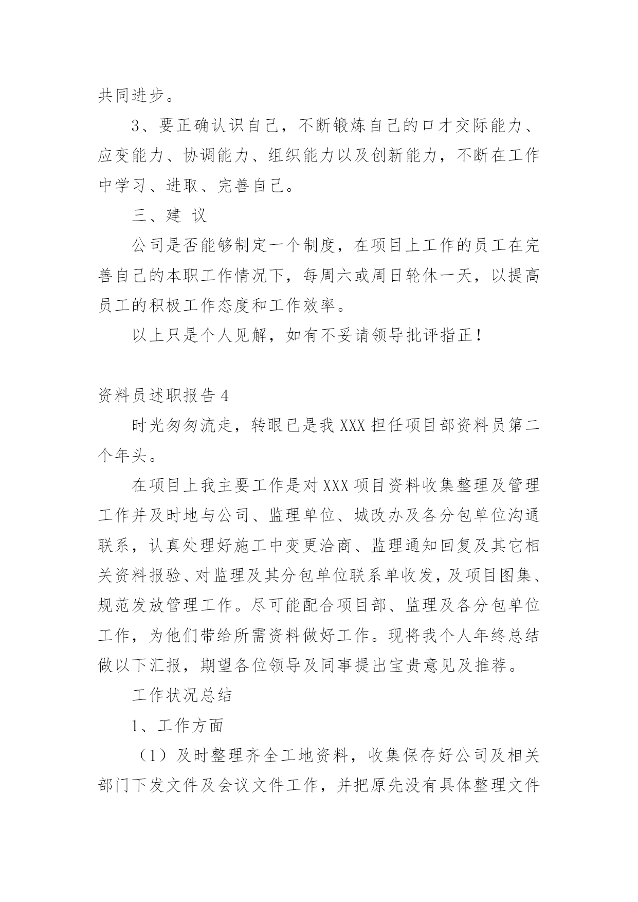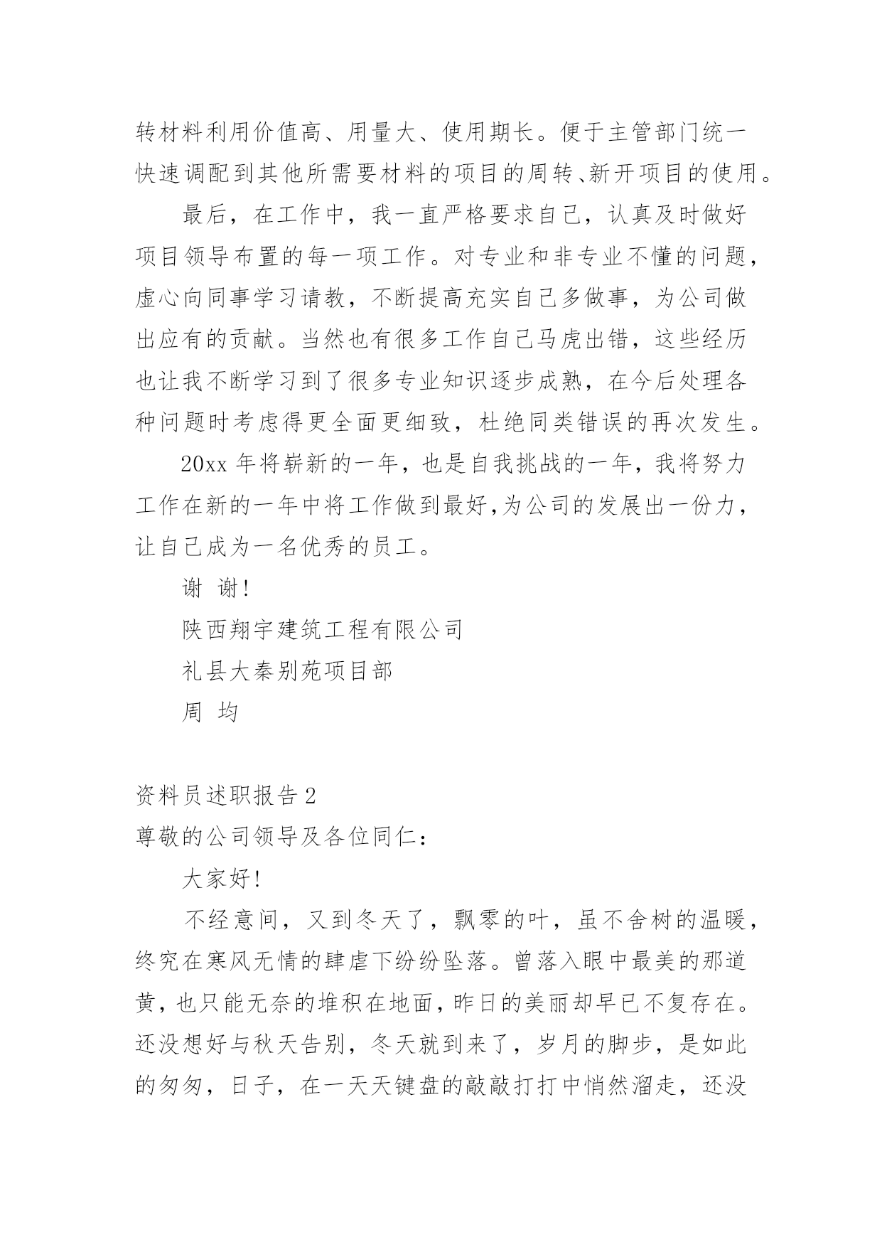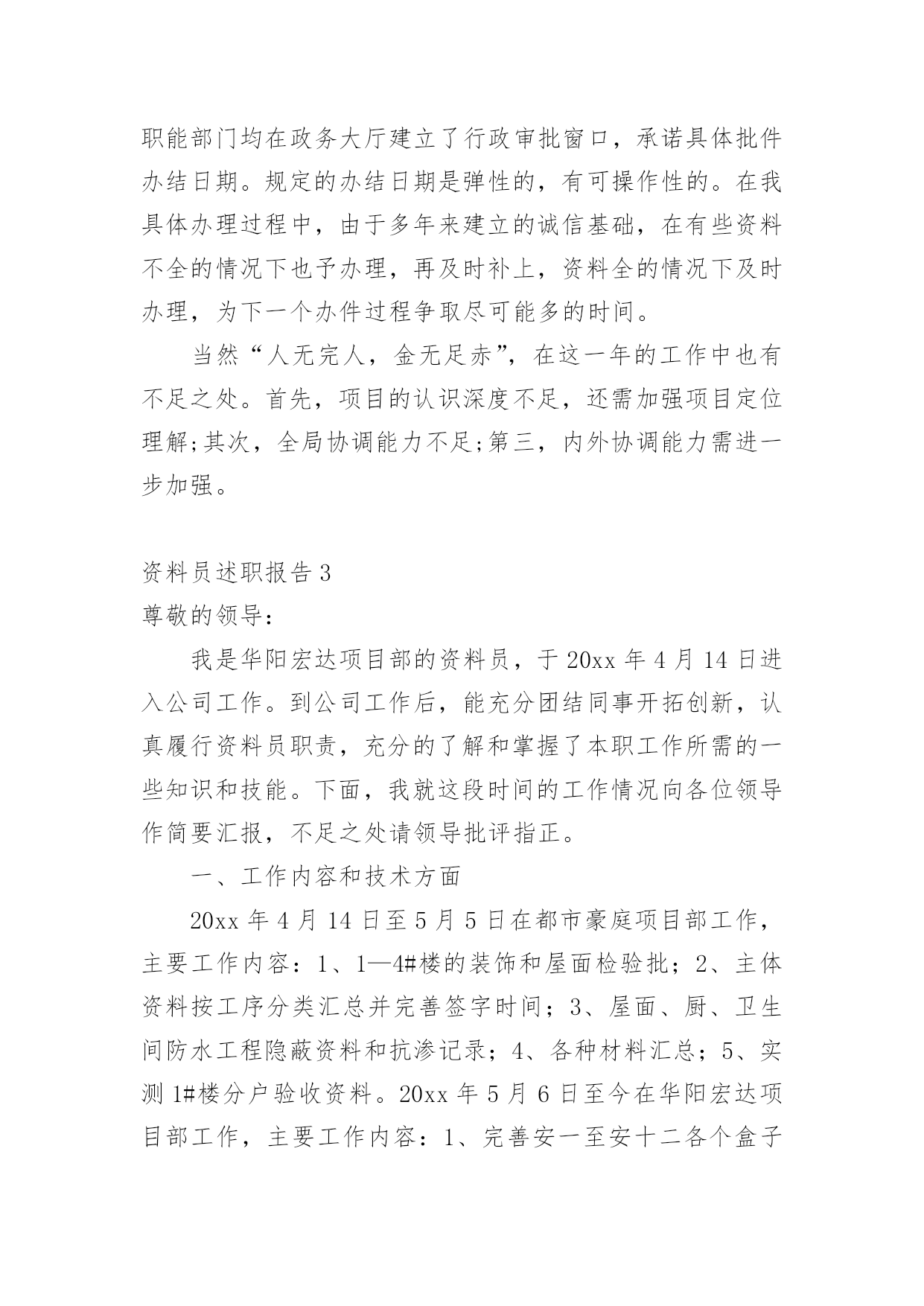 资料员述职报告在生活中,需要使用报告的情况越来越多,我们在写报告的时候要注意逻辑的合理性。那么,报告到底怎么写才合适呢?以下是小编帮大家整理的资料员述职报告,仅供参考,欢迎大家阅读。资料员述职报告1我20xx年12月进入公司,安排在西安万象春天项目任职材料员工作。20xx年根据公司人员调配,安排到礼县大秦别苑项目就职材料员工作。时间一晃而过,整整三年过去了。从中学到了很多不懂的东西,也知道了很多东西我根本就不懂,还得努力学习。20xx年已经接近尾声一年又即将过去,在项目领导和同事的关心、帮助下。通过自身的不懈努力与公司领导和直属部门下项目检查每次都给我们提出很多工作不到位和成绩肯定的方面,从中学习到了很多需要及时纠正的不规范工作,因此在工作中取得了一些成绩,但也存在很多工作不足之处。回顾即将过去的一年,现将本人任材料员一职以来,在项目材料采购、供应、现场管理等工作粗略总结如下:一、加强材料的计划、采购管理。首先要自身认识到作为一名总包项目的材料员责任之重、工作量之大、环节之多。施工项目材料计划是对施工项目工程量所需材料的预计、部署和安排,是指导与组织施工项目材料的订货、采购、加工、储备和供应的依据,是降低成本、加速资金周转、节约资金的一个重要因素。材料计划可根据其内容和作用分为:材料需要计划即供应计划、采购计划和节约计划等细致的步凑环节从而有效掌握准确数据和供应。在采购的时候必须依据项目技术员、施工员按照工程量精准提出所需要材料的名称、数量、型号、的材料计划单。经项目经理审核。采购时必须做到以公司项目工程成本核算为宗旨做到货比三家价格低廉,腿勤、眼勤、嘴勤,熟悉市场行情,掌握市场动态。在采购具体材料前首先要向供料单位要求必须提供产品合格证或出厂质量证明单,并对证明单上所列材料、质量、数量、规格认真审查,将证明单、合格证或试验单送交验收人员和库管员。库管必须仔细按采购数量清点入库归类堆放,做好出入库台账,随时精确掌握材料使用动态。便于出库调拨在采购中未发现的质量问题和解决情况要作详细记录以便备查,对各种材质。大型机械等全套资料及发票证明要有登记和签收手续。二、把好材料入库管理。材料、机械入库前库管必须要严格检查、清点每批材料合格证、质量、数量、规格以及全套资料,做好出入库台账。对采购单、发票认可无误签字。按时报入主管部门登记入账。材料入库首先做到防潮、防变形,防挤压、防火等措施。特殊情况下,不能堆放在库房而放置露天现场的,如钢管、扣件、方木、模板、大型机械设备等在不影响生产情况条件下归类堆放整齐挂上材料标示牌。要及时派专人现场24小时看护,防雨林、防暴晒、覆盖好。防火、防盗窃。在出库数据上库管要勤于了解现场动态,用多少出库多少,不能以领用人无标准的超额领取,扰乱整个工程材料周转使用及领多余的材料乱堆乱放的恶习现象。20xx年大秦别苑项目成本核算大宗材料及零星辅材应该支出共计:3351150.00元三、狠抓现场材料使用浪费现象。首先入场前给职工以书面形式告知进场材料的规范使用细节。其次材料员、保管员在材料出库时,必须把好数量控制这个关键环节,做到腿勤,到工地实际考察根据生产现场的实际数量发放。材料发放到施工现场,就要腿勤、口勤,到现场勤走动、勤讲解宣传提高职工的个人素质和意识。如有发现素质差、意识薄弱累教不改的就要采取铁的手腕措施。对木方模板乱据乱裁的加以严肃的杜绝制止,给予留下影像有效资料证据,出具双倍罚款单据,在结算时从工资中扣出。对现场材料没使用完的材料要立马归类整齐堆放,时间推延迟迟不处理,材料部门立即安排人员给予清理,工资三倍扣出该班组(或个人)。有效规范控制项目成本及现场材料不浪费、不多余、不乱堆乱放的恶习现象。四、加强材料退场、周转管理,提高利用率。项目工程结束面临所有材料都要退场,要及时作出有效的安排计划。再退场过程中必须做到随拆、随收、随清理、随修理、随保养,归类堆放整齐清点准确数据。安排人员全面覆盖,加强防潮、防火、防盗管理措施。及时统计退场材料的名称、型号、数量汇报给总公司材料主管部门,作为周转材料。周转材料利用价值高、用量大、使用期长。便于主管部门统一快速调配到其他所需要材料的项目的周转、新开项目的使用。最后,在工作中,我一直严格要求自己,认真及时做好项目领导布置的每一项工作。对专业和非专业不懂的问题,虚心向同事学习请教,不断提高充实自己多做事,为公司做出应有的贡献。当然也有很多工作自己马虎出错,这些经历也让我不断学习到了很多专业知识逐步成熟,在今后处理各种问题时考虑得更全面更细致,杜绝同类错误的再次发生。20xx年将崭新的一年,也是自我挑战的一年,我将努力工作在新的一年中将工作做到最好,为公司的发展出一份力,让自己成为一名优秀的员工。谢谢!陕西翔宇建筑工程有限公司礼县大秦别苑项目部周均资料员述职报告2