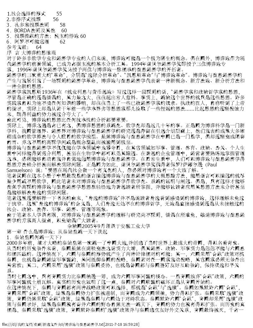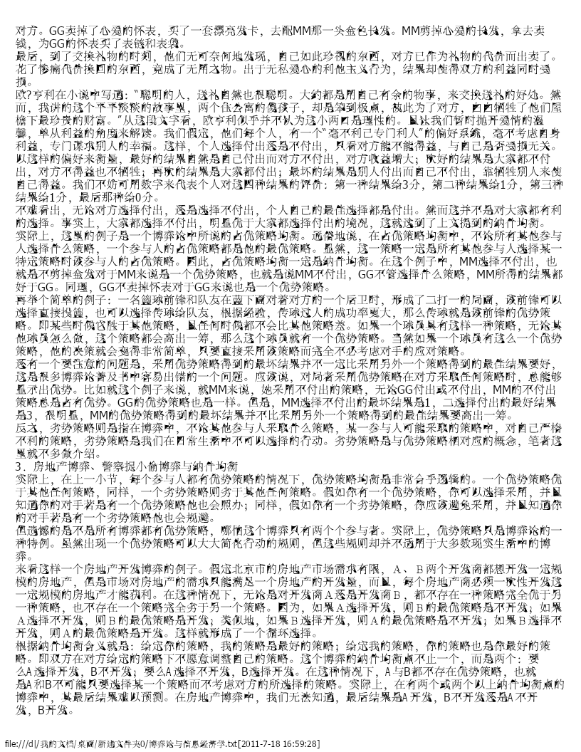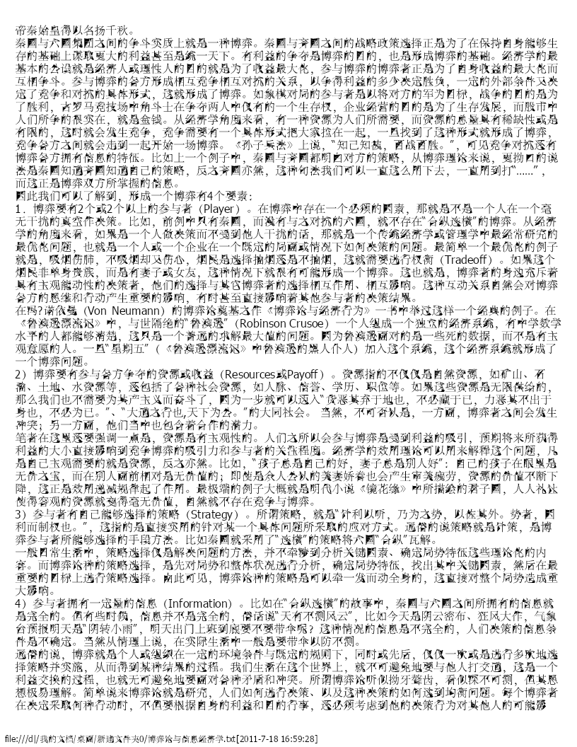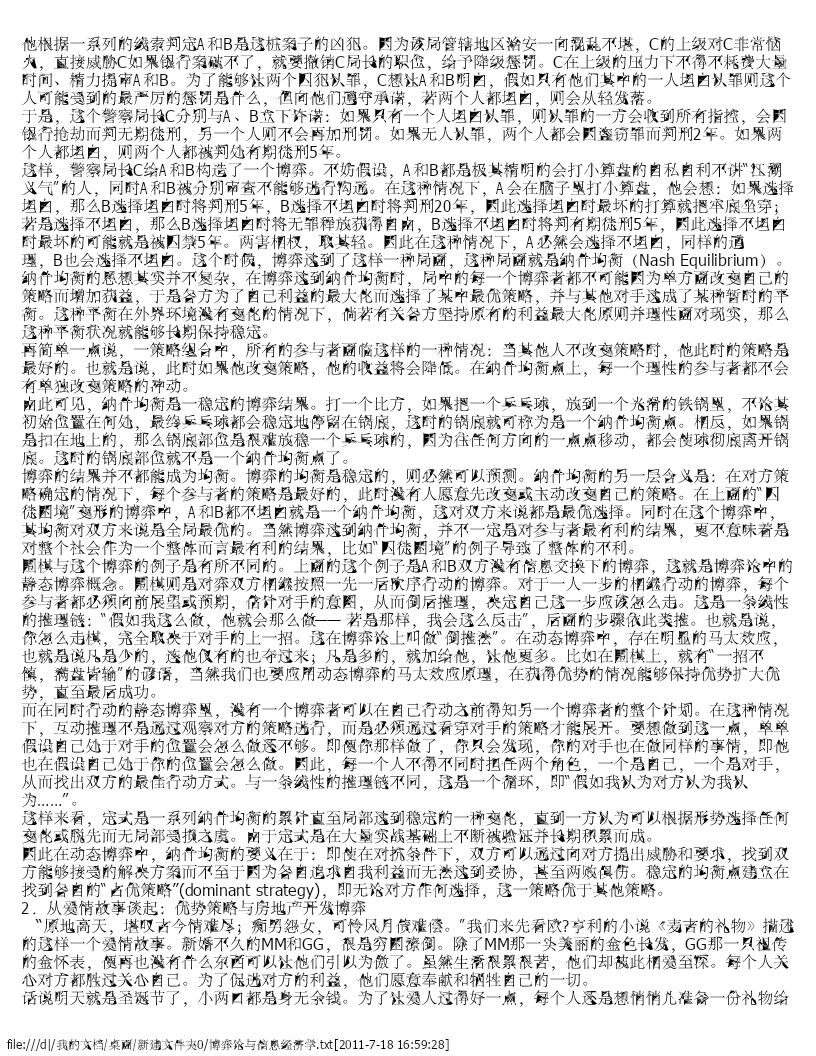 4《身边的博弈论:博弈论与信息经济学浅说》第一稿(未定稿,为北京师范大学出版社某丛书所作)余治国编著(《中国民营企业批判》当代中国出版社,《转型力:中国企业转型之道》清华大学出版社,目前正在创作《企业与企业家道德》国家行政学院出版社)目录序言大博弈的思维观2第一章什么是博弈论:从秦始皇统一天下谈起31.秦始皇因何统一天下?32.博弈是一种竞合游戏53.博弈论不是“万金油”7第二章纳什均衡、纯策略与混和策略81.从围棋定式谈纳什均衡82.从爱情故事谈起:优势策略与房地产开发博弈103.房地产博弈、警察捉小偷博弈与纳什均衡114.位置博弈与商家策略125.猎鹿模型的合作哲学13第三章“囚徒困境”的启示141.“囚徒困境”的深刻哲理142.经济自由与效率163.“囚徒困境”的破解:无限次重复博弈与有限次重复博弈174.威胁、承诺、作弊与惩罚195.国家法律206.猴子的故事与道德约束217.爱克斯罗德试验、针锋相对的策略228.合作、利他主义与爱克斯罗德试验的局限23第四章“智猪博弈”:对诸多现象的解释251.“智猪博弈”的故事252“智猪博弈”与激励机制设计263.企业战略与“智猪博弈”274.证券市场中的“智猪博弈”28第五章常见的博弈案例291.“斗鸡博弈”与“骑虎难下”292.银行会垮掉吗?313.如何以弱胜强?324.公共地悲剧345.少数人博弈与酒吧问题356.房地产市场的多人博弈36第六章信息经济学基础371.信息有价372.从形象工程谈道德风险393.逆向选择的困境:二手车市场为何建立不起来?414.声誉、信号传递与制度设计425.所罗门故事与信息甄别44第七章讨价还价的策略461.从情侣博弈谈起462.先发优势与后发优势473.谈判的要诀:掌握对方心理与妥协484.独裁者博弈与劳资谈判49第八章如何做好一个老板501.管理需要建立预期502.奖罚分明513.强强如何有效联合?534.如何接到一个项目?54第九章民主的悲剧55file:///d|/我的文档/桌面/新建文件夹0/博弈论与信息经济学.txt[2011-7-1816:59:28]1.社会选择的形式552.非排序式投票563.孔多塞投票法则584.BORDA法则及其他605.投票操纵的方法:民主的悖论606.阿罗不可能定理62参考文献:64序言大博弈的思维观对于许多非数学专业和经济学专业的人们来说,博弈论可能是一个极为陌生的概念。但在国外,博弈论作为现代经济学的前沿领域,已成为占据主流的基本分析工具。1994年诺贝尔经济学奖即授予三位博弈论专家,1996年诺贝尔经济学奖又授予两位与博弈论一脉相承的信息经济学的开拓者。经济学的三次重大的“革命”,分别是“边际分析革命”、“凯恩斯革命”与“博弈论革命”。博弈论与信息经济学的产生与发展引发了一场深刻的经济学革命,博弈论与信息经济学代表着一种新概念、新方法论、新分析方法和一种全新的思想。经济学家凯恩斯1936年在《就业利息与货币通论》写过这样一段深刻的话,“经济学家和政治哲学家的思想,不管是正确的还是错误的,其力量之大,往往超出常人意料。事实上,统治这个世界的就只是这些思想。许多实践家自以为绝不受任何知识的影响,却往往当上了一些已故经济学家的奴隶。执政的狂人,自称听到了上帝的指示,实际上却是从若干年前一些学术界劣等思想家那儿拾取了一些怪诞的想法......比起思想的逐渐侵蚀力来,既得利益的势力被过分夸大了。”由此可见,博弈论的思想比任何技术性的分析都要重要。实际上,博弈之道是古已有之,但博弈思想的系统化、数学化却是近几十年的事。正是因为博弈科学是一门新学科,我国管理界、经济界对博弈论与信息经济学的研究还是停留在引进介绍层面上,他们发表的成果大多堆砌庞杂的数学算法与令人眩目的数学模型。虽然博弈论与信息经济学在中国已是一门显学,但却逐渐变成阳春白雪、弃之不用的高深学问或是概念混乱而被滥用到极至。博弈论与信息经济学不仅仅能在学术领域中光彩夺目,在其它领域如军事、管理、体育、政治、公关、个人生活中同样能得到充分利用,甚至在生物学中都可以觅其踪迹。在普通的企业管理中,经营者要熟练地掌握管理之术,必须能够自动自发并自觉地运用博弈论与信息经济学。在日常生活中,人们可以博弈论与信息经济学得思想方法赖分析甚而解决实际问题。正是因为如此,诺贝尔经济学奖获得者保罗?萨缪尔逊(PaulSamuelson)说:“要想在现代社会做一个有文化的人,你必须对博弈论有一个大致了解。”笔者试图在这本小册子中用最浅显的语言描述博弈论与信息经济学的大概思路方法,能用语言可以描述的就尽量
