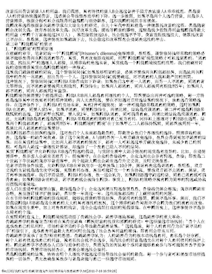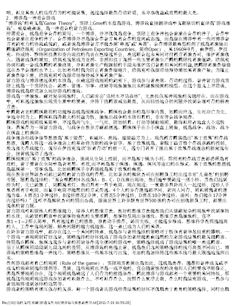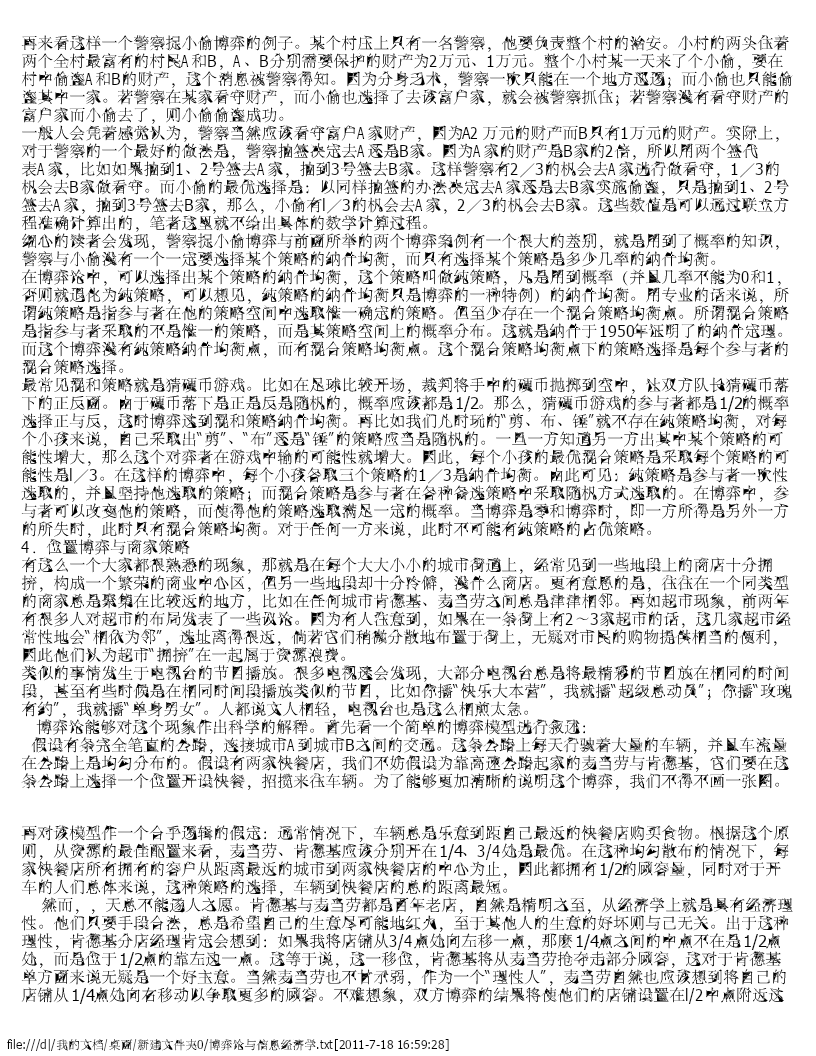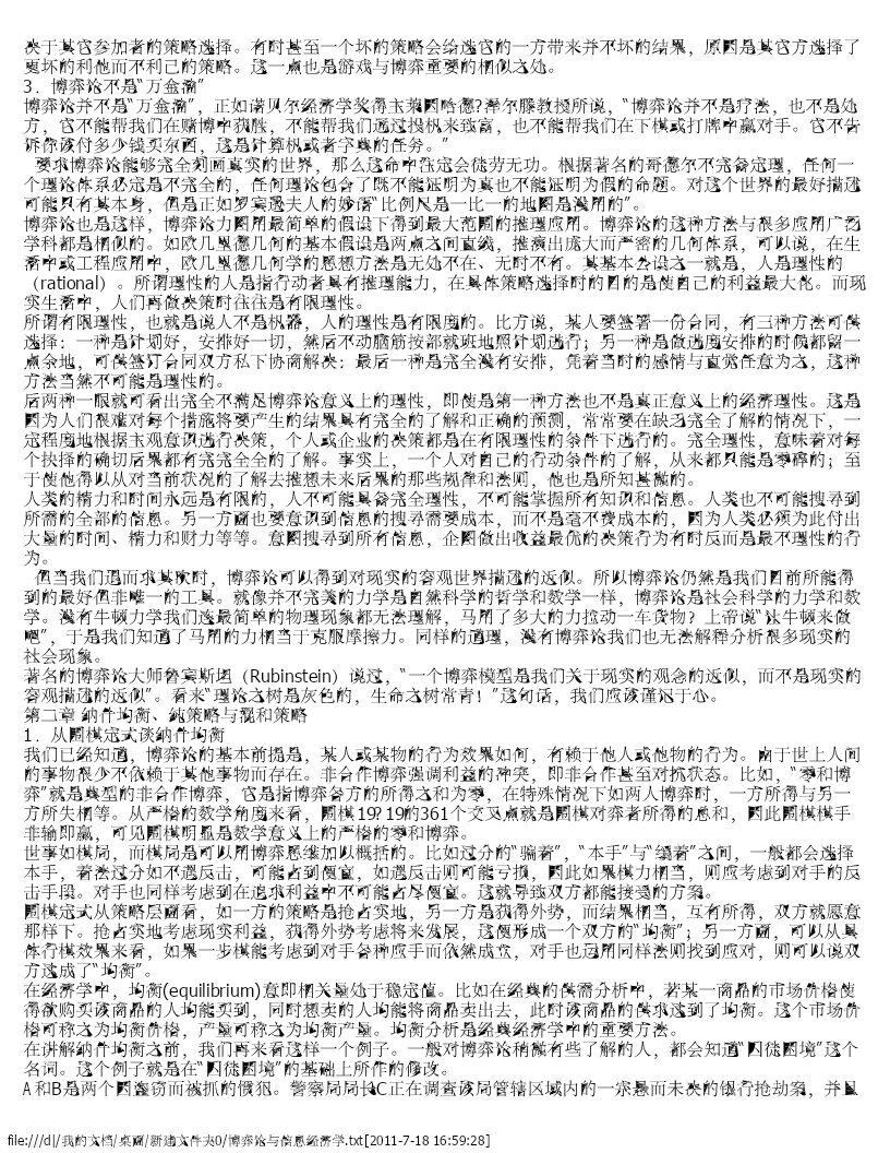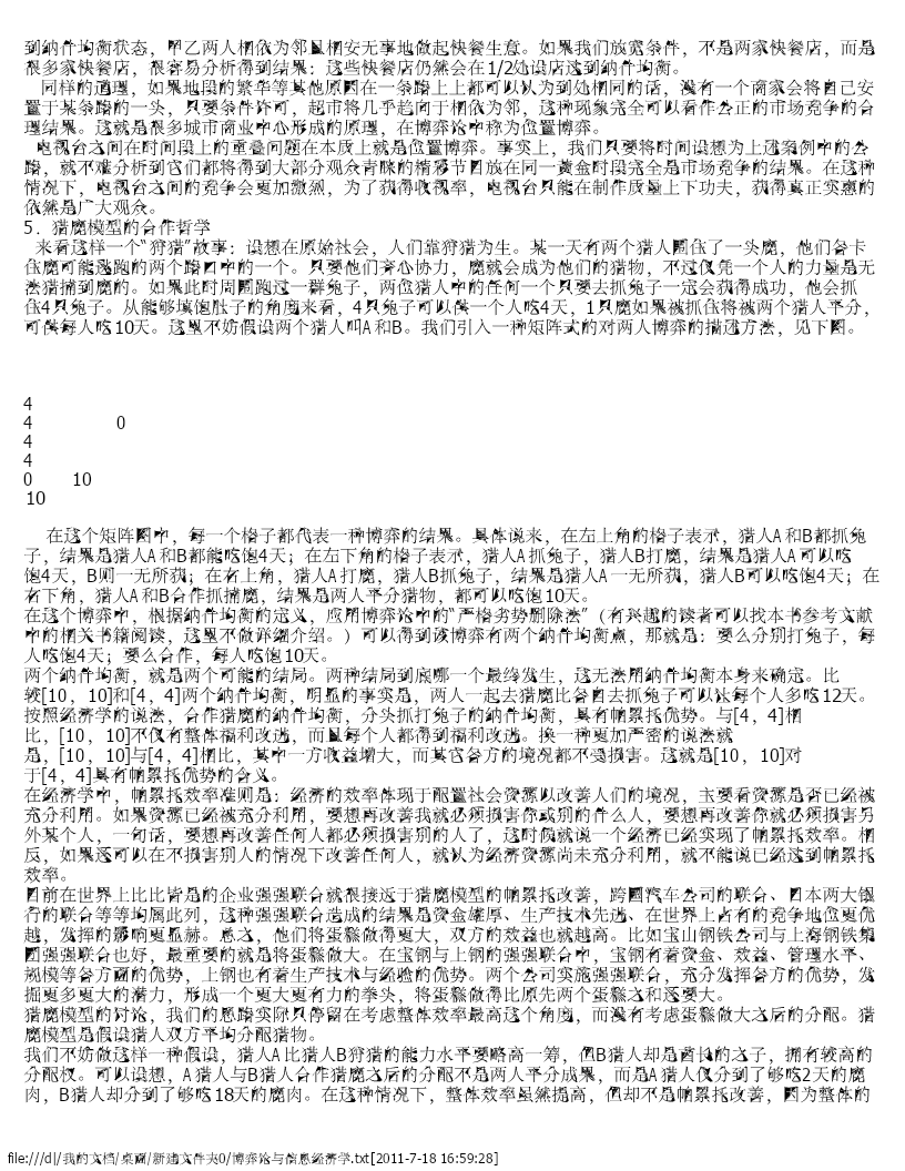 4《身边的博弈论:博弈论与信息经济学浅说》第一稿(未定稿,为北京师范大学出版社某丛书所作)余治国编著(《中国民营企业批判》当代中国出版社,《转型力:中国企业转型之道》清华大学出版社,目前正在创作《企业与企业家道德》国家行政学院出版社)目录序言大博弈的思维观2第一章什么是博弈论:从秦始皇统一天下谈起31.秦始皇因何统一天下?32.博弈是一种竞合游戏53.博弈论不是“万金油”7第二章纳什均衡、纯策略与混和策略81.从围棋定式谈纳什均衡82.从爱情故事谈起:优势策略与房地产开发博弈103.房地产博弈、警察捉小偷博弈与纳什均衡114.位置博弈与商家策略125.猎鹿模型的合作哲学13第三章“囚徒困境”的启示141.“囚徒困境”的深刻哲理142.经济自由与效率163.“囚徒困境”的破解:无限次重复博弈与有限次重复博弈174.威胁、承诺、作弊与惩罚195.国家法律206.猴子的故事与道德约束217.爱克斯罗德试验、针锋相对的策略228.合作、利他主义与爱克斯罗德试验的局限23第四章“智猪博弈”:对诸多现象的解释251.“智猪博弈”的故事252“智猪博弈”与激励机制设计263.企业战略与“智猪博弈”274.证券市场中的“智猪博弈”28第五章常见的博弈案例291.“斗鸡博弈”与“骑虎难下”292.银行会垮掉吗?313.如何以弱胜强?324.公共地悲剧345.少数人博弈与酒吧问题356.房地产市场的多人博弈36第六章信息经济学基础371.信息有价372.从形象工程谈道德风险393.逆向选择的困境:二手车市场为何建立不起来?414.声誉、信号传递与制度设计425.所罗门故事与信息甄别44第七章讨价还价的策略461.从情侣博弈谈起462.先发优势与后发优势473.谈判的要诀:掌握对方心理与妥协484.独裁者博弈与劳资谈判49第八章如何做好一个老板501.管理需要建立预期502.奖罚分明513.强强如何有效联合?534.如何接到一个项目?54第九章民主的悲剧55file:///d|/我的文档/桌面/新建文件夹0/博弈论与信息经济学.txt[2011-7-1816:59:28]1.社会选择的形式552.非排序式投票563.孔多塞投票法则584.BORDA法则及其他605.投票操纵的方法:民主的悖论606.阿罗不可能定理62参考文献:64序言大博弈的思维观对于许多非数学专业和经济学专业的人们来说,博弈论可能是一个极为陌生的概念。但在国外,博弈论作为现代经济学的前沿领域,已成为占据主流的基本分析工具。1994年诺贝尔经济学奖即授予三位博弈论专家,1996年诺贝尔经济学奖又授予两位与博弈论一脉相承的信息经济学的开拓者。经济学的三次重大的“革命”,分别是“边际分析革命”、“凯恩斯革命”与“博弈论革命”。博弈论与信息经济学的产生与发展引发了一场深刻的经济学革命,博弈论与信息经济学代表着一种新概念、新方法论、新分析方法和一种全新的思想。经济学家凯恩斯1936年在《就业利息与货币通论》写过这样一段深刻的话,“经济学家和政治哲学家的思想,不管是正确的还是错误的,其力量之大,往往超出常人意料。事实上,统治这个世界的就只是这些思想。许多实践家自以为绝不受任何知识的影响,却往往当上了一些已故经济学家的奴隶。执政的狂人,自称听到了上帝的指示,实际上却是从若干年前一些学术界劣等思想家那儿拾取了一些怪诞的想法......比起思想的逐渐侵蚀力来,既得利益的势力被过分夸大了。”由此可见,博弈论的思想比任何技术性的分析都要重要。实际上,博弈之道是古已有之,但博弈思想的系统化、数学化却是近几十年的事。正是因为博弈科学是一门新学科,我国管理界、经济界对博弈论与信息经济学的研究还是停留在引进介绍层面上,他们发表的成果大多堆砌庞杂的数学算法与令人眩目的数学模型。虽然博弈论与信息经济学在中国已是一门显学,但却逐渐变成阳春白雪、弃之不用的高深学问或是概念混乱而被滥用到极至。博弈论与信息经济学不仅仅能在学术领域中光彩夺目,在其它领域如军事、管理、体育、政治、公关、个人生活中同样能得到充分利用,甚至在生物学中都可以觅其踪迹。在普通的企业管理中,经营者要熟练地掌握管理之术,必须能够自动自发并自觉地运用博弈论与信息经济学。在日常生活中,人们可以博弈论与信息经济学得思想方法赖分析甚而解决实际问题。正是因为如此,诺贝尔经济学奖获得者保罗?萨缪尔逊(PaulSamuelson)说:“要想在现代社会做一个有文化的人,你必须对博弈论有一个大致了解。”笔者试图在这本小册子中用最浅显的语言描述博弈论与信息经济学的大概思路方法,能用语言可以描述的就尽量