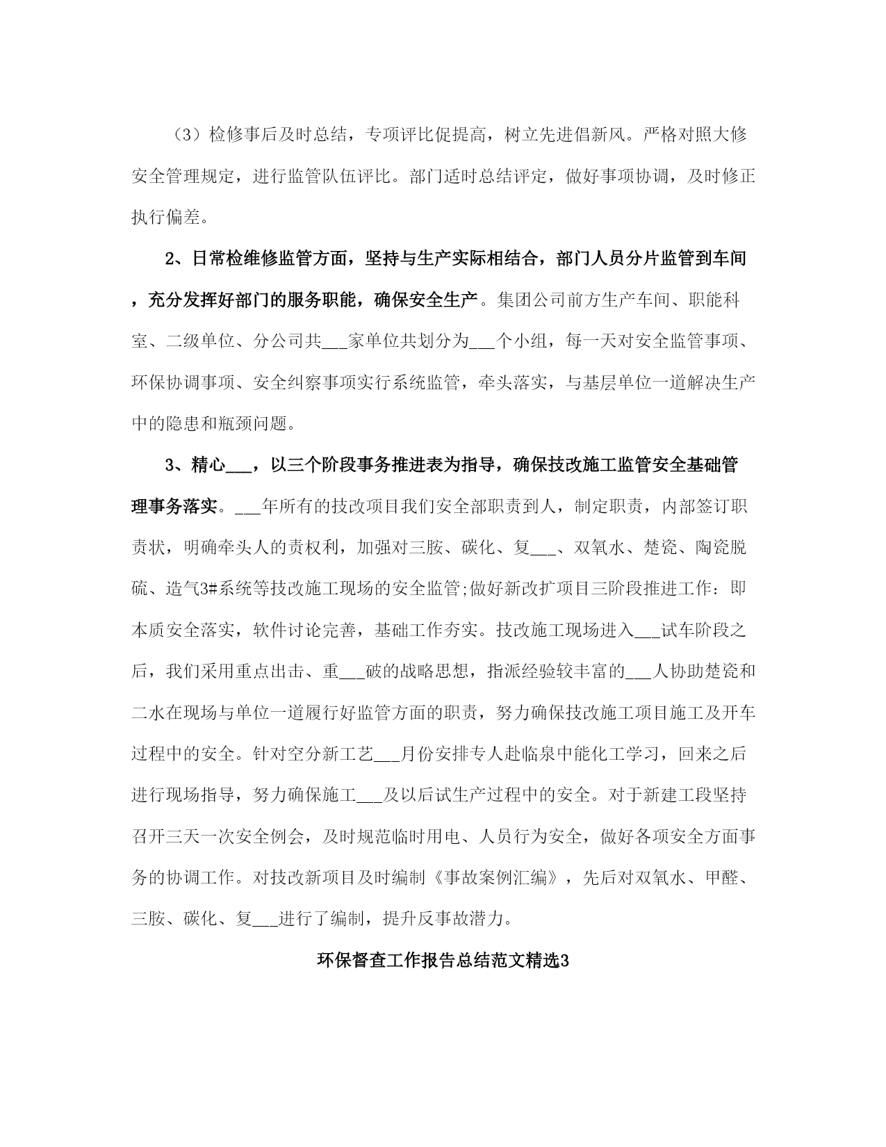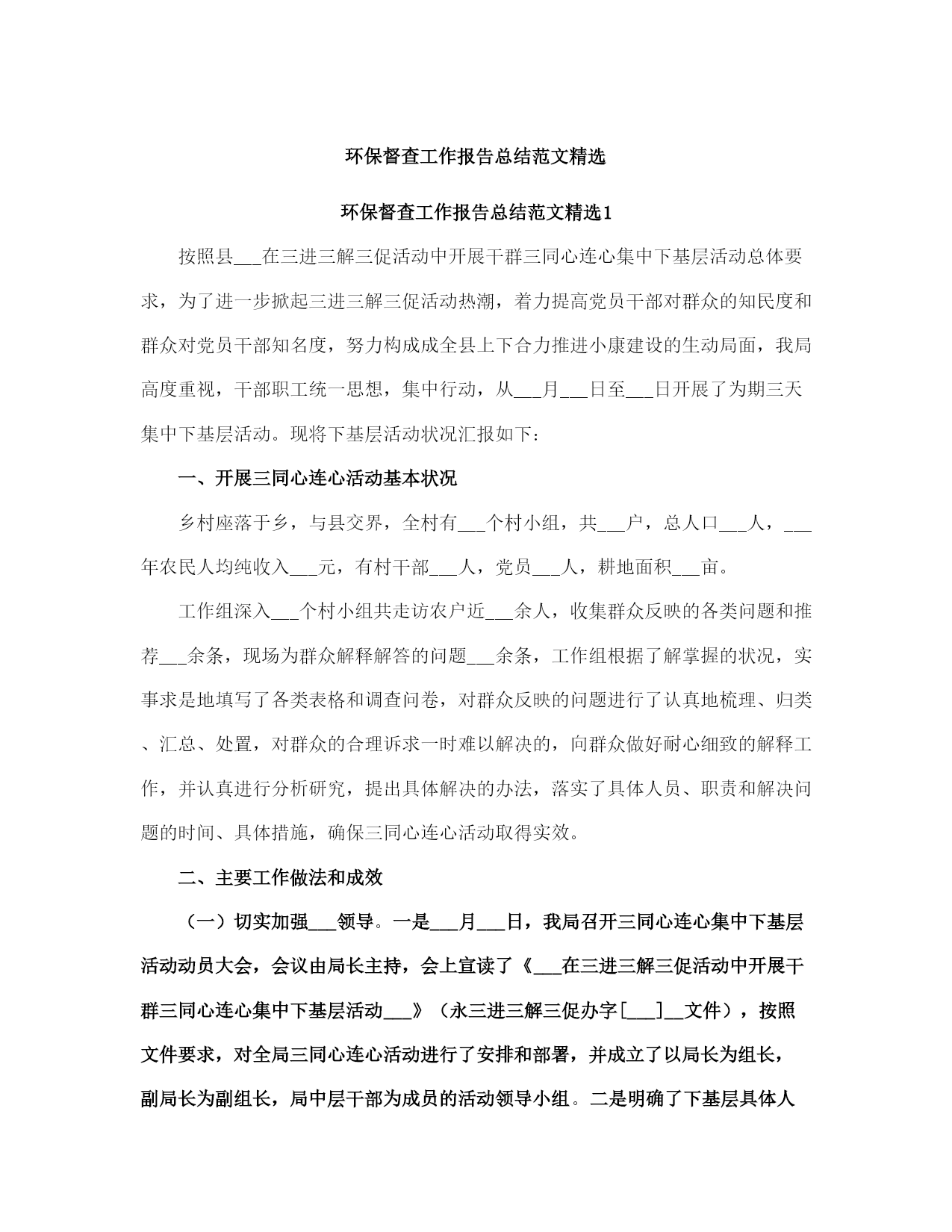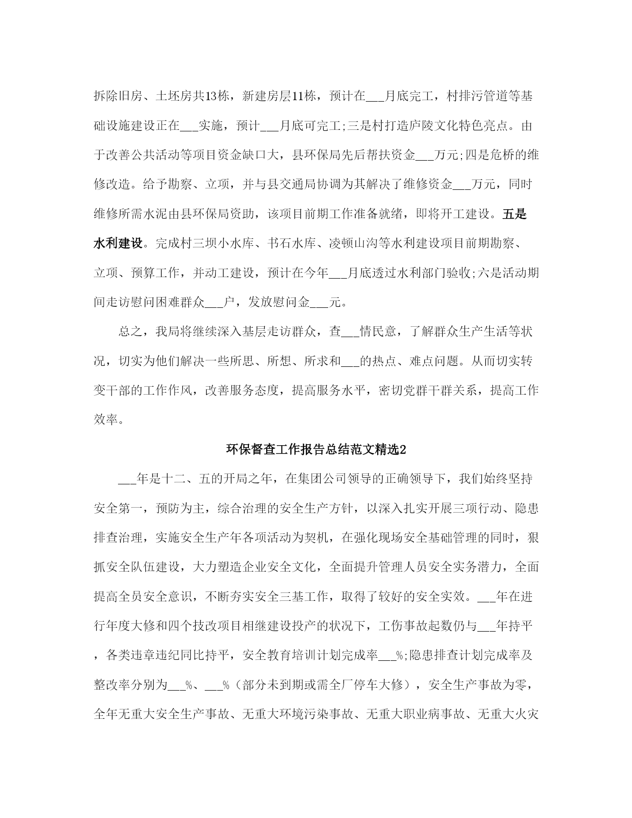 环保督查工作报告总结(完整版)文档资料可直接使用,可编辑,欢迎下载环保督查工作报告总结范文精选环保督查工作报告总结范文精选1按照县___在三进三解三促活动中开展干群三同心连心集中下基层活动总体要求,为了进一步掀起三进三解三促活动热潮,着力提高党员干部对群众的知民度和群众对党员干部知名度,努力构成成全县上下合力推进小康建设的生动局面,我局高度重视,干部职工统一思想,集中行动,从___月___日至___日开展了为期三天集中下基层活动。现将下基层活动状况汇报如下:一、开展三同心连心活动基本状况乡村座落于乡,与县交界,全村有___个村小组,共___户,总人口___人,___年农民人均纯收入___元,有村干部___人,党员___人,耕地面积___亩。工作组深入___个村小组共走访农户近___余人,收集群众反映的各类问题和推荐___余条,现场为群众解释解答的问题___余条,工作组根据了解掌握的状况,实事求是地填写了各类表格和调查问卷,对群众反映的问题进行了认真地梳理、归类、汇总、处置,对群众的合理诉求一时难以解决的,向群众做好耐心细致的解释工作,并认真进行分析研究,提出具体解决的办法,落实了具体人员、职责和解决问题的时间、具体措施,确保三同心连心活动取得实效。二、主要工作做法和成效(一)切实加强___领导。一是___月___日,我局召开三同心连心集中下基层活动动员大会,会议由局长主持,会上宣读了《___在三进三解三促活动中开展干群三同心连心集中下基层活动___》(永三进三解三促办字[___]__文件),按照文件要求,对全局三同心连心活动进行了安排和部署,并成立了以局长为组长,副局长为副组长,局中层干部为成员的活动领导小组。二是明确了下基层具体人员和时间,真正做到三到位,即思想动员到位、人员落实到位、计划安排到位。三是由局长同志亲自带队深入乡村开展活动,进村入户与村民同吃、同住、同劳动,真正构成了人往基层走、劲往基层使、事往基层办、矛盾基层解的工作局面。(二)仔细了解民情民意。工作组人员深入基层、深入一线、深入群众,倾听群众诉求,了解群众期盼。透过应对面座谈,主动关心群众困难和疾苦,及时化解各类矛盾纠纷,用心掌握群众思想动态(范本)和___热点,摸清民情民意。(三)广泛听取意见。工作组人员深入到群众中去,拜人民为师,甘当他们的小学生,虚于问政于民,问需于民、问计于民。透过听取意见了解实情掌握第一手材料,检验政策和工作是否贴合实际,有没有给群众带来实惠;透过听取推荐,研究实招,总结经验教训,找到解难题的办法,不断提高推动科学发展决策水平和工作水平,透过上门上户收集群众意见推荐___条。(四)大力宣传法律法规和政策。工作组用心向群众宣传党的___大精神,党的路线方针政策,国家的(范本)法律法规,有针对性做好群众思想政治工作。透过宣讲法律法规政策,帮忙群众正确理解政策、真正拥护、自觉执行政策;帮忙群众学法、知法、守法,引导群众以理性合法的形式表达利益诉求,用法律手段维护自身合法权益。(五)用心化解矛盾纠纷。工作组深入群众沟通交流,针对群众林权纠纷、土地征用、农村宗族矛盾等进行了重点排查、重点化解。___天共化解矛盾纠纷共___起,促进了社会和谐稳定,最大限度激发社会活力。(六)切实为群众解决实际困难和问题。一是村组新农村点水泥路铺设___公里。帮忙给予勘察立项、购买水泥___吨,路面硬化全面竣工;二是新农村建设点拆除旧房、土坯房共13栋,新建房层11栋,预计在___月底完工,村排污管道等基础设施建设正在___实施,预计___月底可完工;三是村打造庐陵文化特色亮点。由于改善公共活动等项目资金缺口大,县环保局先后帮扶资金___万元;四是危桥的维修改造。给予勘察、立项,并与县交通局协调为其解决了维修资金___万元,同时维修所需水泥由县环保局资助,该项目前期工作准备就绪,即将开工建设。五是水利建设。完成村三坝小水库、书石水库、凌顿山沟等水利建设项目前期勘察、立项、预算工作,并动工建设,预计在今年___月底透过水利部门验收;六是活动期间走访慰问困难群众___户,发放慰问金___元。总之,我局将继续深入基层走访群众,查___情民意,了解群众生产生活等状况,切实为他们解决一些所思、所想、所求和___的热点、难点问题。从而切实转变干部的工作作风,改善服务态度,提高服务水平,密切党群干群关系,提高工作效率。环保督查工作报告总结范文精选2___年是十二、五的开局之年,在集团公司领导的正确领导下,我们始终坚持安全第一,预防为主,综合治理的安全生产方针,以深入扎实开展三项行动、隐患排查治理,实施安全生产年各项活动为契机,在强化现场安全基础管理的同时,狠抓安全队伍建设,大力塑造企业安全文化,全面提升管理人员安全实务潜力,全面提高全员安全意