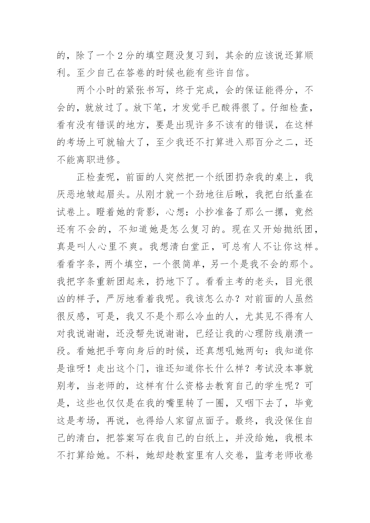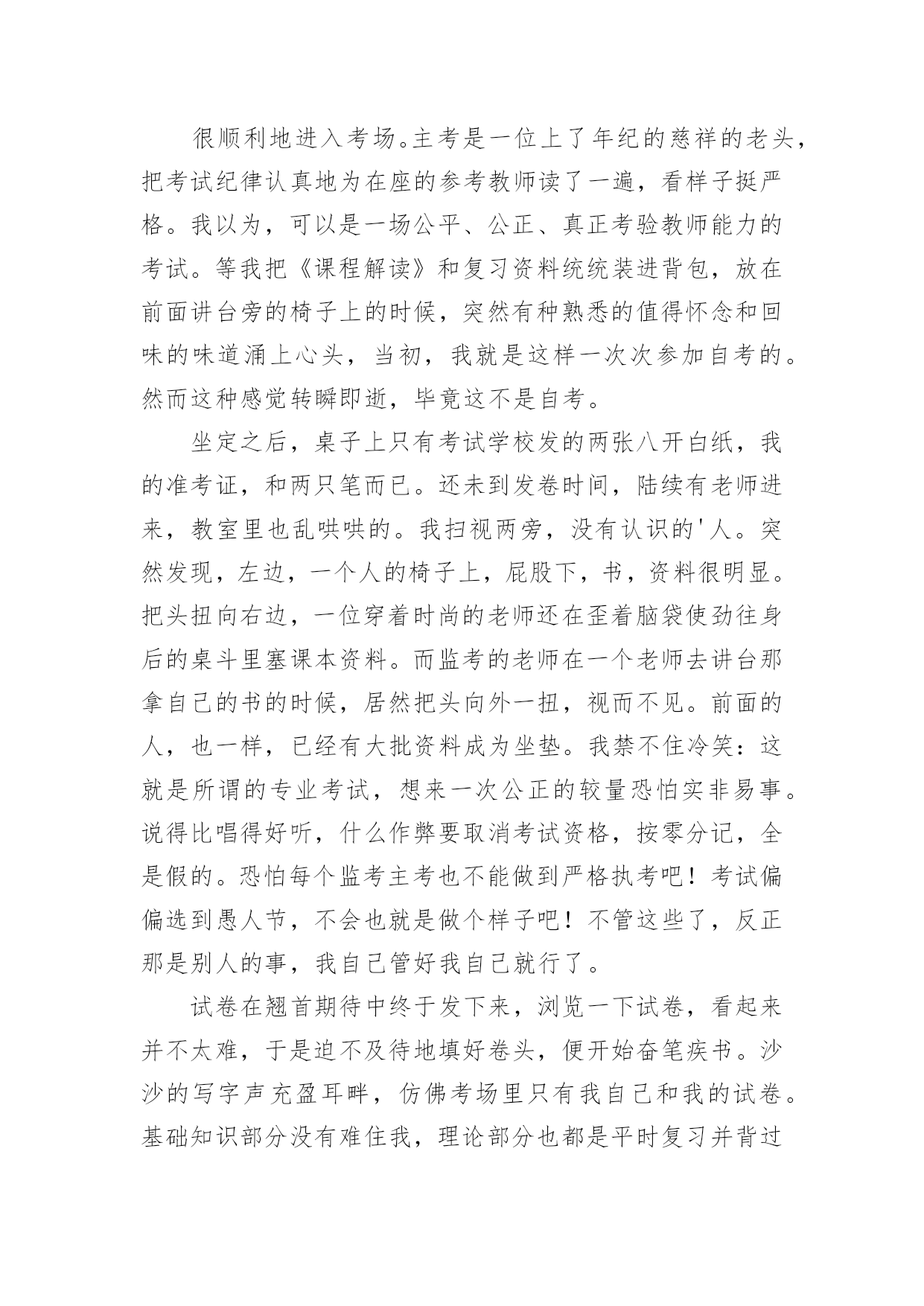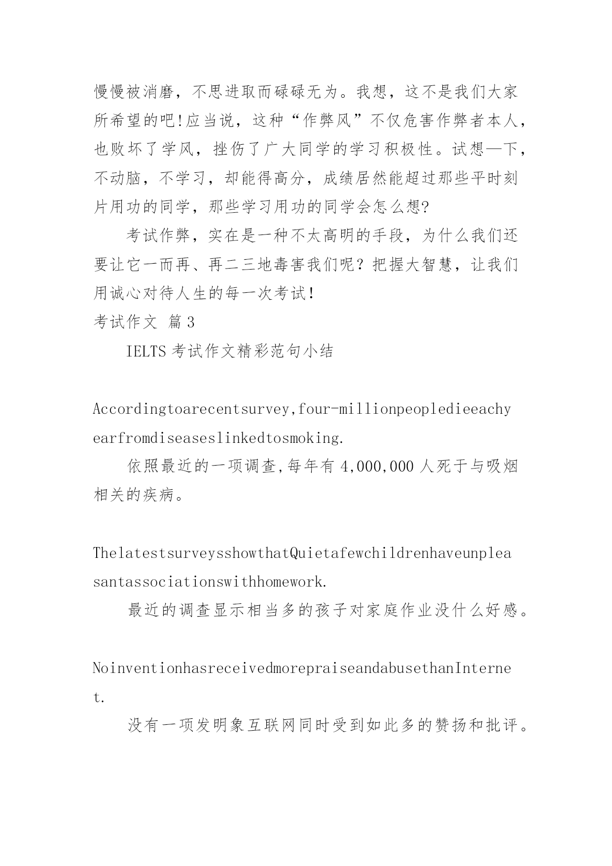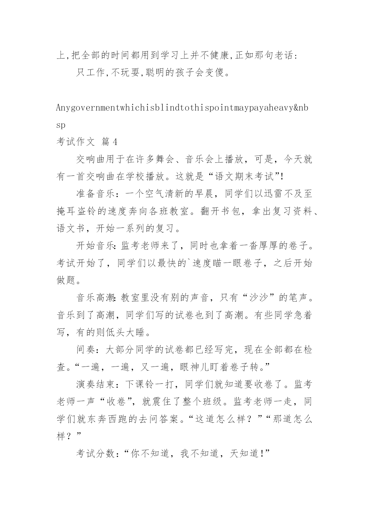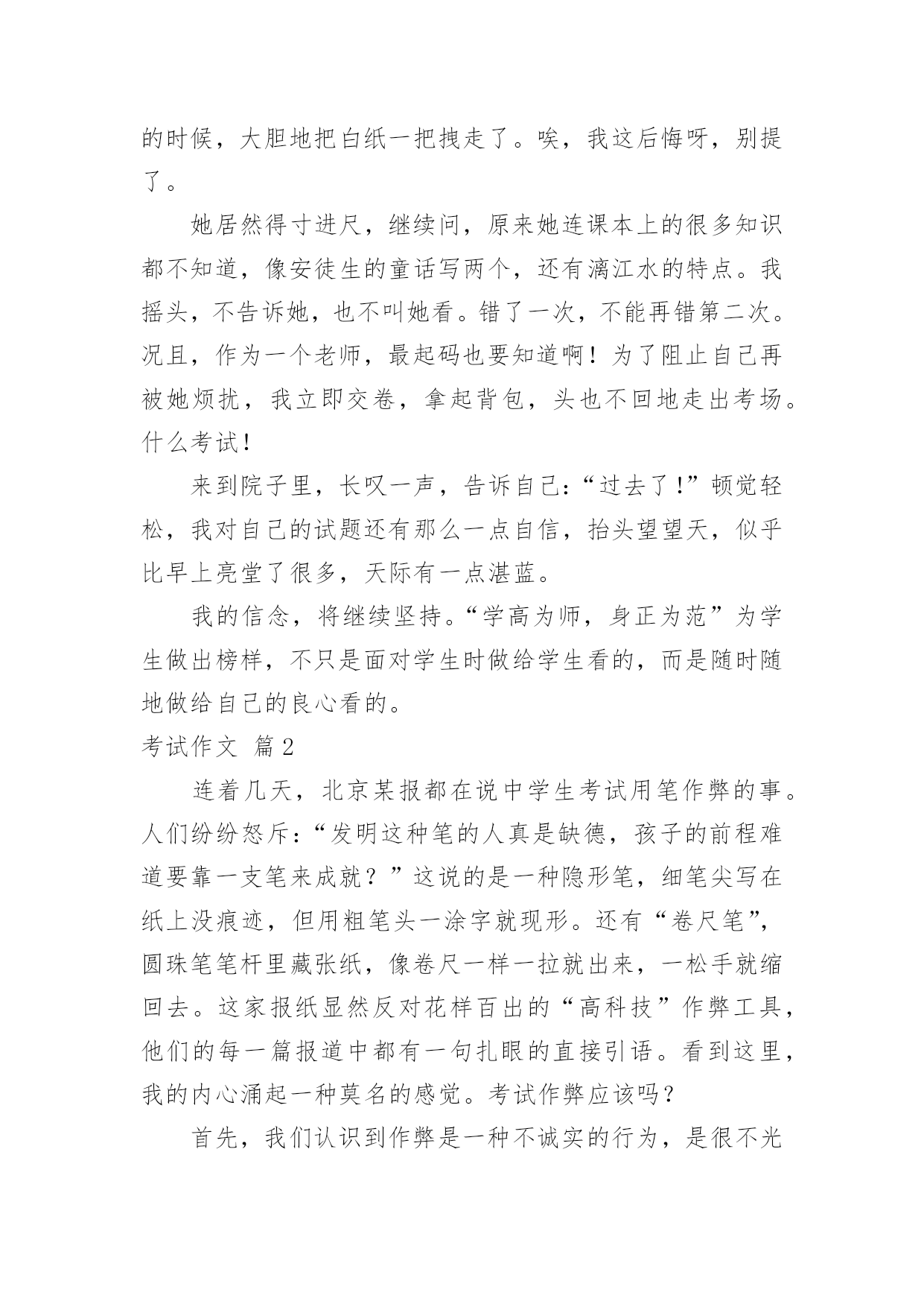 考试作文【实用】考试作文5篇在生活、工作和学习中,大家都接触过作文吧,作文是人们把记忆中所存储的有关知识、经验和思想用书面形式表达出来的记叙方式。那么,怎么去写作文呢?以下是小编整理的考试作文5篇,供大家参考借鉴,希望可以帮助到有需要的朋友。考试作文篇1上午,带着蒙胧的梦出发,前往考试的路上。天,虽然阴沉沉、灰蒙蒙的,但不冷。春,已来到。一边和同事讨论前一晚各自做的考试梦,一边欣赏路边的风景:麦田里,翠绿侵入视野;偶尔发现一片片雪白的杏花,在微凉的晨风中绽放枝头。路旁的白杨树上一串串绿色的花苞挂满枝头;树下,停着两只黑白相间的喜鹊喳喳叫。“嘿,好兆头!考试一定没问题。”我自我安慰地想着,感觉倒也惬意,就连考试的紧张也一时无踪可寻。到达考试学校,校园里已是人群熙熙攘攘。大家七嘴八舌地议论考试的场次以及准备情况。大家的衣服都挺特别的,兜很多。去厕所的人很多,大部分都是将准备的一沓一沓的精心拼凑的白色纸条塞进兜里。我无奈,也不屑。周围的朋友说我太正直,也可能有人会笑我傻,也有可能有人觉得我像古代的秀才一样迂腐,但是都无所谓。我只知道,我要做得光明磊落。依靠小抄,到不如去依靠自己。很顺利地进入考场。主考是一位上了年纪的慈祥的老头,把考试纪律认真地为在座的参考教师读了一遍,看样子挺严格。我以为,可以是一场公平、公正、真正考验教师能力的考试。等我把《课程解读》和复习资料统统装进背包,放在前面讲台旁的椅子上的时候,突然有种熟悉的值得怀念和回味的味道涌上心头,当初,我就是这样一次次参加自考的。然而这种感觉转瞬即逝,毕竟这不是自考。坐定之后,桌子上只有考试学校发的两张八开白纸,我的准考证,和两只笔而已。还未到发卷时间,陆续有老师进来,教室里也乱哄哄的。我扫视两旁,没有认识的'人。突然发现,左边,一个人的椅子上,屁股下,书,资料很明显。把头扭向右边,一位穿着时尚的老师还在歪着脑袋使劲往身后的桌斗里塞课本资料。而监考的老师在一个老师去讲台那拿自己的书的时候,居然把头向外一扭,视而不见。前面的人,也一样,已经有大批资料成为坐垫。我禁不住冷笑:这就是所谓的专业考试,想来一次公正的较量恐怕实非易事。说得比唱得好听,什么作弊要取消考试资格,按零分记,全是假的。恐怕每个监考主考也不能做到严格执考吧!考试偏偏选到愚人节,不会也就是做个样子吧!不管这些了,反正那是别人的事,我自己管好我自己就行了。试卷在翘首期待中终于发下来,浏览一下试卷,看起来并不太难,于是迫不及待地填好卷头,便开始奋笔疾书。沙沙的写字声充盈耳畔,仿佛考场里只有我自己和我的试卷。基础知识部分没有难住我,理论部分也都是平时复习并背过的,除了一个2分的填空题没复习到,其余的应该说还算顺利。至少自己在答卷的时候也能有些许自信。两个小时的紧张书写,终于完成,会的保证能得分,不会的,就放过了。放下笔,才发觉手已酸得很了。仔细检查,看有没有错误的地方,要是出现许多不该有的错误,在这样的考场上可就输大了,至少我还不打算进入那百分之二,还不能离职进修。正检查呢,前面的人突然把一个纸团扔杂我的桌上,我厌恶地皱起眉头。从刚才就一个劲地往后瞅,我把白纸盖在试卷上。瞪着她的背影,心想:小抄准备了那么一摞,竟然还有不会的,不知道她是怎么复习的。现在又开始抛纸团,真是叫人心里不爽。我想清白堂正,可总有人不让你这样。看看字条,两个填空,一个很简单,另一个是我不会的那个。我把字条重新团起来,扔地下了。看看主考的老头,目光很凶的样子,严厉地看着我呢。我该怎么办?对前面的人虽然很反感,可是,我又不是个那么冷血的人,尤其见不得有人对我说谢谢,还没帮先说谢谢,已经让我的心理防线崩溃一段。看她把手弯向身后的时候,还真想吼她两句:我知道你是谁呀!走出这个门,谁还知道你长什么样?考试没本事就别考,当老师的,这样有什么资格去教育自己的学生呢?可是,这些也仅仅是在我的嘴里转了一圈,又咽下去了,毕竟这是考场,再说,也得给人家留点面子。最终,我没保住自己的清白,把答案写在我自己的白纸上,并没给她,我根本不打算给她。不料,她却趁教室里有人交卷,监考老师收卷的时候,大胆地把白纸一把拽走了。唉,我这后悔呀,别提了。她居然得寸进尺,继续问,原来她连课本上的很多知识都不知道,像安徒生的童话写两个,还有漓江水的特点。我摇头,不告诉她,也不叫她看。错了一次,不能再错第二次。况且,作为一个老师,最起码也要知道啊!为了阻止自己再被她烦扰,我立即交卷,拿起背包,头也不回地走出考场。什么考试!来到院子里,长叹一声,告诉自己:“过去了!”顿觉轻松,我对自己的试题还有那么一点自信,抬头望望天,似乎比早上亮堂了很多,天际有一点湛蓝。我的信念,将继续坚持。“学高为师,身正为范”为学生做出榜样,不只是面对学生时做给学生看的,而是随时随地做给自己的良心看的。考试作文篇2连着几天