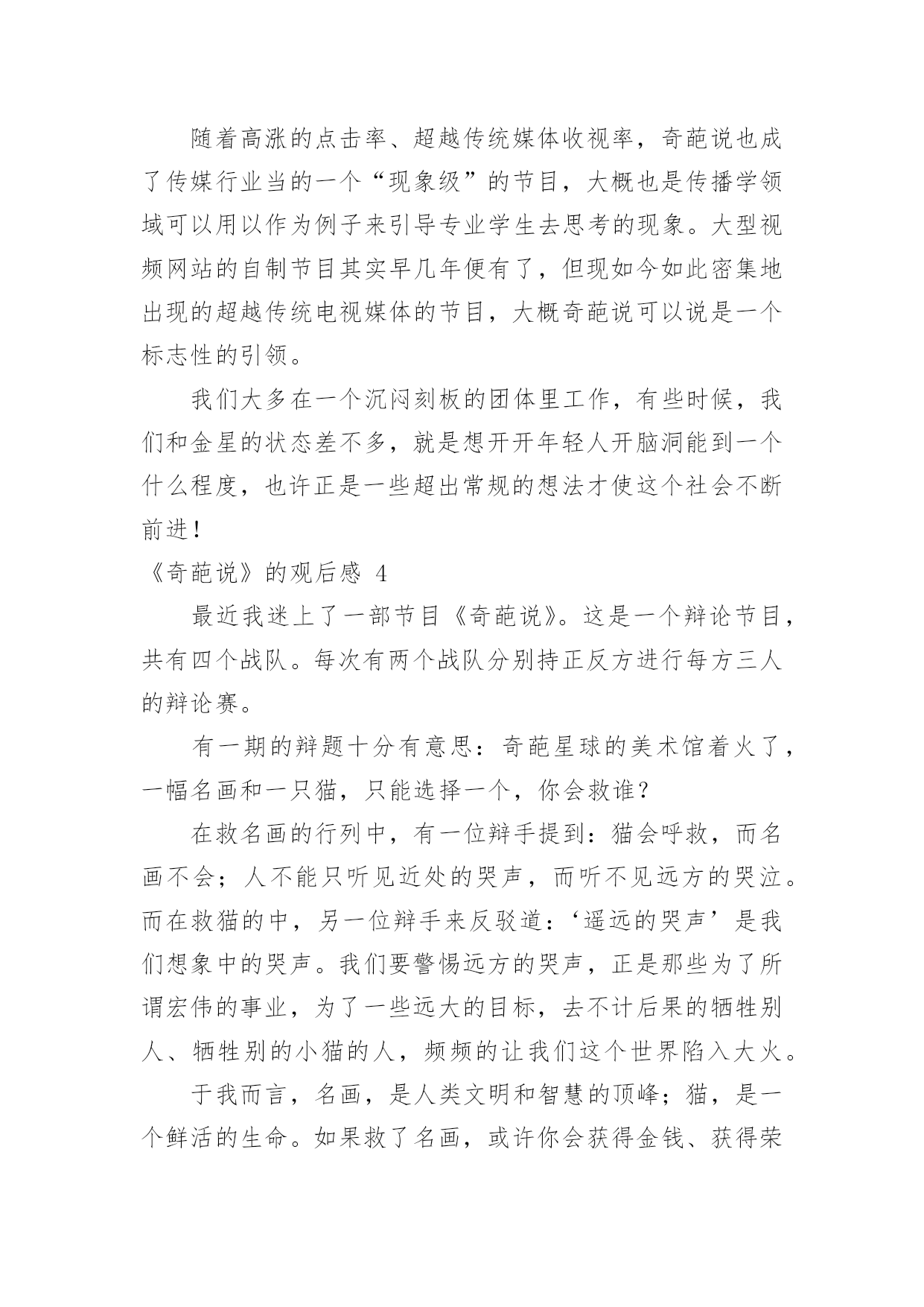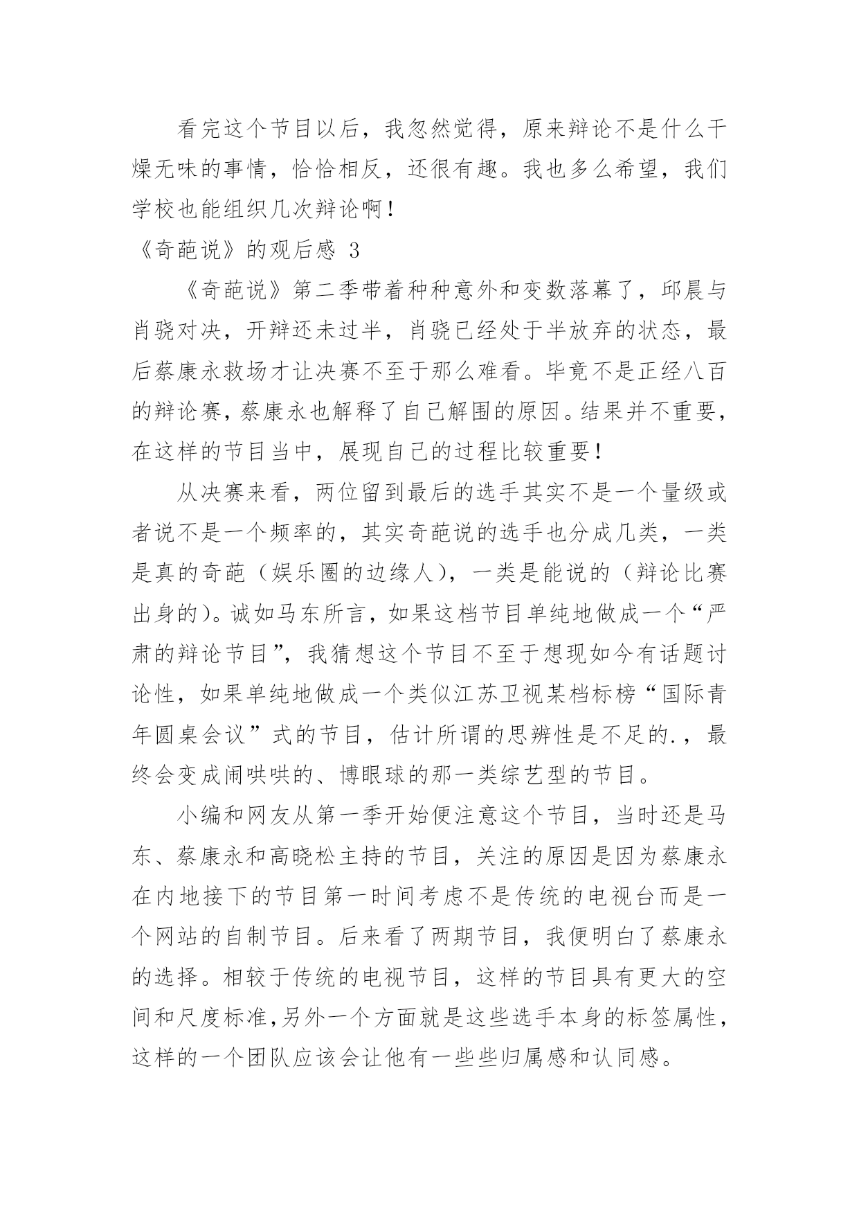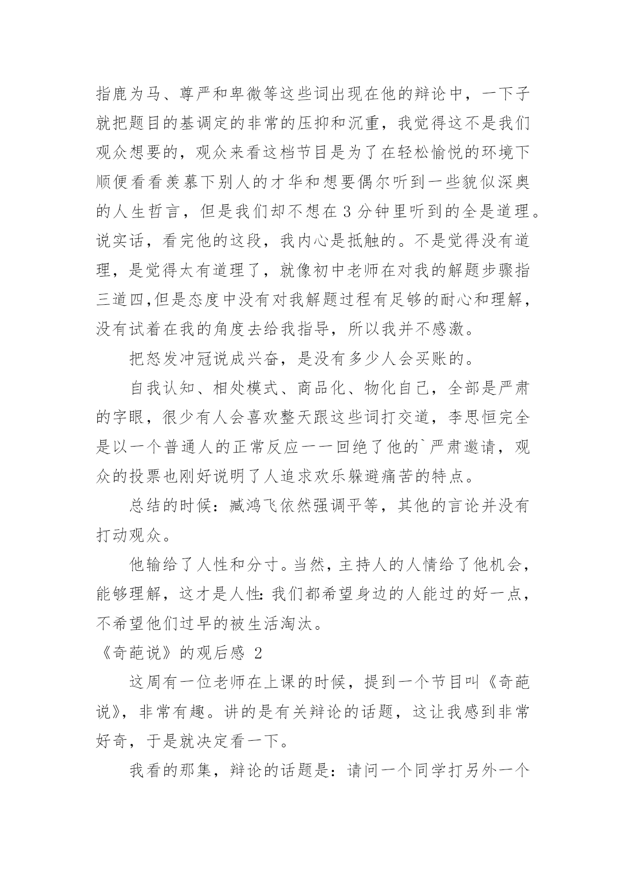 《奇葩说》的观后感《奇葩说》的观后感认真看完一部作品以后,这次观看让你心中有什么感想呢?现在就让我们写一篇走心的观后感吧。但是观后感有什么要求呢?下面是小编为大家整理的《奇葩说》的观后感,欢迎大家分享。《奇葩说》的观后感1《奇葩说》,一个我不知道是否看全了过往四季的节目,但是留在我心里的感觉很舒服:一个有温度又有趣的节目。开头跟录制背景不会很长,也不会说太多录制难度跟学员心酸的幕后经历,说到底,这是一个不用太多的刻意来博取同情的节目,我想这就是它的特别之处:用欢笑代替辛劳,呈现给观众最好的一面。本期给我印象最深刻的是这样一道辩题:面对女友的“求生欲”测试,演戏还是做自己?正方李思恒:听完很舒服还有逻辑,完全跟辩手表现出来的气质不一样,出人意料。反方臧鸿飞:这是个老奇葩,从节目中也能看出这是一个有故事、有话题跟有羁绊的人。一个真实的人但是表情中透露着哀伤;一个想要表达太多但是没有贴近观众的心;一个努力做自己却有些孤独的男人。尊重、理解、平等、说谎、指鹿为马、尊严和卑微等这些词出现在他的辩论中,一下子就把题目的基调定的非常的压抑和沉重,我觉得这不是我们观众想要的,观众来看这档节目是为了在轻松愉悦的环境下顺便看看羡慕下别人的才华和想要偶尔听到一些貌似深奥的人生哲言,但是我们却不想在3分钟里听到的全是道理。说实话,看完他的这段,我内心是抵触的。不是觉得没有道理,是觉得太有道理了,就像初中老师在对我的解题步骤指三道四,但是态度中没有对我解题过程有足够的耐心和理解,没有试着在我的角度去给我指导,所以我并不感激。把怒发冲冠说成兴奋,是没有多少人会买账的。自我认知、相处模式、商品化、物化自己,全部是严肃的字眼,很少有人会喜欢整天跟这些词打交道,李思恒完全是以一个普通人的正常反应一一回绝了他的`严肃邀请,观众的投票也刚好说明了人追求欢乐躲避痛苦的特点。总结的时候:臧鸿飞依然强调平等,其他的言论并没有打动观众。他输给了人性和分寸。当然,主持人的人情给了他机会,能够理解,这才是人性:我们都希望身边的人能过的好一点,不希望他们过早的被生活淘汰。《奇葩说》的观后感2这周有一位老师在上课的时候,提到一个节目叫《奇葩说》,非常有趣。讲的是有关辩论的话题,这让我感到非常好奇,于是就决定看一下。我看的那集,辩论的话题是:请问一个同学打另外一个同学,那个同学是否打回去?还是告老师?他们的辩论进行的非常激烈。有的大人建议告老师,因为觉只有大人们才能解决问题,如果打回去的话,小孩子是没有分寸的;但是也有大人们认为要打回去,打回去才能不显的你软弱,这样的话那个同学,就觉得你不好欺负,而且他们觉得告诉老师的'方法是没用的,没有打回去那么直接、那么爽,并且这么一反击,以后也不会骚扰你了。他们就以自己的观点进行辩论,吵得沸沸扬扬,不可开交。可惜最后还是“告老师”,也就是反方胜利!这胜方的观点,我非常不认同。我认为,应该打回去!告老师不一定能达到你理象中的结果,而且更有可能的,是那个同学会再来欺负你,因为对你告老师的这种方式,会激怒他。对于你来说,如果你这样一直告诉老师的话,老师以后觉得烦了,就不会理你了、或不相信你了,也许就开始讨厌你了。比如说,我们班有个同学,由于他非常爱打小报告,最后有个同学打了他,他报告给老师,老师压根就对他置之不理。如果不打小报告,而是打回去,则可以告诉那个同学我不是好惹的,别惹我;兔子急了也会咬人的,何况是我呢!不仅如此,如果发生了令人生气的事情,比如把我打出血了;我不仅会打过去,而且还会告诉管理纪律的老师。就是说,打回去是必选项,如果情节严重,同时报告老师,从两个方面,毕其战于一役。这样一来,从此,在同学们中间也会树立起凛然不可侵犯的形象。看完这个节目以后,我忽然觉得,原来辩论不是什么干燥无味的事情,恰恰相反,还很有趣。我也多么希望,我们学校也能组织几次辩论啊!《奇葩说》的观后感3《奇葩说》第二季带着种种意外和变数落幕了,邱晨与肖骁对决,开辩还未过半,肖骁已经处于半放弃的状态,最后蔡康永救场才让决赛不至于那么难看。毕竟不是正经八百的辩论赛,蔡康永也解释了自己解围的原因。结果并不重要,在这样的节目当中,展现自己的过程比较重要!从决赛来看,两位留到最后的选手其实不是一个量级或者说不是一个频率的,其实奇葩说的选手也分成几类,一类是真的奇葩(娱乐圈的边缘人),一类是能说的(辩论比赛出身的)。诚如马东所言,如果这档节目单纯地做成一个“严肃的辩论节目”,我猜想这个节目不至于想现如今有话题讨论性,如果单纯地做成一个类似江苏卫视某档标榜“国际青年圆桌会议”式的节目,估计所谓的思辨性是不足的.,最终会变成闹哄哄的、博眼球的那一类综艺型的节目。小编和网友从第一季开始便注意这个节目,当时还是马东、蔡康永和高晓松主持的节目,关注的原因是因为蔡康永在内地接下的节目第一