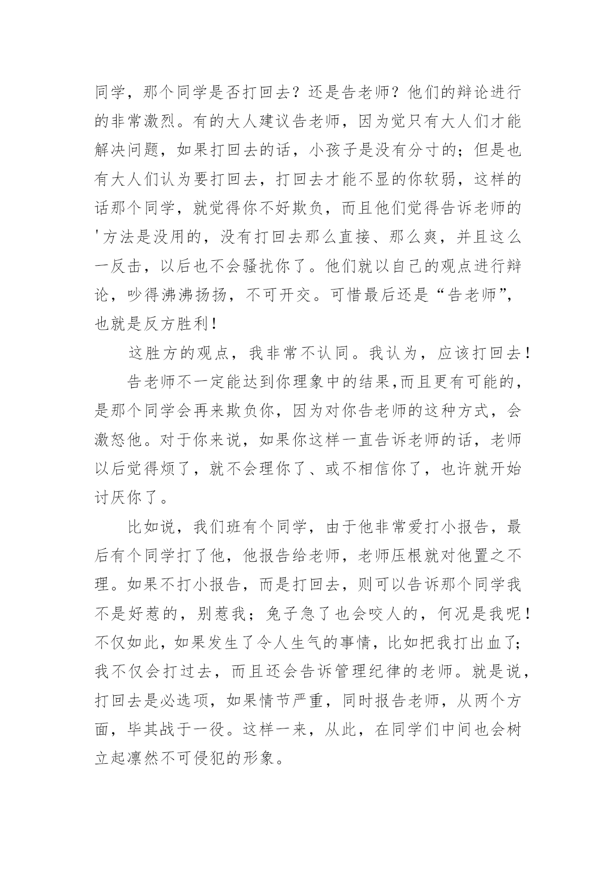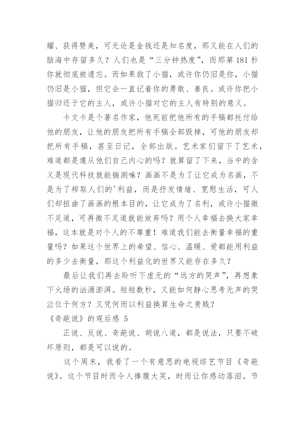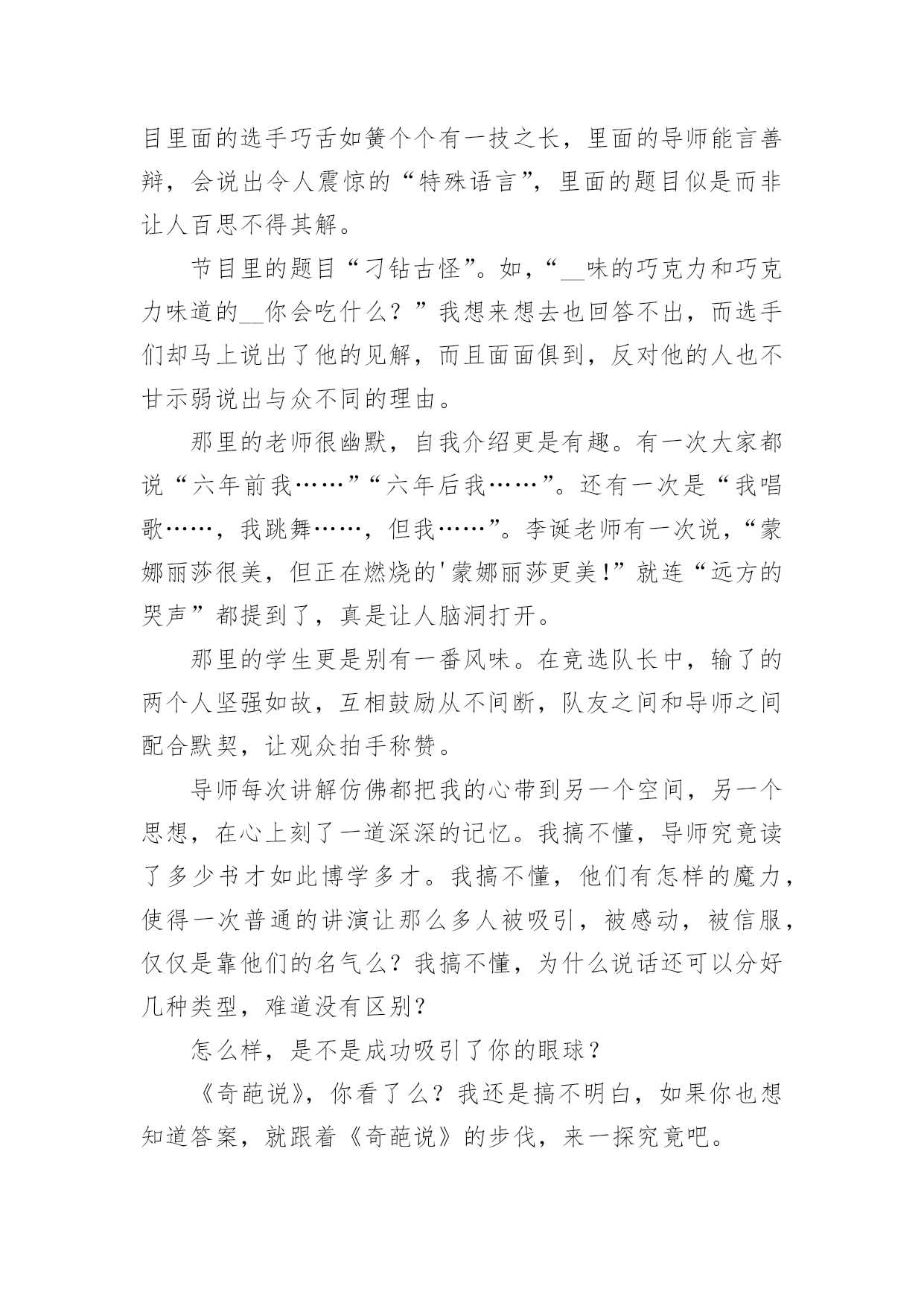 《奇葩说》的观后感《奇葩说》的观后感认真看完一部作品以后,这次观看让你心中有什么感想呢?现在就让我们写一篇走心的观后感吧。但是观后感有什么要求呢?下面是小编为大家整理的《奇葩说》的观后感,欢迎大家分享。《奇葩说》的观后感1《奇葩说》,一个我不知道是否看全了过往四季的节目,但是留在我心里的感觉很舒服:一个有温度又有趣的节目。开头跟录制背景不会很长,也不会说太多录制难度跟学员心酸的幕后经历,说到底,这是一个不用太多的刻意来博取同情的节目,我想这就是它的特别之处:用欢笑代替辛劳,呈现给观众最好的一面。本期给我印象最深刻的是这样一道辩题:面对女友的“求生欲”测试,演戏还是做自己?正方李思恒:听完很舒服还有逻辑,完全跟辩手表现出来的气质不一样,出人意料。反方臧鸿飞:这是个老奇葩,从节目中也能看出这是一个有故事、有话题跟有羁绊的人。一个真实的人但是表情中透露着哀伤;一个想要表达太多但是没有贴近观众的心;一个努力做自己却有些孤独的男人。尊重、理解、平等、说谎、指鹿为马、尊严和卑微等这些词出现在他的辩论中,一下子就把题目的基调定的非常的压抑和沉重,我觉得这不是我们观众想要的,观众来看这档节目是为了在轻松愉悦的环境下顺便看看羡慕下别人的才华和想要偶尔听到一些貌似深奥的人生哲言,但是我们却不想在3分钟里听到的全是道理。说实话,看完他的这段,我内心是抵触的。不是觉得没有道理,是觉得太有道理了,就像初中老师在对我的解题步骤指三道四,但是态度中没有对我解题过程有足够的耐心和理解,没有试着在我的角度去给我指导,所以我并不感激。把怒发冲冠说成兴奋,是没有多少人会买账的。自我认知、相处模式、商品化、物化自己,全部是严肃的字眼,很少有人会喜欢整天跟这些词打交道,李思恒完全是以一个普通人的正常反应一一回绝了他的`严肃邀请,观众的投票也刚好说明了人追求欢乐躲避痛苦的特点。总结的时候:臧鸿飞依然强调平等,其他的言论并没有打动观众。他输给了人性和分寸。当然,主持人的人情给了他机会,能够理解,这才是人性:我们都希望身边的人能过的好一点,不希望他们过早的被生活淘汰。《奇葩说》的观后感2这周有一位老师在上课的时候,提到一个节目叫《奇葩说》,非常有趣。讲的是有关辩论的话题,这让我感到非常好奇,于是就决定看一下。我看的那集,辩论的话题是:请问一个同学打另外一个同学,那个同学是否打回去?还是告老师?他们的辩论进行的非常激烈。有的大人建议告老师,因为觉只有大人们才能解决问题,如果打回去的话,小孩子是没有分寸的;但是也有大人们认为要打回去,打回去才能不显的你软弱,这样的话那个同学,就觉得你不好欺负,而且他们觉得告诉老师的'方法是没用的,没有打回去那么直接、那么爽,并且这么一反击,以后也不会骚扰你了。他们就以自己的观点进行辩论,吵得沸沸扬扬,不可开交。可惜最后还是“告老师”,也就是反方胜利!这胜方的观点,我非常不认同。我认为,应该打回去!告老师不一定能达到你理象中的结果,而且更有可能的,是那个同学会再来欺负你,因为对你告老师的这种方式,会激怒他。对于你来说,如果你这样一直告诉老师的话,老师以后觉得烦了,就不会理你了、或不相信你了,也许就开始讨厌你了。比如说,我们班有个同学,由于他非常爱打小报告,最后有个同学打了他,他报告给老师,老师压根就对他置之不理。如果不打小报告,而是打回去,则可以告诉那个同学我不是好惹的,别惹我;兔子急了也会咬人的,何况是我呢!不仅如此,如果发生了令人生气的事情,比如把我打出血了;我不仅会打过去,而且还会告诉管理纪律的老师。就是说,打回去是必选项,如果情节严重,同时报告老师,从两个方面,毕其战于一役。这样一来,从此,在同学们中间也会树立起凛然不可侵犯的形象。看完这个节目以后,我忽然觉得,原来辩论不是什么干燥无味的事情,恰恰相反,还很有趣。我也多么希望,我们学校也能组织几次辩论啊!《奇葩说》的观后感3《奇葩说》第二季带着种种意外和变数落幕了,邱晨与肖骁对决,开辩还未过半,肖骁已经处于半放弃的状态,最后蔡康永救场才让决赛不至于那么难看。毕竟不是正经八百的辩论赛,蔡康永也解释了自己解围的原因。结果并不重要,在这样的节目当中,展现自己的过程比较重要!从决赛来看,两位留到最后的选手其实不是一个量级或者说不是一个频率的,其实奇葩说的选手也分成几类,一类是真的奇葩(娱乐圈的边缘人),一类是能说的(辩论比赛出身的)。诚如马东所言,如果这档节目单纯地做成一个“严肃的辩论节目”,我猜想这个节目不至于想现如今有话题讨论性,如果单纯地做成一个类似江苏卫视某档标榜“国际青年圆桌会议”式的节目,估计所谓的思辨性是不足的.,最终会变成闹哄哄的、博眼球的那一类综艺型的节目。小编和网友从第一季开始便注意这个节目,当时还是马东、蔡康永和高晓松主持的节目,关注的原因是因为蔡康永在内地接下的节目第一