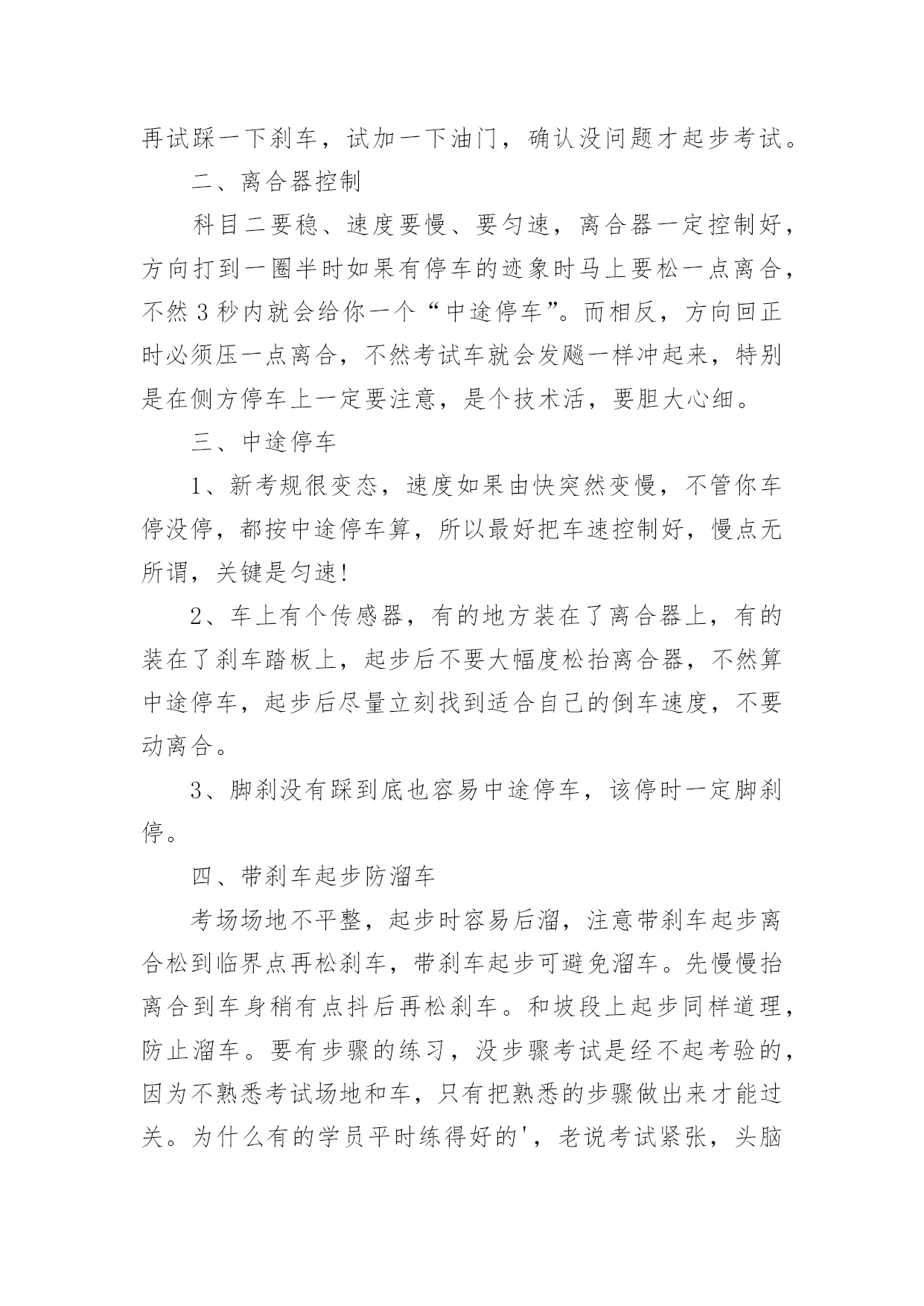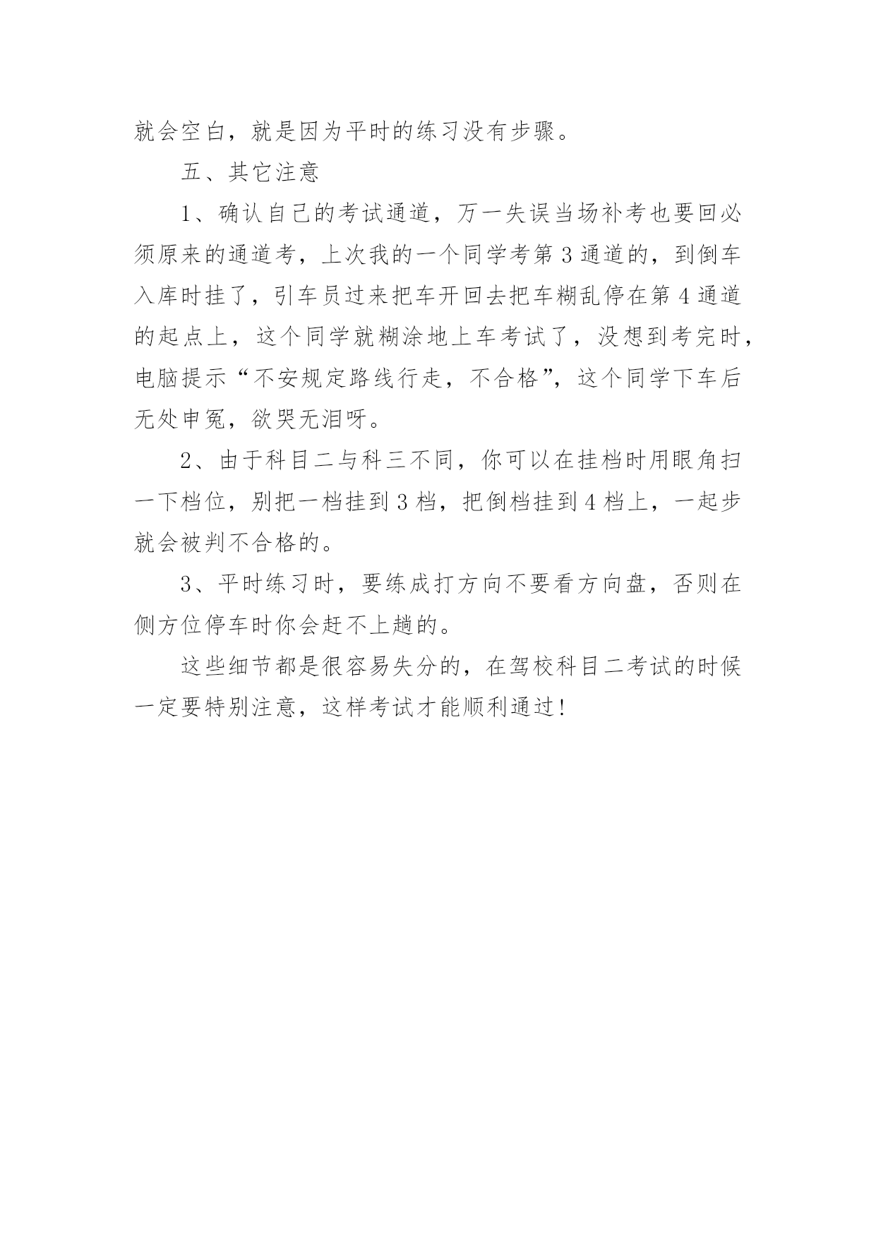 科目二考试细节技巧科目二考试细节技巧驾驶证考试是为了获得机动车驾驶证的考试,考试科目内容及合格标准全国统一。下面是小编分享的科目二考试细节技巧,欢迎大家参考!一、上车五件事1、上车后没有限制起步时间的,上车后先关车门,注意门灯是否熄灭,这是关键。2、用左脚把离合器踩到底不动,右手把住方向盘,左手调整座椅,调到左脚有点能使上劲的弯曲,还得注意前后挪动试一下座椅稳固。3,调靠背到身体成90度,还得注意前后试一下是否稳固。然后用手放在头上量一下高度是不是和平时练习的一样,太低必须放座垫调好。4、调左右后视镜到合适的位置。左侧后视镜调整要领:把水平线置于后视镜的中线位置,然后再把车身的边缘调到占据镜面影像的1/4;右侧后视镜调整要领:把水平线置于后视镜的2/3位置,然后再把车身的边缘调到占据镜面影像的1/4。在倒车入库考试前,还有调试机会,这时应将后视镜角度向下方调试,直到看到车尾及后车轮上方叶子板为止。5、系上安全带后再重试试一下离合器,用左脚把离合器踩到底,必须左脚有点能使上劲的弯曲才OK,不然重新调,再试踩一下刹车,试加一下油门,确认没问题才起步考试。二、离合器控制科目二要稳、速度要慢、要匀速,离合器一定控制好,方向打到一圈半时如果有停车的迹象时马上要松一点离合,不然3秒内就会给你一个“中途停车”。而相反,方向回正时必须压一点离合,不然考试车就会发飚一样冲起来,特别是在侧方停车上一定要注意,是个技术活,要胆大心细。三、中途停车1、新考规很变态,速度如果由快突然变慢,不管你车停没停,都按中途停车算,所以最好把车速控制好,慢点无所谓,关键是匀速!2、车上有个传感器,有的地方装在了离合器上,有的装在了刹车踏板上,起步后不要大幅度松抬离合器,不然算中途停车,起步后尽量立刻找到适合自己的倒车速度,不要动离合。3、脚刹没有踩到底也容易中途停车,该停时一定脚刹停。四、带刹车起步防溜车考场场地不平整,起步时容易后溜,注意带刹车起步离合松到临界点再松刹车,带刹车起步可避免溜车。先慢慢抬离合到车身稍有点抖后再松刹车。和坡段上起步同样道理,防止溜车。要有步骤的练习,没步骤考试是经不起考验的,因为不熟悉考试场地和车,只有把熟悉的步骤做出来才能过关。为什么有的学员平时练得好的',老说考试紧张,头脑就会空白,就是因为平时的练习没有步骤。五、其它注意1、确认自己的考试通道,万一失误当场补考也要回必须原来的通道考,上次我的一个同学考第3通道的,到倒车入库时挂了,引车员过来把车开回去把车糊乱停在第4通道的起点上,这个同学就糊涂地上车考试了,没想到考完时,电脑提示“不安规定路线行走,不合格”,这个同学下车后无处申冤,欲哭无泪呀。2、由于科目二与科三不同,你可以在挂档时用眼角扫一下档位,别把一档挂到3档,把倒档挂到4档上,一起步就会被判不合格的。3、平时练习时,要练成打方向不要看方向盘,否则在侧方位停车时你会赶不上趟的。这些细节都是很容易失分的,在驾校科目二考试的时候一定要特别注意,这样考试才能顺利通过!