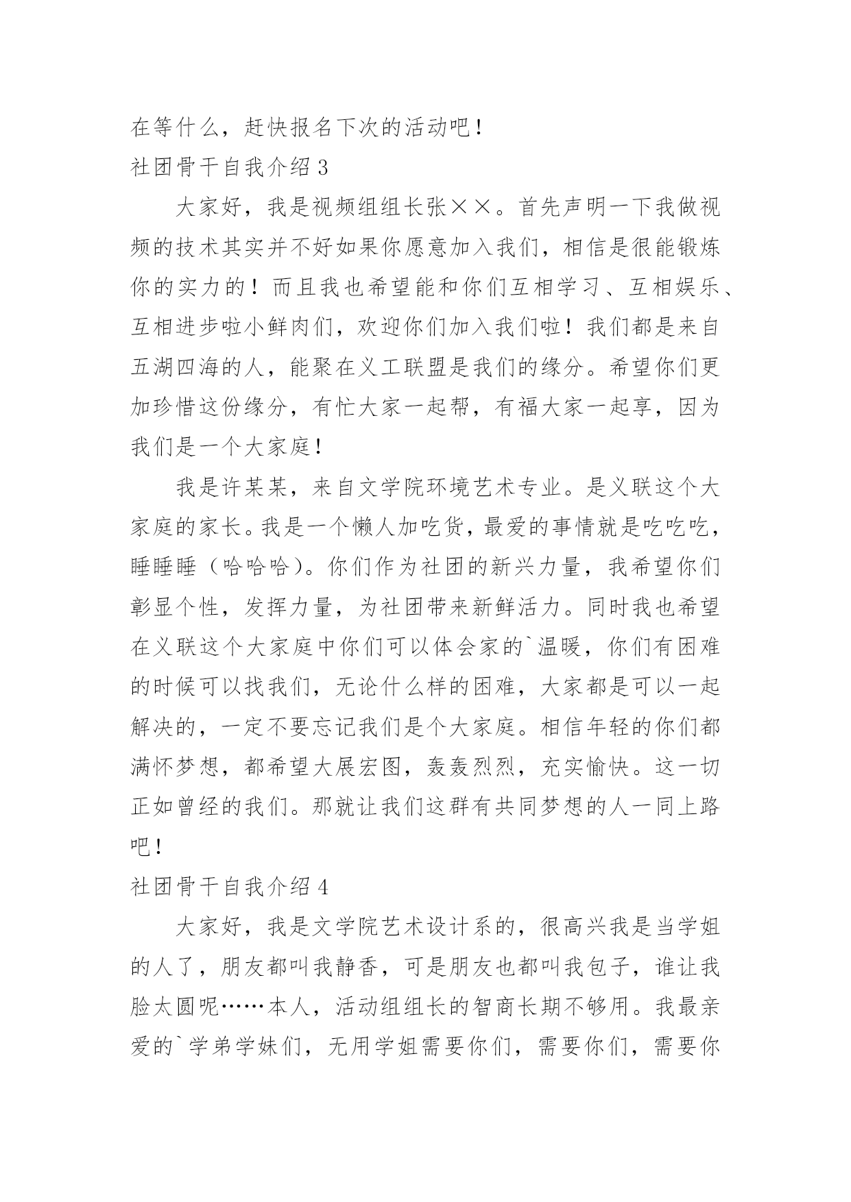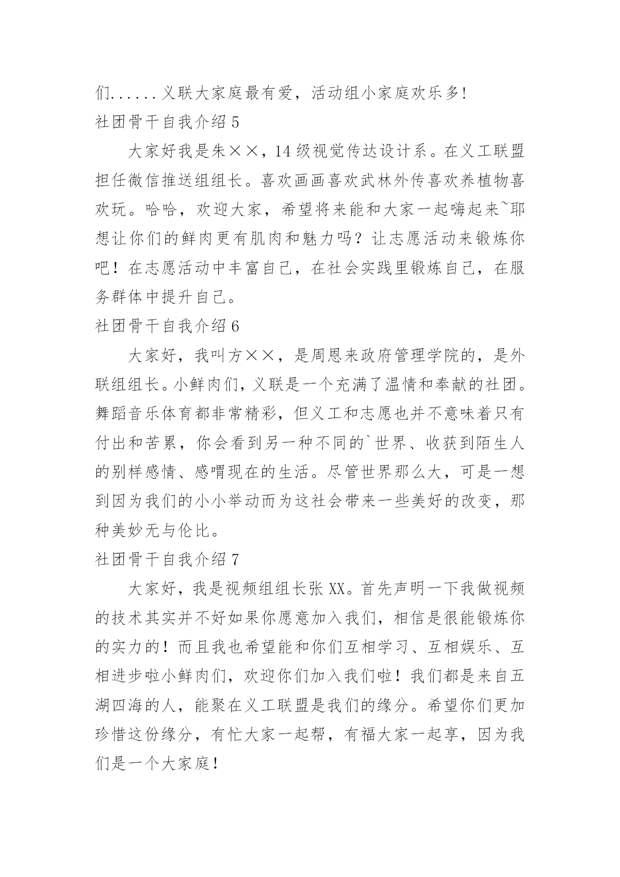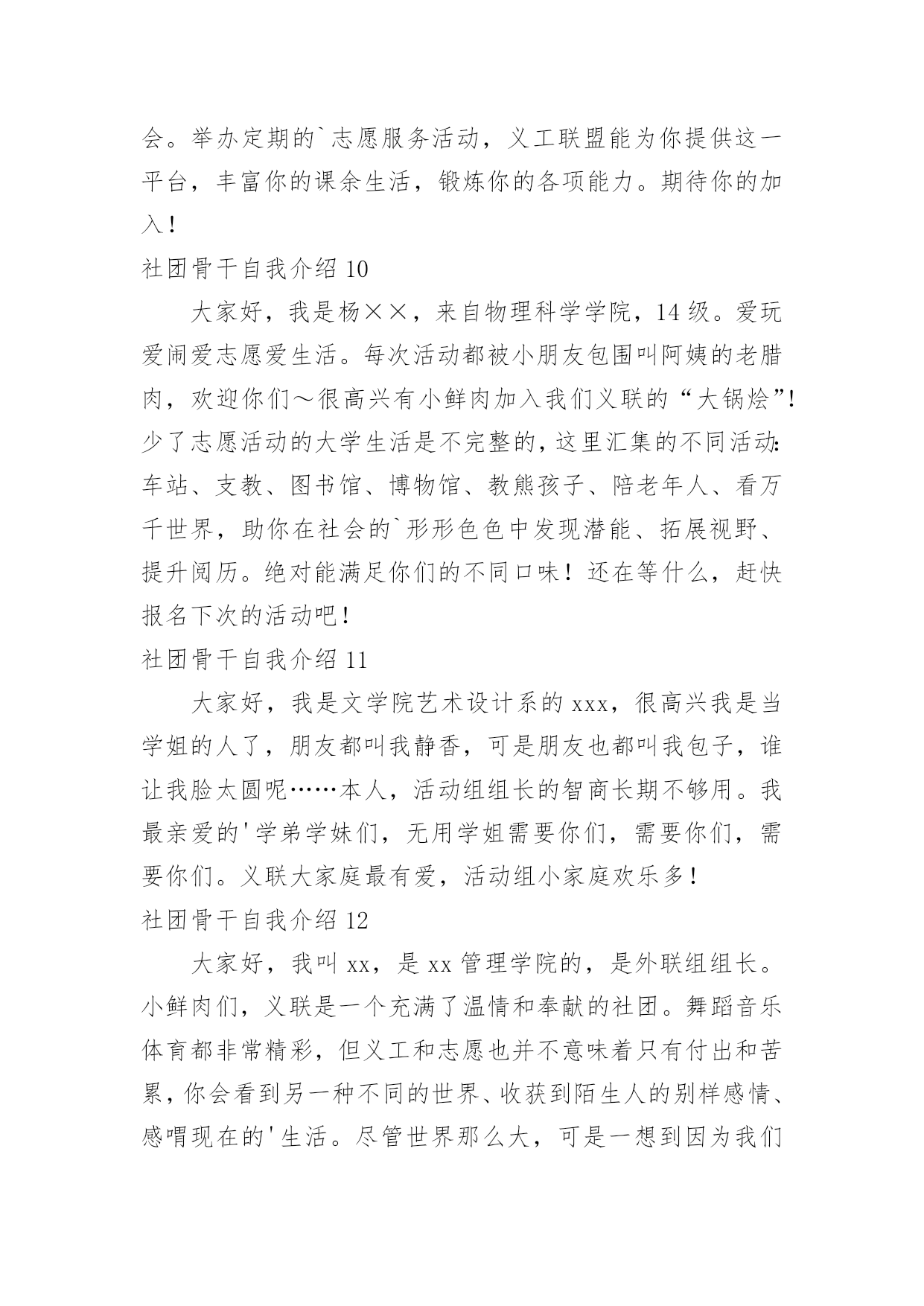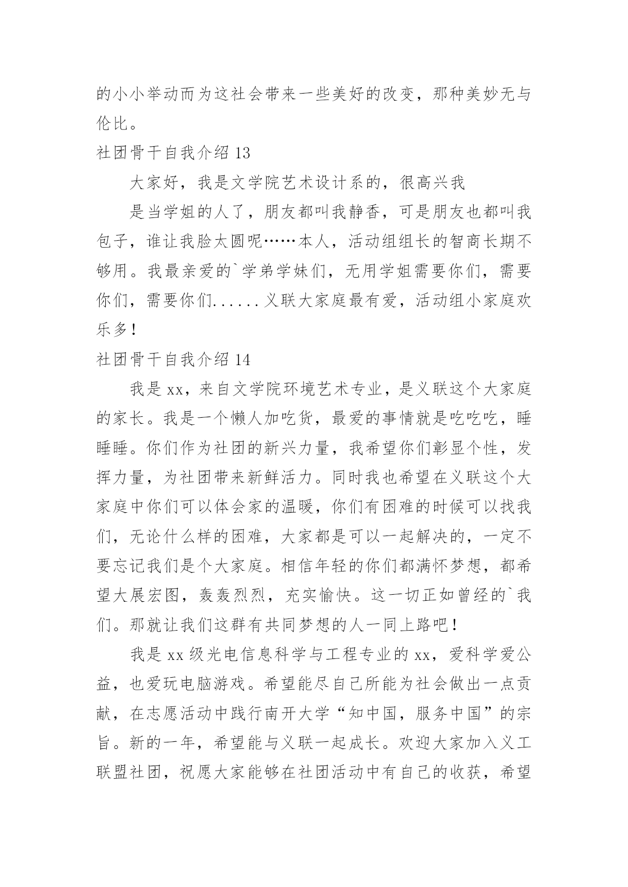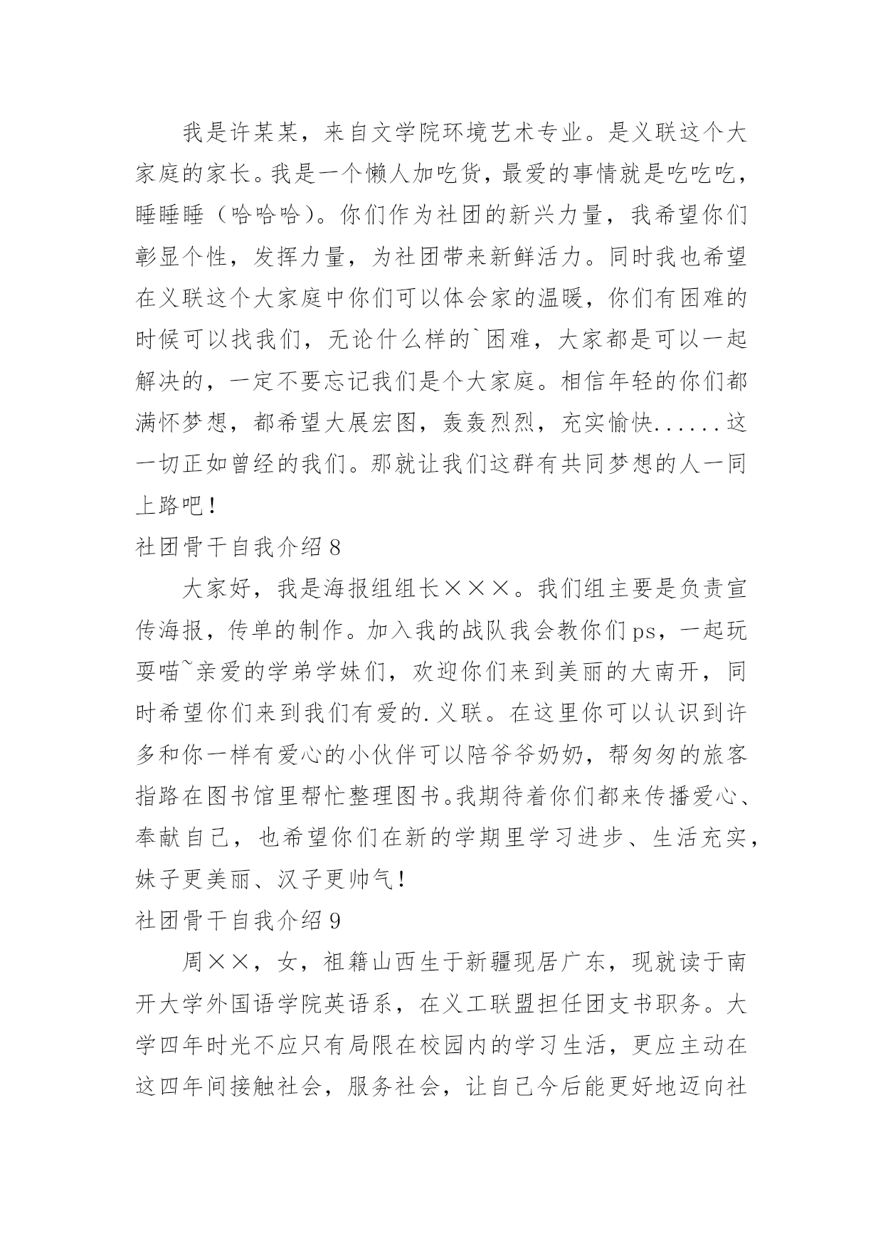 社团骨干自我介绍社团骨干自我介绍来到一个完全陌生的环境,时常需要用到自我介绍,自我介绍是一展示自己的手段。相信许多人会觉得自我介绍很难写吧,下面是小编帮大家整理的社团骨干自我介绍,希望对大家有所帮助。社团骨干自我介绍1xx,女,祖籍山西生于新疆现居广东,现就读于南开大学外国语学院英语系,在义工联盟担任团支书职务。大学四年时光不应只有局限在校园内的学习生活,更应主动在这四年间接触社会,服务社会,让自己今后能更好地迈向社会。举办定期的志愿服务活动,义工联盟能为你提供这一平台,丰富你的课余生活,锻炼你的'各项能力。期待你的加入!社团骨干自我介绍2大家好,我是杨舒然,来自物理科学学院,14级。爱玩爱闹爱志愿爱生活。每次活动都被小朋友包围叫阿姨的老腊肉╮( ̄▽ ̄)╭欢迎你们~很高兴有小鲜肉加入我们义联的“大锅烩”!少了志愿活动的大学生活是不完整的,这里汇集的不同活动:车站、支教、图书馆、博物馆、教熊孩子、陪老年人、看万千世界,助你在社会的'形形色色中发现潜能、拓展视野、提升阅历。绝对能满足你们的不同口味!还在等什么,赶快报名下次的活动吧!社团骨干自我介绍3大家好,我是视频组组长张××。首先声明一下我做视频的技术其实并不好如果你愿意加入我们,相信是很能锻炼你的实力的!而且我也希望能和你们互相学习、互相娱乐、互相进步啦小鲜肉们,欢迎你们加入我们啦!我们都是来自五湖四海的人,能聚在义工联盟是我们的缘分。希望你们更加珍惜这份缘分,有忙大家一起帮,有福大家一起享,因为我们是一个大家庭!我是许某某,来自文学院环境艺术专业。是义联这个大家庭的家长。我是一个懒人加吃货,最爱的事情就是吃吃吃,睡睡睡(哈哈哈)。你们作为社团的新兴力量,我希望你们彰显个性,发挥力量,为社团带来新鲜活力。同时我也希望在义联这个大家庭中你们可以体会家的`温暖,你们有困难的时候可以找我们,无论什么样的困难,大家都是可以一起解决的,一定不要忘记我们是个大家庭。相信年轻的你们都满怀梦想,都希望大展宏图,轰轰烈烈,充实愉快。这一切正如曾经的我们。那就让我们这群有共同梦想的人一同上路吧!社团骨干自我介绍4大家好,我是文学院艺术设计系的,很高兴我是当学姐的人了,朋友都叫我静香,可是朋友也都叫我包子,谁让我脸太圆呢……本人,活动组组长的智商长期不够用。我最亲爱的`学弟学妹们,无用学姐需要你们,需要你们,需要你们......义联大家庭最有爱,活动组小家庭欢乐多!社团骨干自我介绍5大家好我是朱××,14级视觉传达设计系。在义工联盟担任微信推送组组长。喜欢画画喜欢武林外传喜欢养植物喜欢玩。哈哈,欢迎大家,希望将来能和大家一起嗨起来~耶想让你们的鲜肉更有肌肉和魅力吗?让志愿活动来锻炼你吧!在志愿活动中丰富自己,在社会实践里锻炼自己,在服务群体中提升自己。社团骨干自我介绍6大家好,我叫方××,是周恩来政府管理学院的,是外联组组长。小鲜肉们,义联是一个充满了温情和奉献的社团。舞蹈音乐体育都非常精彩,但义工和志愿也并不意味着只有付出和苦累,你会看到另一种不同的`世界、收获到陌生人的别样感情、感喟现在的生活。尽管世界那么大,可是一想到因为我们的小小举动而为这社会带来一些美好的改变,那种美妙无与伦比。社团骨干自我介绍7大家好,我是视频组组长张XX。首先声明一下我做视频的技术其实并不好如果你愿意加入我们,相信是很能锻炼你的实力的!而且我也希望能和你们互相学习、互相娱乐、互相进步啦小鲜肉们,欢迎你们加入我们啦!我们都是来自五湖四海的人,能聚在义工联盟是我们的缘分。希望你们更加珍惜这份缘分,有忙大家一起帮,有福大家一起享,因为我们是一个大家庭!我是许某某,来自文学院环境艺术专业。是义联这个大家庭的家长。我是一个懒人加吃货,最爱的事情就是吃吃吃,睡睡睡(哈哈哈)。你们作为社团的新兴力量,我希望你们彰显个性,发挥力量,为社团带来新鲜活力。同时我也希望在义联这个大家庭中你们可以体会家的温暖,你们有困难的时候可以找我们,无论什么样的`困难,大家都是可以一起解决的,一定不要忘记我们是个大家庭。相信年轻的你们都满怀梦想,都希望大展宏图,轰轰烈烈,充实愉快......这一切正如曾经的我们。那就让我们这群有共同梦想的人一同上路吧!社团骨干自我介绍8大家好,我是海报组组长×××。我们组主要是负责宣传海报,传单的制作。加入我的战队我会教你们ps,一起玩耍喵~亲爱的学弟学妹们,欢迎你们来到美丽的大南开,同时希望你们来到我们有爱的.义联。在这里你可以认识到许多和你一样有爱心的小伙伴可以陪爷爷奶奶,帮匆匆的旅客指路在图书馆里帮忙整理图书。我期待着你们都来传播爱心、奉献自己,也希望你们在新的学期里学习进步、生活充实,妹子更美丽、汉子更帅气!社团骨干自我介绍9周××,女,祖籍山西生于新疆现居广东,现就读于南开大学外国语学院英语系,在义工联盟