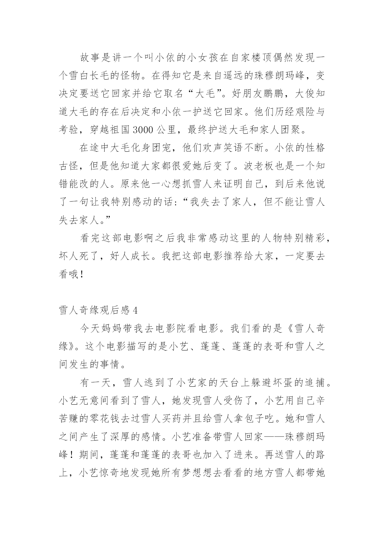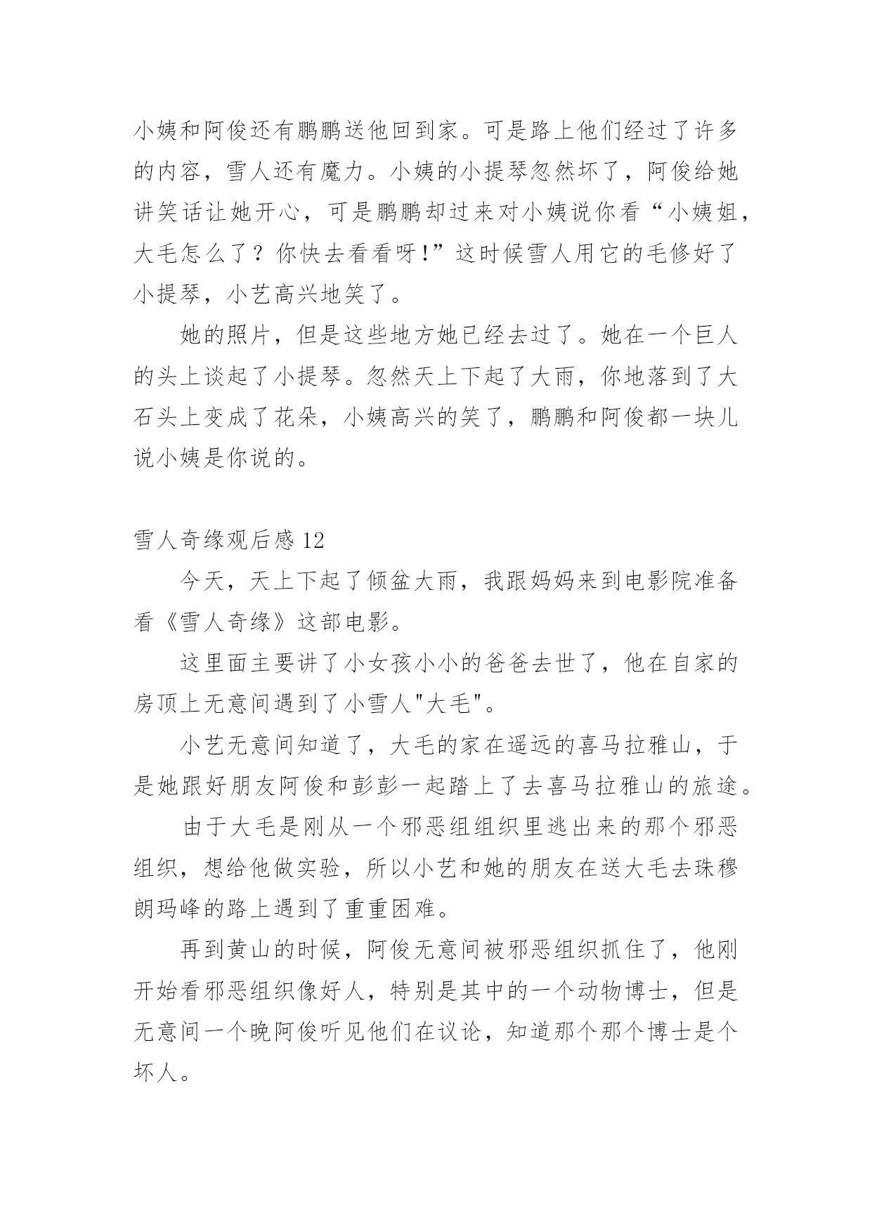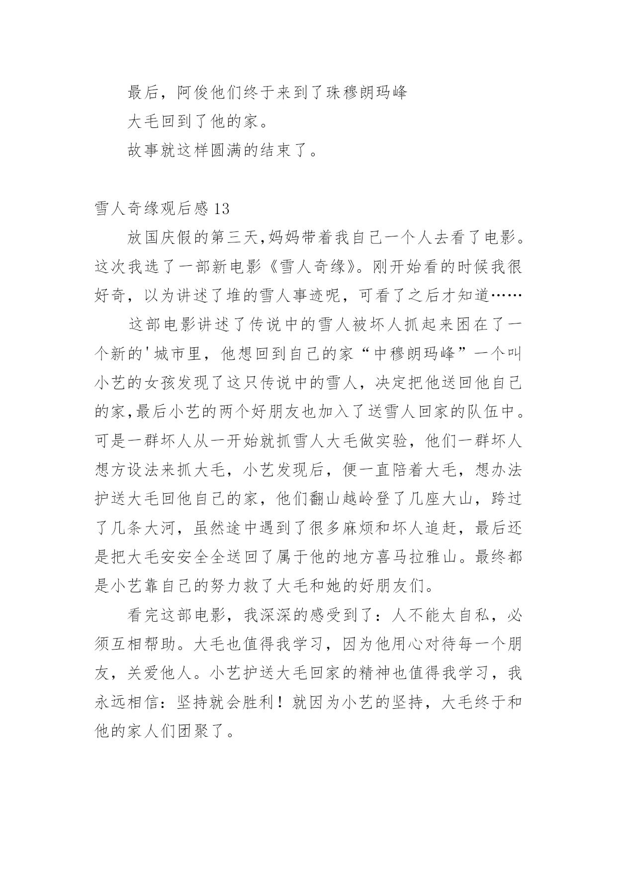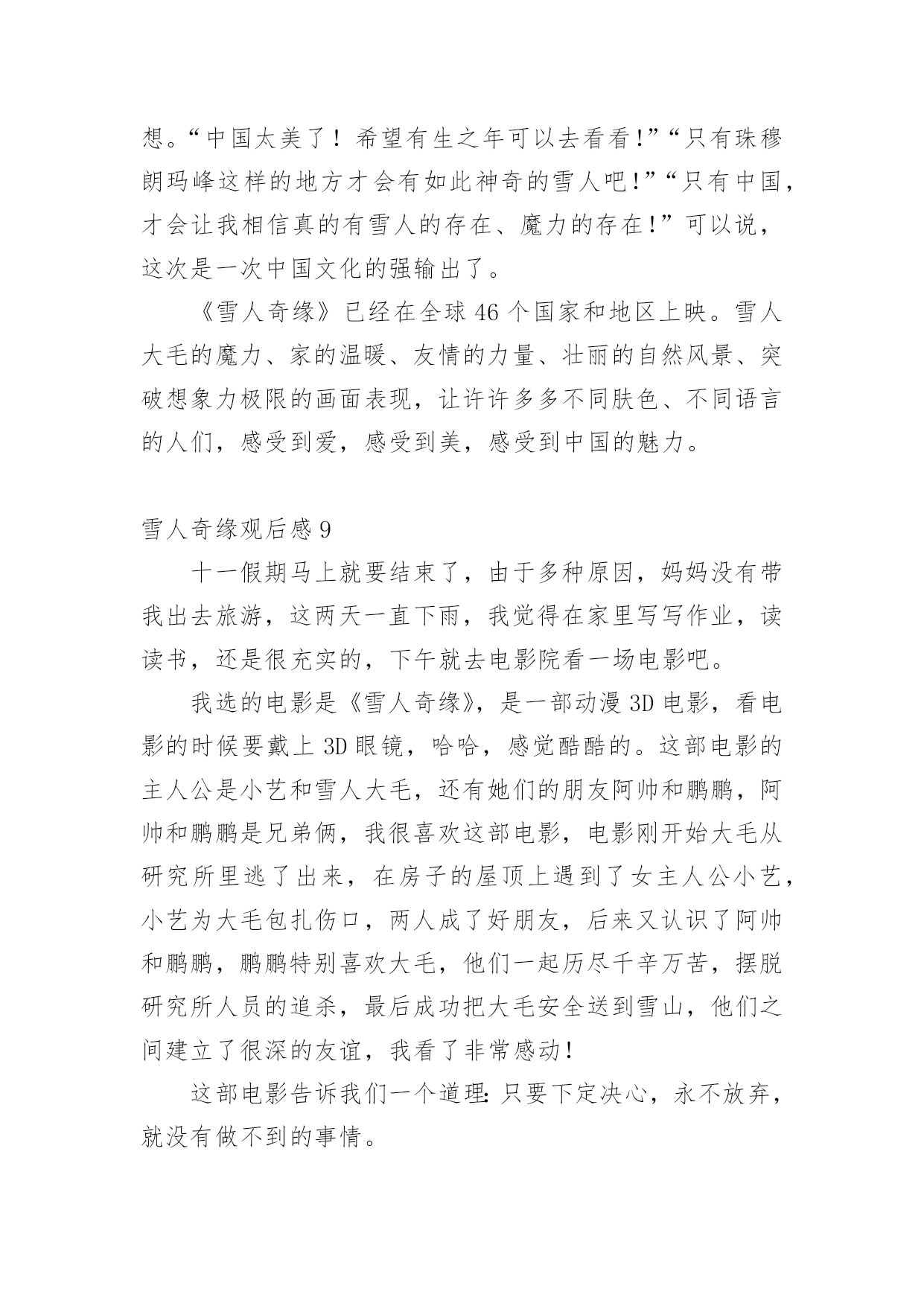 雪人奇缘观后感看完一部作品以后,一定有很多值得分享的心得吧,不妨坐下来好好写写观后感吧。想必许多人都在为如何写好观后感而烦恼吧,以下是小编为大家整理的雪人奇缘观后感,仅供参考,大家一起来看看吧。雪人奇缘观后感1今天我们在作文班看了一部非常励志的电影——《雪人奇缘》。这部电影主要讲了雪人“大毛”,从实验室里逃了出来,躲在小艺家的屋顶上。后来,小艺上来拉琴的时候发现了大毛,小艺害怕极了,却不知道大毛是被人追赶的,就在这时,刚好扎拉博士的队伍从这里经过发现了大毛,大毛把小艺放在自己的背上,逃跑了。在逃跑的过程中,他们跳上一艘船,这时,阿俊和鹏鹏也跳上去,他们一路上相互帮助,终于到达了珠穆朗玛峰大毛的家,坏人们也得到了应有的报应。这部电影里,我最喜欢的人物就是小艺,大家肯定会问为什么呢?那就让我来告诉大家吧,因为她不管多艰难,都会去面对,勇往直前。其次,是因为她助人为乐,知错就改。下来我最喜欢的就是大毛、阿俊、鹏鹏,还有波老板,我喜欢波老板,是因为他和小艺一样,知错就改,虽然波老板原来看起来非常非常的可恶,可是后来他也及时知道了自己的错误!放走大毛。这让我想到了生活中的我们,也要向他们学习!影片当中,大毛大毛一家团聚的场面,我都感动得哭了!我们不要伤害我们最亲的人,他们的爱就像天上的星星一样,始终守护在我们的身边!看了这部电影,让我知道了——坚持就会胜利!雪人奇缘观后感2今天和妈妈一起去看了雪人奇缘这部电影,故事讲述的是一个叫小艺的女孩,因为她爸爸去世了,她一直悄悄的赚钱,想去完成旅游世界的梦想。一天小艺在一家楼顶发现了雪人大毛。恰巧它正在遭遇危险,善良的小艺帮助了它,小艺决定和她的小伙伴鹏鹏,小俊一起送大毛回到它的故乡珠穆朗玛峰。一路上她们这个冒险小队伍经历了各种危险,还经过了千岛湖,黄山,乐山大佛等中国著名的旅游景点,这正是小艺要去的地方,没想到确在路上实现了。雪人大毛为了躲避追捕着,展现了自己神奇的魔力,巨大的蒲公带他们飞上天空,一秒变得超大的蓝莓,油菜花海浪,真的是太神奇了。经过重重磨难,他们终于把雪人大毛送到了珠穆朗玛峰,回到了母亲的怀抱,经过这件事情后,小艺也变得更加懂事了。雪人奇缘观后感3今天我去电影院看了《雪人奇缘》。故事是讲一个叫小依的小女孩在自家楼顶偶然发现一个雪白长毛的怪物。在得知它是来自遥远的珠穆朗玛峰,变决定要送它回家并给它取名“大毛”。好朋友鹏鹏,大俊知道大毛的存在后决定和小依一护送它回家。他们历经艰险与考验,穿越祖国3000公里,最终护送大毛和家人团聚。在途中大毛化身团宠,他们欢声笑语不断。小依的性格古怪,但是他知道大家都很爱她后变了。波老板也是一个知错能改的人。原来他一心想抓雪人来证明自己,到后来他说了一句让我特别感动的话:“我失去了家人,但不能让雪人失去家人。”看完这部电影啊之后我非常感动这里的人物特别精彩,坏人死了,好人成长。我把这部电影推荐给大家,一定要去看哦!雪人奇缘观后感4今天妈妈带我去电影院看电影。我们看的是《雪人奇缘》。这个电影描写的是小艺、蓬蓬、蓬蓬的表哥和雪人之间发生的事情。有一天,雪人逃到了小艺家的天台上躲避坏蛋的追捕。小艺无意间看到了雪人,她发现雪人受伤了,小艺用自己辛苦赚的零花钱去过雪人买药并且给雪人拿包子吃。她和雪人之间产生了深厚的感情。小艺准备带雪人回家——珠穆朗玛峰!期间,蓬蓬和蓬蓬的表哥也加入了进来。再送雪人的路上,小艺惊奇地发现她所有梦想想去看看的地方雪人都带她游览了一遍。最后,通过和坏蛋的殊死搏斗下,他们终于把雪人送回了家,见到了雪人的家人!从这个影片当中,我看到了小艺、蓬蓬、蓬蓬的表哥的善良,看到了他们的勇敢,看到了他们的聪明。我很感动,我要向他们学习,要爱护动物、爱护环境、爱护大自然。雪人奇缘观后感5今天来到升龙奥斯卡看电影,看了《雪人奇缘》,开始入场,带上3D眼镜,过了一会儿电影开播了。开头是大毛被关在一个基地里,然后展现它的魔力,逃了出去,来到了主人公小艺的家阳台上,被小女孩小艺发现并保护起来。原本小艺是很害怕的,但是后来便不害怕了,第二天搜寻的飞机来了发现了大毛,大毛带着小艺到了一艘船上,紧接着鹏鹏、阿俊也跳到了船上,他们开始了新的旅程。他们来到了黄山,乐山大佛、最后抵达了珠穆朗玛峰,大毛的家。途中大毛发挥魔力,一秒撑大的蓝莓,巨大的`蒲公英和神奇的龙卷风。可在通往珠穆朗玛峰的一座桥上,遭到了扎拉博士的阻挡,在大毛被他们抓到以后,小艺拉响了大毛用它的毛做的小提琴,大毛苏醒过来,救下了阿俊和鹏鹏,把扎拉博士的车封住了,这时扎拉博士又开了一辆车冲了过来,大毛又施展魔力,保全了大家。最后大毛找到了亲人,是几个特别大的雪人,伙伴们安心了,他们回到家里,吃着奶奶做的大包子,最后快乐相处生活幸福!雪人奇缘观后感6这是一次童话般美妙的混搭,遇到困难,只要闭起眼睛哼支歌