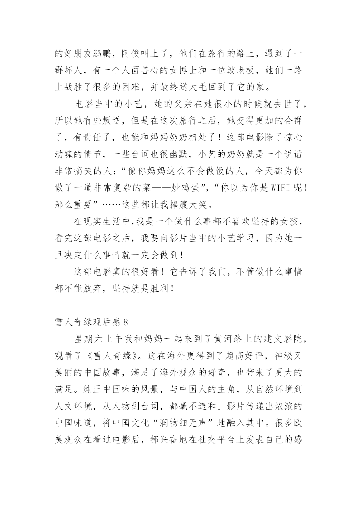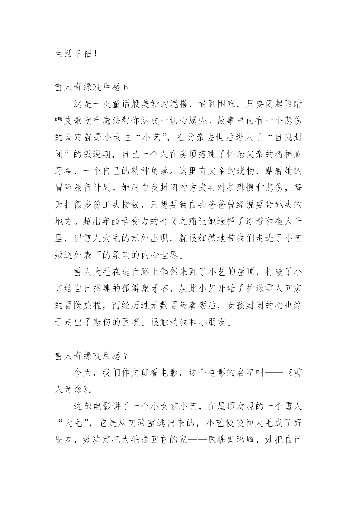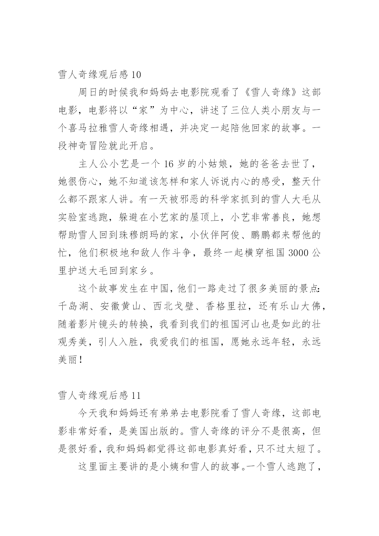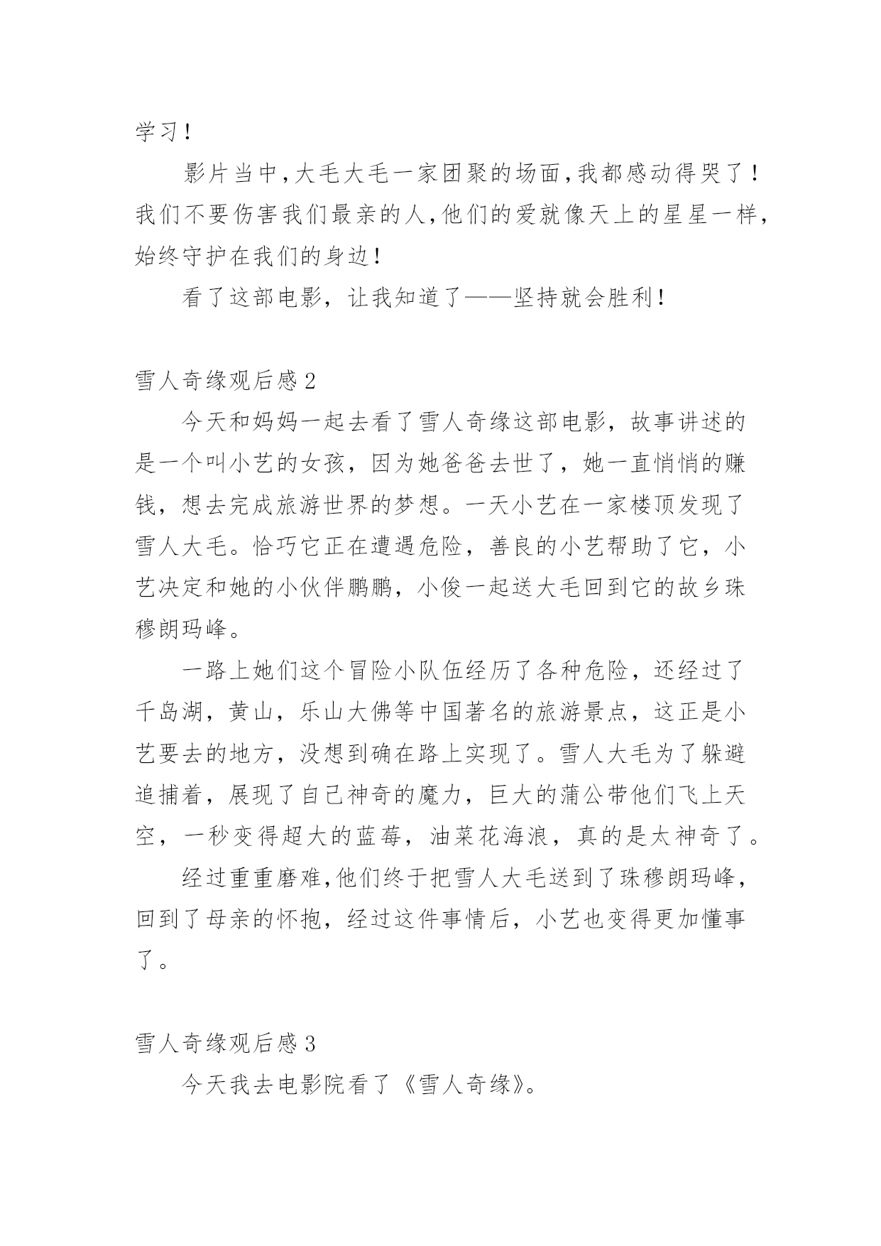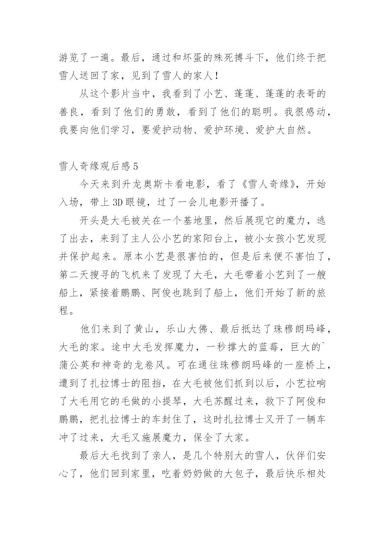 雪人奇缘观后感看完一部作品以后,一定有很多值得分享的心得吧,不妨坐下来好好写写观后感吧。想必许多人都在为如何写好观后感而烦恼吧,以下是小编为大家整理的雪人奇缘观后感,仅供参考,大家一起来看看吧。雪人奇缘观后感1今天我们在作文班看了一部非常励志的电影——《雪人奇缘》。这部电影主要讲了雪人“大毛”,从实验室里逃了出来,躲在小艺家的屋顶上。后来,小艺上来拉琴的时候发现了大毛,小艺害怕极了,却不知道大毛是被人追赶的,就在这时,刚好扎拉博士的队伍从这里经过发现了大毛,大毛把小艺放在自己的背上,逃跑了。在逃跑的过程中,他们跳上一艘船,这时,阿俊和鹏鹏也跳上去,他们一路上相互帮助,终于到达了珠穆朗玛峰大毛的家,坏人们也得到了应有的报应。这部电影里,我最喜欢的人物就是小艺,大家肯定会问为什么呢?那就让我来告诉大家吧,因为她不管多艰难,都会去面对,勇往直前。其次,是因为她助人为乐,知错就改。下来我最喜欢的就是大毛、阿俊、鹏鹏,还有波老板,我喜欢波老板,是因为他和小艺一样,知错就改,虽然波老板原来看起来非常非常的可恶,可是后来他也及时知道了自己的错误!放走大毛。这让我想到了生活中的我们,也要向他们学习!影片当中,大毛大毛一家团聚的场面,我都感动得哭了!我们不要伤害我们最亲的人,他们的爱就像天上的星星一样,始终守护在我们的身边!看了这部电影,让我知道了——坚持就会胜利!雪人奇缘观后感2今天和妈妈一起去看了雪人奇缘这部电影,故事讲述的是一个叫小艺的女孩,因为她爸爸去世了,她一直悄悄的赚钱,想去完成旅游世界的梦想。一天小艺在一家楼顶发现了雪人大毛。恰巧它正在遭遇危险,善良的小艺帮助了它,小艺决定和她的小伙伴鹏鹏,小俊一起送大毛回到它的故乡珠穆朗玛峰。一路上她们这个冒险小队伍经历了各种危险,还经过了千岛湖,黄山,乐山大佛等中国著名的旅游景点,这正是小艺要去的地方,没想到确在路上实现了。雪人大毛为了躲避追捕着,展现了自己神奇的魔力,巨大的蒲公带他们飞上天空,一秒变得超大的蓝莓,油菜花海浪,真的是太神奇了。经过重重磨难,他们终于把雪人大毛送到了珠穆朗玛峰,回到了母亲的怀抱,经过这件事情后,小艺也变得更加懂事了。雪人奇缘观后感3今天我去电影院看了《雪人奇缘》。故事是讲一个叫小依的小女孩在自家楼顶偶然发现一个雪白长毛的怪物。在得知它是来自遥远的珠穆朗玛峰,变决定要送它回家并给它取名“大毛”。好朋友鹏鹏,大俊知道大毛的存在后决定和小依一护送它回家。他们历经艰险与考验,穿越祖国3000公里,最终护送大毛和家人团聚。在途中大毛化身团宠,他们欢声笑语不断。小依的性格古怪,但是他知道大家都很爱她后变了。波老板也是一个知错能改的人。原来他一心想抓雪人来证明自己,到后来他说了一句让我特别感动的话:“我失去了家人,但不能让雪人失去家人。”看完这部电影啊之后我非常感动这里的人物特别精彩,坏人死了,好人成长。我把这部电影推荐给大家,一定要去看哦!雪人奇缘观后感4今天妈妈带我去电影院看电影。我们看的是《雪人奇缘》。这个电影描写的是小艺、蓬蓬、蓬蓬的表哥和雪人之间发生的事情。有一天,雪人逃到了小艺家的天台上躲避坏蛋的追捕。小艺无意间看到了雪人,她发现雪人受伤了,小艺用自己辛苦赚的零花钱去过雪人买药并且给雪人拿包子吃。她和雪人之间产生了深厚的感情。小艺准备带雪人回家——珠穆朗玛峰!期间,蓬蓬和蓬蓬的表哥也加入了进来。再送雪人的路上,小艺惊奇地发现她所有梦想想去看看的地方雪人都带她游览了一遍。最后,通过和坏蛋的殊死搏斗下,他们终于把雪人送回了家,见到了雪人的家人!从这个影片当中,我看到了小艺、蓬蓬、蓬蓬的表哥的善良,看到了他们的勇敢,看到了他们的聪明。我很感动,我要向他们学习,要爱护动物、爱护环境、爱护大自然。雪人奇缘观后感5今天来到升龙奥斯卡看电影,看了《雪人奇缘》,开始入场,带上3D眼镜,过了一会儿电影开播了。开头是大毛被关在一个基地里,然后展现它的魔力,逃了出去,来到了主人公小艺的家阳台上,被小女孩小艺发现并保护起来。原本小艺是很害怕的,但是后来便不害怕了,第二天搜寻的飞机来了发现了大毛,大毛带着小艺到了一艘船上,紧接着鹏鹏、阿俊也跳到了船上,他们开始了新的旅程。他们来到了黄山,乐山大佛、最后抵达了珠穆朗玛峰,大毛的家。途中大毛发挥魔力,一秒撑大的蓝莓,巨大的`蒲公英和神奇的龙卷风。可在通往珠穆朗玛峰的一座桥上,遭到了扎拉博士的阻挡,在大毛被他们抓到以后,小艺拉响了大毛用它的毛做的小提琴,大毛苏醒过来,救下了阿俊和鹏鹏,把扎拉博士的车封住了,这时扎拉博士又开了一辆车冲了过来,大毛又施展魔力,保全了大家。最后大毛找到了亲人,是几个特别大的雪人,伙伴们安心了,他们回到家里,吃着奶奶做的大包子,最后快乐相处生活幸福!雪人奇缘观后感6这是一次童话般美妙的混搭,遇到困难,只要闭起眼睛哼支歌