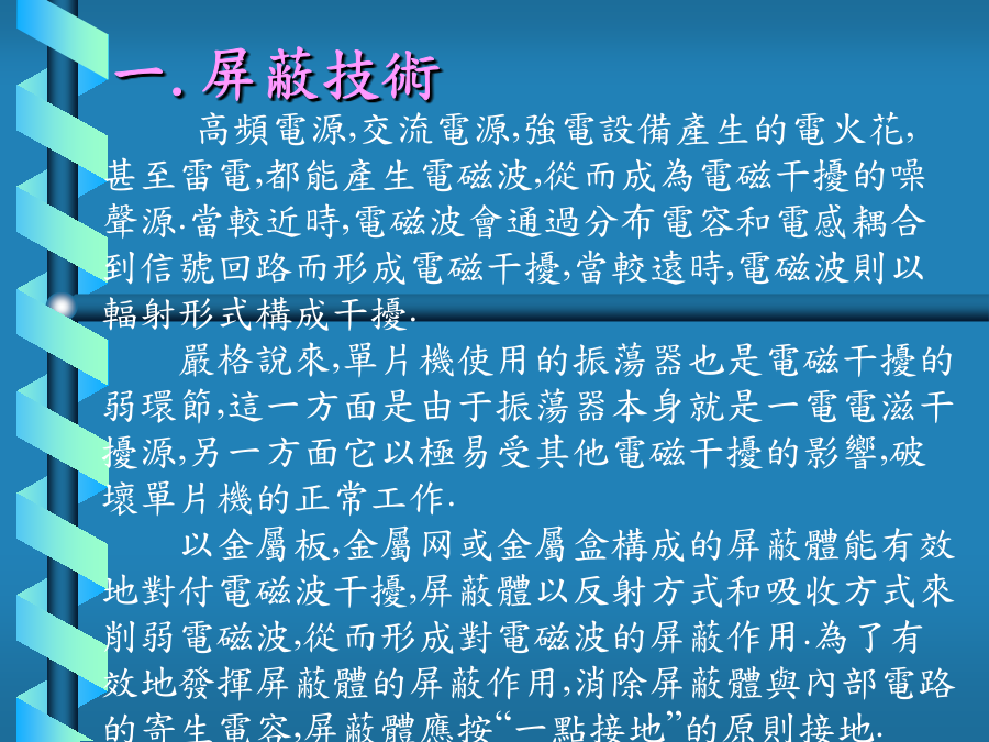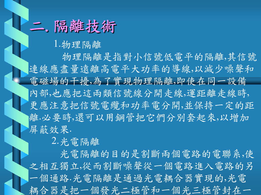 目錄:一.屏蔽技術二.隔離技術外殼里的器件,外殼有金屬的和塑膠的兩種.輸入信號使發光二極管發光,其光線又使光三極管產生電信號輸出從而即完成了信號的傳遞,又實現了電氣上的隔離.光電耦合器的輸入端與輸出端在電氣上是絕緣的,且輸出端對輸入端也無及饋,加百具有隔離和抗干擾的獨特性能.