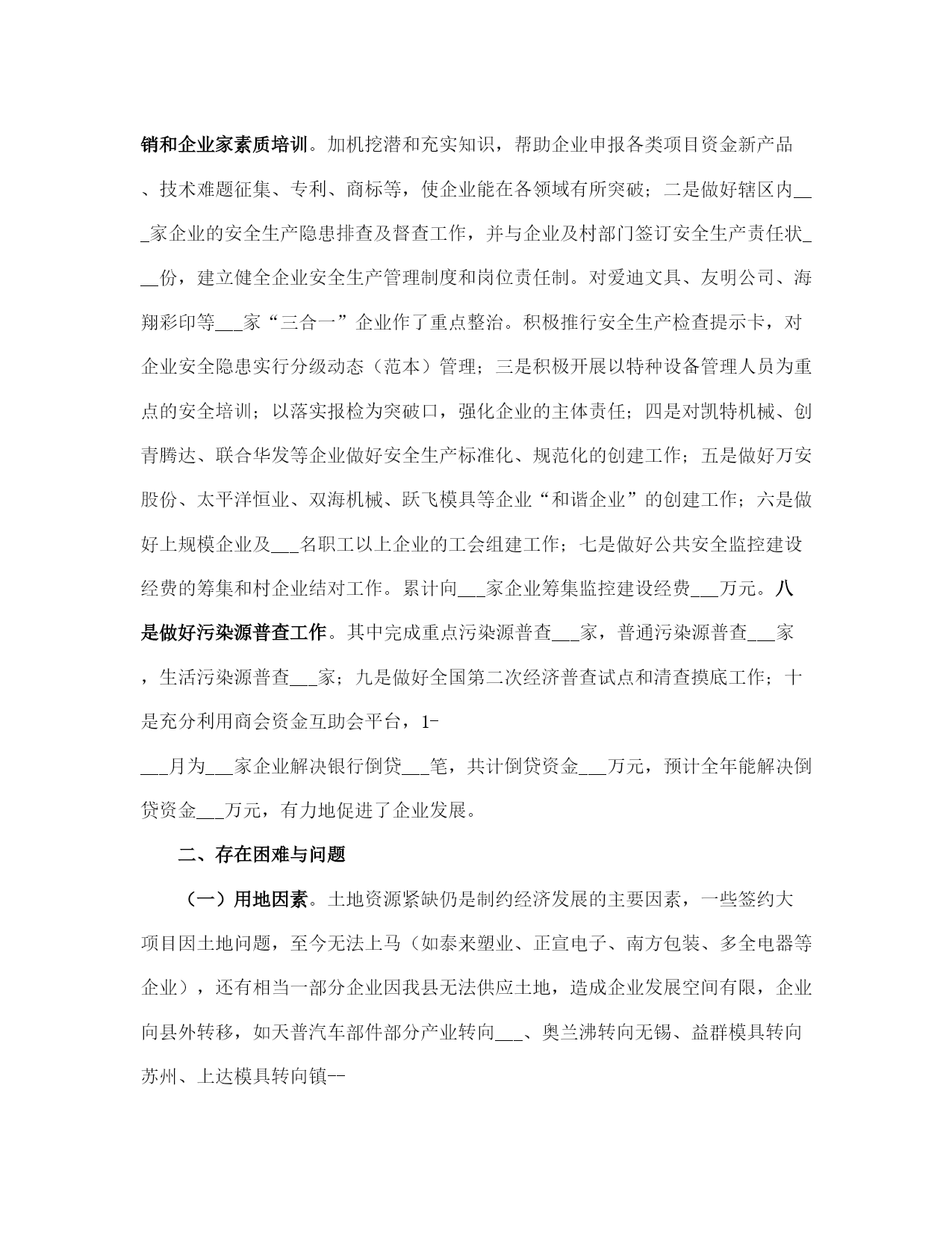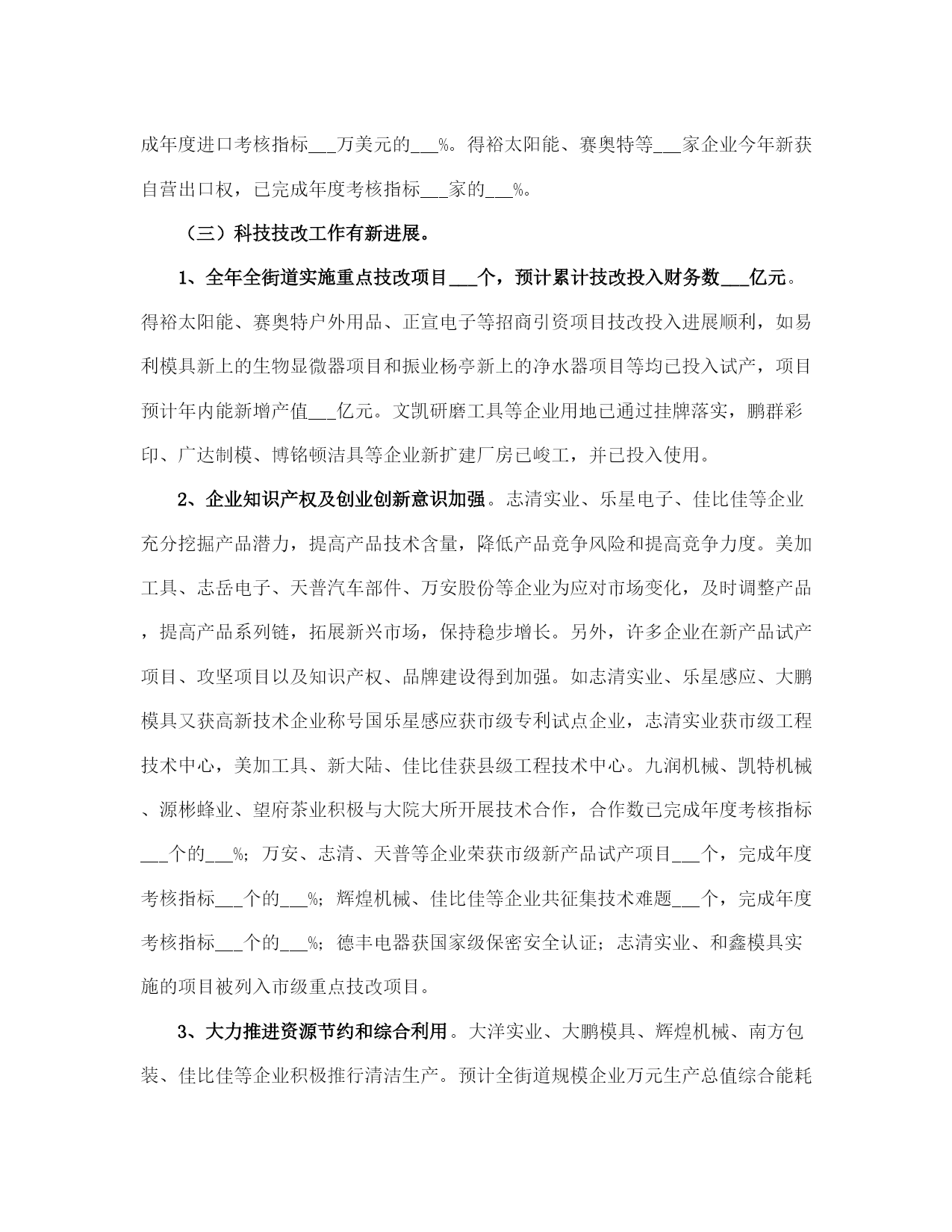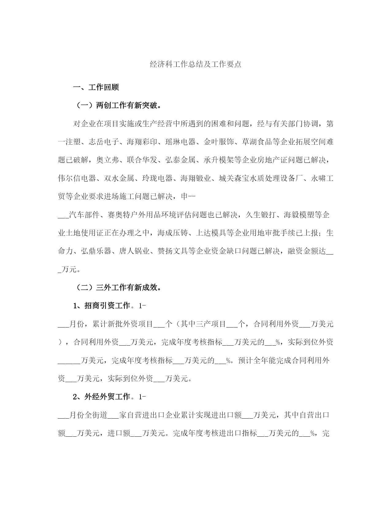 经济科工作总结及工作要点(完整版)文档资料可直接使用,可编辑,欢迎下载经济科工作总结及工作要点一、工作回顾(一)两创工作有新突破。对企业在项目实施或生产经营中所遇到的困难和问题,经与有关部门协调,第一注塑、志岳电子、海翔彩印、瑶琳电器、金叶服饰、草湖食品等企业拓展空间难题已破解,奥立弗、联合华发、弘泰金属、承升模架等企业房地产证问题已解决,伟尔信电器、双水金属、玲珑电器、海翔锻业、城关森宝水质处理设备厂、永啸工贸等企业要求进场施工问题已解决,申--___汽车部件、赛奥特户外用品环境评估问题也已解决,久生锻打、海毅模塑等企业土地使用证正在办理之中,海成压铸、上达模具等企业用地审批手续已上报;生命力、弘鼎乐器、唐人锅业、赞扬文具等企业资金缺口问题已解决,融资金额达___万元。(二)三外工作有新成效。1、招商引资工作。1-___月份,累计新批外资项目___个(其中三产项目___个,合同利用外资___万美元),合同利用外资___万美元,完成年度考核指标___万美元的___%,实际到位外资______万美元,完成年度考核指标___万美元的___%。预计全年能完成合同利用外资___万美元,实际到位外资___万美元。2、外经外贸工作。1-___月份全街道___家自营进出口企业累计实现进出口额___万美元,其中自营出口额___万美元,进口额___万美元。完成年度考核进出口指标___万美元的___%,完成年度进口考核指标___万美元的___%。得裕太阳能、赛奥特等___家企业今年新获自营出口权,已完成年度考核指标___家的___%。(三)科技技改工作有新进展。1、全年全街道实施重点技改项目___个,预计累计技改投入财务数___亿元。得裕太阳能、赛奥特户外用品、正宣电子等招商引资项目技改投入进展顺利,如易利模具新上的生物显微器项目和振业杨亭新上的净水器项目等均已投入试产,项目预计年内能新增产值___亿元。文凯研磨工具等企业用地已通过挂牌落实,鹏群彩印、广达制模、博铭顿洁具等企业新扩建厂房已峻工,并已投入使用。2、企业知识产权及创业创新意识加强。志清实业、乐星电子、佳比佳等企业充分挖掘产品潜力,提高产品技术含量,降低产品竞争风险和提高竞争力度。美加工具、志岳电子、天普汽车部件、万安股份等企业为应对市场变化,及时调整产品,提高产品系列链,拓展新兴市场,保持稳步增长。另外,许多企业在新产品试产项目、攻坚项目以及知识产权、品牌建设得到加强。如志清实业、乐星感应、大鹏模具又获高新技术企业称号国乐星感应获市级专利试点企业,志清实业获市级工程技术中心,美加工具、新大陆、佳比佳获县级工程技术中心。九润机械、凯特机械、源彬蜂业、望府茶业积极与大院大所开展技术合作,合作数已完成年度考核指标___个的___%;万安、志清、天普等企业荣获市级新产品试产项目___个,完成年度考核指标___个的___%;辉煌机械、佳比佳等企业共征集技术难题___个,完成年度考核指标___个的___%;德丰电器获国家级保密安全认证;志清实业、和鑫模具实施的项目被列入市级重点技改项目。3、大力推进资源节约和综合利用。大洋实业、大鹏模具、辉煌机械、南方包装、佳比佳等企业积极推行清洁生产。预计全街道规模企业万元生产总值综合能耗同比下降___%,这些项目的实施必将能有效地提升街道企业的产品档次,优化产品结构,提高发展后劲。(四)工业经济发展平稳。在国内外经济形势的影响下,预计全年街道能完成工业总产值___亿元,与去年大体持平;实现销售收入___亿元,比去年略有增长;实现利润___亿元,比去年略有下降;实交税金___亿元,比去年略有增长。其中___家规模企业完成工业总产值___亿元,实现销售收入___亿元,与去年大体持平;实现利润___亿元,实交税金___亿元,比去年都有不同程度下降。(五)商贸经济发展良好。全街道预计全年第三产业实现营业收入___亿元,增加值___亿元。世纪联华开业以来,保持预定的目标稳步前进,加贝、三--___按照各自的定位采取各种形式的促销,保证月营业额的预定收入,太平洋、龙珠百货等商贸企业保持着良好的发展态势。餐饮、宾馆等其它服务业的使用率有逐步提高。___银行、民生银行的落户开业使我县的金融业又披上金色的盛装,拓宽了我县融资渠道。明年将有两座新业态的商业项目投入运营。同时商贸企业积极参与各种评比活动。同心通信设备公司被评为全国质量信得过单位,太平洋百货被评为市百货零售十强企业,太平洋国际酒店被评为市级餐饮十强企业,小小超市被评为市连锁十强企业。兴海市场、东门市场等企业已实施蔬菜、猪肉、水产品、豆类制品市场准入制。加强了食品市场的安全监管。(六)全力服务于经济建设。在人力资源紧张、成本上升、人民币升值等不利因素的情况下,工贸人员更是全力做好应