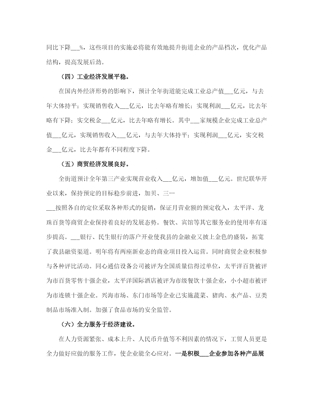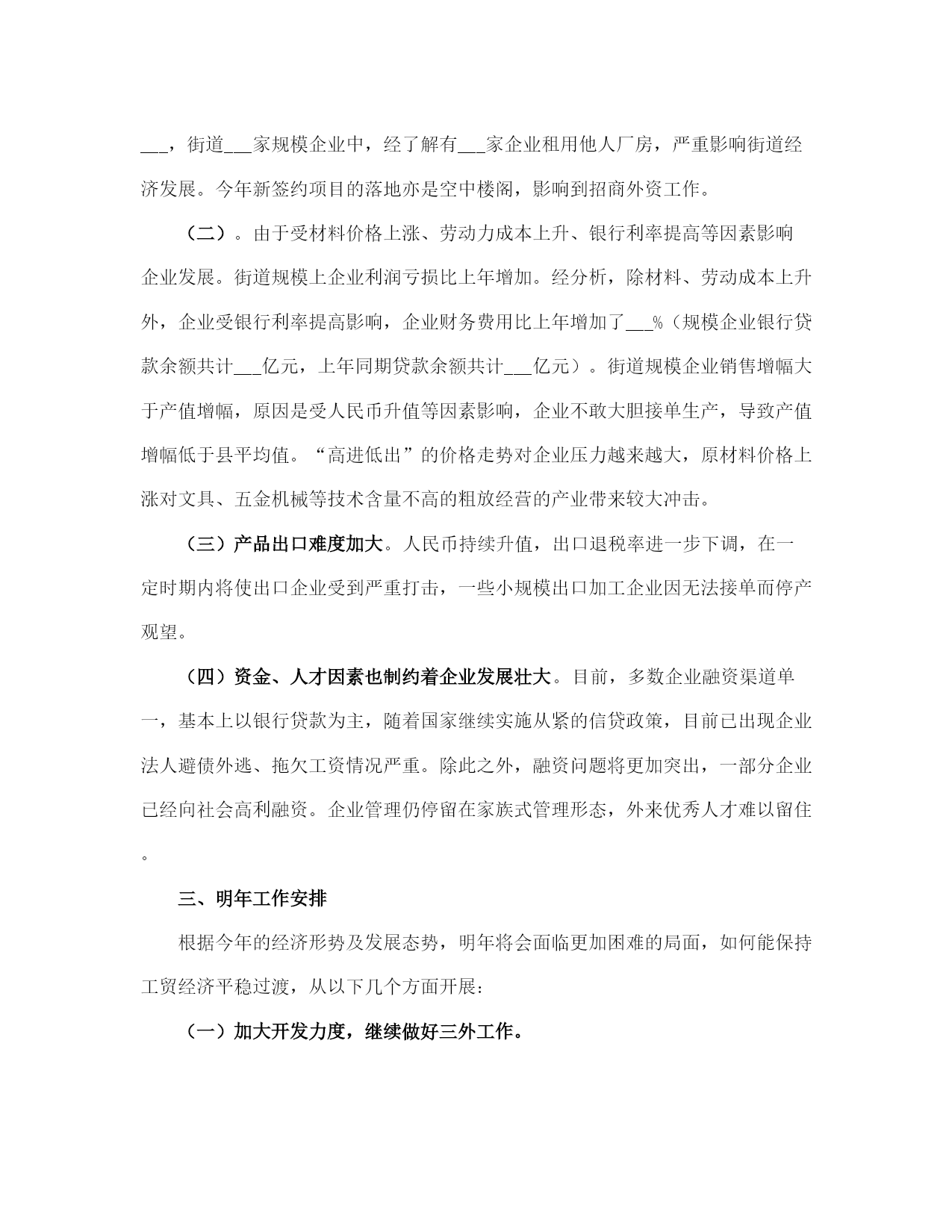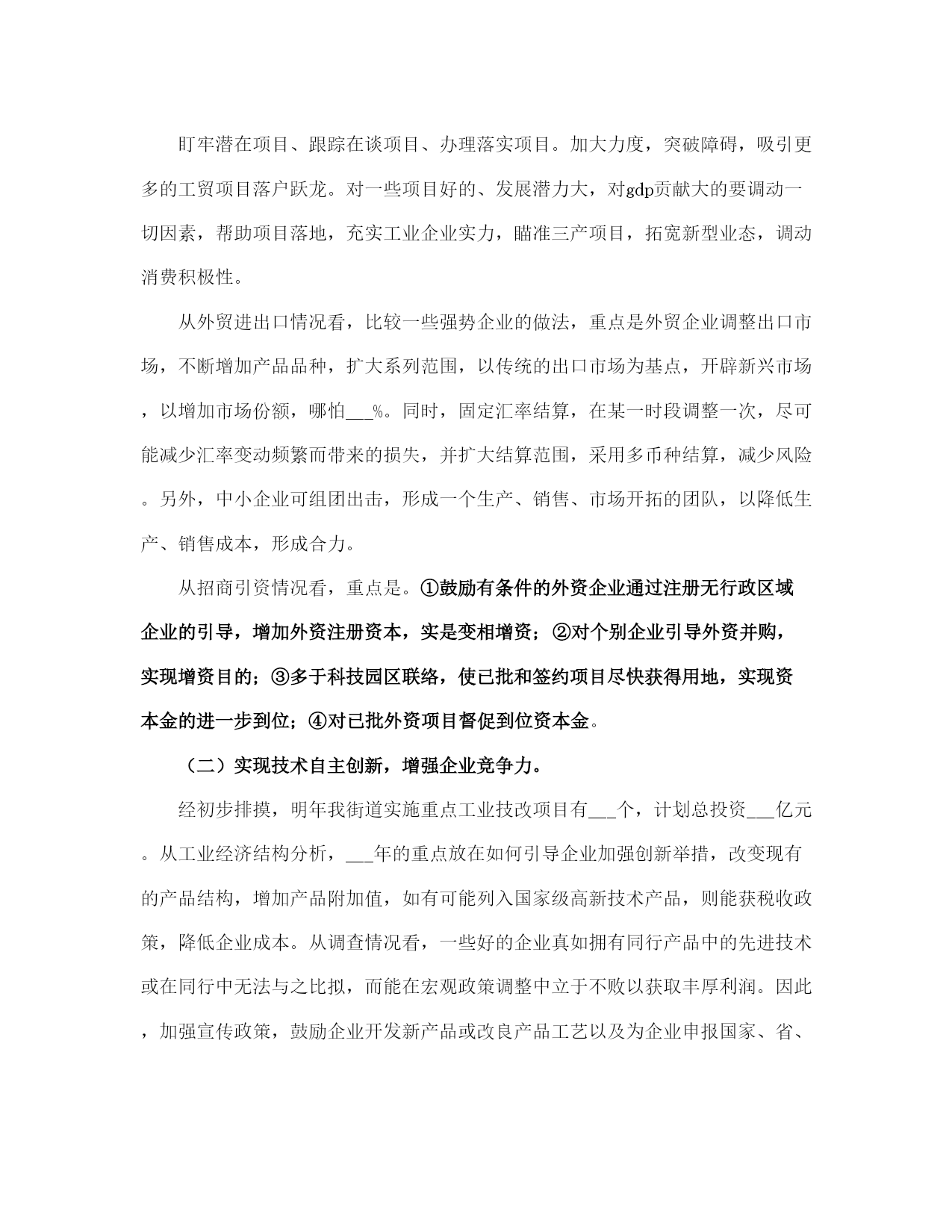经济科工作总结及工作要点(完整版)文档资料可直接使用,可编辑,欢迎下载经济科工作总结及工作要点一、工作回顾(一)两创工作有新突破。对企业在项目实施或生产经营中所遇到的困难和问题,经与有关部门协调,第一注塑、志岳电子、海翔彩印、瑶琳电器、金叶服饰、草湖食品等企业拓展空间难题已破解,奥立弗、联合华发、弘泰金属、承升模架等企业房地产证问题已解决,伟尔信电器、双水金属、玲珑电器、海翔锻业、城关森宝水质处理设备厂、永啸工贸等企业要求进场施工问题已解决,申--___汽车部件、赛奥特户外用品环境评估问题也已解决,久生锻打、海毅模塑等企业土地使用证正在办理之中,海成压铸、上达模具等企业用地审批手续已上报;生命力、弘鼎乐器、唐人锅业、赞扬文具等企业资金缺口问题已解决,融资金额达___万元。(二)三外工作有新成效。1、招商引资工作。1-___月份,累计新批外资项目___个(其中三产项目___个,合同利用外资___万美元),合同利用外资___万美元,完成年度考核指标___万美元的___%,实际到位外资______万美元,完成年度考核指标___万美元的___%。预计全年能完成合同利用外资___万美元,实际到位外资___万美元。2、外经外贸工作。1-___月份全街道___家自营进出口企业累计实现进出口额___万美元,其中自营出口额___万美元,进口额___万美元。完成年度考核进出口指标___万美元的___%,完成年度进口考核指标___万美元的___%。得裕太阳能、赛奥特等___家企业今年新获自营出口权,已完成年度考核指标___家的___%。(三)科技技改工作有新进展。1、全年全街道实施重点技改项目___个,预计累计技改投入财务数___亿元。得裕太阳能、赛奥特户外用品、正宣电子等招商引资项目技改投入进展顺利,如易利模具新上的生物显微器项目和振业杨亭新上的净水器项目等均已投入试产,项目预计年内能新增产值___亿元。文凯研磨工具等企业用地已通过挂牌落实,鹏群彩印、广达制模、博铭顿洁具等企业新扩建厂房已峻工,并已投入使用。2、企业知识产权及创业创新意识加强。志清实业、乐星电子、佳比佳等企业充分挖掘产品潜力,提高产品技术含量,降低产品竞争风险和提高竞争力度。美加工具、志岳电子、天普汽车部件、万安股份等企业为应对市场变化,及时调整产品,提高产品系列链,拓展新兴市场,保持稳步增长。另外,许多企业在新产品试产项目、攻坚项目以及知识产权、品牌建设得到加强。如志清实业、乐星感应、大鹏模具又获高新技术企业称号国乐星感应获市级专利试点企业,志清实业获市级工程技术中心,美加工具、新大陆、佳比佳获县级工程技术中心。九润机械、凯特机械、源彬蜂业、望府茶业积极与大院大所开展技术合作,合作数已完成年度考核指标___个的___%;万安、志清、天普等企业荣获市级新产品试产项目___个,完成年度考核指标___个的___%;辉煌机械、佳比佳等企业共征集技术难题___个,完成年度考核指标___个的___%;德丰电器获国家级保密安全认证;志清实业、和鑫模具实施的项目被列入市级重点技改项目。3、大力推进资源节约和综合利用。大洋实业、大鹏模具、辉煌机械、南方包装、佳比佳等企业积极推行清洁生产。预计全街道规模企业万元生产总值综合能耗同比下降___%,这些项目的实施必将能有效地提升街道企业的产品档次,优化产品结构,提高发展后劲。(四)工业经济发展平稳。在国内外经济形势的影响下,预计全年街道能完成工业总产值___亿元,与去年大体持平;实现销售收入___亿元,比去年略有增长;实现利润___亿元,比去年略有下降;实交税金___亿元,比去年略有增长。其中___家规模企业完成工业总产值___亿元,实现销售收入___亿元,与去年大体持平;实现利润___亿元,实交税金___亿元,比去年都有不同程度下降。(五)商贸经济发展良好。全街道预计全年第三产业实现营业收入___亿元,增加值___亿元。世纪联华开业以来,保持预定的目标稳步前进,加贝、三--___按照各自的定位采取各种形式的促销,保证月营业额的预定收入,太平洋、龙珠百货等商贸企业保持着良好的发展态势。餐饮、宾馆等其它服务业的使用率有逐步提高。___银行、民生银行的落户开业使我县的金融业又披上金色的盛装,拓宽了我县融资渠道。明年将有两座新业态的商业项目投入运营。同时商贸企业积极参与各种评比活动。同心通信设备公司被评为全国质量信得过单位,太平洋百货被评为市百货零售十强企业,太平洋国际酒店被评为市级餐饮十强企业,小小超市被评为市连锁十强企业。兴海市场、东门市场等企业已实施蔬菜、猪肉、水产品、豆类制品市场准入制。加强了食品市场的安全监管。(六)全力服务于经济建设。在人力资源紧张、成本上升、人民币升值等不利因素的情况下,工贸人员更是全力做好应