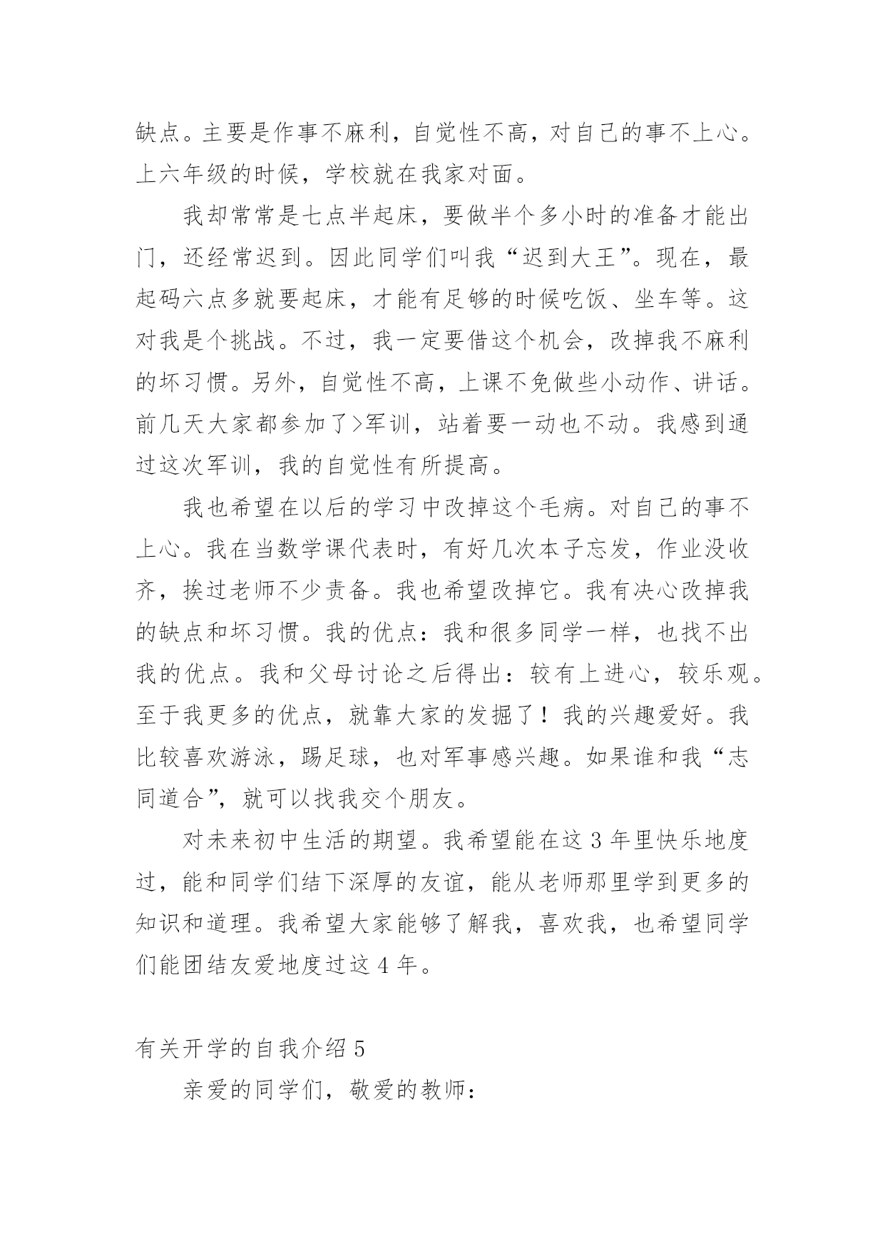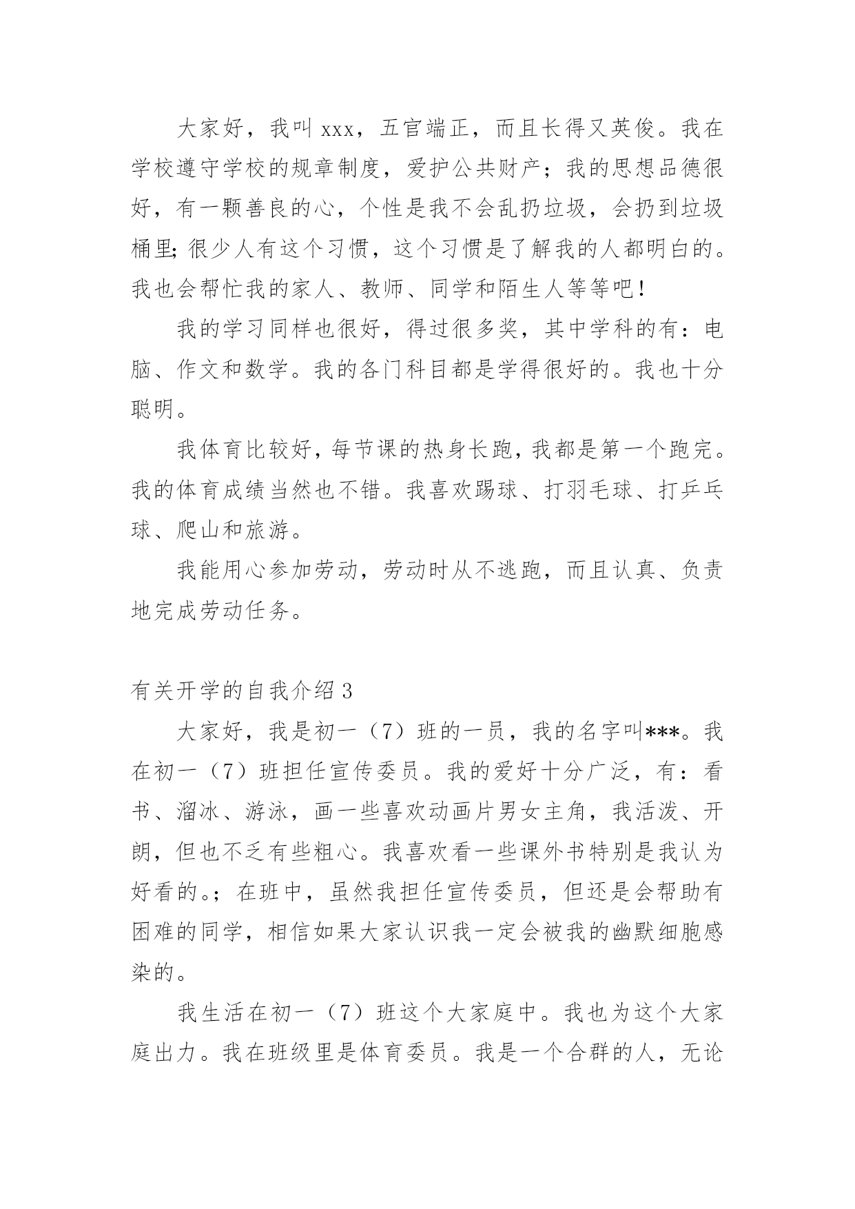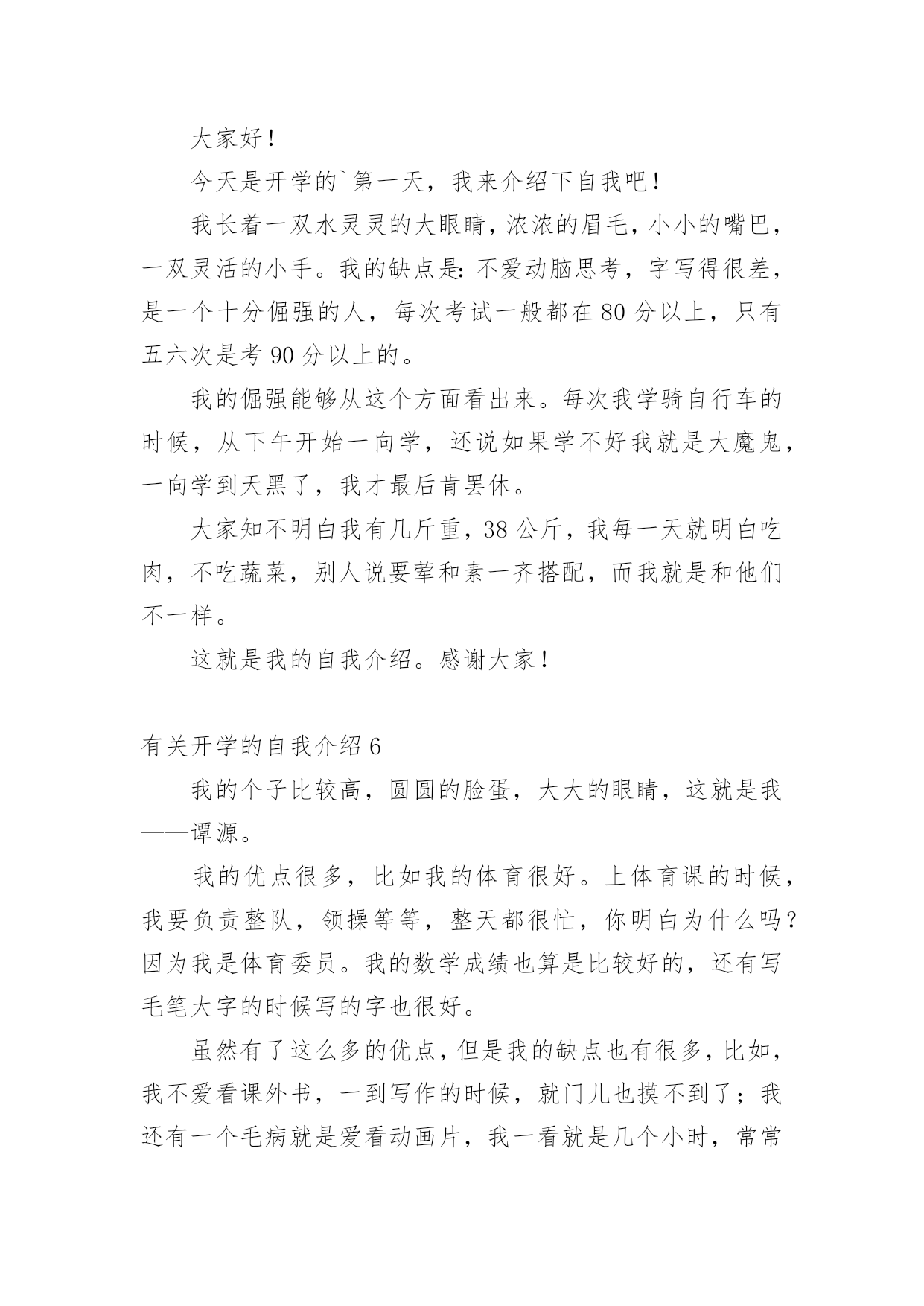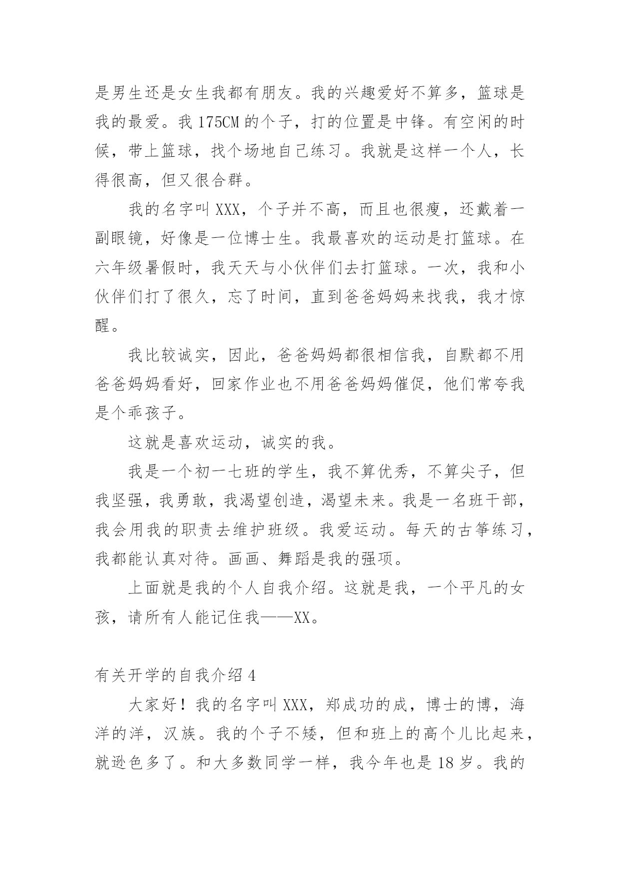 开学的自我介绍有关开学的自我介绍6篇有关开学的自我介绍1我叫XX,今年十三岁,刚上初二。我个子中等,166cm。在班里排第十个,长脸短鼻子,手大脚也大,一双眼睛不大也不小,眼珠子特别有神,一张大嘴巴特别能说,只要一说起来,说上一个小时也没问题,个子不高不矮,身体不胖不瘦。总的来说还是比较帅的。我在北京市XX中上学,我们的校服不好看,全是兰色,所以特别好认,一看就是中学生。我的优点就是爱动,每天早上我都到外面锻炼,跑跑步,玩玩单杠等,所以,我在学校的体育特别好,我的学习也是不可质疑的,数学考试从来没下过90分,我的英语也不错;所以,我的脸上总是洋溢者喜悦的表情。我的缺点就是不会打篮球,也不知到是怎么一回事,就是不喜欢,而且,我上课还总走神,不注意听讲。所以,老师叫我后,我还满有信心的站起来,百分之八十都是对的,害的老师又气又笑。这就是我,只要一见到我,我总是笑,我会热情的和你打招呼,来吧!有关开学的自我介绍2大家好,我叫xxx,五官端正,而且长得又英俊。我在学校遵守学校的规章制度,爱护公共财产;我的思想品德很好,有一颗善良的心,个性是我不会乱扔垃圾,会扔到垃圾桶里;很少人有这个习惯,这个习惯是了解我的人都明白的。我也会帮忙我的家人、教师、同学和陌生人等等吧!我的学习同样也很好,得过很多奖,其中学科的有:电脑、作文和数学。我的各门科目都是学得很好的。我也十分聪明。我体育比较好,每节课的热身长跑,我都是第一个跑完。我的体育成绩当然也不错。我喜欢踢球、打羽毛球、打乒乓球、爬山和旅游。我能用心参加劳动,劳动时从不逃跑,而且认真、负责地完成劳动任务。有关开学的自我介绍3大家好,我是初一(7)班的一员,我的名字叫***。我在初一(7)班担任宣传委员。我的爱好十分广泛,有:看书、溜冰、游泳,画一些喜欢动画片男女主角,我活泼、开朗,但也不乏有些粗心。我喜欢看一些课外书特别是我认为好看的。;在班中,虽然我担任宣传委员,但还是会帮助有困难的同学,相信如果大家认识我一定会被我的幽默细胞感染的。我生活在初一(7)班这个大家庭中。我也为这个大家庭出力。我在班级里是体育委员。我是一个合群的人,无论是男生还是女生我都有朋友。我的兴趣爱好不算多,篮球是我的最爱。我175CM的个子,打的位置是中锋。有空闲的时候,带上篮球,找个场地自己练习。我就是这样一个人,长得很高,但又很合群。我的名字叫XXX,个子并不高,而且也很瘦,还戴着一副眼镜,好像是一位博士生。我最喜欢的运动是打篮球。在六年级暑假时,我天天与小伙伴们去打篮球。一次,我和小伙伴们打了很久,忘了时间,直到爸爸妈妈来找我,我才惊醒。我比较诚实,因此,爸爸妈妈都很相信我,自默都不用爸爸妈妈看好,回家作业也不用爸爸妈妈催促,他们常夸我是个乖孩子。这就是喜欢运动,诚实的我。我是一个初一七班的学生,我不算优秀,不算尖子,但我坚强,我勇敢,我渴望创造,渴望未来。我是一名班干部,我会用我的职责去维护班级。我爱运动。每天的古筝练习,我都能认真对待。画画、舞蹈是我的强项。上面就是我的个人自我介绍。这就是我,一个平凡的女孩,请所有人能记住我——XX。有关开学的自我介绍4大家好!我的名字叫XXX,郑成功的成,博士的博,海洋的洋,汉族。我的个子不矮,但和班上的高个儿比起来,就逊色多了。和大多数同学一样,我今年也是18岁。我的缺点。主要是作事不麻利,自觉性不高,对自己的事不上心。上六年级的时候,学校就在我家对面。我却常常是七点半起床,要做半个多小时的准备才能出门,还经常迟到。因此同学们叫我“迟到大王”。现在,最起码六点多就要起床,才能有足够的时候吃饭、坐车等。这对我是个挑战。不过,我一定要借这个机会,改掉我不麻利的坏习惯。另外,自觉性不高,上课不免做些小动作、讲话。前几天大家都参加了>军训,站着要一动也不动。我感到通过这次军训,我的自觉性有所提高。我也希望在以后的学习中改掉这个毛病。对自己的事不上心。我在当数学课代表时,有好几次本子忘发,作业没收齐,挨过老师不少责备。我也希望改掉它。我有决心改掉我的缺点和坏习惯。我的优点:我和很多同学一样,也找不出我的优点。我和父母讨论之后得出:较有上进心,较乐观。至于我更多的优点,就靠大家的发掘了!我的兴趣爱好。我比较喜欢游泳,踢足球,也对军事感兴趣。如果谁和我“志同道合”,就可以找我交个朋友。对未来初中生活的期望。我希望能在这3年里快乐地度过,能和同学们结下深厚的友谊,能从老师那里学到更多的知识和道理。我希望大家能够了解我,喜欢我,也希望同学们能团结友爱地度过这4年。有关开学的自我介绍5亲爱的同学们,敬爱的教师:大家好!今天是开学的`第一天,我来介绍下自我吧!我长着一双水灵灵的大眼睛,浓浓的眉毛,小小的嘴巴,一双灵活的小手。我的缺点是:不爱动脑思考,字写得很差,是一个十分倔强的人,每次考试一