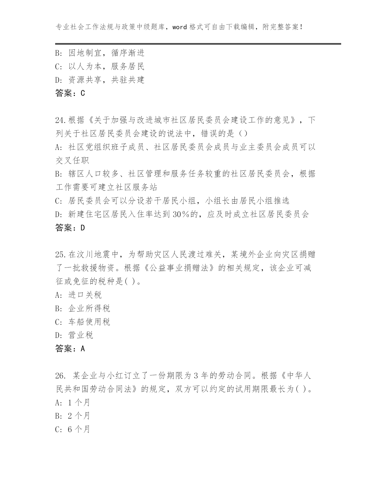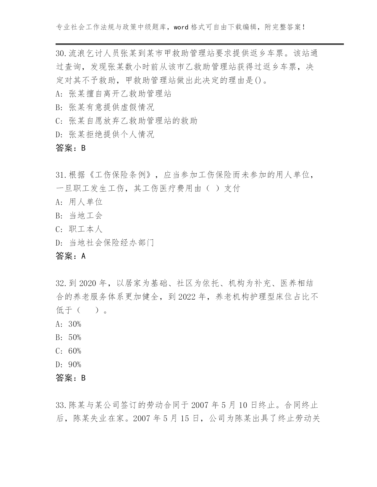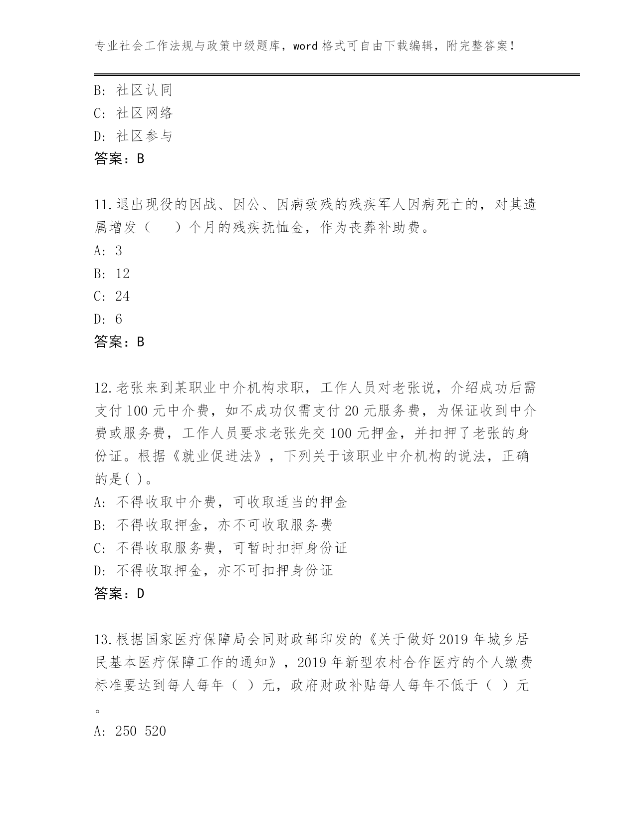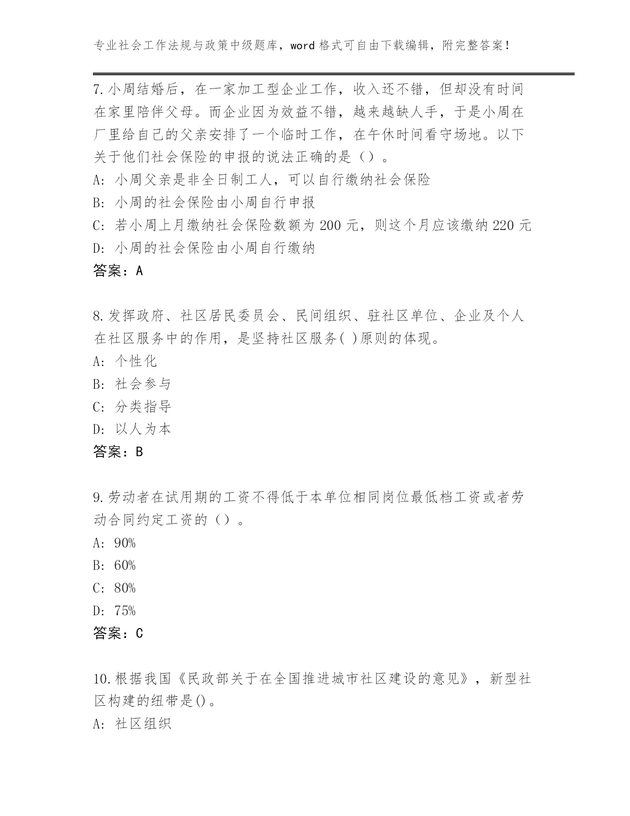 专业社会工作法规与政策中级题库,word格式可自由下载编辑,附完整答案!2023-24年河北省社会工作法规与政策中级真题【各地真题】第I部分单选题(100题)1.杨某与某企业计划合作成立一所民办职业培训学校,根据《民办非企业单位登记暂行办法》规定,其应当申请民办非企业()登记。A:个人登记B:合伙登记C:联名登记D:法人登记答案:D2.王刚在一次对敌作战中不幸牺牲,被批准为烈士。依照《军人抚恤优待条例》的规定,烈士、因公牺牲军人、病故军人的遗属还可以享受一次性抚恤金。关于一次性抚恤金的发放顺序,以下说法正确的是()。A:发放一次性抚恤金时,第一顺序亲属、第二顺序亲属均可享受B:如果王刚死亡前有遗嘱,应按照遗嘱载明的顺序发放一次性抚恤金C:同一顺序中的亲属各自领取一次性抚恤金的数额必须均等D:王刚没有父母(抚养人)、配偶、子女,发给他的兄弟姐妹答案:B3.()不属于基本医疗服务的主要内容。A:慢性病B:常见病C:小病D:多发病答案:A4.根据《民办非企业单位登记暂行办法》,下列事项中,属于民办非企业单位登记事项的是()。A:税务登记证号B:评估等级C:举办单位D:业务主管单位的批准文件答案:D5.根据《村民委员会组织法》,村民会议由村民委员会召集,有l/10以上的村民或l/3以上的村民代表提议,应当召集村民会议,召集村民会议,应当提前()天通知村民。A:10B:5C:3D:8答案:A6.李某在服现役期间因公致残,根据《军人残疾等级评定标准》,其被认定为3级残疾。退役后李某选择回到老家与父母生活,但因为家里住房拥挤且破旧,李某打算在市区购买经济适用房。根据规定,李某能按照当地经济适用房平均价格享受()的购房经费。A:70平方米B:50平方米C:40平方米D:60平方米答案:D7.小周结婚后,在一家加工型企业工作,收入还不错,但却没有时间在家里陪伴父母。而企业因为效益不错,越来越缺人手,于是小周在厂里给自己的父亲安排了一个临时工作,在午休时间看守场地。以下关于他们社会保险的申报的说法正确的是()。A:小周父亲是非全日制工人,可以自行缴纳社会保险B:小周的社会保险由小周自行申报C:若小周上月缴纳社会保险数额为200元,则这个月应该缴纳220元D:小周的社会保险由小周自行缴纳答案:A8.发挥政府、社区居民委员会、民间组织、驻社区单位、企业及个人在社区服务中的作用,是坚持社区服务()原则的体现。A:个性化B:社会参与C:分类指导D:以人为本答案:B9.劳动者在试用期的工资不得低于本单位相同岗位最低档工资或者劳动合同约定工资的()。A:90%B:60%C:80%D:75%答案:C10.根据我国《民政部关于在全国推进城市社区建设的意见》,新型社区构建的纽带是()。A:社区组织B:社区认同C:社区网络D:社区参与答案:B11.退出现役的因战、因公、因病致残的残疾军人因病死亡的,对其遗属增发()个月的残疾抚恤金,作为丧葬补助费。A:3B:12C:24D:6答案:B12.老张来到某职业中介机构求职,工作人员对老张说,介绍成功后需支付l00元中介费,如不成功仅需支付20元服务费,为保证收到中介费或服务费,工作人员要求老张先交100元押金,并扣押了老张的身份证。根据《就业促进法》,下列关于该职业中介机构的说法,正确的是()。A:不得收取中介费,可收取适当的押金B:不得收取押金,亦不可收取服务费C:不得收取服务费,可暂时扣押身份证D:不得收取押金,亦不可扣押身份证答案:D13.根据国家医疗保障局会同财政部印发的《关于做好2019年城乡居民基本医疗保障工作的通知》,2019年新型农村合作医疗的个人缴费标准要达到每人每年()元,政府财政补贴每人每年不低于()元。A:250520B:250770C:520770D:520250答案:A14.下列关于村民委员会选举的说法,正确的是()。A:选举村民委员会,由村民小组提名候选人B:本村1/5以上村民联名,可直接罢免村民委员会成员C:村民委员会委员,由村民直接选举产生D:村民委员会选举,由村民会议主持答案:C15.(2020年真题)根据《女职工劳动保护特别规定》,企业对下列女职工的劳动时间安排,正确的()。A:小丽,怀孕5个月流产,企业准予其享受15天产假B:小琴,怀孕8个月,企业安排其每周加班5个小时C:小芳,哺乳6个月大的儿子,企业在其每天劳动时间内安排1小时哺乳时间D:小莲,怀孕7个月,在劳动时间内进行产前检查,企业将产检所需时间折半计入劳动时间答案:C16.李爷爷的儿子在部队服现役期间