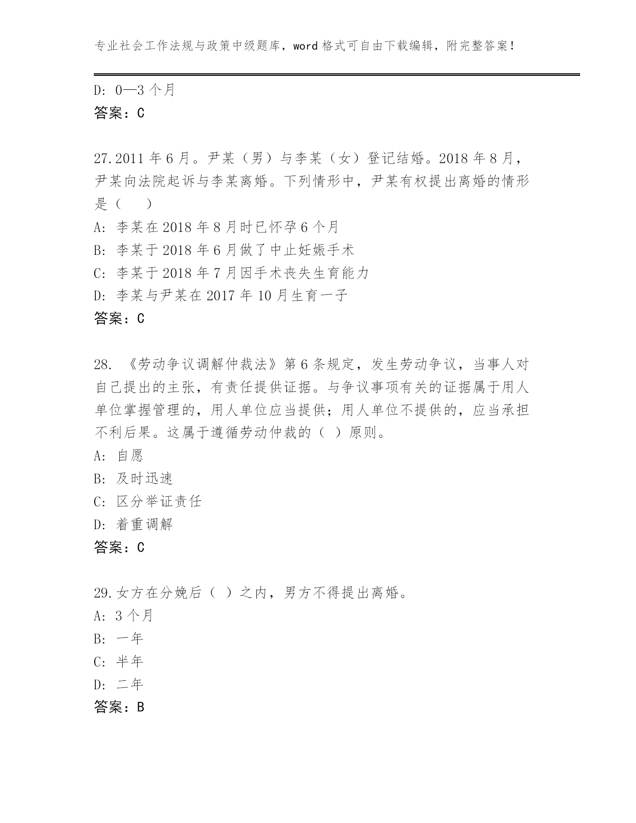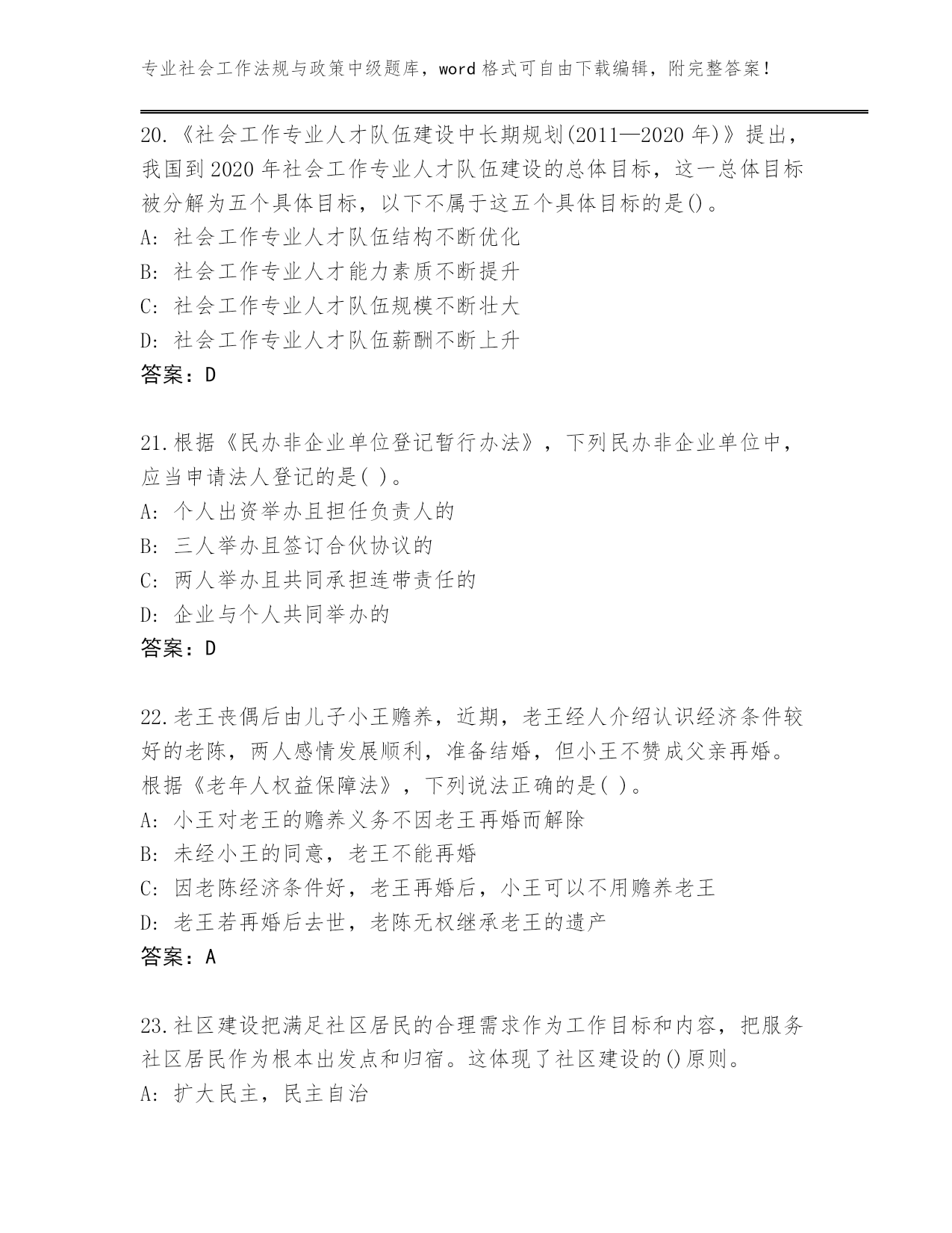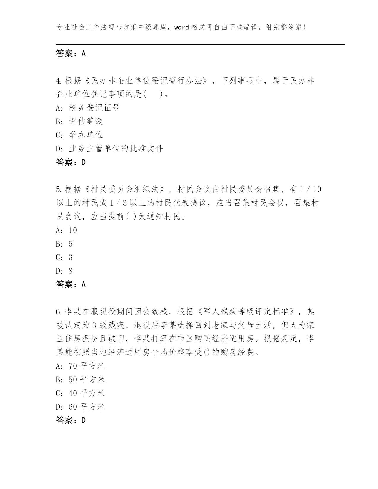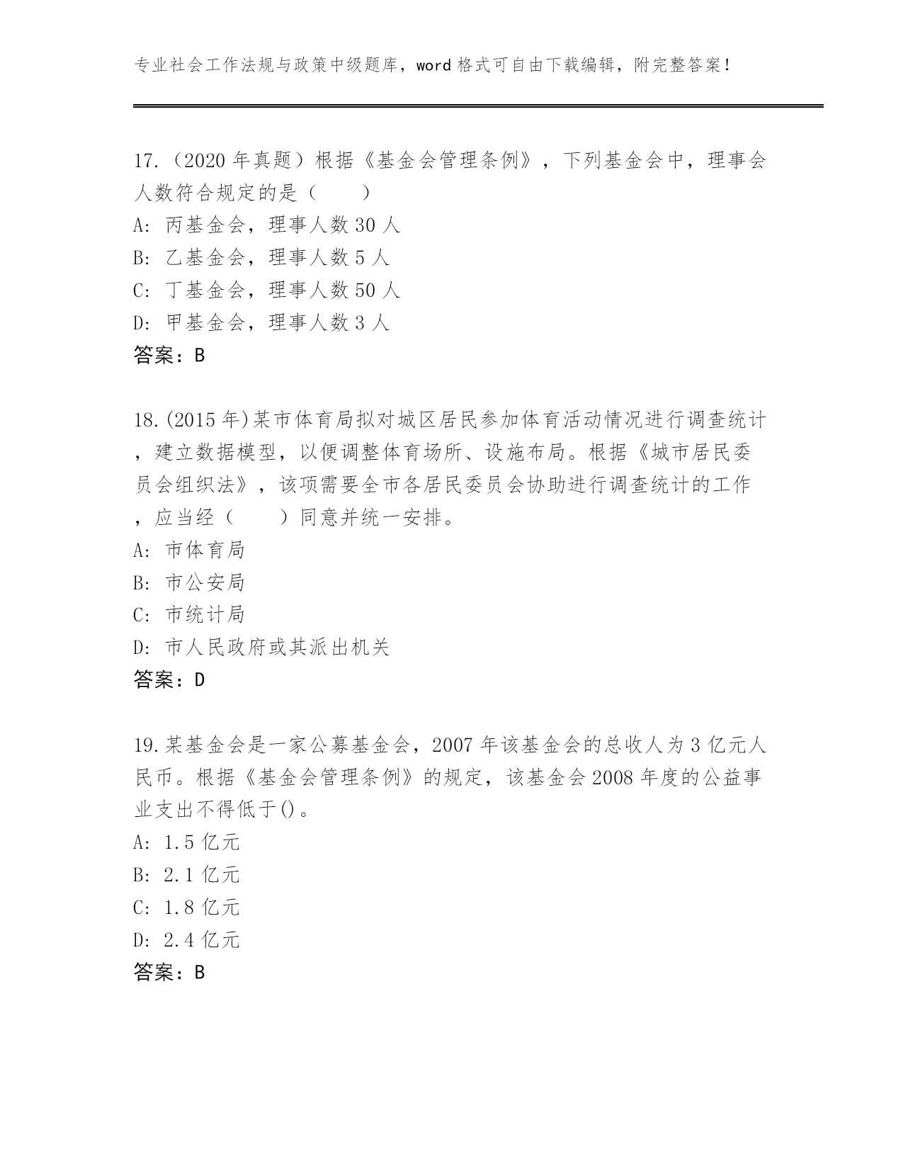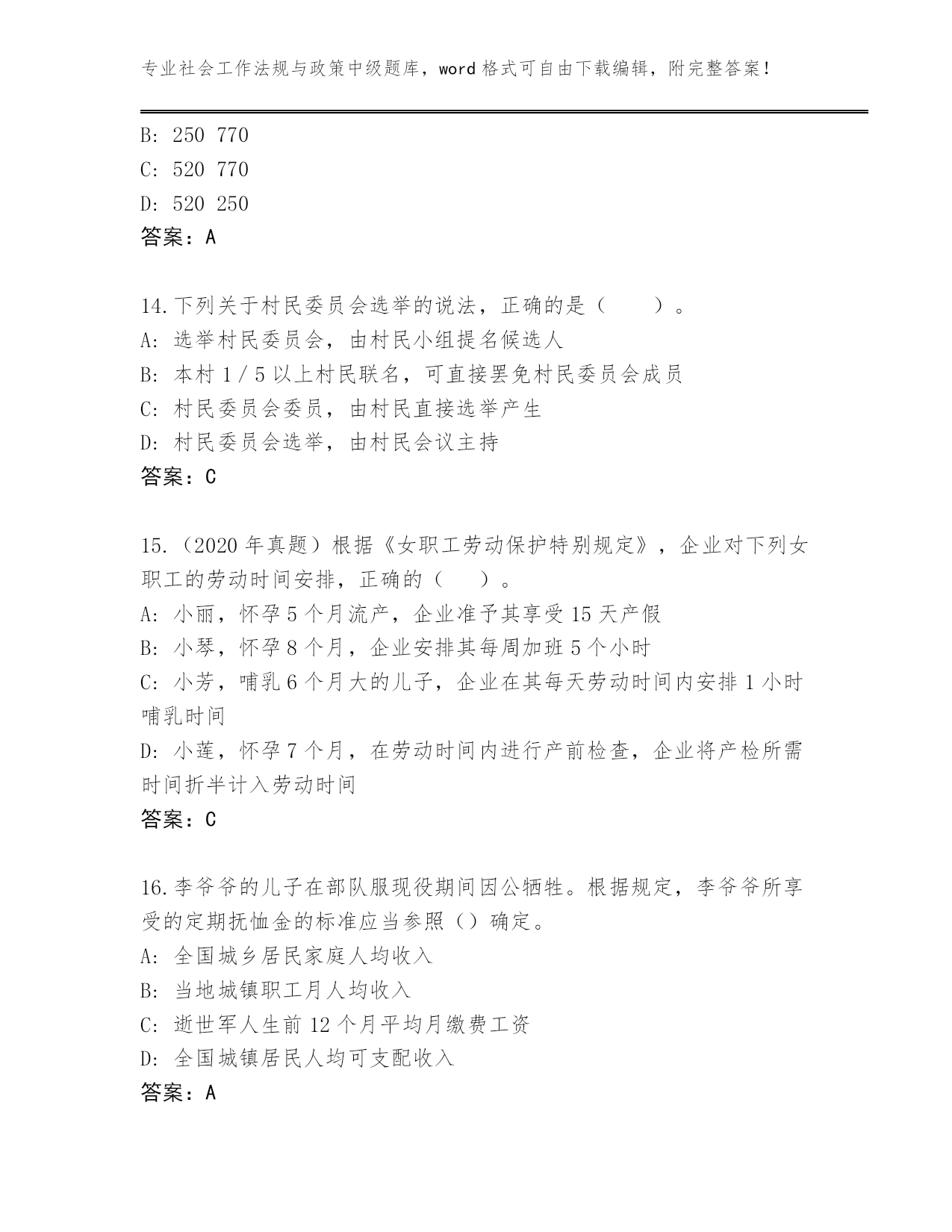 专业社会工作法规与政策中级题库,word格式可自由下载编辑,附完整答案!2023-24年河北省社会工作法规与政策中级真题【各地真题】第I部分单选题(100题)1.杨某与某企业计划合作成立一所民办职业培训学校,根据《民办非企业单位登记暂行办法》规定,其应当申请民办非企业()登记。A:个人登记B:合伙登记C:联名登记D:法人登记答案:D2.王刚在一次对敌作战中不幸牺牲,被批准为烈士。依照《军人抚恤优待条例》的规定,烈士、因公牺牲军人、病故军人的遗属还可以享受一次性抚恤金。关于一次性抚恤金的发放顺序,以下说法正确的是()。A:发放一次性抚恤金时,第一顺序亲属、第二顺序亲属均可享受B:如果王刚死亡前有遗嘱,应按照遗嘱载明的顺序发放一次性抚恤金C:同一顺序中的亲属各自领取一次性抚恤金的数额必须均等D:王刚没有父母(抚养人)、配偶、子女,发给他的兄弟姐妹答案:B3.()不属于基本医疗服务的主要内容。A:慢性病B:常见病C:小病D:多发病答案:A4.根据《民办非企业单位登记暂行办法》,下列事项中,属于民办非企业单位登记事项的是()。A:税务登记证号B:评估等级C:举办单位D:业务主管单位的批准文件答案:D5.根据《村民委员会组织法》,村民会议由村民委员会召集,有l/10以上的村民或l/3以上的村民代表提议,应当召集村民会议,召集村民会议,应当提前()天通知村民。A:10B:5C:3D:8答案:A6.李某在服现役期间因公致残,根据《军人残疾等级评定标准》,其被认定为3级残疾。退役后李某选择回到老家与父母生活,但因为家里住房拥挤且破旧,李某打算在市区购买经济适用房。根据规定,李某能按照当地经济适用房平均价格享受()的购房经费。A:70平方米B:50平方米C:40平方米D:60平方米答案:D7.小周结婚后,在一家加工型企业工作,收入还不错,但却没有时间在家里陪伴父母。而企业因为效益不错,越来越缺人手,于是小周在厂里给自己的父亲安排了一个临时工作,在午休时间看守场地。以下关于他们社会保险的申报的说法正确的是()。A:小周父亲是非全日制工人,可以自行缴纳社会保险B:小周的社会保险由小周自行申报C:若小周上月缴纳社会保险数额为200元,则这个月应该缴纳220元D:小周的社会保险由小周自行缴纳答案:A8.发挥政府、社区居民委员会、民间组织、驻社区单位、企业及个人在社区服务中的作用,是坚持社区服务()原则的体现。A:个性化B:社会参与C:分类指导D:以人为本答案:B9.劳动者在试用期的工资不得低于本单位相同岗位最低档工资或者劳动合同约定工资的()。A:90%B:60%C:80%D:75%答案:C10.根据我国《民政部关于在全国推进城市社区建设的意见》,新型社区构建的纽带是()。A:社区组织B:社区认同C:社区网络D:社区参与答案:B11.退出现役的因战、因公、因病致残的残疾军人因病死亡的,对其遗属增发()个月的残疾抚恤金,作为丧葬补助费。A:3B:12C:24D:6答案:B12.老张来到某职业中介机构求职,工作人员对老张说,介绍成功后需支付l00元中介费,如不成功仅需支付20元服务费,为保证收到中介费或服务费,工作人员要求老张先交100元押金,并扣押了老张的身份证。根据《就业促进法》,下列关于该职业中介机构的说法,正确的是()。A:不得收取中介费,可收取适当的押金B:不得收取押金,亦不可收取服务费C:不得收取服务费,可暂时扣押身份证D:不得收取押金,亦不可扣押身份证答案:D13.根据国家医疗保障局会同财政部印发的《关于做好2019年城乡居民基本医疗保障工作的通知》,2019年新型农村合作医疗的个人缴费标准要达到每人每年()元,政府财政补贴每人每年不低于()元。A:250520B:250770C:520770D:520250答案:A14.下列关于村民委员会选举的说法,正确的是()。A:选举村民委员会,由村民小组提名候选人B:本村1/5以上村民联名,可直接罢免村民委员会成员C:村民委员会委员,由村民直接选举产生D:村民委员会选举,由村民会议主持答案:C15.(2020年真题)根据《女职工劳动保护特别规定》,企业对下列女职工的劳动时间安排,正确的()。A:小丽,怀孕5个月流产,企业准予其享受15天产假B:小琴,怀孕8个月,企业安排其每周加班5个小时C:小芳,哺乳6个月大的儿子,企业在其每天劳动时间内安排1小时哺乳时间D:小莲,怀孕7个月,在劳动时间内进行产前检查,企业将产检所需时间折半计入劳动时间答案:C16.李爷爷的儿子在部队服现役期间