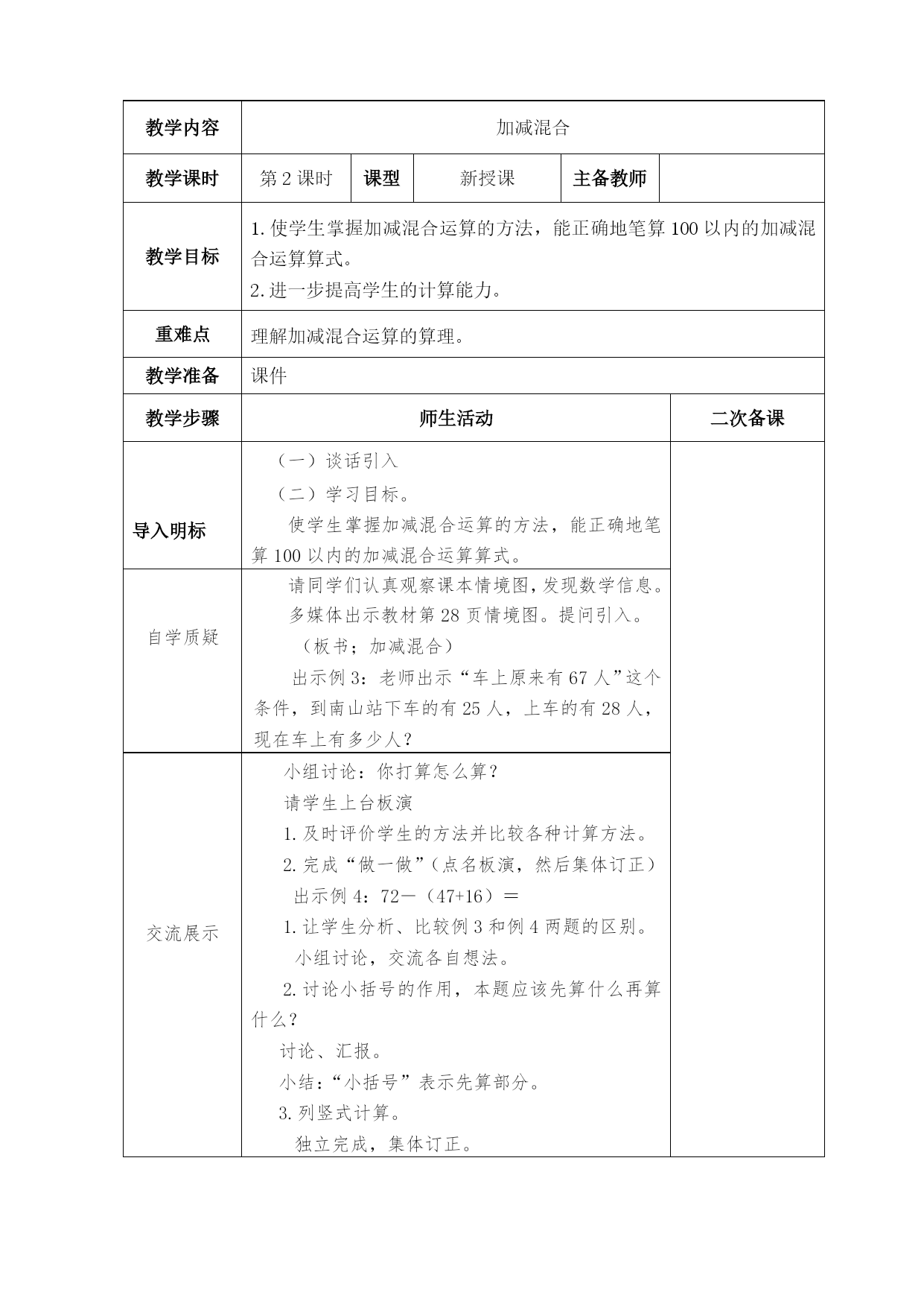PAGEPAGE5加减混合教学设计资料教学目标1.使学生掌握加减混合运算的计算方法,理解加减混合所表示的意义,能正确计算。2.培养学生观察、比较和抽象概括能力,以及应用所学知识解决实际问题的能力。3.在学习活动中,激发学生的学习兴趣,使学生体会到生活中处处有数学。教学内容教科书的内容及练习十二的第1、2题。教具、学具准备图片、小棒、课件。教学设计一、创设情境,铺垫导入师:同学们,安徒生有一篇美丽的童话《丑小鸭》,大家听说过吗?这只受尽苦难的丑小鸭最终怎么样了呢?师:大家看屏幕,这里有3只丑小鸭,只要同学们把这些题解决了,丑小鸭就会变成美丽的白天鹅。同学们愿意帮助他们吗?7+1+2=5+3+1=4+5+1=8-6-1=6-2-3=9-6-1=它们的运算顺序是怎样的?二、自主探索,学习新知师:出示例一,你能编一道数学题,提出一个问题吗。现在湖里天鹅只数发生了什么变化?要求现在还有几只天鹅怎么办?师板算式:4+3-2,并读算式。生读算式。师:同学们观察这道算式与前几节课我们学习的连加、连减有什么不同?师:那你能不能像连加、连减一样给这种题起一个名字。师:像这样既有加法又有减法的运算,我们把它叫做加减混合。(板书:加减混合)生齐读课题。提出学习目标:1、要学会加减混合运算的计算方法;2、能正确计算和解决实际问题。师:谁能再读一读这道题。对照图画来说一说4+3-2所表示的意义。生指名说。师:那么4+3-2该怎么计算呢?我们来讨论一下这个式子先算什么,再算什么。生讨论。生汇报:先算4+3=7,再算7-2=5。师:同学们讨论的结果都是先算4+3=7,再算7-2=5。需要强调一点,做题时一定要记住第二步是几减2。出示例二生:湖里有4只天鹅,飞走了2只,又飞来了3只。师:你能提出什么问题?生:现在湖里有几只天鹅?师:谁来列式?师:上面算式先算什么,后算什么,请同学们试做。生汇报。师:做题时关键要记住哪个数?生:记住第一步的得数2。师:请大家回忆一下例1、例2的计算过程,谁能说一说我们计算的顺序?小结:我们计算的顺序是从左往右计算,与连加、连减相同。师:1、现在听老师说的顺序来摆小棒计算。怎样列式计算?2、看算式摆小棒,7-3+2怎样摆小棒呢?师小结:同学们真棒,看了两幅画面,就自己解决了加减混合运算的问题,你们真是爱动脑筋的好孩子。接下来,我们再到别处去看一看,好吗?三、设置情境,解决问题师:看,一只调皮的小猴子挡住了我们的去路。啊,原来它是要让大家来帮忙的。(出示的做一做画面)师:你会解决这个问题吗?不告诉别人,自己把算式写在书上。学生独立完成,然后集体订正。师:小猴子怎么还不走呢?原来他还有一道题呢!(出示76页第一题)大家看这里发生了什么事情,这么热闹啊!原来是森林里开了一个运动会,小猫、小狗、小鸭和小鸡分别获得了四个项目的第一名,森林之王狮子要奖励他们每人一处房子,你能帮它们找到房子吗?生抢答完成。师:狮子大王看到我们同学来了很高兴。他有几颗智慧星要发给大家,但是它有个条件,就是做对一道题得一颗智慧星,最后看谁的智慧星最多,谁就是最聪明的同学。现在我们就请狮子大王出题吧。(76页第四题)生独立完成,把答案写在书上,集体订正。这是老师在公路边看到的情景。你能编一道数学题吗?四、全课总结