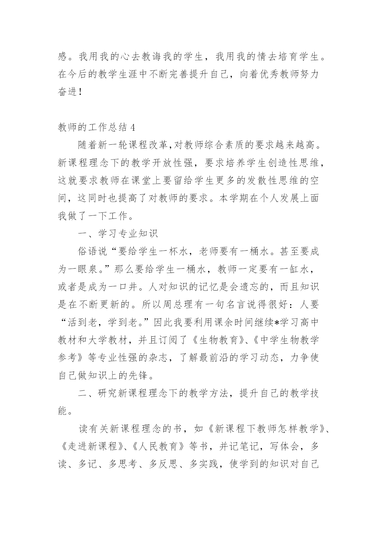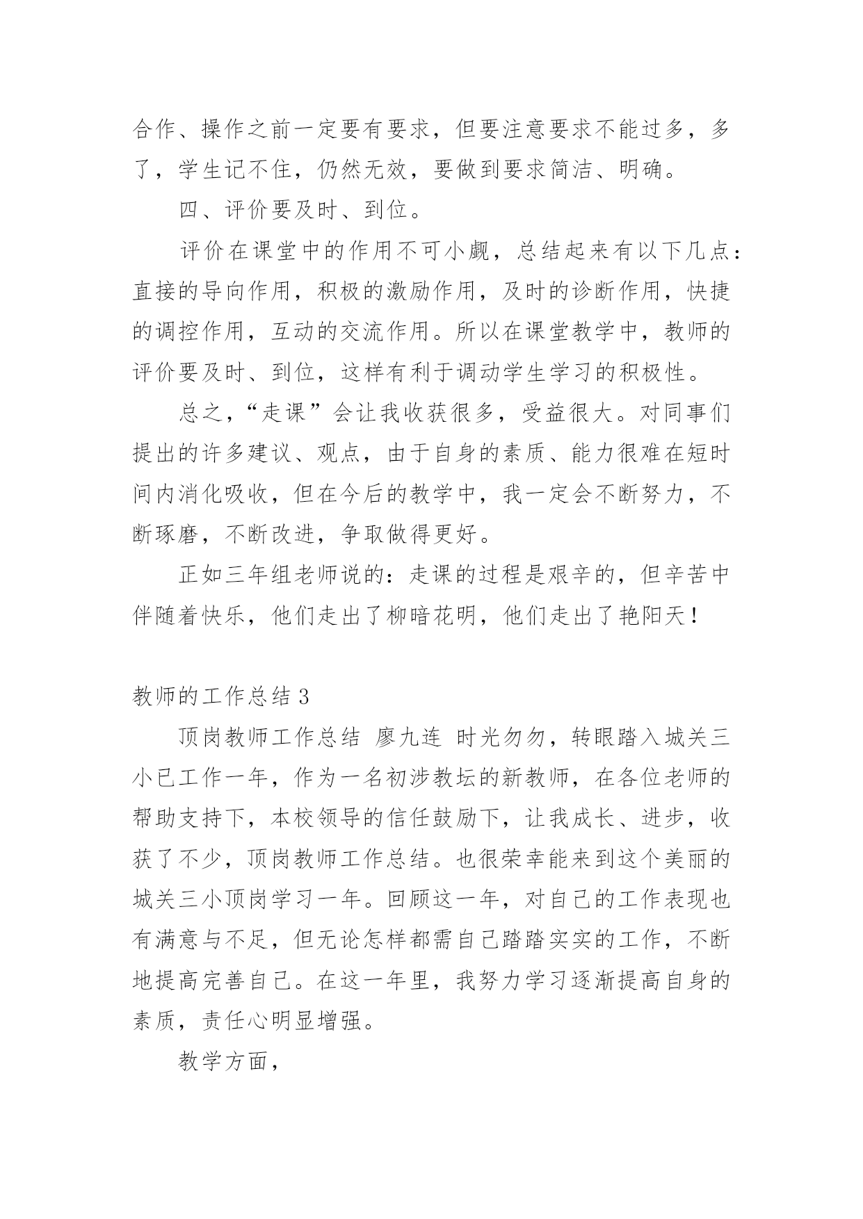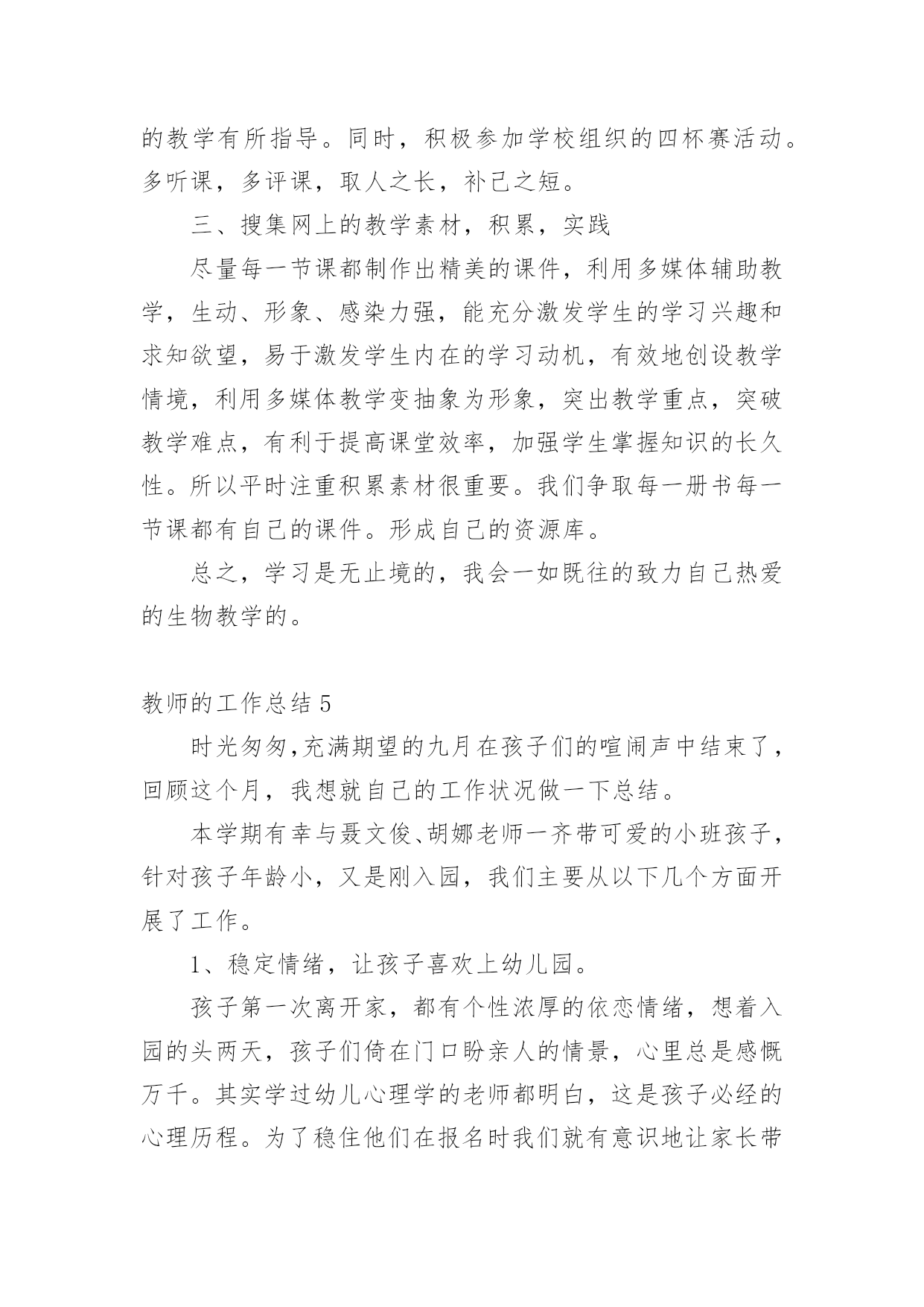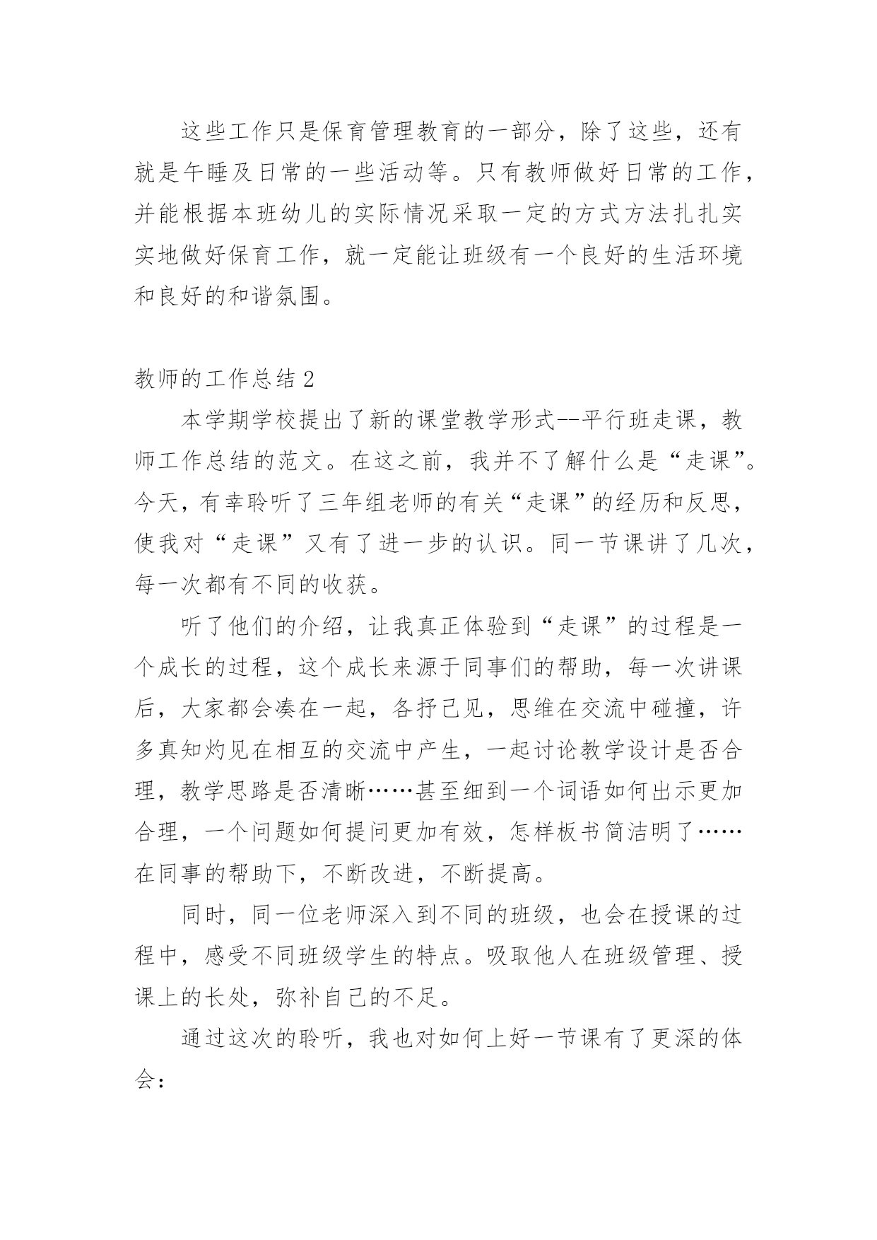 教师的工作总结总结在一个时期、一个年度、一个阶段对学习和工作生活等情况加以回顾和分析的一种书面材料,它有助于我们寻找工作和事物发展的规律,从而掌握并运用这些规律,不如静下心来好好写写总结吧。如何把总结做到重点突出呢?以下是小编整理的教师的工作总结,仅供参考,欢迎大家阅读。教师的工作总结1幼儿园保育工作在幼儿教育工作中是非常重要的,只有扎扎实实地做好保育工作,才能让幼儿健康、活泼、快乐地成长,并让家长们放心,让社会满意,幼儿保育教师工作总结。培养幼儿良好的行为习惯、行为规范、自理能力、自我保护、生活卫生及良好的学习能力,让幼儿在晨间锻炼、进餐、教学、睡眠、离园等一日各项活动中养成良好的行为品质。我结合自己的工作实践浅谈如下:安全教育幼儿的户外活动是增强幼儿身体素质,提高身体抗病能力的重要活动。要确保幼儿活动的质量,增强幼儿的体质。我坚持在活动前给幼儿带好毛巾,活动中及时帮幼儿擦汗,根据气候的变化为幼儿增减衣服。特别是在练习跳绳和哑铃操时提醒幼儿注意安全,在活动时保持一定的距离。在平时我也让幼儿了解生活中常见的一些安全标志,知道遇到困难时找一些简单的自救方法。我认为教师要有高度的责任心,时刻让孩子在自己的视线范围内,排除一切不安全因素,同时对幼儿进行随机教育,培养幼儿自我保护的意识和高度的应变能力。进餐教育由于我班幼儿进餐的速度比较慢而且有些幼儿还要掉饭粒。所以我在进餐时也采取了许多的办法,如随时监督提醒、激励、表扬、鼓励等方法。而在小朋友放餐具的时候没有将餐具放整齐,剩饭剩菜也总是要倒到外面,我就每天请吃得最快的幼儿做小小监督员。通过这样的方法,我们班的进餐习惯比以前好多了。自理能力的培养由于幼儿家长宠爱孩子,包办代替的的比较多,所以自理能力的培养是非常重要的。如何教育幼儿自己的事情自己做,我尝试了以下方法。如自己的书包自己整理、自己的衣服自己折、自己放、自然角由幼儿负责擦抹换水等。通过生活中的一些小事来培养幼儿的自理能力。盥洗教育在幼儿入厕时,由于厕所离教室比较远,所以我先讲好要求并排好队,请值日生进行监督。喝牛奶时一位教师负责管理幼儿,另一位负责倒牛奶。从小便——洗手——排队——拿牛奶——坐下喝牛奶——排队,这样的一个循环过程,使整个盥洗过程变得井井有条。因为幼儿已经养成了这样一个习惯,所以当另外一位教师不在时,值日生也可以协助管理了。这些工作只是保育管理教育的一部分,除了这些,还有就是午睡及日常的一些活动等。只有教师做好日常的工作,并能根据本班幼儿的实际情况采取一定的方式方法扎扎实实地做好保育工作,就一定能让班级有一个良好的生活环境和良好的和谐氛围。教师的工作总结2本学期学校提出了新的课堂教学形式--平行班走课,教师工作总结的范文。在这之前,我并不了解什么是“走课”。今天,有幸聆听了三年组老师的有关“走课”的经历和反思,使我对“走课”又有了进一步的认识。同一节课讲了几次,每一次都有不同的收获。听了他们的介绍,让我真正体验到“走课”的过程是一个成长的过程,这个成长来源于同事们的帮助,每一次讲课后,大家都会凑在一起,各抒己见,思维在交流中碰撞,许多真知灼见在相互的交流中产生,一起讨论教学设计是否合理,教学思路是否清晰……甚至细到一个词语如何出示更加合理,一个问题如何提问更加有效,怎样板书简洁明了……在同事的帮助下,不断改进,不断提高。同时,同一位老师深入到不同的班级,也会在授课的过程中,感受不同班级学生的特点。吸取他人在班级管理、授课上的长处,弥补自己的不足。通过这次的聆听,我也对如何上好一节课有了更深的体会:一、教学中要关注细节,考虑周到。要上一节成功的课,每一个细节都要考虑周到,否则就会给学生获取新知增添新的障碍。关注教学细节,就是要用新的教学理念去反思“过去”的教学细节,改造“惯常”的教学细节,创造崭新的教学细节。细节在教学中无处不在,我们要用关注的眼光去发掘细节,用发展的思维去处理细节,那样我们才会有无尽的收获!二、根据教学内容精心设计问题。课堂是一个有组织的认识过程,课堂提问作为一种常见的教学方式贯穿始终,所提问题应该为课堂教学内容服务,课堂提问必须要有明确的目的,问题怎么设计,怎么问,学生才能理解,才能根据提问把这堂课的重点难点深入浅出的解决。每设计一个问题,就要问一下自己,通过这一问题要让学生解决什么,达到什么,是为了启发学生探索的欲望,还是引导他们获得新的知识……教师必须做到心中有数。苏霍姆林斯基说过:“学生来到学校里,不仅是为了取得一份知识的行囊,更主要的是为了变得更聪明。”在教学过程中,教师精心设计课堂提问,创设问题情境,以问题为中心组织教学,非常重要,它是激发学生积极思维,探究,掌握知识,培养学习能力的重要手段。三、课堂上对学生的要求要简洁、明确。低年级的学生自主学习的能力不强,自制力较差,特别是在小