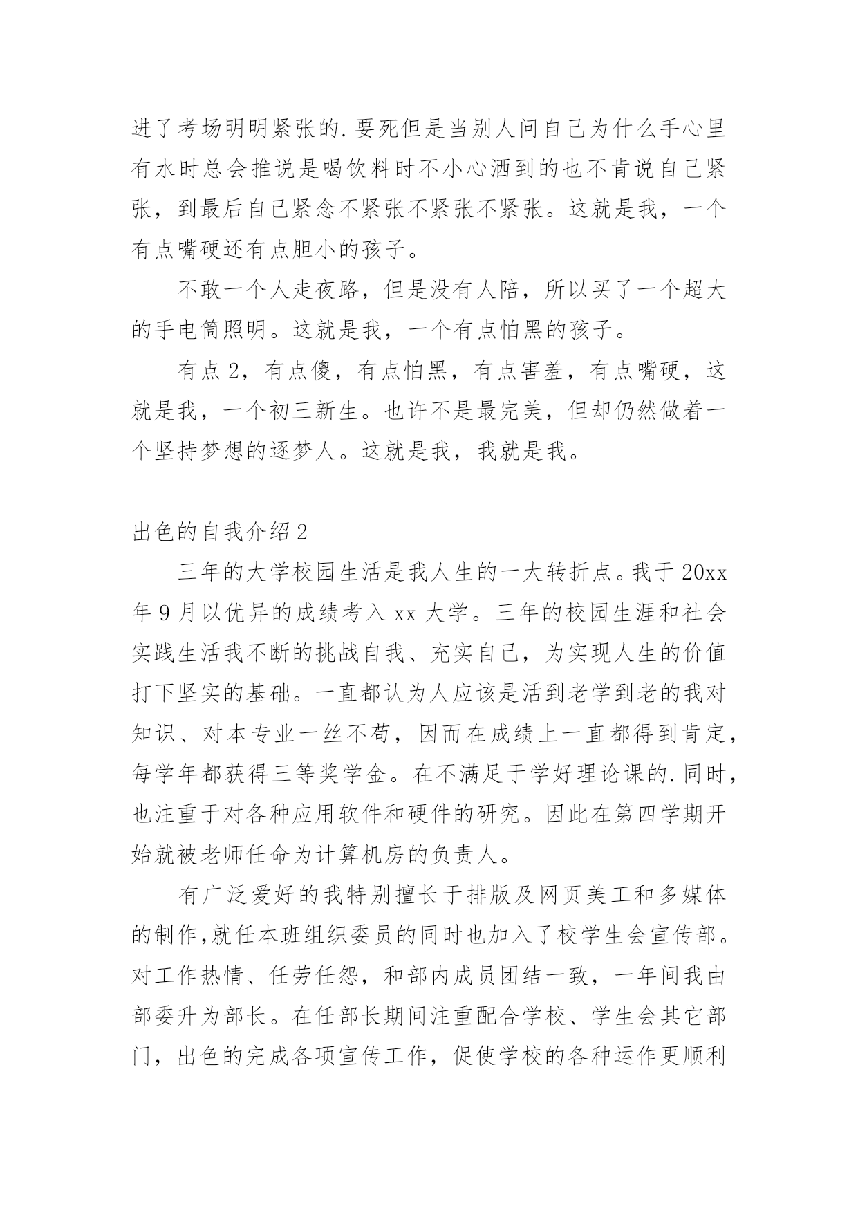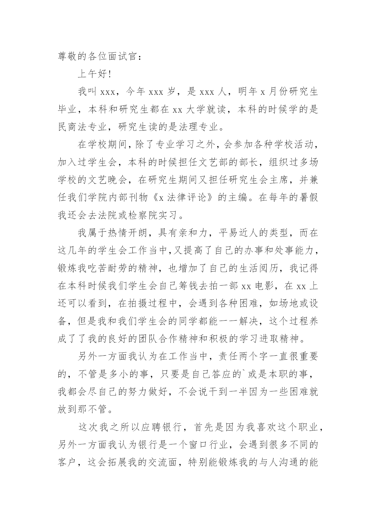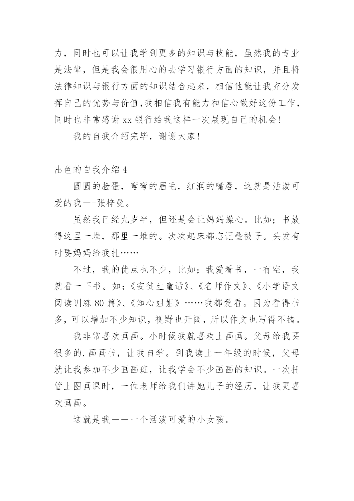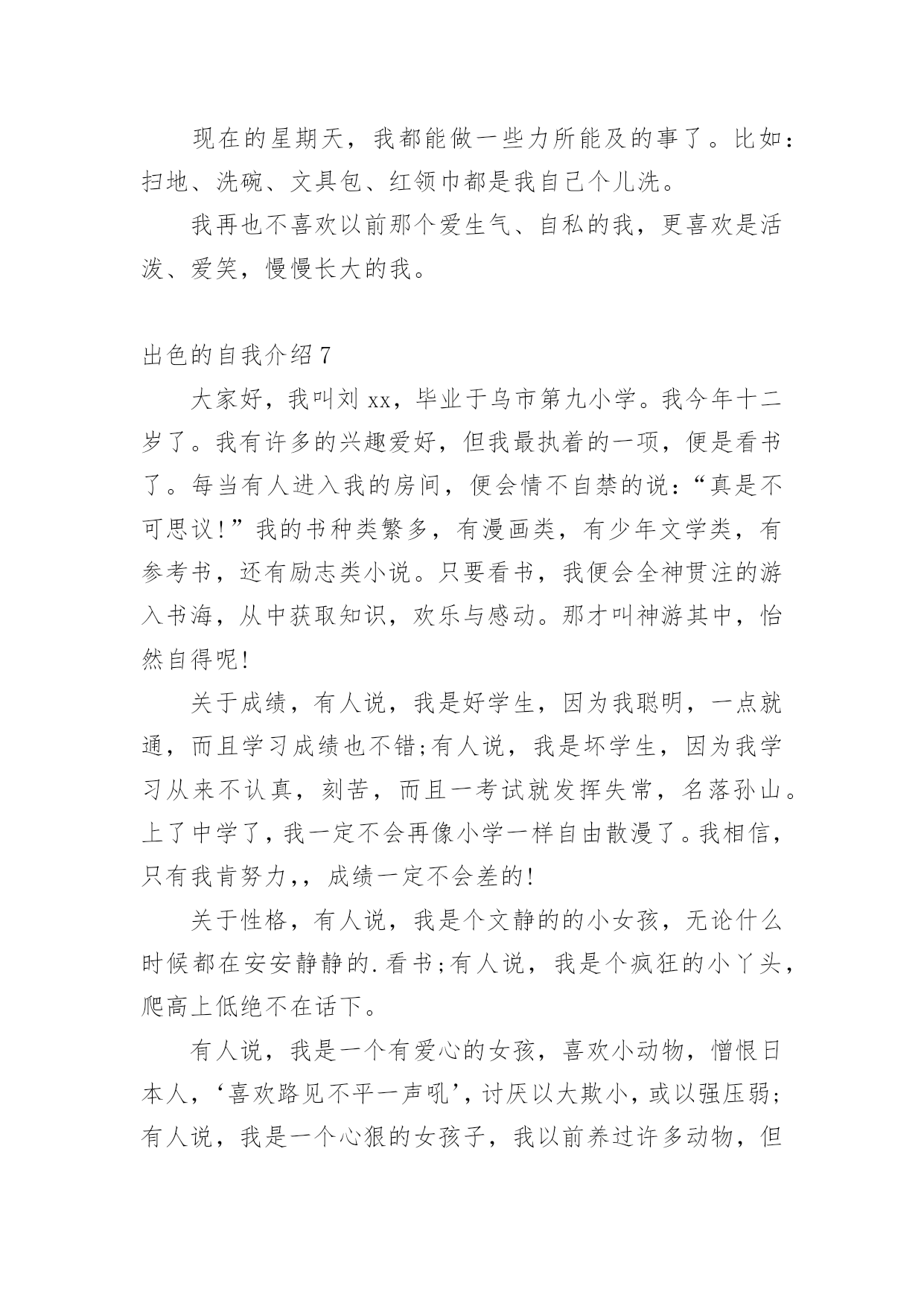 出色的自我介绍出色的自我介绍15篇处在一个陌生场合时,常常需要我们进行自我介绍,通过自我介绍可以让别人认识自己。写自我介绍可不能随随便便哦,下面是小编精心整理的出色的自我介绍,欢迎阅读,希望大家能够喜欢。出色的自我介绍1迎着初生的朝阳,背着大大的书包,在布满花香的湖边小路上一边吃着面包一边听者单词脚下还在奋力的奔跑。这就是我,一个家住的离学校比较远每天早上只能早点出门的初三新生。梳着长长的马尾辫,带着一副度数不算太大的紫框眼睛,穿着还算是即整洁又整齐的校服,脚上穿上一双不是名牌但却恨舒适的帆布鞋。这就是我,一个普普通通的即将面临中考的初三新生。教室在三楼但每天中午放学都会爬上四楼,去扶着腿上有着一点点小毛病的朋友回家。明明已经到了家门口却不上楼,把她送回家了之后自己在一个人回家。还免不了被奶奶说,虽然经常想着不要在送她到家了,可是一听到放学铃就会义无反顾的冲上楼去。这就是我,有一点点2的烂好人。每次考试前都会去买一杯红茶,一边喝一边在看一遍书。进了考场明明紧张的.要死但是当别人问自己为什么手心里有水时总会推说是喝饮料时不小心洒到的也不肯说自己紧张,到最后自己紧念不紧张不紧张不紧张。这就是我,一个有点嘴硬还有点胆小的孩子。不敢一个人走夜路,但是没有人陪,所以买了一个超大的手电筒照明。这就是我,一个有点怕黑的孩子。有点2,有点傻,有点怕黑,有点害羞,有点嘴硬,这就是我,一个初三新生。也许不是最完美,但却仍然做着一个坚持梦想的逐梦人。这就是我,我就是我。出色的自我介绍2三年的大学校园生活是我人生的一大转折点。我于20xx年9月以优异的成绩考入xx大学。三年的校园生涯和社会实践生活我不断的挑战自我、充实自己,为实现人生的价值打下坚实的基础。一直都认为人应该是活到老学到老的我对知识、对本专业一丝不苟,因而在成绩上一直都得到肯定,每学年都获得三等奖学金。在不满足于学好理论课的.同时,也注重于对各种应用软件和硬件的研究。因此在第四学期开始就被老师任命为计算机房的负责人。有广泛爱好的我特别擅长于排版及网页美工和多媒体的制作,就任本班组织委员的同时也加入了校学生会宣传部。对工作热情、任劳任怨,和部内成员团结一致,一年间我由部委升为部长。在任部长期间注重配合学校、学生会其它部门,出色的完成各项宣传工作,促使学校的各种运作更顺利的同时行。学校的各种活动都热情的参加,在20xx年至20xx年间获校文娱比赛及知识问答比赛等一等奖。大胆创新对校报版面进行改革,使得校报的收视率提高到一个层次。学校的各种活动都热情的参加,在20xx年xx月获校演讲比赛一等奖。身为学生的我在修好学业的同时也注重于对社会的实践。本着学以致用,实践结合理论发挥20xx年暑假我以熟练的计算机技术应聘入XX电脑公司技术部任技术员兼培训部教师。20xx年暑假我在xxx印刷公司学习名片和小型广告、商标设计,自身对这方面有坚实基础和浓厚兴趣的我,用一周时间就熟练了各样设计软件,之后做出了大量出色的设计方案,得到同学及老师的一致好评。本人具有热爱祖国等优良传统,积极向上的生活态度和广泛的兴趣爱好,对工作责任心强、勤恳踏实,有较强的组织、宣传能力,有一定的艺术细胞和创意,注重团队合作精神和集体观念。作为一名即将毕业的应届大学生,我所拥有的是年轻和知识,使我不畏困难,善于思考,但年轻也意味着阅历浅,更需要虚心向学。同时,我也深知,毕业只是求学的一小步,社会才是一所真正的大学。我今天的求职,也正是希望得到一个更好的学习机会,从而能以更好的工作成绩为国家和单位贡献力量,同时去实现人生价值。出色的自我介绍3尊敬的各位面试官:上午好!我叫xxx,今年xxx岁,是xxx人,明年x月份研究生毕业,本科和研究生都在xx大学就读,本科的时候学的是民商法专业,研究生读的是法理专业。在学校期间,除了专业学习之外,会参加各种学校活动,加入过学生会,本科的时候担任文艺部的部长,组织过多场学校的文艺晚会,在研究生期间又担任研究生会主席,并兼任我们学院内部刊物《x法律评论》的主编。在每年的暑假我还会去法院或检察院实习。我属于热情开朗,具有亲和力,平易近人的类型,而在这几年的学生会工作当中,又提高了自己的办事和处事能力,锻炼我吃苦耐劳的精神,也增加了自己的生活阅历,我记得在本科时候我们学生会自己筹钱去拍一部xx电影,在xx上还可以看到,在拍摄过程中,会遇到各种困难,如场地或设备,但是我和我们学生会的同学都能一一解决,这个过程养成了了我的良好的团队合作精神和积极的学习进取精神。另外一方面我认为在工作当中,责任两个字一直很重要的,不管是多小的事,只要是自己答应的`或是本职的事,我都会尽自己的努力做好,不会说干到一半因为一些困难就放到那不管。这次我之所以应聘银行,首先是因为我喜欢这个职业,另外一方面我认为银行是一个窗口行业,会