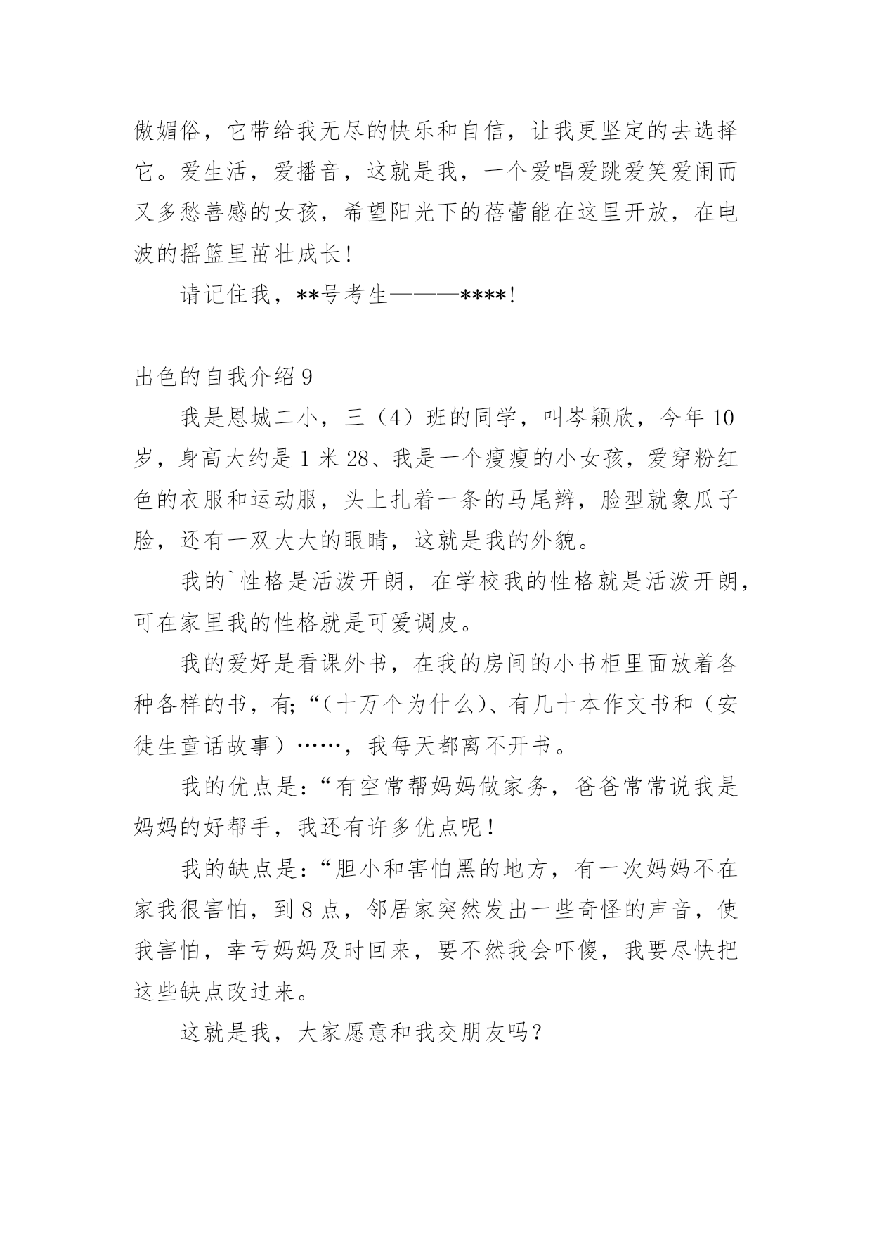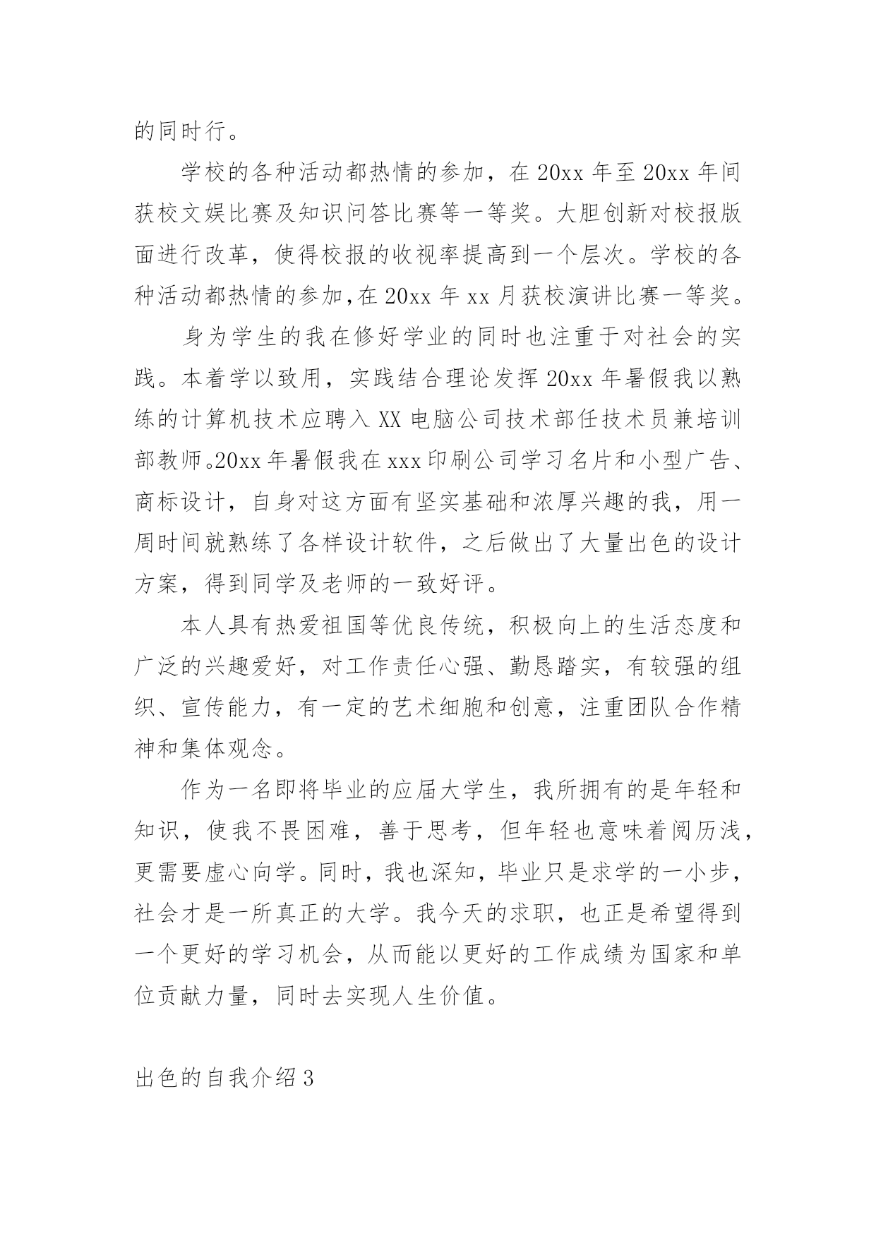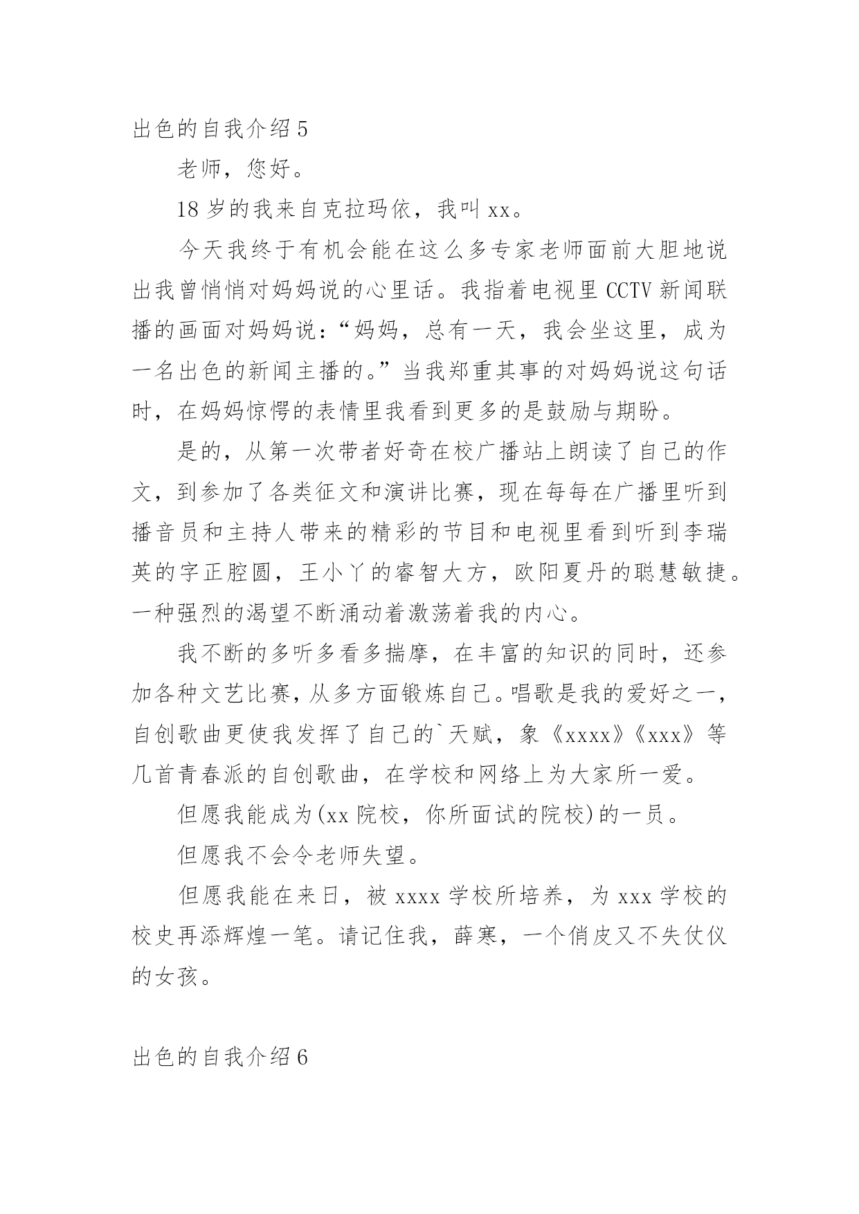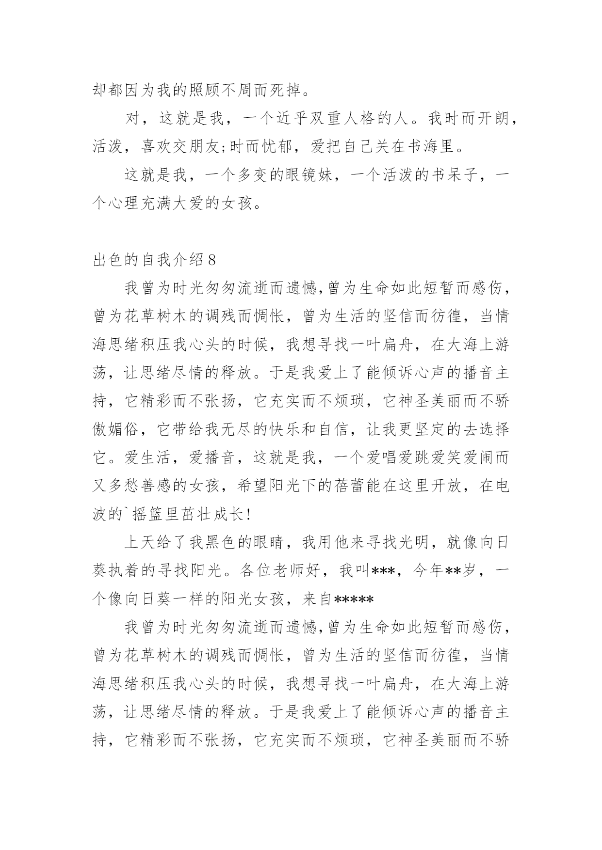 出色的自我介绍出色的自我介绍15篇处在一个陌生场合时,常常需要我们进行自我介绍,通过自我介绍可以让别人认识自己。写自我介绍可不能随随便便哦,下面是小编精心整理的出色的自我介绍,欢迎阅读,希望大家能够喜欢。出色的自我介绍1迎着初生的朝阳,背着大大的书包,在布满花香的湖边小路上一边吃着面包一边听者单词脚下还在奋力的奔跑。这就是我,一个家住的离学校比较远每天早上只能早点出门的初三新生。梳着长长的马尾辫,带着一副度数不算太大的紫框眼睛,穿着还算是即整洁又整齐的校服,脚上穿上一双不是名牌但却恨舒适的帆布鞋。这就是我,一个普普通通的即将面临中考的初三新生。教室在三楼但每天中午放学都会爬上四楼,去扶着腿上有着一点点小毛病的朋友回家。明明已经到了家门口却不上楼,把她送回家了之后自己在一个人回家。还免不了被奶奶说,虽然经常想着不要在送她到家了,可是一听到放学铃就会义无反顾的冲上楼去。这就是我,有一点点2的烂好人。每次考试前都会去买一杯红茶,一边喝一边在看一遍书。进了考场明明紧张的.要死但是当别人问自己为什么手心里有水时总会推说是喝饮料时不小心洒到的也不肯说自己紧张,到最后自己紧念不紧张不紧张不紧张。这就是我,一个有点嘴硬还有点胆小的孩子。不敢一个人走夜路,但是没有人陪,所以买了一个超大的手电筒照明。这就是我,一个有点怕黑的孩子。有点2,有点傻,有点怕黑,有点害羞,有点嘴硬,这就是我,一个初三新生。也许不是最完美,但却仍然做着一个坚持梦想的逐梦人。这就是我,我就是我。出色的自我介绍2三年的大学校园生活是我人生的一大转折点。我于20xx年9月以优异的成绩考入xx大学。三年的校园生涯和社会实践生活我不断的挑战自我、充实自己,为实现人生的价值打下坚实的基础。一直都认为人应该是活到老学到老的我对知识、对本专业一丝不苟,因而在成绩上一直都得到肯定,每学年都获得三等奖学金。在不满足于学好理论课的.同时,也注重于对各种应用软件和硬件的研究。因此在第四学期开始就被老师任命为计算机房的负责人。有广泛爱好的我特别擅长于排版及网页美工和多媒体的制作,就任本班组织委员的同时也加入了校学生会宣传部。对工作热情、任劳任怨,和部内成员团结一致,一年间我由部委升为部长。在任部长期间注重配合学校、学生会其它部门,出色的完成各项宣传工作,促使学校的各种运作更顺利的同时行。学校的各种活动都热情的参加,在20xx年至20xx年间获校文娱比赛及知识问答比赛等一等奖。大胆创新对校报版面进行改革,使得校报的收视率提高到一个层次。学校的各种活动都热情的参加,在20xx年xx月获校演讲比赛一等奖。身为学生的我在修好学业的同时也注重于对社会的实践。本着学以致用,实践结合理论发挥20xx年暑假我以熟练的计算机技术应聘入XX电脑公司技术部任技术员兼培训部教师。20xx年暑假我在xxx印刷公司学习名片和小型广告、商标设计,自身对这方面有坚实基础和浓厚兴趣的我,用一周时间就熟练了各样设计软件,之后做出了大量出色的设计方案,得到同学及老师的一致好评。本人具有热爱祖国等优良传统,积极向上的生活态度和广泛的兴趣爱好,对工作责任心强、勤恳踏实,有较强的组织、宣传能力,有一定的艺术细胞和创意,注重团队合作精神和集体观念。作为一名即将毕业的应届大学生,我所拥有的是年轻和知识,使我不畏困难,善于思考,但年轻也意味着阅历浅,更需要虚心向学。同时,我也深知,毕业只是求学的一小步,社会才是一所真正的大学。我今天的求职,也正是希望得到一个更好的学习机会,从而能以更好的工作成绩为国家和单位贡献力量,同时去实现人生价值。出色的自我介绍3尊敬的各位面试官:上午好!我叫xxx,今年xxx岁,是xxx人,明年x月份研究生毕业,本科和研究生都在xx大学就读,本科的时候学的是民商法专业,研究生读的是法理专业。在学校期间,除了专业学习之外,会参加各种学校活动,加入过学生会,本科的时候担任文艺部的部长,组织过多场学校的文艺晚会,在研究生期间又担任研究生会主席,并兼任我们学院内部刊物《x法律评论》的主编。在每年的暑假我还会去法院或检察院实习。我属于热情开朗,具有亲和力,平易近人的类型,而在这几年的学生会工作当中,又提高了自己的办事和处事能力,锻炼我吃苦耐劳的精神,也增加了自己的生活阅历,我记得在本科时候我们学生会自己筹钱去拍一部xx电影,在xx上还可以看到,在拍摄过程中,会遇到各种困难,如场地或设备,但是我和我们学生会的同学都能一一解决,这个过程养成了了我的良好的团队合作精神和积极的学习进取精神。另外一方面我认为在工作当中,责任两个字一直很重要的,不管是多小的事,只要是自己答应的`或是本职的事,我都会尽自己的努力做好,不会说干到一半因为一些困难就放到那不管。这次我之所以应聘银行,首先是因为我喜欢这个职业,另外一方面我认为银行是一个窗口行业,会
