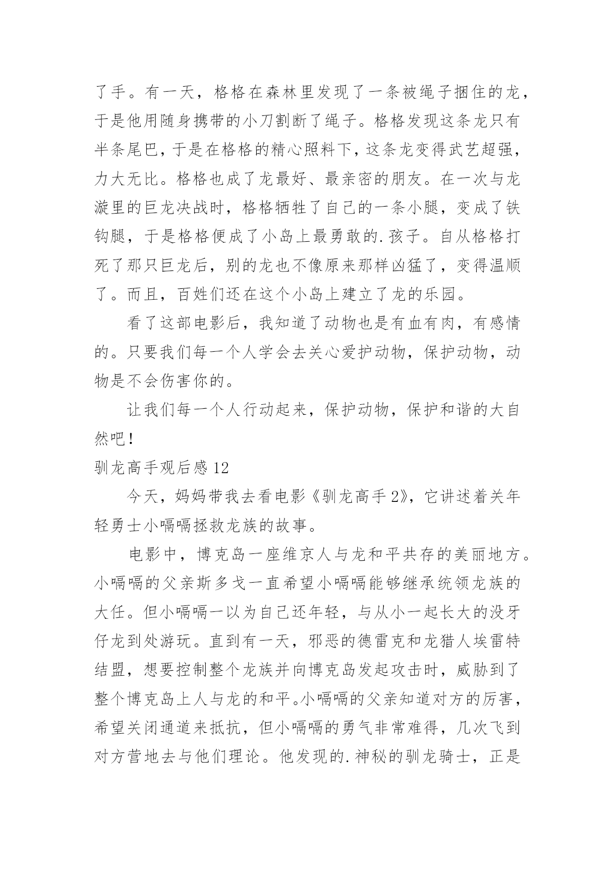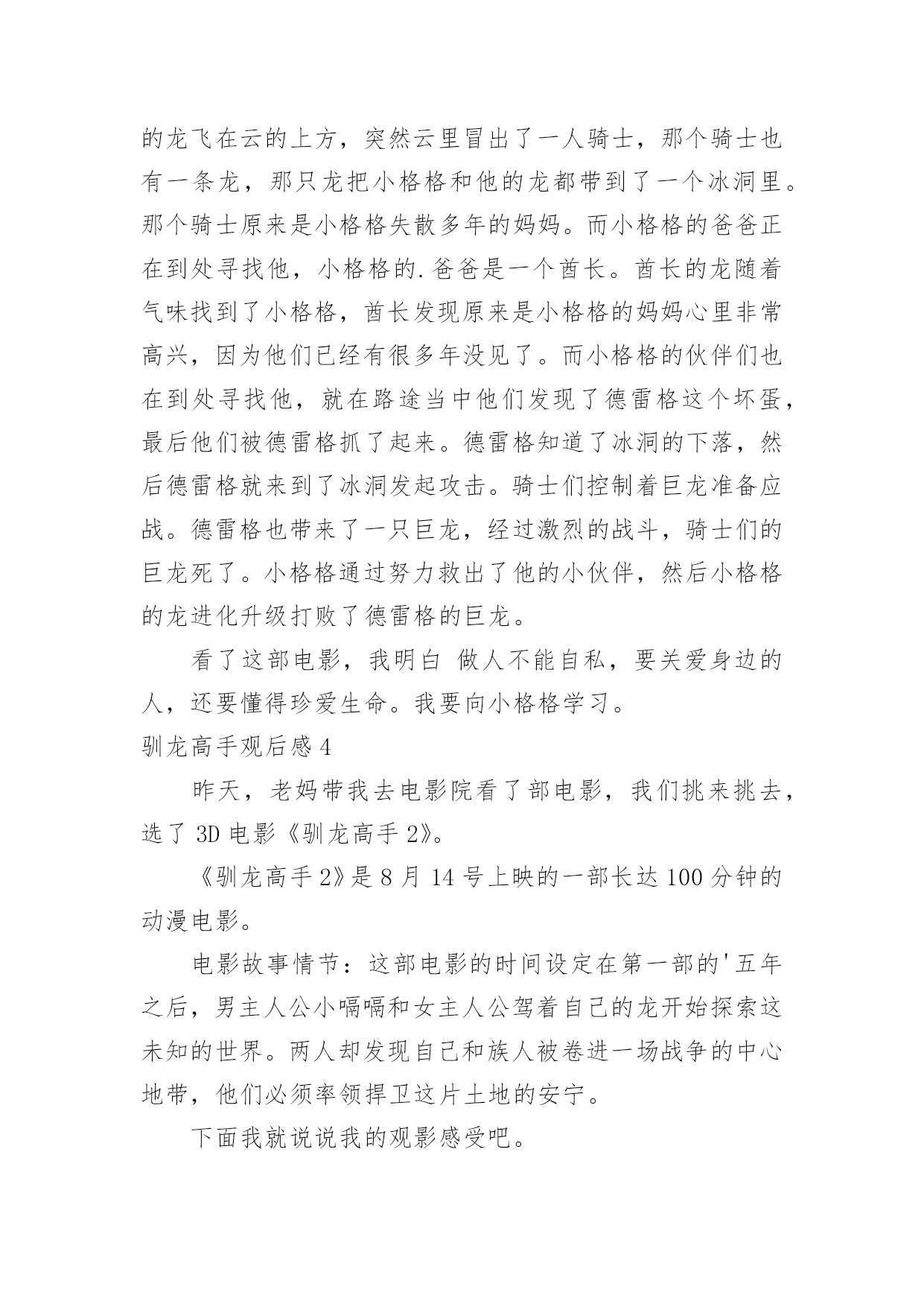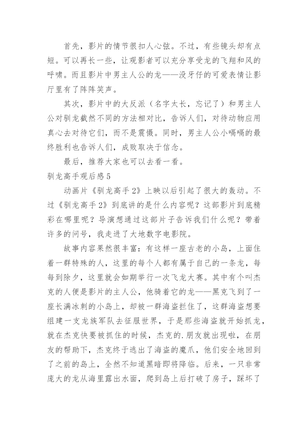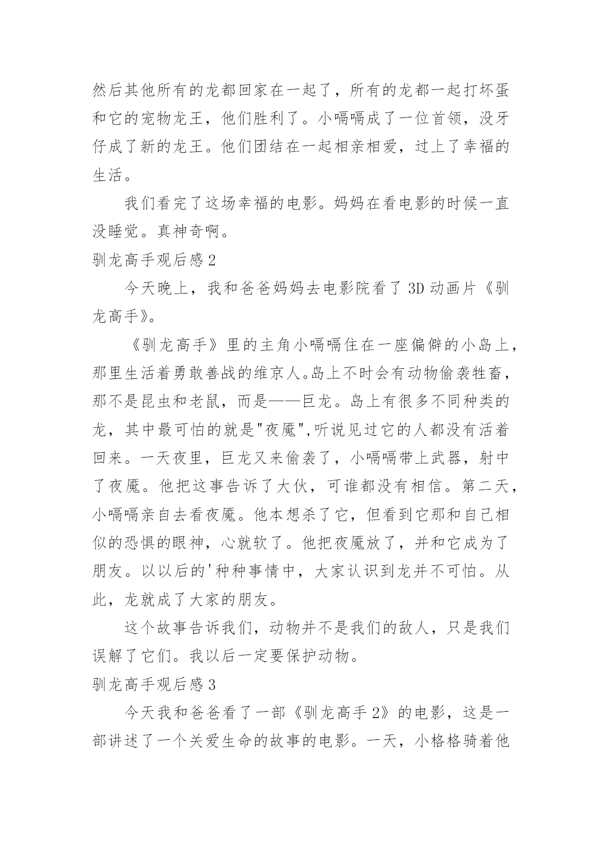 驯龙高手观后感驯龙高手观后感集合15篇看完一部作品后,一定对生活有了新的感悟和看法吧,现在就让我们写一篇走心的观后感吧。千万不能认为观后感随便应付就可以,下面是小编整理的驯龙高手观后感,仅供参考,欢迎大家阅读。驯龙高手观后感1今天,妈妈带我去看电影了。电影的题目是《驯龙高手2》。主人公小嗝嗝和它的龙没牙仔越来越相爱了,小嗝嗝在冰洞上遇见了自己的亲生的妈妈。妈妈也是驯龙高手,妈妈用温柔的爱来驯龙。那里是一片美丽的净土,所有的龙都相亲相爱,小的龙都有点调皮捣蛋。好的龙王保护他们。然后发生了一场战争,坏蛋用意念控制了没牙仔,坏蛋的宠物是另一只龙王,两个龙王打起来了,坏蛋龙王打死了好龙王。并且控制了所有的龙。坏蛋的龙王利用没牙仔把小嗝嗝的爸爸杀死了。小嗝嗝非常伤心难过,并且把爸爸给火葬了。小嗝嗝的妈妈也很伤心。并且安慰了小嗝嗝。小嗝嗝选择相信没牙仔,用爱挽回了没牙仔的善良,主人公始终相信所有的龙斗士充满着善良和爱还有温暖关怀。小嗝嗝用小的龙打坏龙王。小的龙太小了,不受坏龙王的`控制。小嗝嗝用爱的意念补回了没牙仔,然后其他所有的龙都回家在一起了,所有的龙都一起打坏蛋和它的宠物龙王,他们胜利了。小嗝嗝成了一位首领,没牙仔成了新的龙王。他们团结在一起相亲相爱,过上了幸福的生活。我们看完了这场幸福的电影。妈妈在看电影的时候一直没睡觉。真神奇啊。驯龙高手观后感2今天晚上,我和爸爸妈妈去电影院看了3D动画片《驯龙高手》。《驯龙高手》里的主角小嗝嗝住在一座偏僻的小岛上,那里生活着勇敢善战的维京人。岛上不时会有动物偷袭牲畜,那不是昆虫和老鼠,而是——巨龙。岛上有很多不同种类的龙,其中最可怕的就是"夜魇",听说见过它的人都没有活着回来。一天夜里,巨龙又来偷袭了,小嗝嗝带上武器,射中了夜魇。他把这事告诉了大伙,可谁都没有相信。第二天,小嗝嗝亲自去看夜魇。他本想杀了它,但看到它那和自己相似的恐惧的眼神,心就软了。他把夜魇放了,并和它成为了朋友。以以后的'种种事情中,大家认识到龙并不可怕。从此,龙就成了大家的朋友。这个故事告诉我们,动物并不是我们的敌人,只是我们误解了它们。我以后一定要保护动物。驯龙高手观后感3今天我和爸爸看了一部《驯龙高手2》的电影,这是一部讲述了一个关爱生命的故事的电影。一天,小格格骑着他的龙飞在云的上方,突然云里冒出了一人骑士,那个骑士也有一条龙,那只龙把小格格和他的龙都带到了一个冰洞里。那个骑士原来是小格格失散多年的妈妈。而小格格的爸爸正在到处寻找他,小格格的.爸爸是一个酋长。酋长的龙随着气味找到了小格格,酋长发现原来是小格格的妈妈心里非常高兴,因为他们已经有很多年没见了。而小格格的伙伴们也在到处寻找他,就在路途当中他们发现了德雷格这个坏蛋,最后他们被德雷格抓了起来。德雷格知道了冰洞的下落,然后德雷格就来到了冰洞发起攻击。骑士们控制着巨龙准备应战。德雷格也带来了一只巨龙,经过激烈的战斗,骑士们的巨龙死了。小格格通过努力救出了他的小伙伴,然后小格格的龙进化升级打败了德雷格的巨龙。看了这部电影,我明白做人不能自私,要关爱身边的人,还要懂得珍爱生命。我要向小格格学习。驯龙高手观后感4昨天,老妈带我去电影院看了部电影,我们挑来挑去,选了3D电影《驯龙高手2》。《驯龙高手2》是8月14号上映的一部长达100分钟的动漫电影。电影故事情节:这部电影的时间设定在第一部的'五年之后,男主人公小嗝嗝和女主人公驾着自己的龙开始探索这未知的世界。两人却发现自己和族人被卷进一场战争的中心地带,他们必须率领捍卫这片土地的安宁。下面我就说说我的观影感受吧。首先,影片的情节很扣人心弦。不过,有些镜头却有点短。可以再长一些,让观影者可以充分享受龙的飞翔和风的呼啸。而且影片中男主人公的龙——没牙仔的可爱表情让影厅里有了阵阵笑声。其次,影片中的大反派(名字太长,忘记了)和男主人公对驯龙截然不同的方法相对比,告诉人们,对待动物应用真心去对待它们,而不是震慑。同时,男主人公小嗝嗝的最终胜利也告诉人们,成败取决于信念。最后,推荐大家也可以去看一看。驯龙高手观后感5动画片《驯龙高手2》上映以后引起了很大的轰动。不过《驯龙高手2》到底讲的是什么内容呢?这部影片到底精彩在哪里呢?导演想通过这部片子告诉我们什么呢?带着许多的问号,我走进了大地数字电影院。故事内容果然很丰富:有这样一座古老的小岛,上面住着一群特殊的人,这里的每个人都有属于自己的一条龙,每每到除夕,这里就会如期举行一次飞龙大赛。其中有个叫杰克的人便是影片的主人公,他骑着它的龙——黑克飞到了一座长满冰刺的小岛上,却被一群海盗拦住了,这群海盗想要组建一支龙族军队去征服世界,于是那些海盗就开始抓龙,就在杰克快要被抓住的时候,杰克的.朋友就出现啦,在朋友的帮助下,杰克终于逃出了海盗的魔爪,他们安全地回到了之前的岛上,全然不知道
