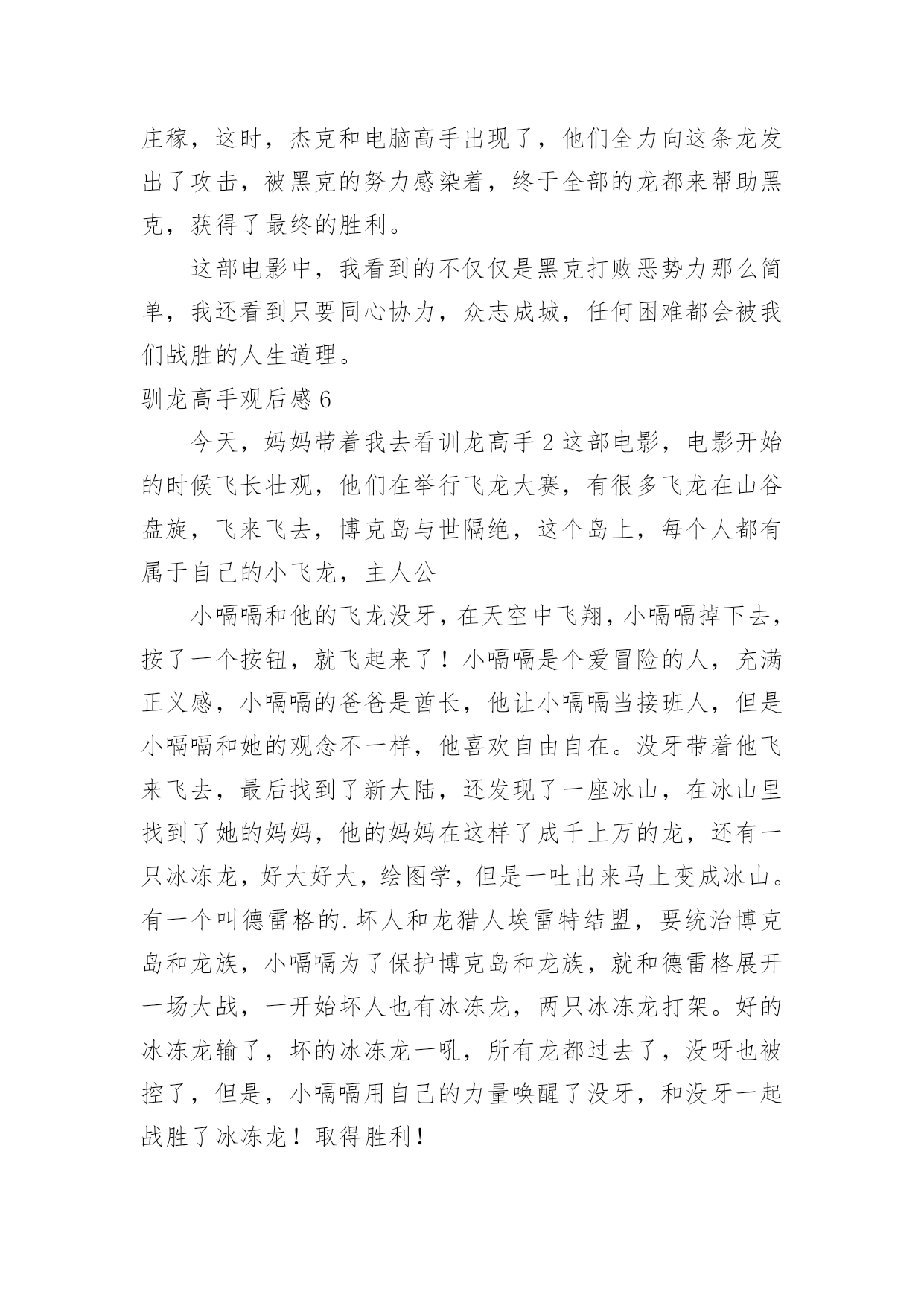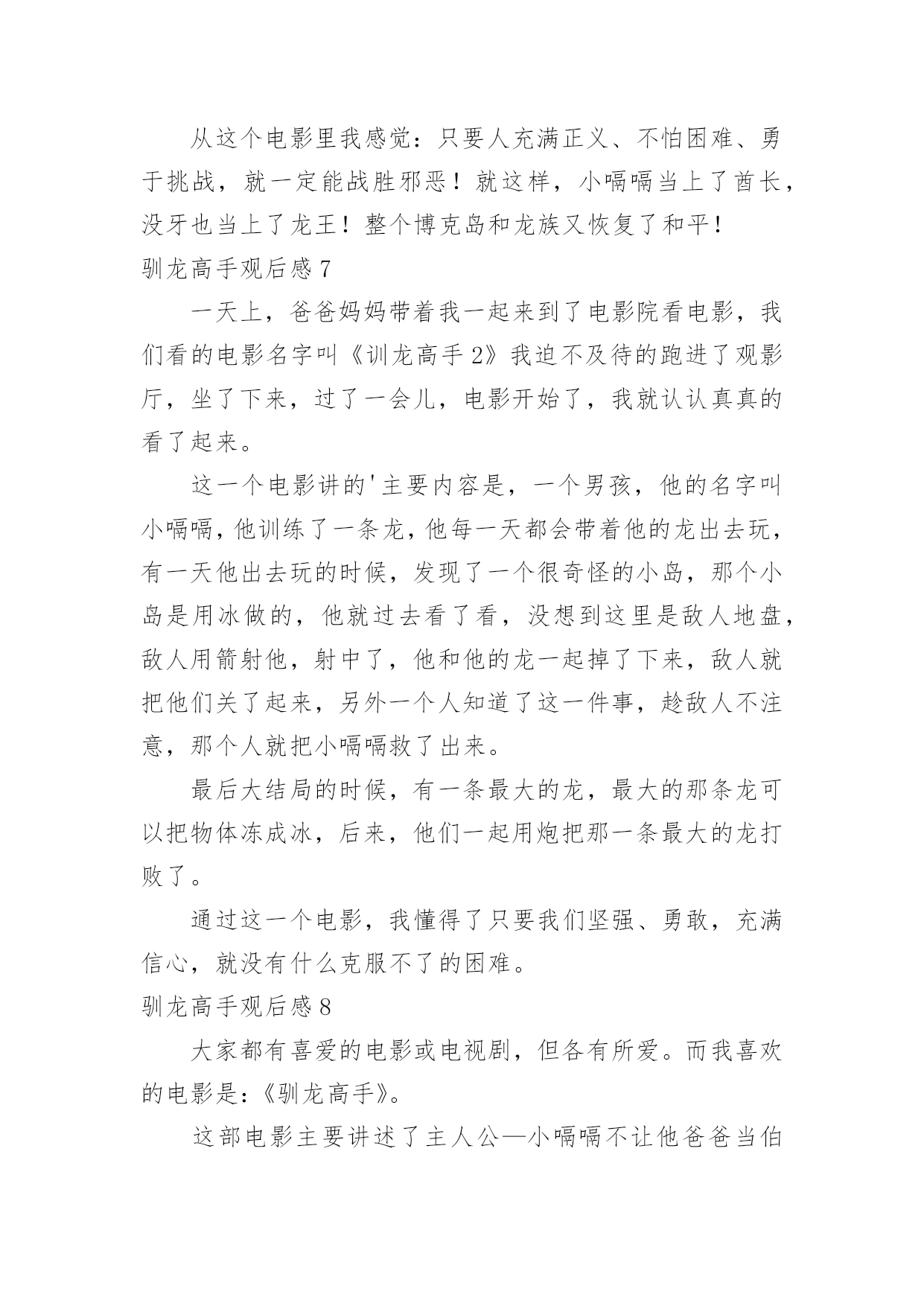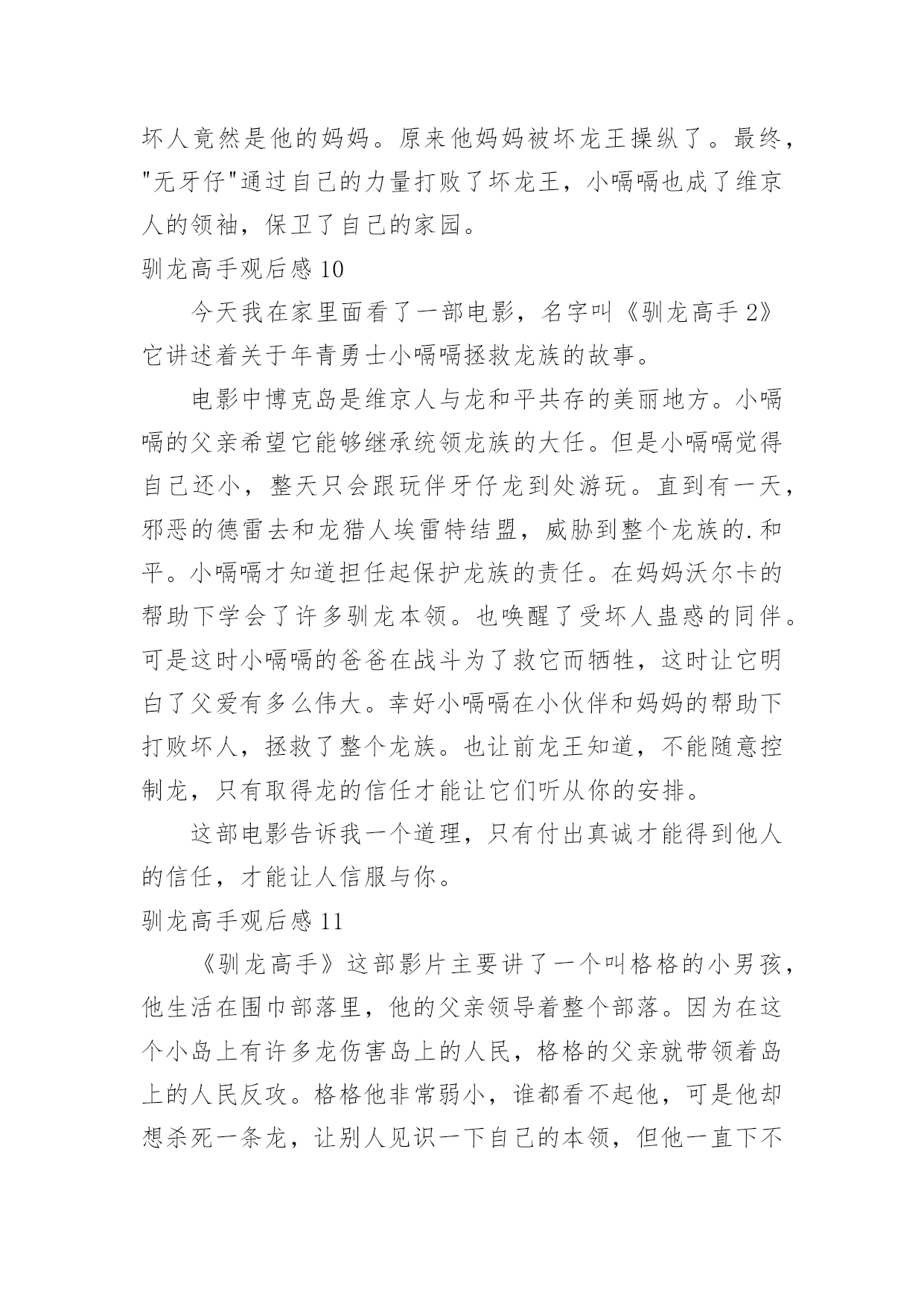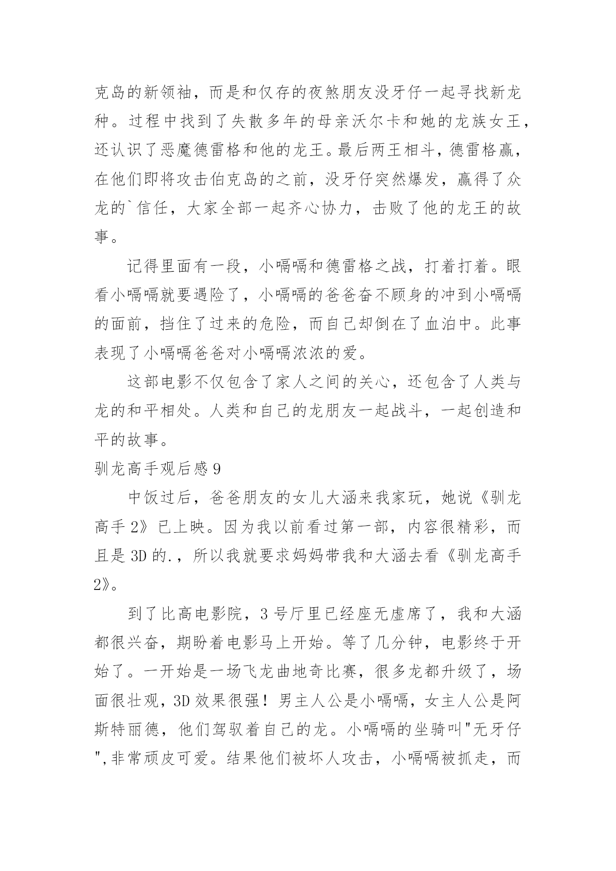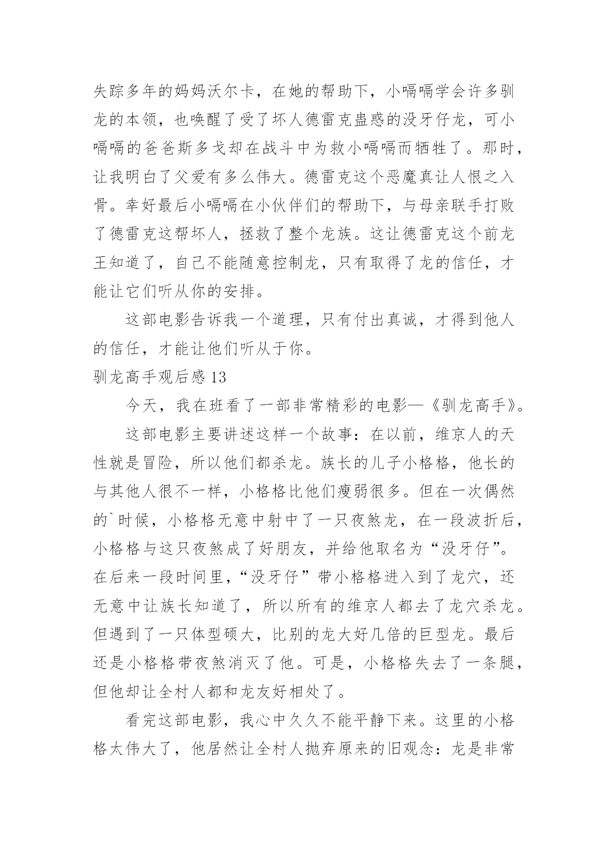 驯龙高手观后感驯龙高手观后感集合15篇看完一部作品后,一定对生活有了新的感悟和看法吧,现在就让我们写一篇走心的观后感吧。千万不能认为观后感随便应付就可以,下面是小编整理的驯龙高手观后感,仅供参考,欢迎大家阅读。驯龙高手观后感1今天,妈妈带我去看电影了。电影的题目是《驯龙高手2》。主人公小嗝嗝和它的龙没牙仔越来越相爱了,小嗝嗝在冰洞上遇见了自己的亲生的妈妈。妈妈也是驯龙高手,妈妈用温柔的爱来驯龙。那里是一片美丽的净土,所有的龙都相亲相爱,小的龙都有点调皮捣蛋。好的龙王保护他们。然后发生了一场战争,坏蛋用意念控制了没牙仔,坏蛋的宠物是另一只龙王,两个龙王打起来了,坏蛋龙王打死了好龙王。并且控制了所有的龙。坏蛋的龙王利用没牙仔把小嗝嗝的爸爸杀死了。小嗝嗝非常伤心难过,并且把爸爸给火葬了。小嗝嗝的妈妈也很伤心。并且安慰了小嗝嗝。小嗝嗝选择相信没牙仔,用爱挽回了没牙仔的善良,主人公始终相信所有的龙斗士充满着善良和爱还有温暖关怀。小嗝嗝用小的龙打坏龙王。小的龙太小了,不受坏龙王的`控制。小嗝嗝用爱的意念补回了没牙仔,然后其他所有的龙都回家在一起了,所有的龙都一起打坏蛋和它的宠物龙王,他们胜利了。小嗝嗝成了一位首领,没牙仔成了新的龙王。他们团结在一起相亲相爱,过上了幸福的生活。我们看完了这场幸福的电影。妈妈在看电影的时候一直没睡觉。真神奇啊。驯龙高手观后感2今天晚上,我和爸爸妈妈去电影院看了3D动画片《驯龙高手》。《驯龙高手》里的主角小嗝嗝住在一座偏僻的小岛上,那里生活着勇敢善战的维京人。岛上不时会有动物偷袭牲畜,那不是昆虫和老鼠,而是——巨龙。岛上有很多不同种类的龙,其中最可怕的就是"夜魇",听说见过它的人都没有活着回来。一天夜里,巨龙又来偷袭了,小嗝嗝带上武器,射中了夜魇。他把这事告诉了大伙,可谁都没有相信。第二天,小嗝嗝亲自去看夜魇。他本想杀了它,但看到它那和自己相似的恐惧的眼神,心就软了。他把夜魇放了,并和它成为了朋友。以以后的'种种事情中,大家认识到龙并不可怕。从此,龙就成了大家的朋友。这个故事告诉我们,动物并不是我们的敌人,只是我们误解了它们。我以后一定要保护动物。驯龙高手观后感3今天我和爸爸看了一部《驯龙高手2》的电影,这是一部讲述了一个关爱生命的故事的电影。一天,小格格骑着他的龙飞在云的上方,突然云里冒出了一人骑士,那个骑士也有一条龙,那只龙把小格格和他的龙都带到了一个冰洞里。那个骑士原来是小格格失散多年的妈妈。而小格格的爸爸正在到处寻找他,小格格的.爸爸是一个酋长。酋长的龙随着气味找到了小格格,酋长发现原来是小格格的妈妈心里非常高兴,因为他们已经有很多年没见了。而小格格的伙伴们也在到处寻找他,就在路途当中他们发现了德雷格这个坏蛋,最后他们被德雷格抓了起来。德雷格知道了冰洞的下落,然后德雷格就来到了冰洞发起攻击。骑士们控制着巨龙准备应战。德雷格也带来了一只巨龙,经过激烈的战斗,骑士们的巨龙死了。小格格通过努力救出了他的小伙伴,然后小格格的龙进化升级打败了德雷格的巨龙。看了这部电影,我明白做人不能自私,要关爱身边的人,还要懂得珍爱生命。我要向小格格学习。驯龙高手观后感4昨天,老妈带我去电影院看了部电影,我们挑来挑去,选了3D电影《驯龙高手2》。《驯龙高手2》是8月14号上映的一部长达100分钟的动漫电影。电影故事情节:这部电影的时间设定在第一部的'五年之后,男主人公小嗝嗝和女主人公驾着自己的龙开始探索这未知的世界。两人却发现自己和族人被卷进一场战争的中心地带,他们必须率领捍卫这片土地的安宁。下面我就说说我的观影感受吧。首先,影片的情节很扣人心弦。不过,有些镜头却有点短。可以再长一些,让观影者可以充分享受龙的飞翔和风的呼啸。而且影片中男主人公的龙——没牙仔的可爱表情让影厅里有了阵阵笑声。其次,影片中的大反派(名字太长,忘记了)和男主人公对驯龙截然不同的方法相对比,告诉人们,对待动物应用真心去对待它们,而不是震慑。同时,男主人公小嗝嗝的最终胜利也告诉人们,成败取决于信念。最后,推荐大家也可以去看一看。驯龙高手观后感5动画片《驯龙高手2》上映以后引起了很大的轰动。不过《驯龙高手2》到底讲的是什么内容呢?这部影片到底精彩在哪里呢?导演想通过这部片子告诉我们什么呢?带着许多的问号,我走进了大地数字电影院。故事内容果然很丰富:有这样一座古老的小岛,上面住着一群特殊的人,这里的每个人都有属于自己的一条龙,每每到除夕,这里就会如期举行一次飞龙大赛。其中有个叫杰克的人便是影片的主人公,他骑着它的龙——黑克飞到了一座长满冰刺的小岛上,却被一群海盗拦住了,这群海盗想要组建一支龙族军队去征服世界,于是那些海盗就开始抓龙,就在杰克快要被抓住的时候,杰克的.朋友就出现啦,在朋友的帮助下,杰克终于逃出了海盗的魔爪,他们安全地回到了之前的岛上,全然不知道