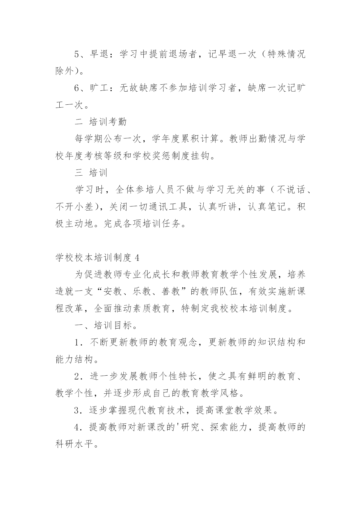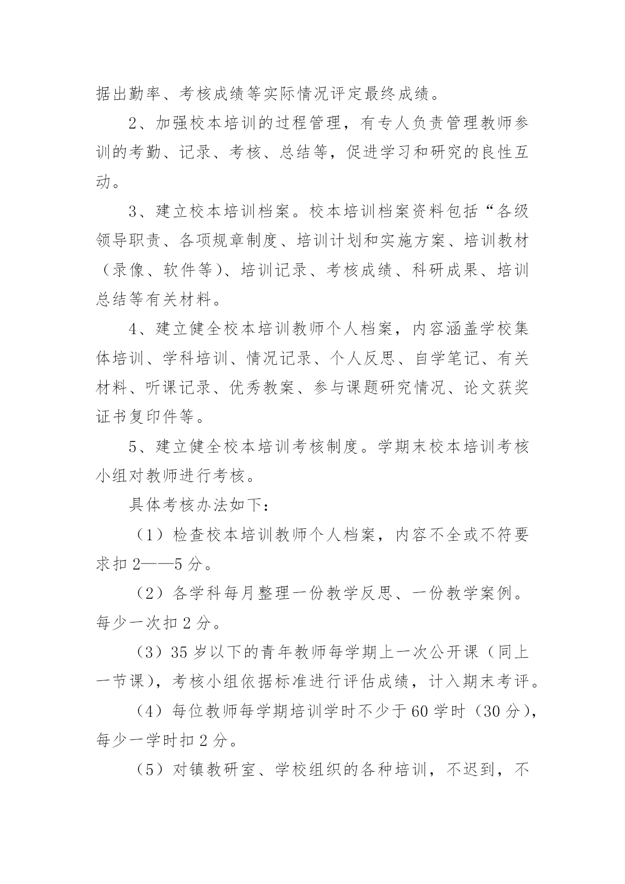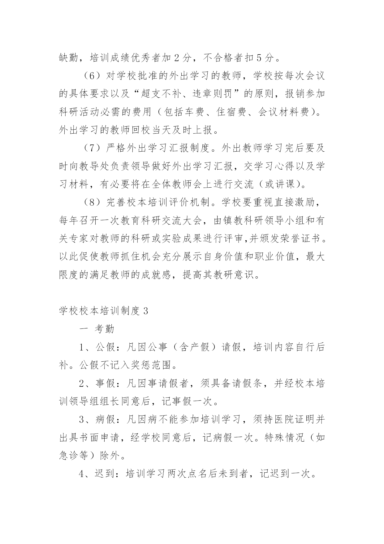 学校校本培训制度在学习、工作、生活中,制度在生活中的使用越来越广泛,制度是在一定历史条件下形成的法令、礼俗等规范。那么拟定制度真的很难吗?以下是小编帮大家整理的学校校本培训制度,供大家参考借鉴,希望可以帮助到有需要的朋友。学校校本培训制度1依据市教育局《关于进一步推进校本培训的若干意见》和永嘉教师进修学校关于《中小学教师继续教育校本培训管理办法》,特制定以下规定:一、机构设立1、成立以校长为第一负责人,校本培训组织机构和专人负责,相关科室主任成员的校本培训领导小组负责总体领导、协调工作。2、学校科研处作为校本培训的组织机构,具体负责校本培训的日常组织、管理工作3、学校其他科室应配合校本培训。4、校本培训的档案有专门收集、整理和归类存档。二、考勤制度1、每次集中培训各位教师应签到。2、在校本培训期间,如有事需提前请假。3、按要求做好培训记录。三、考核制度1、校长办公室做好教师校本培训出勤记录,作为认定学时依据。2、教师培训结束后上交相关记录表、册、学习心得、成果集以及其他作业认定培训学时。3、每学年末进行继续教育校本培训先进教师的`评选。4、校本培训考核合格者按县教育主管部门的规定认定学时。学校校本培训制度2一、指导思想全面贯彻落实《中共中央国务院关于深化教育改革全面推进素质教育决定》和《基础教育改革与发展纲要》的精神,培养造就一支品德高尚、业务精良的师资队伍,深化教育改革,全面推进学校素质教育,培养创新人才。把校本培训作为教师综合素质培训的主阵地,面向全体教师,按需施教,学用结合,注重质量与实效,特制定校本培训制度。二、培训目标1、逐步完善校本培训制度,形成有利于教师专业成长的“培养、培训、管理”一体化的有效运行机制,构建学习化组织。2、继续进行新课程的培训,通过培训,使全体教师具有现代理念,具有较高的教育教学专业水平和驾驭课堂的能力,掌握自主、合作、探究的课堂教学模式。3、继续进行骨干教师评比,做到学科、年龄、知识结构分布合理,使他们成为我镇课堂教学、科研教改的学科带头人。4、全镇教师普遍接受计算机应用能力培训,大部分教师能够开展计算机辅助教学和网络教学,并且充分利用网络自主学习,提升自我。5、通过理论学习和实践研究,把新的发展性评价理念贯穿在日常教育教学行为中去,探索发展性评价模式。6、进行校本课程开发的理论研究和实践,使每位教师真正树立课程开发意识,既是课程的实施者也是开发者。7、引导教师树立终身学习观念,指导教师学会学习,提高教师的实际动手能力和教育创新能力,促进教师自主成长和提高。提高教师的思想道德素质和业务素质,实现学科教学创新、德育工作创新和管理工作创新,适应新课程改革和发展的需要。三、校本培训的主要内容1、结合学校实际,较系统地进行学习教育教学基本理论的培训。2、及时进行新课程培训,解决实践中的问题。3、与时俱进地进行新教育理念培训。4、加强对教师现代教育技术知识的培训,研究学科课程整合问题。5、进行教科研基本知识、方法培训。6、进行德育工作和班主任工作的培训。7、师德培训。通过各种形式加强教师的师德培训,培养一支受学生喜欢、家长放心、品德高尚的师资队伍。四、培训方式1、以学代培大力倡导和鼓励全镇教师以自主学习为主,通过自学不断更新观念,强化内在,更新自己的教育教学方法,自觉学习掌握现代教育教学技术。学校要广泛地通过教师自学、学历达标培训学习以及其他有专业特长培训学习等促进教师素质的不断提高。2、以课代培学校教育教学的主阵地是课堂,让学校教师通过课堂教学实践,锻炼和提高自身素质是十分重要的。抓好新老教师的同上一节课、评课等活动促使教师快速成长。3、以结对代培充分发挥新老教师的特点,达到老带新、新促老、互帮互学、各得其所的目的。对教师新老结对,学校要有明确的目标、要求,要监督结对培训的过程,年终进行检查、评估、验收和奖励。4、以研代培组织教师参加各种教学研究活动,提高教师不断反思、学习、研究的自觉性。要求教师自主自立积极参加课题研究,人人有奋斗的目标。5、以会代培要有计划有层次地组织教师参加校内外各级各类学术研讨会、专题报告会、经验交流会、教学观摩展示会等,促进教师继续学习。在校内要组织教师教学经验交流、课堂教育教学技术展示会等,让教师在交流实践经验、探索方法、交流成果、学习借鉴的基础上进一步激发积极性和创造精神。6、以考察代培学校要有计划有目的.分期分批组织教师外出学习、考察,使教师们眼界开阔、思想解放、观念转变。通过学习、比较,在各个方面为教师提供可借鉴的东西,激发教师自觉学习、研究及实践的积极性,有利于教师结合本人的实际,提出教育教学改革与发展的意见、建议、思路和方法。五、校本培训必须遵循以下原则1、辅导性原则:校本培训的内容必须符合上级教育行政部门的要求,必须对教育教学工作具有指导性,起到导向作用。2