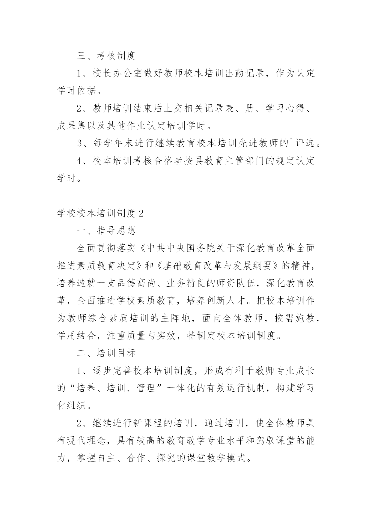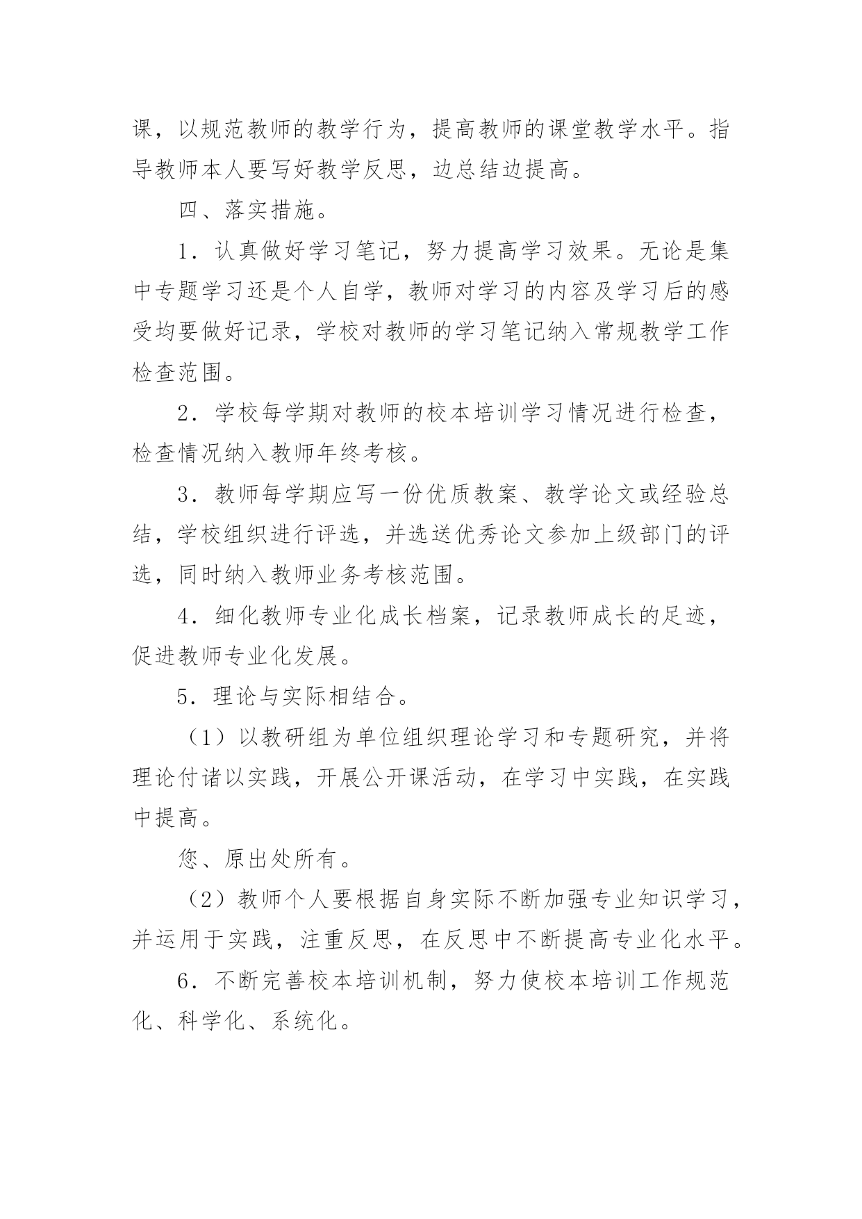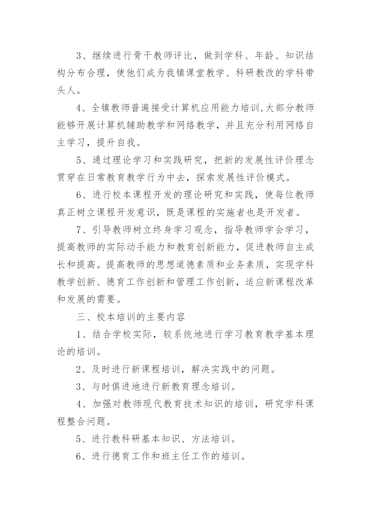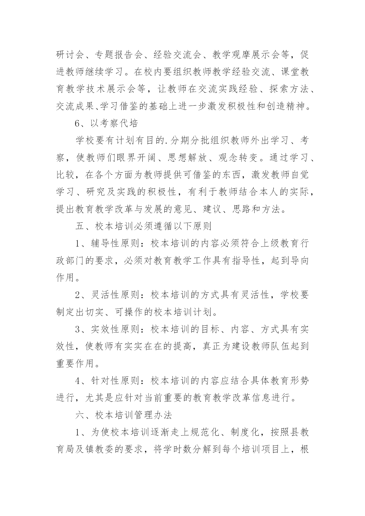 学校校本培训制度在学习、工作、生活中,制度在生活中的使用越来越广泛,制度是在一定历史条件下形成的法令、礼俗等规范。那么拟定制度真的很难吗?以下是小编帮大家整理的学校校本培训制度,供大家参考借鉴,希望可以帮助到有需要的朋友。学校校本培训制度1依据市教育局《关于进一步推进校本培训的若干意见》和永嘉教师进修学校关于《中小学教师继续教育校本培训管理办法》,特制定以下规定:一、机构设立1、成立以校长为第一负责人,校本培训组织机构和专人负责,相关科室主任成员的校本培训领导小组负责总体领导、协调工作。2、学校科研处作为校本培训的组织机构,具体负责校本培训的日常组织、管理工作3、学校其他科室应配合校本培训。4、校本培训的档案有专门收集、整理和归类存档。二、考勤制度1、每次集中培训各位教师应签到。2、在校本培训期间,如有事需提前请假。3、按要求做好培训记录。三、考核制度1、校长办公室做好教师校本培训出勤记录,作为认定学时依据。2、教师培训结束后上交相关记录表、册、学习心得、成果集以及其他作业认定培训学时。3、每学年末进行继续教育校本培训先进教师的`评选。4、校本培训考核合格者按县教育主管部门的规定认定学时。学校校本培训制度2一、指导思想全面贯彻落实《中共中央国务院关于深化教育改革全面推进素质教育决定》和《基础教育改革与发展纲要》的精神,培养造就一支品德高尚、业务精良的师资队伍,深化教育改革,全面推进学校素质教育,培养创新人才。把校本培训作为教师综合素质培训的主阵地,面向全体教师,按需施教,学用结合,注重质量与实效,特制定校本培训制度。二、培训目标1、逐步完善校本培训制度,形成有利于教师专业成长的“培养、培训、管理”一体化的有效运行机制,构建学习化组织。2、继续进行新课程的培训,通过培训,使全体教师具有现代理念,具有较高的教育教学专业水平和驾驭课堂的能力,掌握自主、合作、探究的课堂教学模式。3、继续进行骨干教师评比,做到学科、年龄、知识结构分布合理,使他们成为我镇课堂教学、科研教改的学科带头人。4、全镇教师普遍接受计算机应用能力培训,大部分教师能够开展计算机辅助教学和网络教学,并且充分利用网络自主学习,提升自我。5、通过理论学习和实践研究,把新的发展性评价理念贯穿在日常教育教学行为中去,探索发展性评价模式。6、进行校本课程开发的理论研究和实践,使每位教师真正树立课程开发意识,既是课程的实施者也是开发者。7、引导教师树立终身学习观念,指导教师学会学习,提高教师的实际动手能力和教育创新能力,促进教师自主成长和提高。提高教师的思想道德素质和业务素质,实现学科教学创新、德育工作创新和管理工作创新,适应新课程改革和发展的需要。三、校本培训的主要内容1、结合学校实际,较系统地进行学习教育教学基本理论的培训。2、及时进行新课程培训,解决实践中的问题。3、与时俱进地进行新教育理念培训。4、加强对教师现代教育技术知识的培训,研究学科课程整合问题。5、进行教科研基本知识、方法培训。6、进行德育工作和班主任工作的培训。7、师德培训。通过各种形式加强教师的师德培训,培养一支受学生喜欢、家长放心、品德高尚的师资队伍。四、培训方式1、以学代培大力倡导和鼓励全镇教师以自主学习为主,通过自学不断更新观念,强化内在,更新自己的教育教学方法,自觉学习掌握现代教育教学技术。学校要广泛地通过教师自学、学历达标培训学习以及其他有专业特长培训学习等促进教师素质的不断提高。2、以课代培学校教育教学的主阵地是课堂,让学校教师通过课堂教学实践,锻炼和提高自身素质是十分重要的。抓好新老教师的同上一节课、评课等活动促使教师快速成长。3、以结对代培充分发挥新老教师的特点,达到老带新、新促老、互帮互学、各得其所的目的。对教师新老结对,学校要有明确的目标、要求,要监督结对培训的过程,年终进行检查、评估、验收和奖励。4、以研代培组织教师参加各种教学研究活动,提高教师不断反思、学习、研究的自觉性。要求教师自主自立积极参加课题研究,人人有奋斗的目标。5、以会代培要有计划有层次地组织教师参加校内外各级各类学术研讨会、专题报告会、经验交流会、教学观摩展示会等,促进教师继续学习。在校内要组织教师教学经验交流、课堂教育教学技术展示会等,让教师在交流实践经验、探索方法、交流成果、学习借鉴的基础上进一步激发积极性和创造精神。6、以考察代培学校要有计划有目的.分期分批组织教师外出学习、考察,使教师们眼界开阔、思想解放、观念转变。通过学习、比较,在各个方面为教师提供可借鉴的东西,激发教师自觉学习、研究及实践的积极性,有利于教师结合本人的实际,提出教育教学改革与发展的意见、建议、思路和方法。五、校本培训必须遵循以下原则1、辅导性原则:校本培训的内容必须符合上级教育行政部门的要求,必须对教育教学工作具有指导性,起到导向作用。2