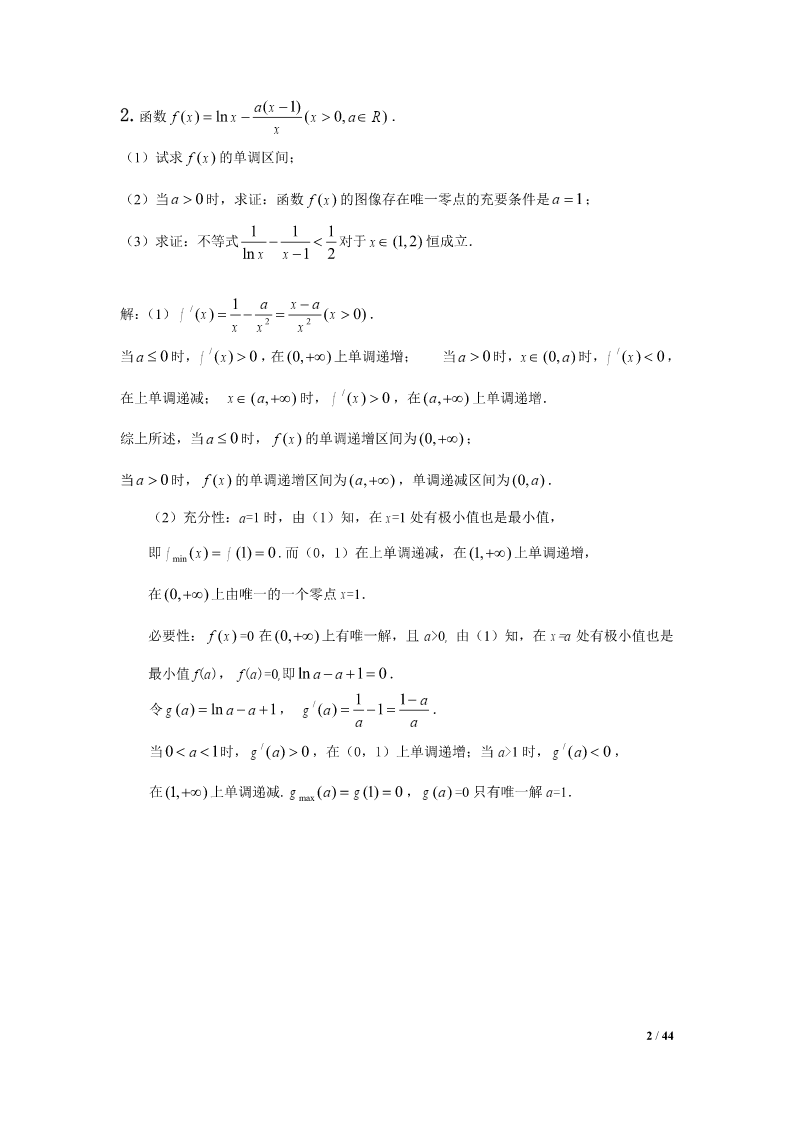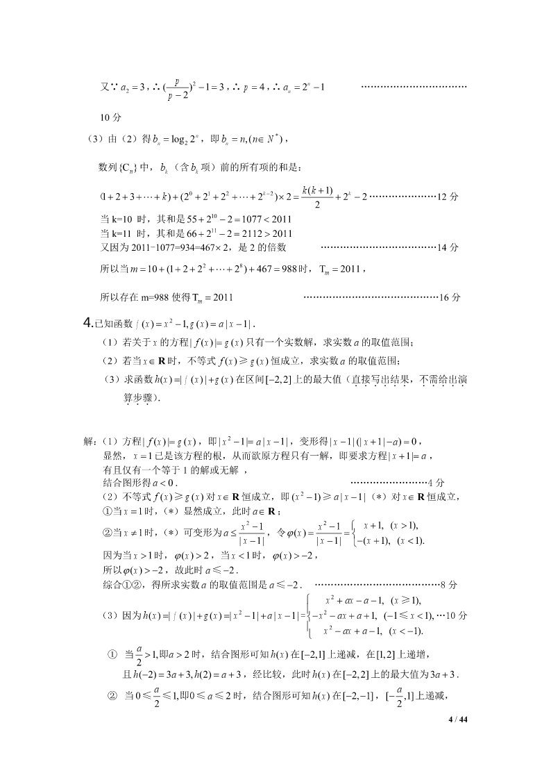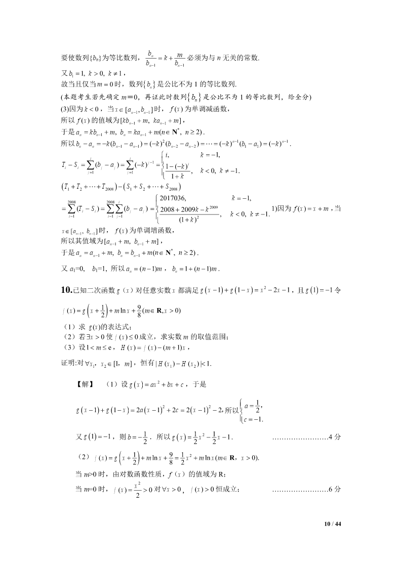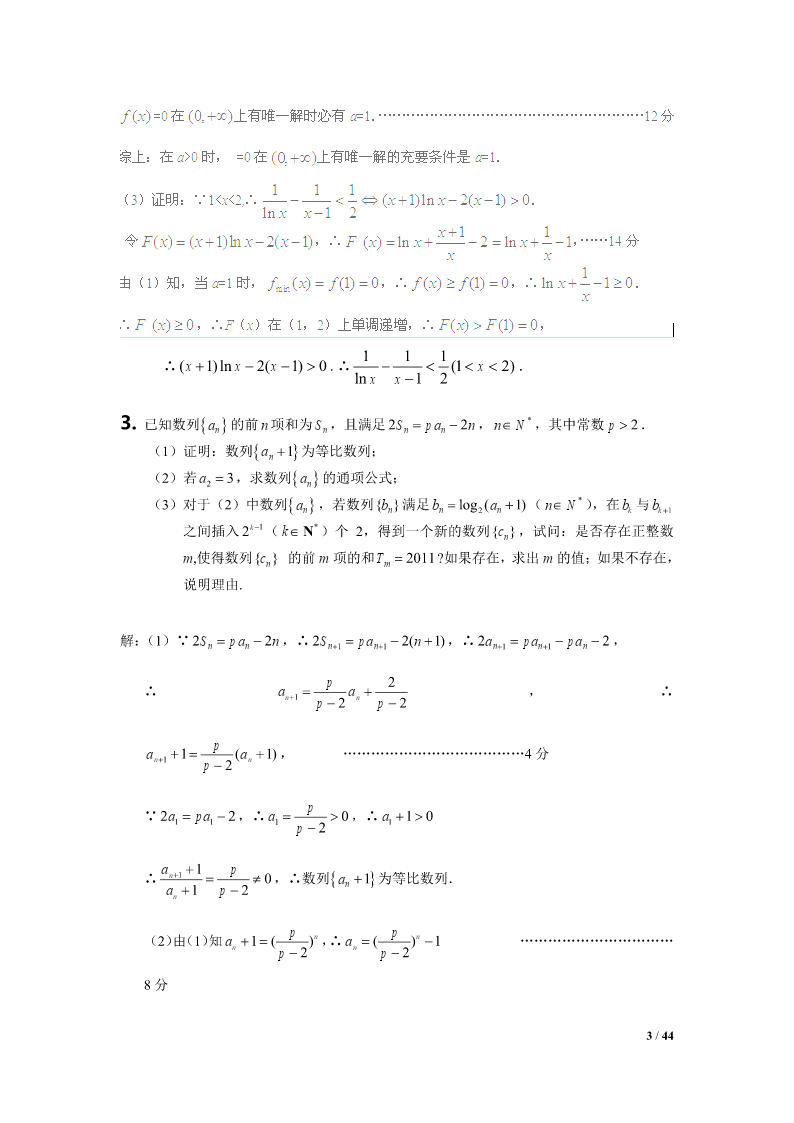 2012江苏高考数学压轴题集选1.设Tn为数列an的前n项之积,满足Tn1an(nN).1(1)设bn,证明数列bn是等差数列,并求bn和an;Tn22211设求证:.(2)SnT1T2Tnan1Snan24Tn解:(1)∵Tn1an(nN),an,(n2),Tn1∴数列bn是以2为首项,以1为公差的等差数列,111∴bn2(n1)n1,∴Tn,∴an1Tn1bnn1n1222111(2),SnT1T2Tn22223(n1)111111111∵222an123(n1)2334(n1)(n2)2n221111111∴,当时,an1Snn22222223(n1)223n(n1)1111a,42n1n4111当n1时,ST2a,∴Sa.11414nn41/44ax(1)2.函数f()xxln(xaR0,).x(1)试求f()x的单调区间;(2)当a0时,求证:函数f()x的图像存在唯一零点的充要条件是a1;111(3)求证:不等式对于x(1,2)恒成立.lnxx121axa解:(1)fx/()(x0).xxx22当a0时,fx/()0,在(0,)上单调递增;当a0时,x(0,a)时,fx/()0,在上单调递减;xa(,)时,fx/()0,在(,a)上单调递增.综上所述,当a0时,f()x的单调递增区间为(0,);当a0时,f()x的单调递增区间为(,a),单调递减区间为(0,a).(2)充分性:a=1时,由(1)知,在x=1处有极小值也是最小值,即fxfmin()(1)0.而(0,1)在上单调递减,在(1,)上单调递增,在(0,)上由唯一的一个零点x=1.必要性:f()x=0在(0,)上有唯一解,且a>0,由(1)知,在x=a处有极小值也是最小值f(a),f(a)=0,即lnaa10.11a令ga()lnaa1,ga/()1.aa当01a时,ga/()0,在(0,1)上单调递增;当a>1时,ga/()0,在(1,)上单调递减.gagmax()(1)0,ga()=0只有唯一解a=1.2/44111∴(1)ln2(1)0xxx.∴(1x2).lnxx12*3.已知数列an的前n项和为Sn,且满足22Spannn,nN,其中常数p2.(1)证明:数列an1为等比数列;(2)若a23,求数列an的通项公式;*(3)对于(2)中数列an,若数列{}bn满足bannlog2(1)(nN),在bk与bk1k1*之间插入2(kN)个2,得到一个新的数列{}cn,试问:是否存在正整数m,使得数列{}cn的前m项的和Tm2011?如果存在,求出m的值;如果不存在,说明理由.解:(1)∵22Spannn,∴22(1)Spannn11,∴22apapannn11,p2∴aa,∴nn1pp22paa1(1),…………………………………4分nn1p2p∵22apa,∴a0,∴a10111p21an11p∴0,∴数列an1为等比数列.apn12pp(2)由(1)知a1()n,∴a()1n……………………………np2np28分3/44p又∵a3,∴()132,∴p4,∴a21n……………………………2p2n10分n*(3)由(2)得bnlog22,即bnnNn,(),数列{Cn}中,bk(含bk项)前的所有项的和是:012kk2kk(1)(123k)(2222)222…………………12分2当k=10时,其和是55210210772011当k=11时,其和是66211221122011又因为2011-1077=934=4672,是2的倍数………………………………14分所以当28时,,m10(1222)467988Tm2011所以存在m=988