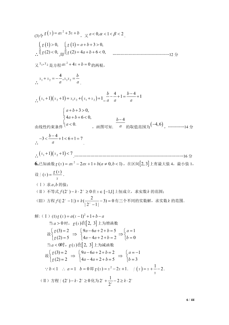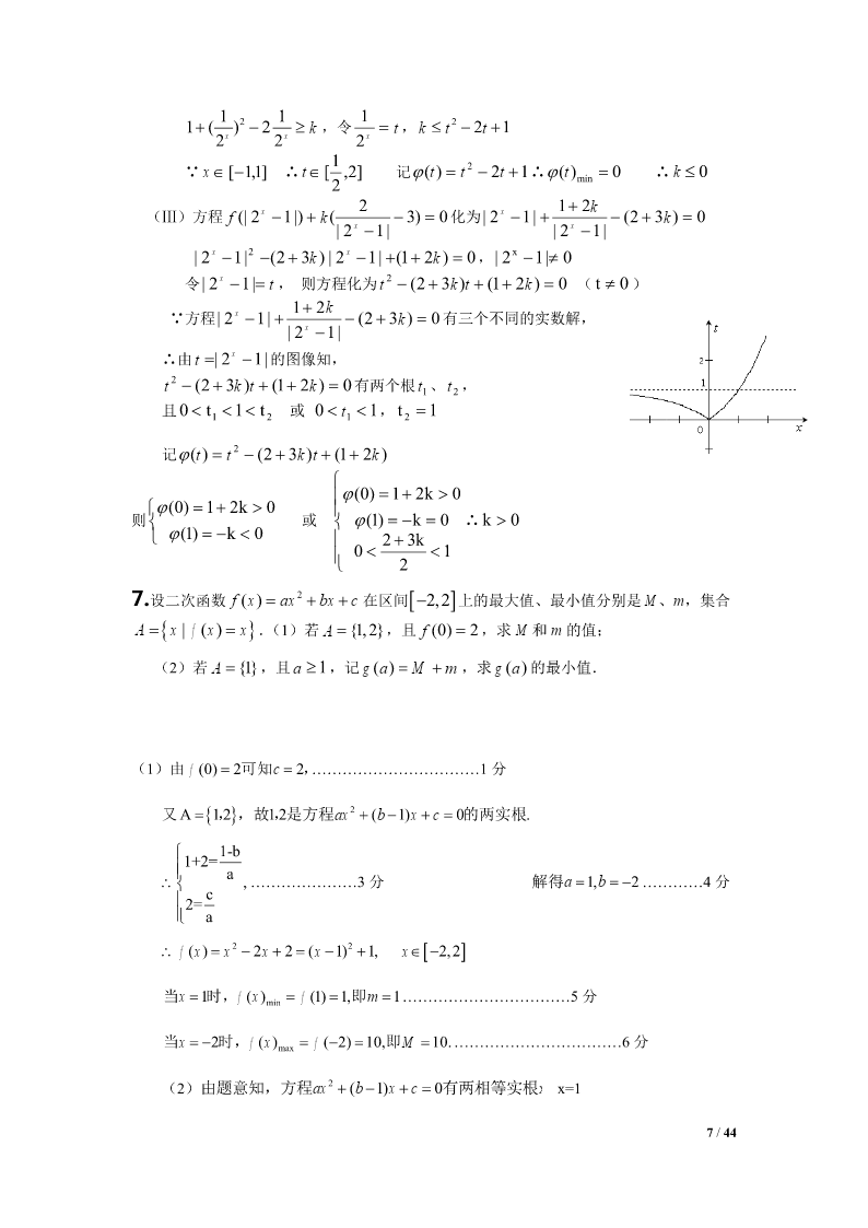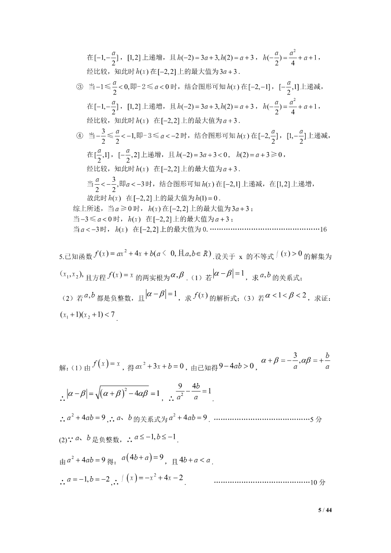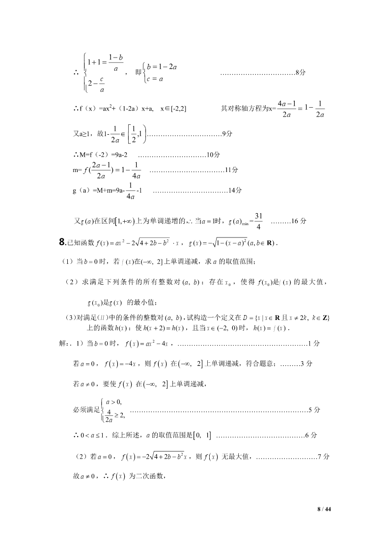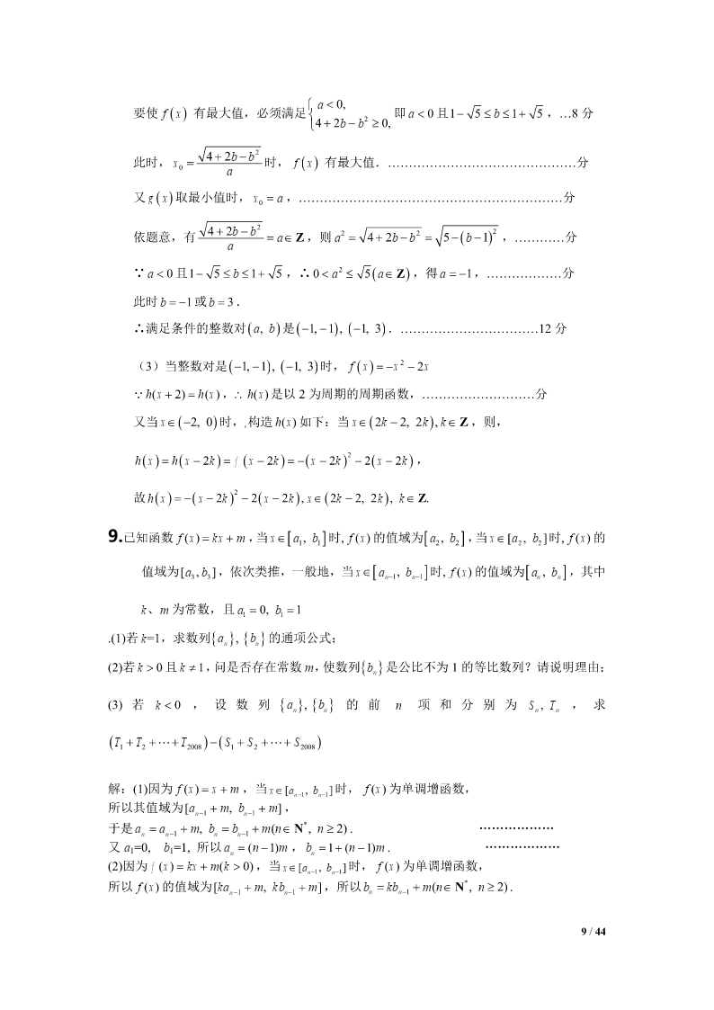 2012江苏高考数学压轴题集选1.设Tn为数列an的前n项之积,满足Tn1an(nN).1(1)设bn,证明数列bn是等差数列,并求bn和an;Tn22211设求证:.(2)SnT1T2Tnan1Snan24Tn解:(1)∵Tn1an(nN),an,(n2),Tn1∴数列bn是以2为首项,以1为公差的等差数列,111∴bn2(n1)n1,∴Tn,∴an1Tn1bnn1n1222111(2),SnT1T2Tn22223(n1)111111111∵222an123(n1)2334(n1)(n2)2n221111111∴,当时,an1Snn22222223(n1)223n(n1)1111a,42n1n4111当n1时,ST2a,∴Sa.11414nn41/44ax(1)2.函数f()xxln(xaR0,).x(1)试求f()x的单调区间;(2)当a0时,求证:函数f()x的图像存在唯一零点的充要条件是a1;111(3)求证:不等式对于x(1,2)恒成立.lnxx121axa解:(1)fx/()(x0).xxx22当a0时,fx/()0,在(0,)上单调递增;当a0时,x(0,a)时,fx/()0,在上单调递减;xa(,)时,fx/()0,在(,a)上单调递增.综上所述,当a0时,f()x的单调递增区间为(0,);当a0时,f()x的单调递增区间为(,a),单调递减区间为(0,a).(2)充分性:a=1时,由(1)知,在x=1处有极小值也是最小值,即fxfmin()(1)0.而(0,1)在上单调递减,在(1,)上单调递增,在(0,)上由唯一的一个零点x=1.必要性:f()x=0在(0,)上有唯一解,且a>0,由(1)知,在x=a处有极小值也是最小值f(a),f(a)=0,即lnaa10.11a令ga()lnaa1,ga/()1.aa当01a时,ga/()0,在(0,1)上单调递增;当a>1时,ga/()0,在(1,)上单调递减.gagmax()(1)0,ga()=0只有唯一解a=1.2/44111∴(1)ln2(1)0xxx.∴(1x2).lnxx12*3.已知数列an的前n项和为Sn,且满足22Spannn,nN,其中常数p2.(1)证明:数列an1为等比数列;(2)若a23,求数列an的通项公式;*(3)对于(2)中数列an,若数列{}bn满足bannlog2(1)(nN),在bk与bk1k1*之间插入2(kN)个2,得到一个新的数列{}cn,试问:是否存在正整数m,使得数列{}cn的前m项的和Tm2011?如果存在,求出m的值;如果不存在,说明理由.解:(1)∵22Spannn,∴22(1)Spannn11,∴22apapannn11,p2∴aa,∴nn1pp22paa1(1),…………………………………4分nn1p2p∵22apa,∴a0,∴a10111p21an11p∴0,∴数列an1为等比数列.apn12pp(2)由(1)知a1()n,∴a()1n……………………………np2np28分3/44p又∵a3,∴()132,∴p4,∴a21n……………………………2p2n10分n*(3)由(2)得bnlog22,即bnnNn,(),数列{Cn}中,bk(含bk项)前的所有项的和是:012kk2kk(1)(123k)(2222)222…………………12分2当k=10时,其和是55210210772011当k=11时,其和是66211221122011又因为2011-1077=934=4672,是2的倍数………………………………14分所以当28时,,m10(1222)467988Tm2011所以存在m=988