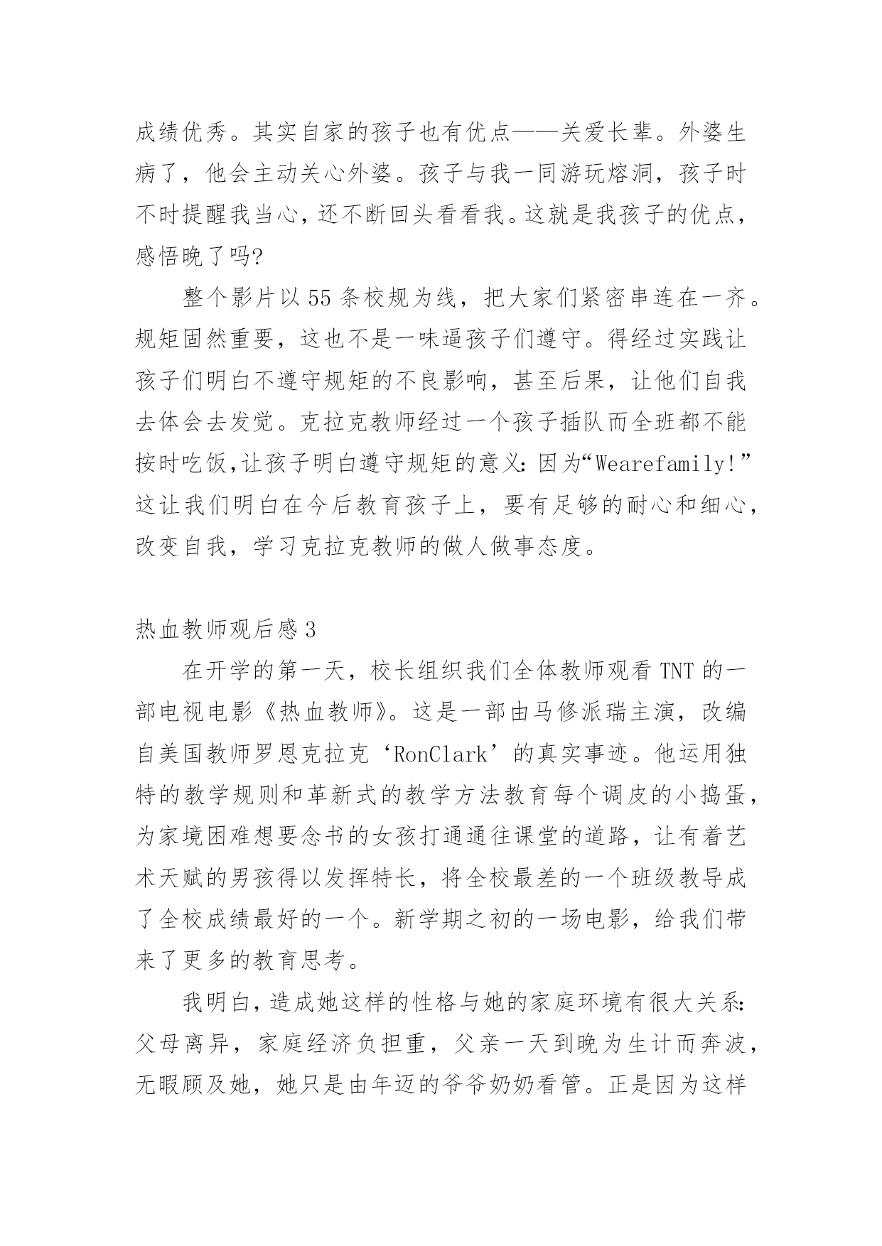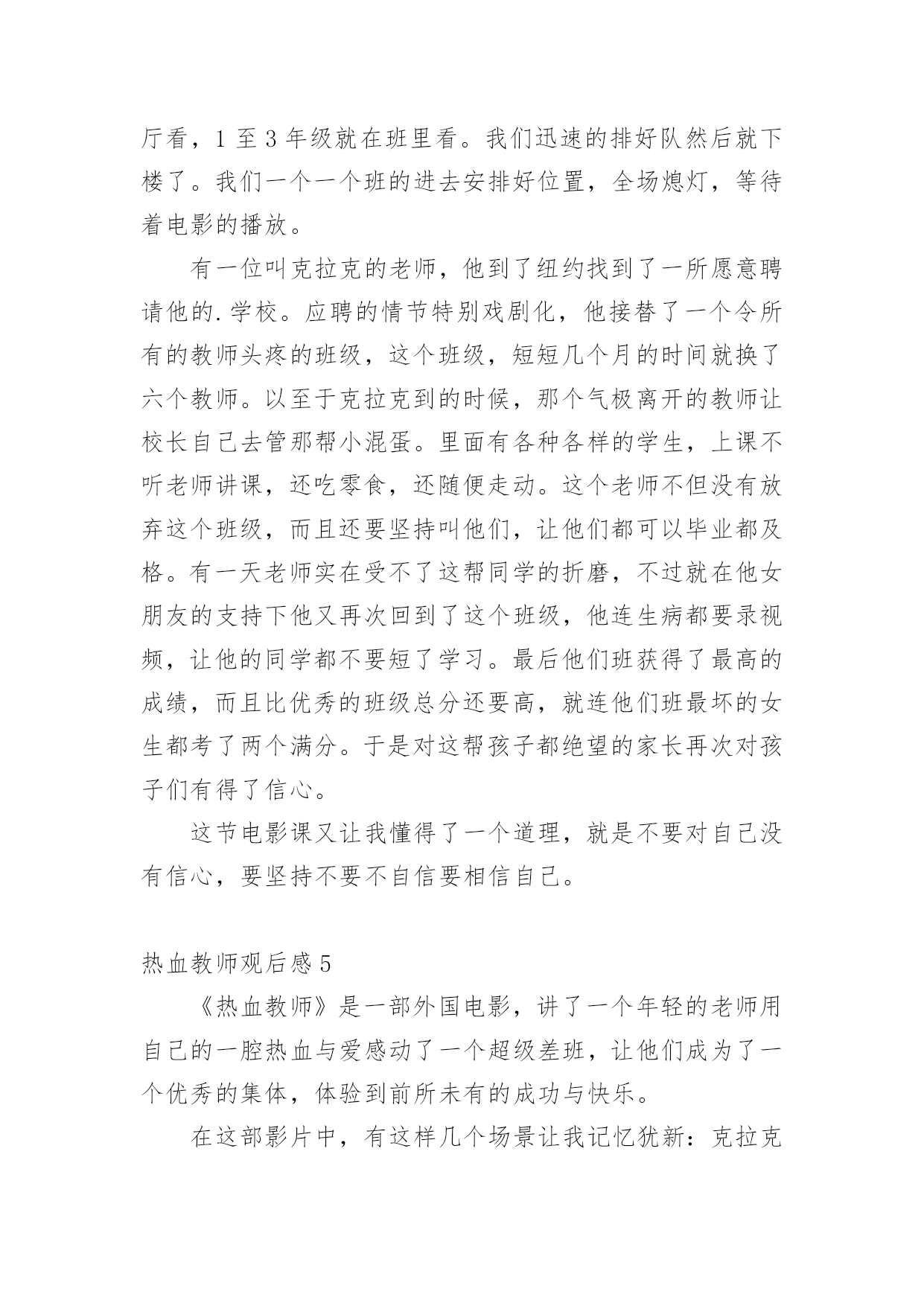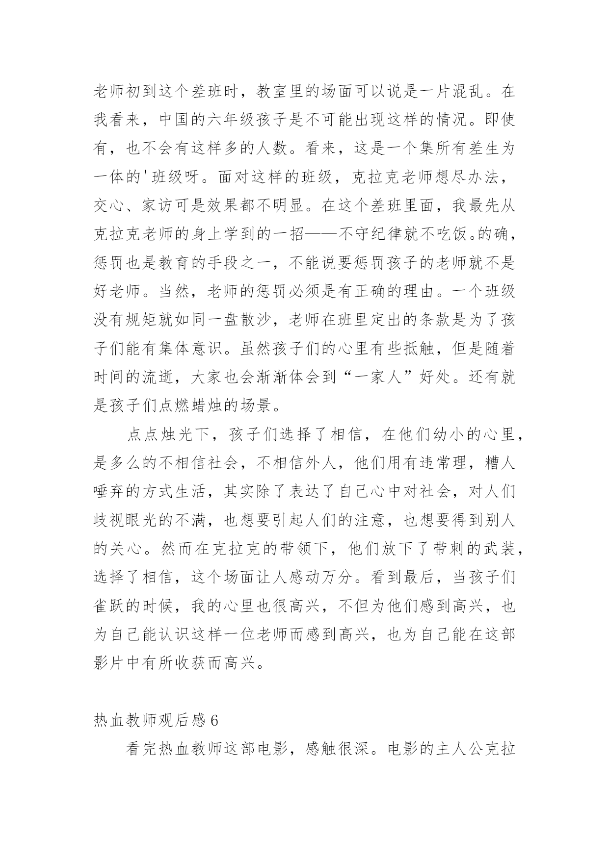 热血教师观后感看完某一作品后,一定有很多值得分享的心得吧,不妨坐下来好好写写观后感吧。千万不能认为观后感随便应付就可以,以下是小编帮大家整理的热血教师观后感,欢迎阅读与收藏。热血教师观后感1如果每个中国的老师都像克拉克老师样,那中国的教育就有希望了!上个星期学校组织老师灌看了热血教师,片子中无时无刻都在闪动着智慧教育的光芒。苏霍姆林斯基曾经说过:“要成为孩子的真正教育者,就要把自己的心奉献给他们。只有对学生倾注了感情,才能获得学生的信任和尊重。”我想位优秀、称职的教师,除了要有丰富的知识外,还必须具有信心、爱心、诚心、耐心和对教育事业的坚持,这样才有可能得到学生的.信任、支持和爱戴。片子中克拉克老师用他自己的幽默风趣,善于发现每个孩子的优点,鼓励孩子们去追寻自己的梦想,用家庭唤醒孩子们对亲情的渴望,他信心十足不放弃每个学生,他用敏锐的目光洞察学生的内心世界,他用充满热情富有创造力的教育教学方法教育着每个顽皮的学生。我觉得我们老师在班级和学生管理方面可以向克拉克老师学习下几个方面:一、严格管理班级常规。教师用自己的爱心和耐心来管理学生,因为我们是家人。二、平等对待每个学生,不抛弃不放弃。让每个孩子都有追寻梦想的舞台。三、因材施教,没有教不好的学生,只有不会教的老师。善于发现每个孩子的闪光点,鼓励支持,激发他们的兴趣,使学生的特长得到发挥,那么学生也定会给我们带来惊喜。我想作为名教师,只要有对工作的热情,有对学生的爱心和耐心,能够多反思,求创新,你就能成为名好教师,虽然不能做出什么惊天动地的大事,但是你能在学生的心目中得到认可和尊敬,就已经足够了。热血教师观后感2看完热血教师,我感觉到克拉克教师的伟大,他的无私付出精神,对工作的热情值得每一个人学习。当然感触深刻的还是那一帮学生。其实他们每一个人都渴望优秀,并且都有本事成为优秀生。只是缺少了克拉克这样的教师,孩子们无意间被扣上了“捣蛋鬼”、“差等生”……的'帽子。正因为如此,孩子们能够说是自暴自弃,做了名副其实的“捣蛋鬼”。整天以整倒教师为乐,根本无心学习。写到这儿,你们看看,我们的孩子是不是也有点“捣蛋”?当你乱给他扣帽子时,他就会故意叛逆而不听从于你呢?每个孩子都有本身的优点,我们要发现孩子们的优点;对于缺点,则需慢慢引导并改正。以前总是看到别人家孩子成绩优秀。其实自家的孩子也有优点——关爱长辈。外婆生病了,他会主动关心外婆。孩子与我一同游玩熔洞,孩子时不时提醒我当心,还不断回头看看我。这就是我孩子的优点,感悟晚了吗?整个影片以55条校规为线,把大家们紧密串连在一齐。规矩固然重要,这也不是一味逼孩子们遵守。得经过实践让孩子们明白不遵守规矩的不良影响,甚至后果,让他们自我去体会去发觉。克拉克教师经过一个孩子插队而全班都不能按时吃饭,让孩子明白遵守规矩的意义:因为“Wearefamily!”这让我们明白在今后教育孩子上,要有足够的耐心和细心,改变自我,学习克拉克教师的做人做事态度。热血教师观后感3在开学的第一天,校长组织我们全体教师观看TNT的一部电视电影《热血教师》。这是一部由马修派瑞主演,改编自美国教师罗恩克拉克‘RonClark’的真实事迹。他运用独特的教学规则和革新式的教学方法教育每个调皮的小捣蛋,为家境困难想要念书的女孩打通通往课堂的道路,让有着艺术天赋的男孩得以发挥特长,将全校最差的一个班级教导成了全校成绩最好的一个。新学期之初的一场电影,给我们带来了更多的教育思考。我明白,造成她这样的性格与她的家庭环境有很大关系:父母离异,家庭经济负担重,父亲一天到晚为生计而奔波,无暇顾及她,她只是由年迈的爷爷奶奶看管。正是因为这样的家庭背景,一、缺乏来自父母的爱,二、爷爷奶奶简单精暴的管教方法也让她感受不到来自长辈的温暖。觉得,她更需要的是“爱”。所以,要想转化她,必须从“爱”入手,用爱为夜行的她导航,以爱来换取她对别人的.信任,以爱来换取她对生活的信心,以爱来换取更多更多……对于她的教育,我的基本观点是“暗示与期待”、“鼓励与帮忙”。比如,当她动作慢时,我常会说:“你要再快点多棒呀!”当她孤独站在一边时,我会说:“我真期望看见一个欢乐的小故娘!明白吗,你一笑是很可爱的。我异常喜欢你笑时的小脸。”当她课堂上偶尔举手发言,我会鼓励她,祝贺她。当她遇到不开心的事时,我会耐心聆听她的真情倾诉,循循善诱地引导她自控自强,并不露痕迹地帮忙他们去努力获得成功。尽我们所能地多给她一点关爱!经过一段时间,我发现,她脾气已经没那么古怪了,也愿意听教师的话了,并且,我也发现她愿意接近我了!我觉得,这就是一个新的起点。热血教师观后感4周5是我们学校的第2次电影课,大家都很期待是什么电影,是不是很好看?在周5前几天这次电影课的主题海报就贴出来了。于是大家都抢着先看,我隐隐约约的看见了《热血教师》这4个