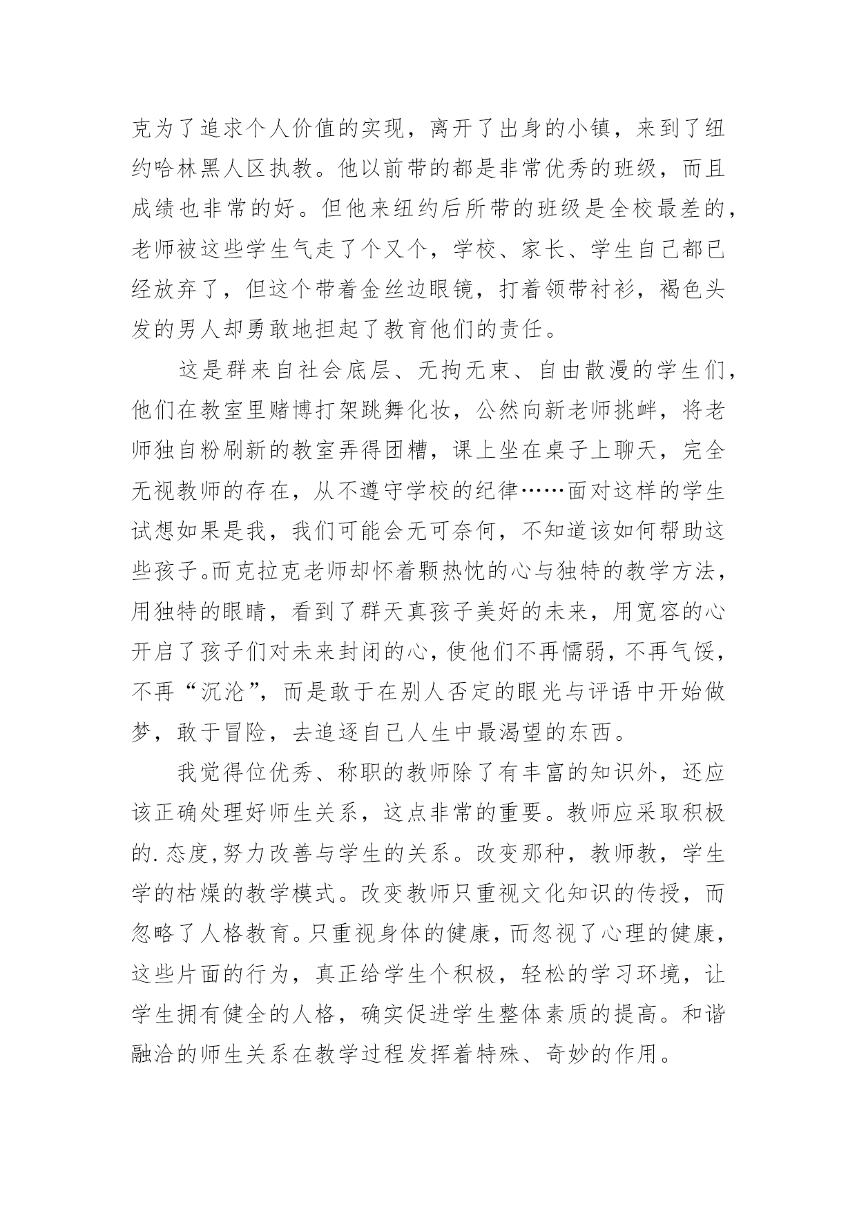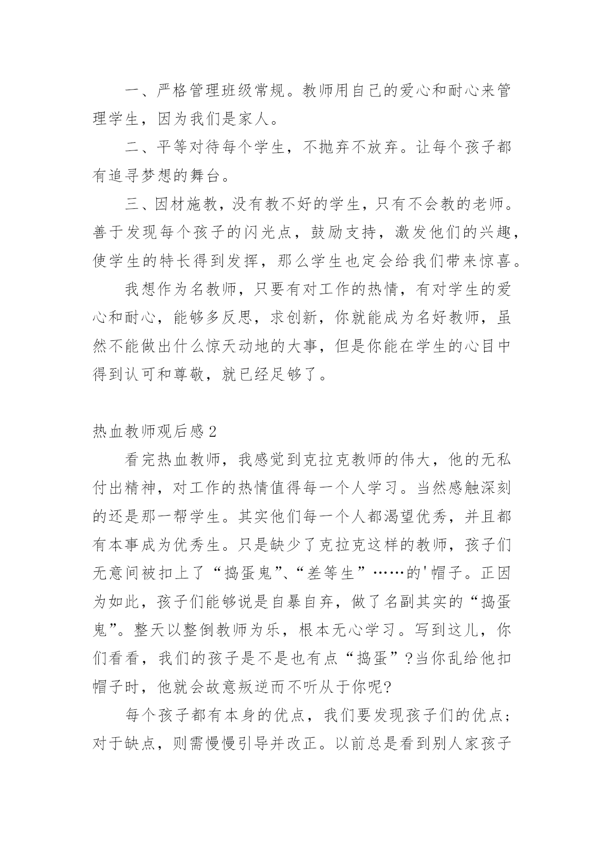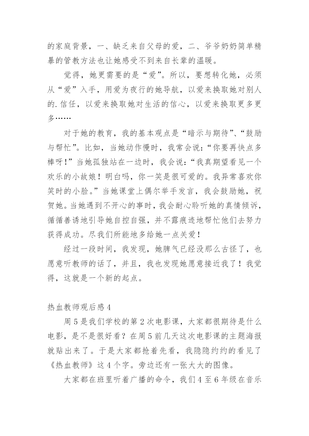热血教师观后感看完某一作品后,一定有很多值得分享的心得吧,不妨坐下来好好写写观后感吧。千万不能认为观后感随便应付就可以,以下是小编帮大家整理的热血教师观后感,欢迎阅读与收藏。热血教师观后感1如果每个中国的老师都像克拉克老师样,那中国的教育就有希望了!上个星期学校组织老师灌看了热血教师,片子中无时无刻都在闪动着智慧教育的光芒。苏霍姆林斯基曾经说过:“要成为孩子的真正教育者,就要把自己的心奉献给他们。只有对学生倾注了感情,才能获得学生的信任和尊重。”我想位优秀、称职的教师,除了要有丰富的知识外,还必须具有信心、爱心、诚心、耐心和对教育事业的坚持,这样才有可能得到学生的.信任、支持和爱戴。片子中克拉克老师用他自己的幽默风趣,善于发现每个孩子的优点,鼓励孩子们去追寻自己的梦想,用家庭唤醒孩子们对亲情的渴望,他信心十足不放弃每个学生,他用敏锐的目光洞察学生的内心世界,他用充满热情富有创造力的教育教学方法教育着每个顽皮的学生。我觉得我们老师在班级和学生管理方面可以向克拉克老师学习下几个方面:一、严格管理班级常规。教师用自己的爱心和耐心来管理学生,因为我们是家人。二、平等对待每个学生,不抛弃不放弃。让每个孩子都有追寻梦想的舞台。三、因材施教,没有教不好的学生,只有不会教的老师。善于发现每个孩子的闪光点,鼓励支持,激发他们的兴趣,使学生的特长得到发挥,那么学生也定会给我们带来惊喜。我想作为名教师,只要有对工作的热情,有对学生的爱心和耐心,能够多反思,求创新,你就能成为名好教师,虽然不能做出什么惊天动地的大事,但是你能在学生的心目中得到认可和尊敬,就已经足够了。热血教师观后感2看完热血教师,我感觉到克拉克教师的伟大,他的无私付出精神,对工作的热情值得每一个人学习。当然感触深刻的还是那一帮学生。其实他们每一个人都渴望优秀,并且都有本事成为优秀生。只是缺少了克拉克这样的教师,孩子们无意间被扣上了“捣蛋鬼”、“差等生”……的'帽子。正因为如此,孩子们能够说是自暴自弃,做了名副其实的“捣蛋鬼”。整天以整倒教师为乐,根本无心学习。写到这儿,你们看看,我们的孩子是不是也有点“捣蛋”?当你乱给他扣帽子时,他就会故意叛逆而不听从于你呢?每个孩子都有本身的优点,我们要发现孩子们的优点;对于缺点,则需慢慢引导并改正。以前总是看到别人家孩子成绩优秀。其实自家的孩子也有优点——关爱长辈。外婆生病了,他会主动关心外婆。孩子与我一同游玩熔洞,孩子时不时提醒我当心,还不断回头看看我。这就是我孩子的优点,感悟晚了吗?整个影片以55条校规为线,把大家们紧密串连在一齐。规矩固然重要,这也不是一味逼孩子们遵守。得经过实践让孩子们明白不遵守规矩的不良影响,甚至后果,让他们自我去体会去发觉。克拉克教师经过一个孩子插队而全班都不能按时吃饭,让孩子明白遵守规矩的意义:因为“Wearefamily!”这让我们明白在今后教育孩子上,要有足够的耐心和细心,改变自我,学习克拉克教师的做人做事态度。热血教师观后感3在开学的第一天,校长组织我们全体教师观看TNT的一部电视电影《热血教师》。这是一部由马修派瑞主演,改编自美国教师罗恩克拉克‘RonClark’的真实事迹。他运用独特的教学规则和革新式的教学方法教育每个调皮的小捣蛋,为家境困难想要念书的女孩打通通往课堂的道路,让有着艺术天赋的男孩得以发挥特长,将全校最差的一个班级教导成了全校成绩最好的一个。新学期之初的一场电影,给我们带来了更多的教育思考。我明白,造成她这样的性格与她的家庭环境有很大关系:父母离异,家庭经济负担重,父亲一天到晚为生计而奔波,无暇顾及她,她只是由年迈的爷爷奶奶看管。正是因为这样的家庭背景,一、缺乏来自父母的爱,二、爷爷奶奶简单精暴的管教方法也让她感受不到来自长辈的温暖。觉得,她更需要的是“爱”。所以,要想转化她,必须从“爱”入手,用爱为夜行的她导航,以爱来换取她对别人的.信任,以爱来换取她对生活的信心,以爱来换取更多更多……对于她的教育,我的基本观点是“暗示与期待”、“鼓励与帮忙”。比如,当她动作慢时,我常会说:“你要再快点多棒呀!”当她孤独站在一边时,我会说:“我真期望看见一个欢乐的小故娘!明白吗,你一笑是很可爱的。我异常喜欢你笑时的小脸。”当她课堂上偶尔举手发言,我会鼓励她,祝贺她。当她遇到不开心的事时,我会耐心聆听她的真情倾诉,循循善诱地引导她自控自强,并不露痕迹地帮忙他们去努力获得成功。尽我们所能地多给她一点关爱!经过一段时间,我发现,她脾气已经没那么古怪了,也愿意听教师的话了,并且,我也发现她愿意接近我了!我觉得,这就是一个新的起点。热血教师观后感4周5是我们学校的第2次电影课,大家都很期待是什么电影,是不是很好看?在周5前几天这次电影课的主题海报就贴出来了。于是大家都抢着先看,我隐隐约约的看见了《热血教师》这4个