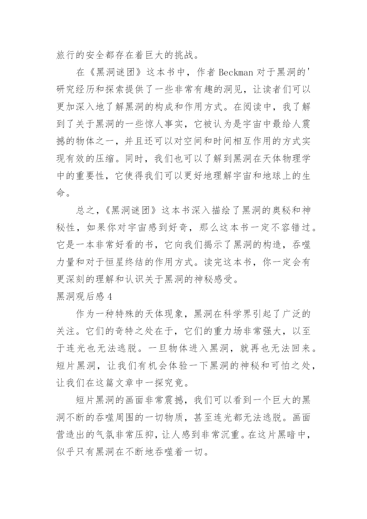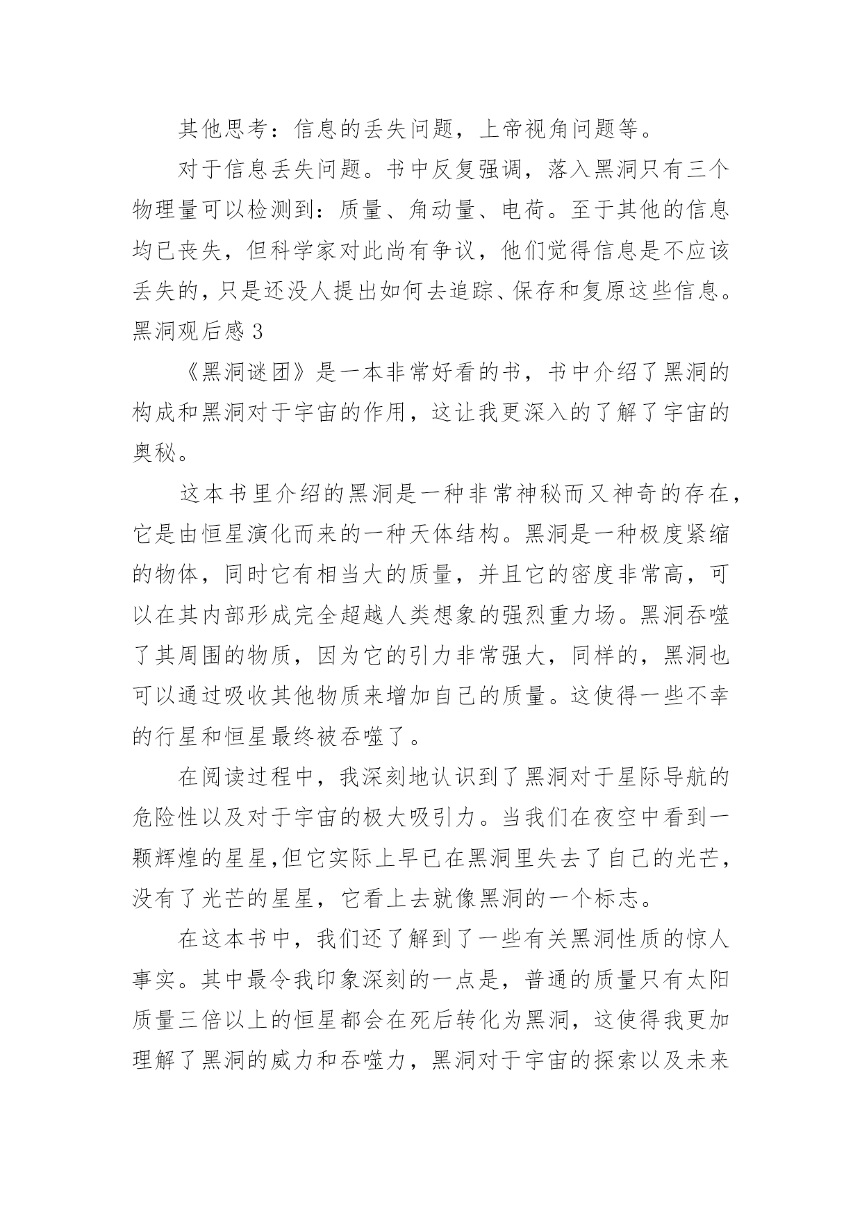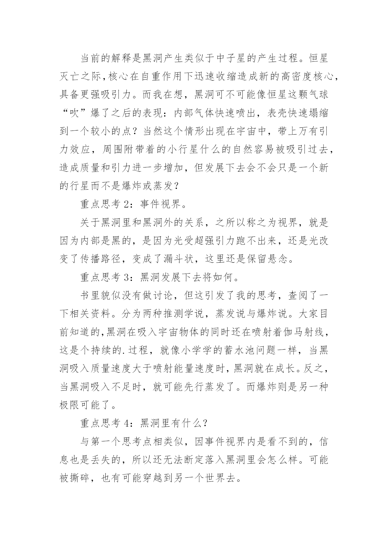 黑洞观后感黑洞观后感当观看完一部作品后,相信大家的收获肯定不少吧,为此就要认真思考观后感如何写了。是不是无从下笔、没有头绪?下面是小编为大家收集的黑洞观后感,欢迎阅读与收藏。黑洞观后感1一部短片,却足以引领人们深入思考自己的生活,思考人类对于时间、空间的探索和认知。这就是《短片黑洞》所带给我的震撼。这部短片讲述的是一位年轻女孩与她在一起的母亲,一次的车祸,以及突如其来的惊叹和思考。女孩在车祸之后发现,她与母亲的时间似乎是被扭曲的,甚至像是穿越了时间和空间。她被黑洞的力量吞噬,让她更深入地理解时间的流逝以及人生的脆弱。黑洞的引力足以让她产生新的想法和情感,并且重新看待她的人生。这一场景,让我们不禁想到人类对于宇宙和时间的探索,而这样的探索,更加的需要勇敢和创造力。影片的设计和制作很出色,特效表现尤其值得称赞。黑洞的特效展现十分奇妙,暗黑的漩涡让我们仿佛看到虚空的深处。而在片中的装饰和视觉效果也让人惊叹。动画的张力和手法以及演员的表现,展现出了制作人们对于故事和情节所注重的细节。整部短片散发出一系列令人印象深刻的气息,让观众有了深思熟虑的机会。就如同电影中的.主角一样,我们需要抓住这个机会,去思考自己的生活。尤为重要的是,我们无法预知未来,也无从知晓我们的一生究竟发生了什么。我们常常会觉得,我们一定能够辨认出来,将我们引导向正确的道路。而实际上,这些道路是受众多因素影响的,我们更为需要进一步地了解生命究竟是什么。短片黑洞观后感,令我想起了令人感慨的一句话:时间如同流水,莫过于一弯弯,一曲曲的小径,它充满了无数的变数和未知的未来。整部短片或许只有一个时长,但是它令人感慨良多,让人们从不同的视角去审视生活。无论你是何种身份,社会地位,或者是年龄,都需要有一种对于人生的敬畏之心。整部短片深入人心,予人深思。短片黑洞观后感,让我思考时间和空间的本质,也让我思考我的人生究竟是如何充满着未知量,亦或是如何在未来中实现自己的梦想。这部短片也让我想尝试去更好地探索自己,去创造属于自己的未来。黑洞观后感220xx年泛读第61本书,精读第9本。一句话总结:里面有很多拗口难懂的术语,事件视界、奇点、量子效应等等。但透过科学我们也可以清晰视野,扩大脑洞,对很多晦涩难懂的奥义有了新的假设可能。重点思考1:黑洞的产生。当前的解释是黑洞产生类似于中子星的产生过程。恒星灭亡之际,核心在自重作用下迅速收缩造成新的高密度核心,具备更强吸引力。而我在想,黑洞可不可能像恒星这颗气球“吹”爆了之后的表现:内部气体快速喷出,表壳快速塌缩到一个较小的点?当然这个情形出现在宇宙中,带上万有引力效应,周围附带着的小行星什么的自然容易被吸引过去,造成质量和引力进一步增加,但发展下去会不会只是一个新的行星而不是爆炸或蒸发?重点思考2:事件视界。关于黑洞里和黑洞外的关系,之所以称之为视界,就是因为内部是黑的,是因为光受超强引力跑不出来,还是光改变了传播路径,变成了漏斗状,这里还是保留悬念。重点思考3:黑洞发展下去将如何。书里貌似没有做讨论,但这引发了我的思考,查阅了一下相关资料。分为两种推测学说,蒸发说与爆炸说。大家目前知道的,黑洞在吸入宇宙物体的同时还在喷射着伽马射线,这是个持续的.过程,就像小学学的蓄水池问题一样,当黑洞吸入质量速度大于喷射能量速度时,黑洞就在成长。反之,当黑洞吸入不足时,就可能先行蒸发了。而爆炸则是另一种极限可能了。重点思考4:黑洞里有什么?与第一个思考点相类似,因事件视界内是看不到的,信息也是丢失的,所以还无法断定落入黑洞里会怎么样。可能被撕碎,也有可能穿越到另一个世界去。其他思考:信息的丢失问题,上帝视角问题等。对于信息丢失问题。书中反复强调,落入黑洞只有三个物理量可以检测到:质量、角动量、电荷。至于其他的信息均已丧失,但科学家对此尚有争议,他们觉得信息是不应该丢失的,只是还没人提出如何去追踪、保存和复原这些信息。黑洞观后感3《黑洞谜团》是一本非常好看的书,书中介绍了黑洞的构成和黑洞对于宇宙的作用,这让我更深入的了解了宇宙的奥秘。这本书里介绍的黑洞是一种非常神秘而又神奇的存在,它是由恒星演化而来的一种天体结构。黑洞是一种极度紧缩的物体,同时它有相当大的质量,并且它的密度非常高,可以在其内部形成完全超越人类想象的强烈重力场。黑洞吞噬了其周围的物质,因为它的引力非常强大,同样的,黑洞也可以通过吸收其他物质来增加自己的质量。这使得一些不幸的行星和恒星最终被吞噬了。在阅读过程中,我深刻地认识到了黑洞对于星际导航的危险性以及对于宇宙的极大吸引力。当我们在夜空中看到一颗辉煌的星星,但它实际上早已在黑洞里失去了自己的光芒,没有了光芒的星星,它看上去就像黑洞的一个标志。在这本书中,我们还了解到了一些有关黑洞性质的惊人事实。其中最令我印象深刻的一点是,普通的质量只有太阳质量