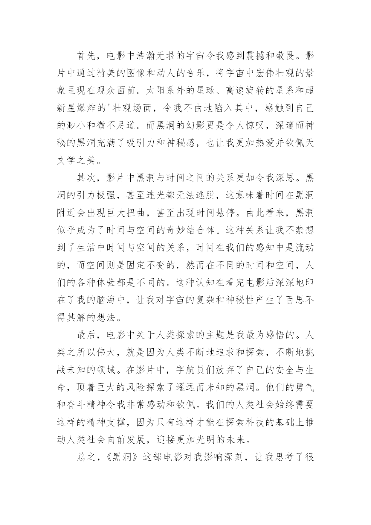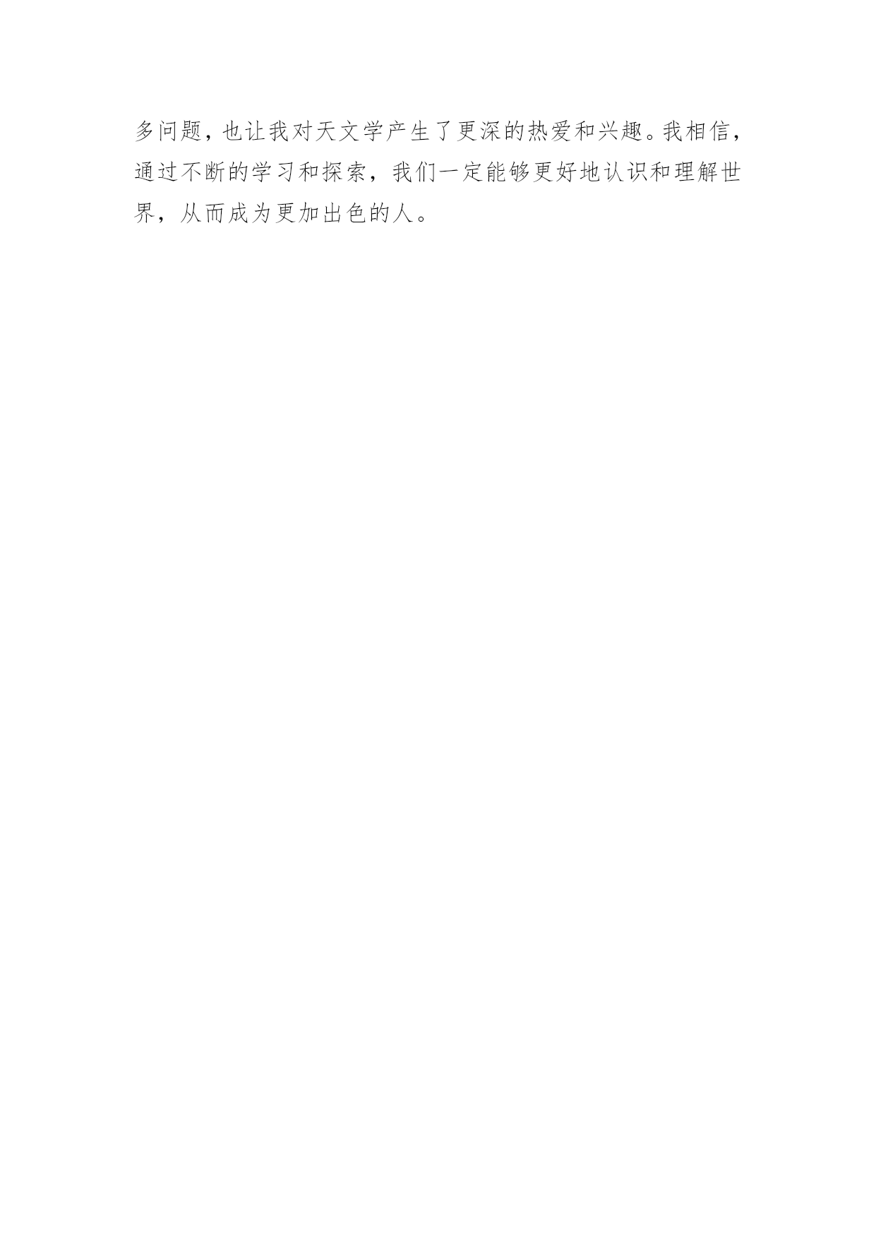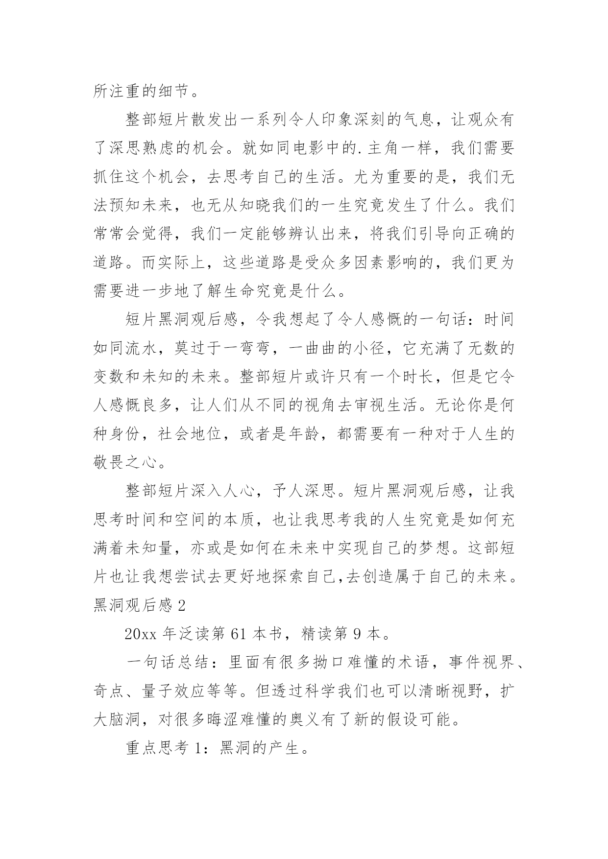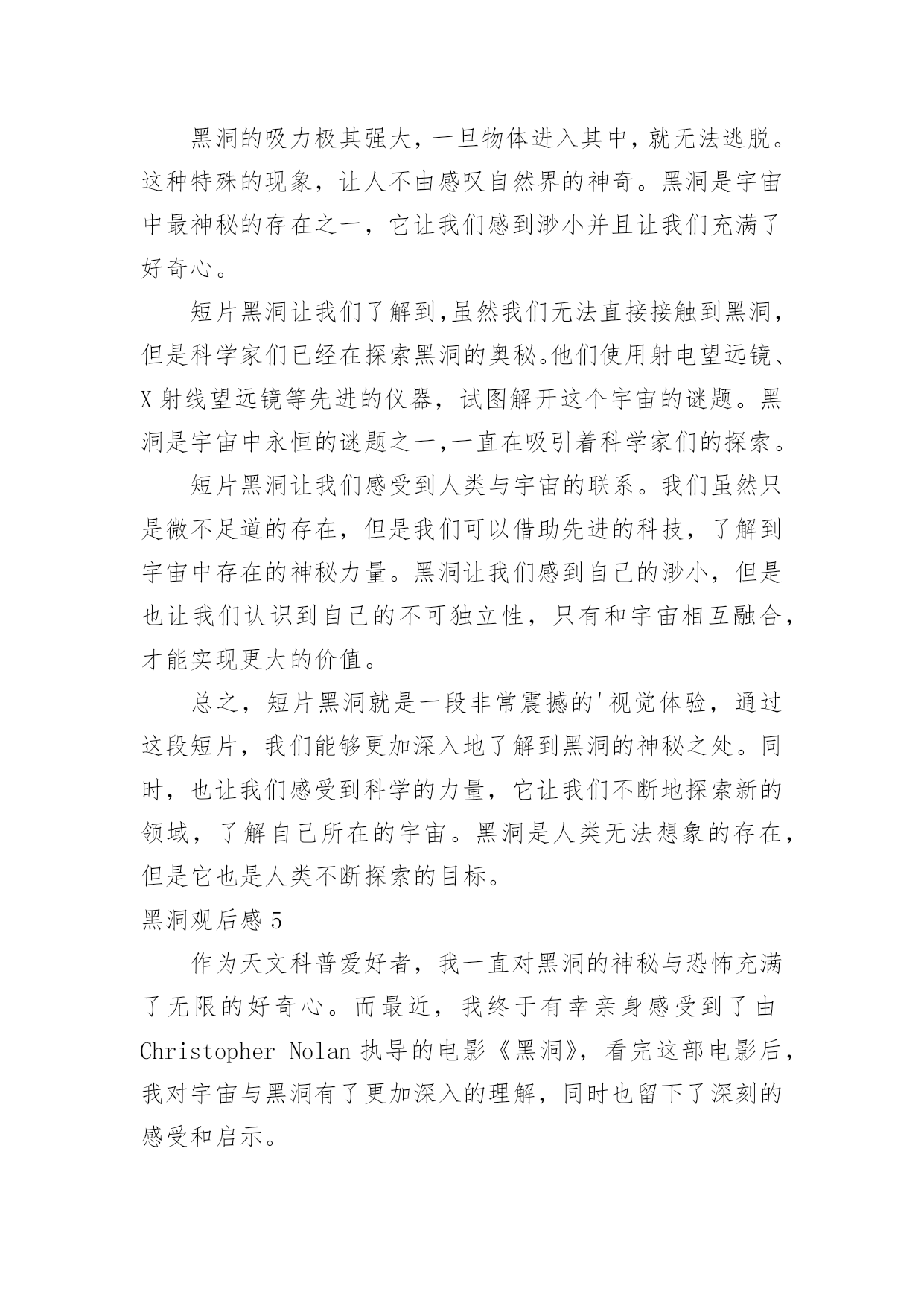 黑洞观后感黑洞观后感当观看完一部作品后,相信大家的收获肯定不少吧,为此就要认真思考观后感如何写了。是不是无从下笔、没有头绪?下面是小编为大家收集的黑洞观后感,欢迎阅读与收藏。黑洞观后感1一部短片,却足以引领人们深入思考自己的生活,思考人类对于时间、空间的探索和认知。这就是《短片黑洞》所带给我的震撼。这部短片讲述的是一位年轻女孩与她在一起的母亲,一次的车祸,以及突如其来的惊叹和思考。女孩在车祸之后发现,她与母亲的时间似乎是被扭曲的,甚至像是穿越了时间和空间。她被黑洞的力量吞噬,让她更深入地理解时间的流逝以及人生的脆弱。黑洞的引力足以让她产生新的想法和情感,并且重新看待她的人生。这一场景,让我们不禁想到人类对于宇宙和时间的探索,而这样的探索,更加的需要勇敢和创造力。影片的设计和制作很出色,特效表现尤其值得称赞。黑洞的特效展现十分奇妙,暗黑的漩涡让我们仿佛看到虚空的深处。而在片中的装饰和视觉效果也让人惊叹。动画的张力和手法以及演员的表现,展现出了制作人们对于故事和情节所注重的细节。整部短片散发出一系列令人印象深刻的气息,让观众有了深思熟虑的机会。就如同电影中的.主角一样,我们需要抓住这个机会,去思考自己的生活。尤为重要的是,我们无法预知未来,也无从知晓我们的一生究竟发生了什么。我们常常会觉得,我们一定能够辨认出来,将我们引导向正确的道路。而实际上,这些道路是受众多因素影响的,我们更为需要进一步地了解生命究竟是什么。短片黑洞观后感,令我想起了令人感慨的一句话:时间如同流水,莫过于一弯弯,一曲曲的小径,它充满了无数的变数和未知的未来。整部短片或许只有一个时长,但是它令人感慨良多,让人们从不同的视角去审视生活。无论你是何种身份,社会地位,或者是年龄,都需要有一种对于人生的敬畏之心。整部短片深入人心,予人深思。短片黑洞观后感,让我思考时间和空间的本质,也让我思考我的人生究竟是如何充满着未知量,亦或是如何在未来中实现自己的梦想。这部短片也让我想尝试去更好地探索自己,去创造属于自己的未来。黑洞观后感220xx年泛读第61本书,精读第9本。一句话总结:里面有很多拗口难懂的术语,事件视界、奇点、量子效应等等。但透过科学我们也可以清晰视野,扩大脑洞,对很多晦涩难懂的奥义有了新的假设可能。重点思考1:黑洞的产生。当前的解释是黑洞产生类似于中子星的产生过程。恒星灭亡之际,核心在自重作用下迅速收缩造成新的高密度核心,具备更强吸引力。而我在想,黑洞可不可能像恒星这颗气球“吹”爆了之后的表现:内部气体快速喷出,表壳快速塌缩到一个较小的点?当然这个情形出现在宇宙中,带上万有引力效应,周围附带着的小行星什么的自然容易被吸引过去,造成质量和引力进一步增加,但发展下去会不会只是一个新的行星而不是爆炸或蒸发?重点思考2:事件视界。关于黑洞里和黑洞外的关系,之所以称之为视界,就是因为内部是黑的,是因为光受超强引力跑不出来,还是光改变了传播路径,变成了漏斗状,这里还是保留悬念。重点思考3:黑洞发展下去将如何。书里貌似没有做讨论,但这引发了我的思考,查阅了一下相关资料。分为两种推测学说,蒸发说与爆炸说。大家目前知道的,黑洞在吸入宇宙物体的同时还在喷射着伽马射线,这是个持续的.过程,就像小学学的蓄水池问题一样,当黑洞吸入质量速度大于喷射能量速度时,黑洞就在成长。反之,当黑洞吸入不足时,就可能先行蒸发了。而爆炸则是另一种极限可能了。重点思考4:黑洞里有什么?与第一个思考点相类似,因事件视界内是看不到的,信息也是丢失的,所以还无法断定落入黑洞里会怎么样。可能被撕碎,也有可能穿越到另一个世界去。其他思考:信息的丢失问题,上帝视角问题等。对于信息丢失问题。书中反复强调,落入黑洞只有三个物理量可以检测到:质量、角动量、电荷。至于其他的信息均已丧失,但科学家对此尚有争议,他们觉得信息是不应该丢失的,只是还没人提出如何去追踪、保存和复原这些信息。黑洞观后感3《黑洞谜团》是一本非常好看的书,书中介绍了黑洞的构成和黑洞对于宇宙的作用,这让我更深入的了解了宇宙的奥秘。这本书里介绍的黑洞是一种非常神秘而又神奇的存在,它是由恒星演化而来的一种天体结构。黑洞是一种极度紧缩的物体,同时它有相当大的质量,并且它的密度非常高,可以在其内部形成完全超越人类想象的强烈重力场。黑洞吞噬了其周围的物质,因为它的引力非常强大,同样的,黑洞也可以通过吸收其他物质来增加自己的质量。这使得一些不幸的行星和恒星最终被吞噬了。在阅读过程中,我深刻地认识到了黑洞对于星际导航的危险性以及对于宇宙的极大吸引力。当我们在夜空中看到一颗辉煌的星星,但它实际上早已在黑洞里失去了自己的光芒,没有了光芒的星星,它看上去就像黑洞的一个标志。在这本书中,我们还了解到了一些有关黑洞性质的惊人事实。其中最令我印象深刻的一点是,普通的质量只有太阳质量
