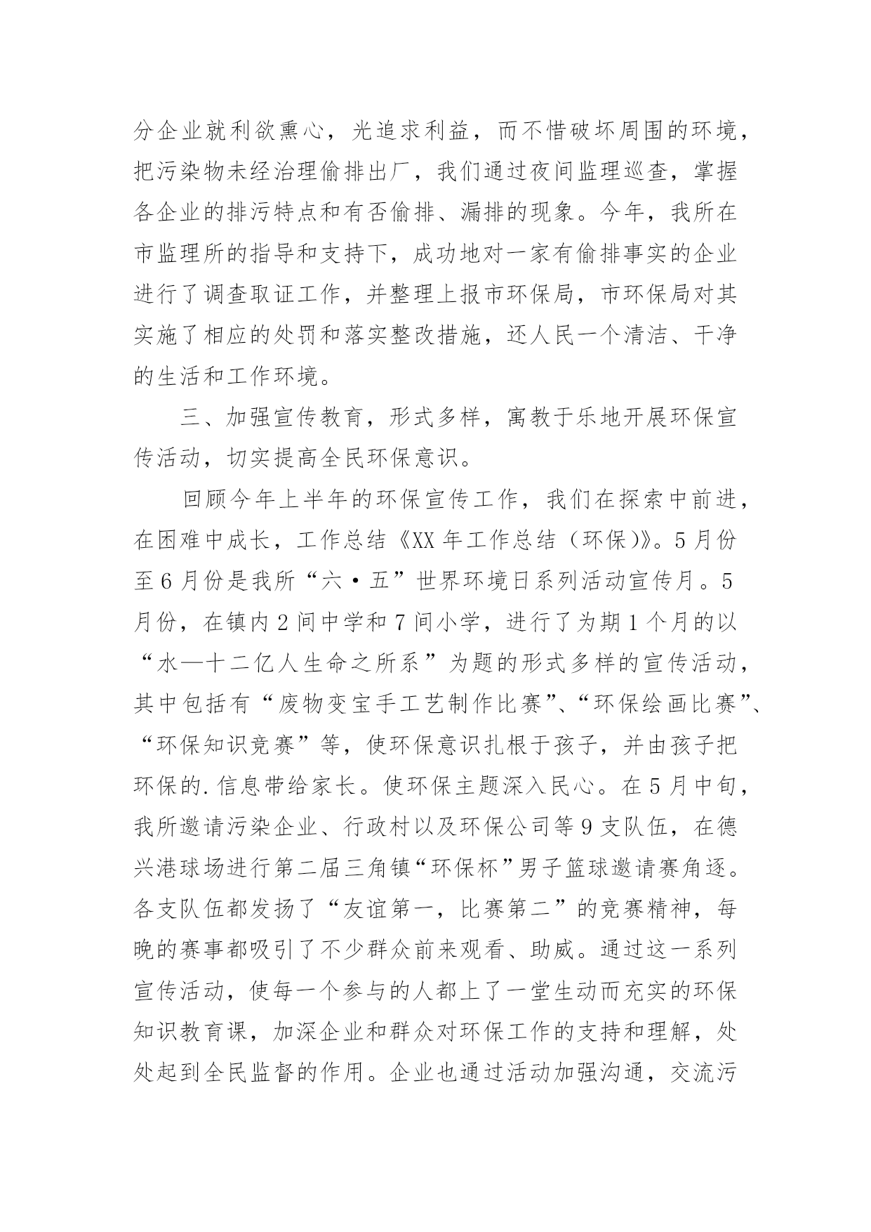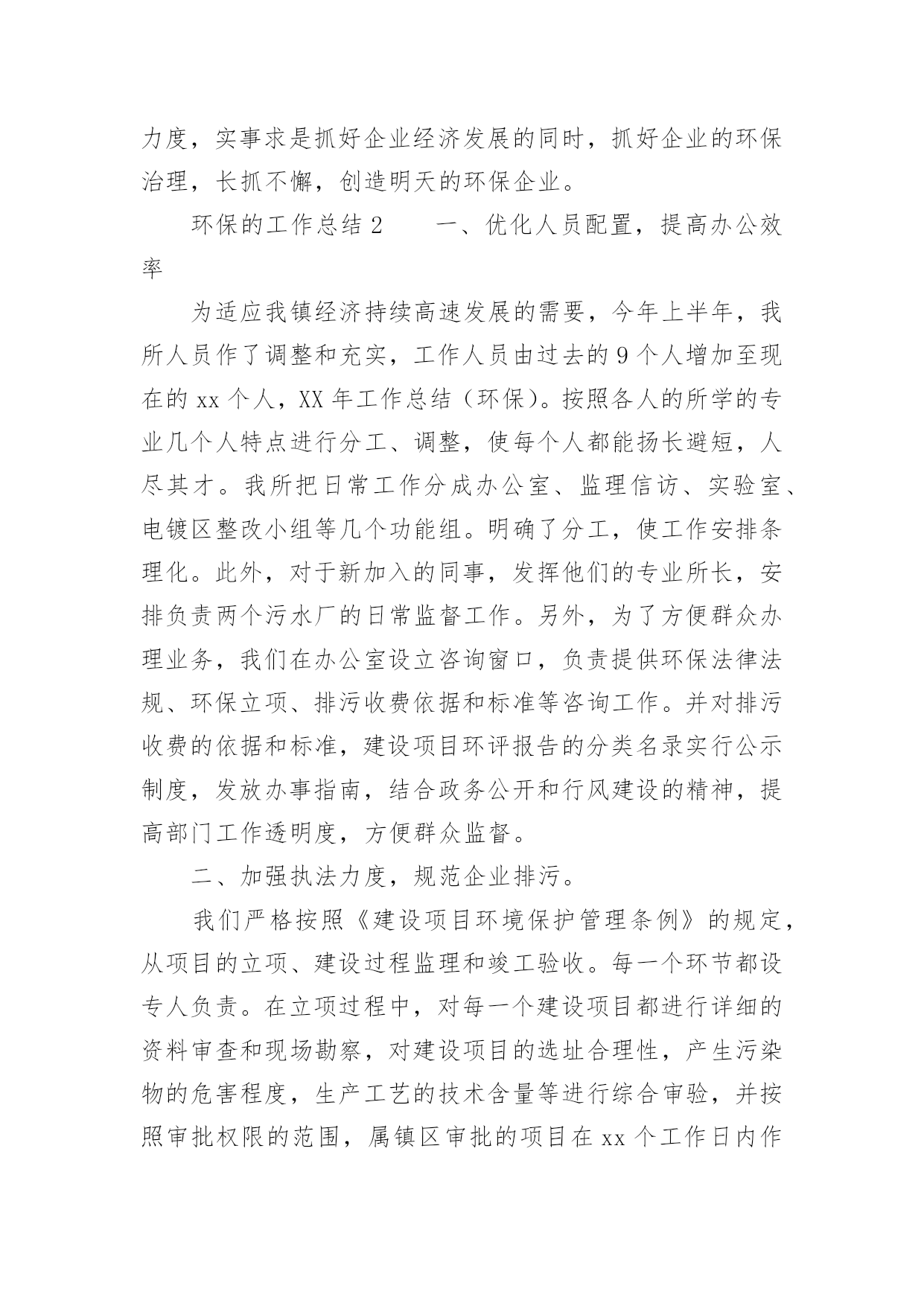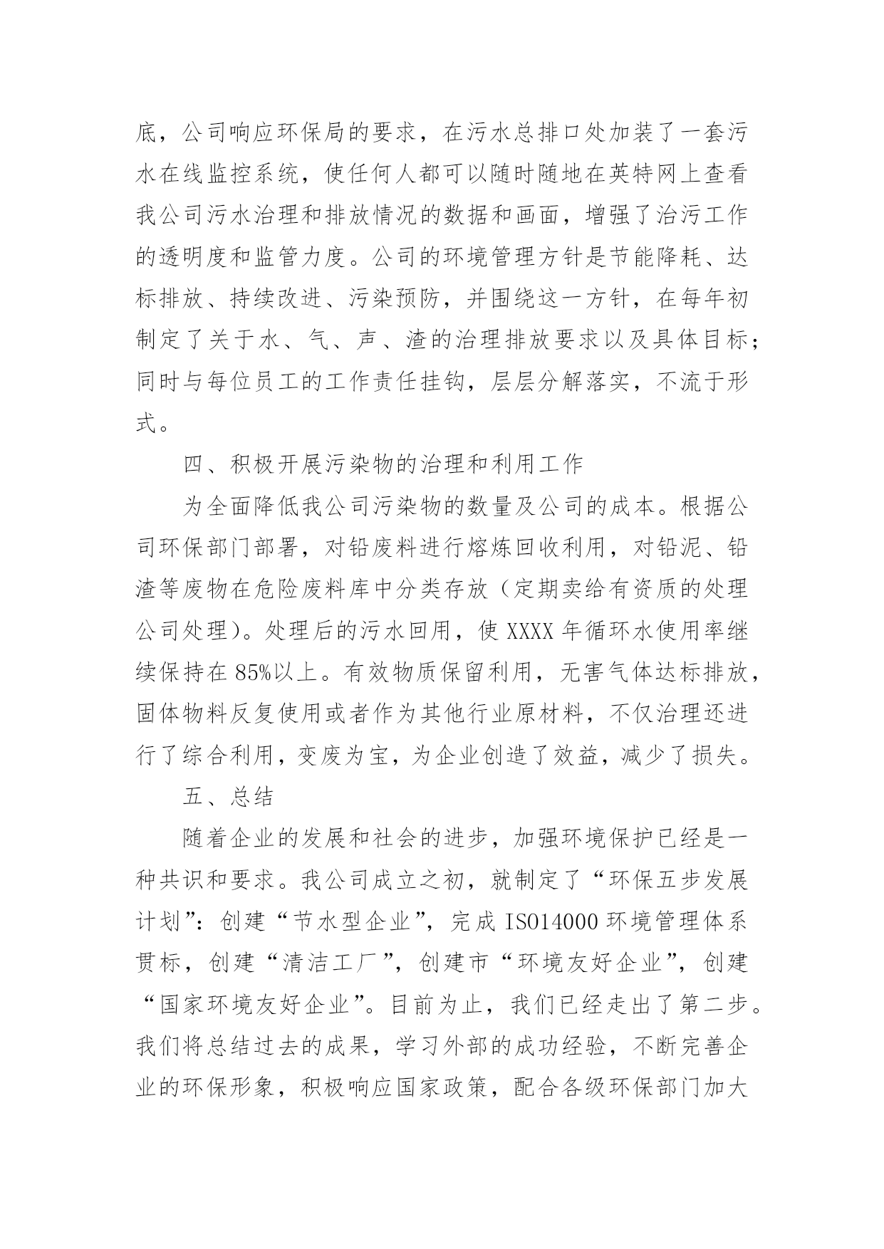 环保的工作总结环保的工作总结(精选7篇)充实的工作生活一不留神就过去了,经过这段时间的努力后,我们在不断的成长中得到了更多的进步,想必我们需要写好工作总结了。那么写工作总结真的很难吗?以下是小编帮大家整理的环保的工作总结(精选7篇),欢迎大家借鉴与参考,希望对大家有所帮助。环保的工作总结1XXXX有限公司是全密闭免维护铅酸蓄电池生产企业,20XX年产值XXXX万元。在企业发展短短的几年中,环境保护工作占据着重要的篇章。经过全公司上下的不断的努力、改进提高,公司在节能降耗、达标排放等方面取得了很大的发展和进步,各项指标均能达到国家和省级的环保标准,并于20XX年X月份通过了ISO14000/ISO18000/ISO9001三个管理体系的认证。20XX年以来,公司环境保护工作在市委、市政府、市环委会、市环保局、区环保局的领导下,取得了一定的成绩,实实在在地做了大量、细致的工作,公司综合环境得到了进一步的改善,没有发生一起环境污染事件。现就一些具体工作总结如下:一、完善环境保护管理网络,加强责任制建设。去年,遵照环保部门下达的环境保护工作目标任务,结合公司实际,以文件的形式下达了公司所属各部门年度环境保护工作目标任务。根据要求,在进一步明确环境保护工作由所属各部门、总经理负责制的`基础上,又充实了各级兼职环保员,具体负责各辖区内的环保各项工作。(具体行动?)二、加强宣传、培训工作,强化环境保护的意识。组织人员参加了有关部门组织的环保专题会议;并在公司内部做了大力宣传。在全公司营造了保护环境、全民参与的浓烈氛围,让环保走进了我们的生活、生产,让大家更深入全面地了解环保部门的职责、环境质量的状况、环境保护工作的任重道远。同时我们以“422”地球日、“65”世界环境日、科普宣传周为契机,广泛开展了环保宣传工作,悬挂横幅,制作了环保宣传站牌,张贴环保宣传标语等。公司花费了20多万元对厂区内90%以上空场地都进行了绿化,并每年花8万元请绿化公司专人养护。我们以让员工走进公司大门给人以花园式工厂的感觉为目标,今后还要在厂区内进一步规划绿化。三、坚持环保工作,做好外请监督内抓管理。去年7月,在通过了ISO14000环境管理体系后,我公司再次邀请了“XXXX环境资源管理咨询有限公司”组织人员对我公司现场进行环境影响考察。检查小组在重点检查了去年考察时提出的问题的改进情况后,进行了下一轮的环境、健康与安全评估,提出了许多更深层次的问题。此活动进一步强化了现场检查力度,增强了企业员工的环境意识,优化了我们的生活工作环境,引入了更先进的管理概念。去年年底,公司响应环保局的要求,在污水总排口处加装了一套污水在线监控系统,使任何人都可以随时随地在英特网上查看我公司污水治理和排放情况的数据和画面,增强了治污工作的透明度和监管力度。公司的环境管理方针是节能降耗、达标排放、持续改进、污染预防,并围绕这一方针,在每年初制定了关于水、气、声、渣的治理排放要求以及具体目标;同时与每位员工的工作责任挂钩,层层分解落实,不流于形式。四、积极开展污染物的治理和利用工作为全面降低我公司污染物的数量及公司的成本。根据公司环保部门部署,对铅废料进行熔炼回收利用,对铅泥、铅渣等废物在危险废料库中分类存放(定期卖给有资质的处理公司处理)。处理后的污水回用,使XXXX年循环水使用率继续保持在85%以上。有效物质保留利用,无害气体达标排放,固体物料反复使用或者作为其他行业原材料,不仅治理还进行了综合利用,变废为宝,为企业创造了效益,减少了损失。五、总结随着企业的发展和社会的进步,加强环境保护已经是一种共识和要求。我公司成立之初,就制定了“环保五步发展计划”:创建“节水型企业”,完成ISO14000环境管理体系贯标,创建“清洁工厂”,创建市“环境友好企业”,创建“国家环境友好企业”。目前为止,我们已经走出了第二步。我们将总结过去的成果,学习外部的成功经验,不断完善企业的环保形象,积极响应国家政策,配合各级环保部门加大力度,实事求是抓好企业经济发展的同时,抓好企业的环保治理,长抓不懈,创造明天的环保企业。环保的工作总结2一、优化人员配置,提高办公效率为适应我镇经济持续高速发展的需要,今年上半年,我所人员作了调整和充实,工作人员由过去的9个人增加至现在的xx个人,XX年工作总结(环保)。按照各人的所学的专业几个人特点进行分工、调整,使每个人都能扬长避短,人尽其才。我所把日常工作分成办公室、监理信访、实验室、电镀区整改小组等几个功能组。明确了分工,使工作安排条理化。此外,对于新加入的同事,发挥他们的专业所长,安排负责两个污水厂的日常监督工作。另外,为了方便群众办理业务,我们在办公室设立咨询窗口,负责提供环保法律法规、环保立项、排污收费依据和标准等咨询工作。并对排污收费的依据和标准,建设项目环评
