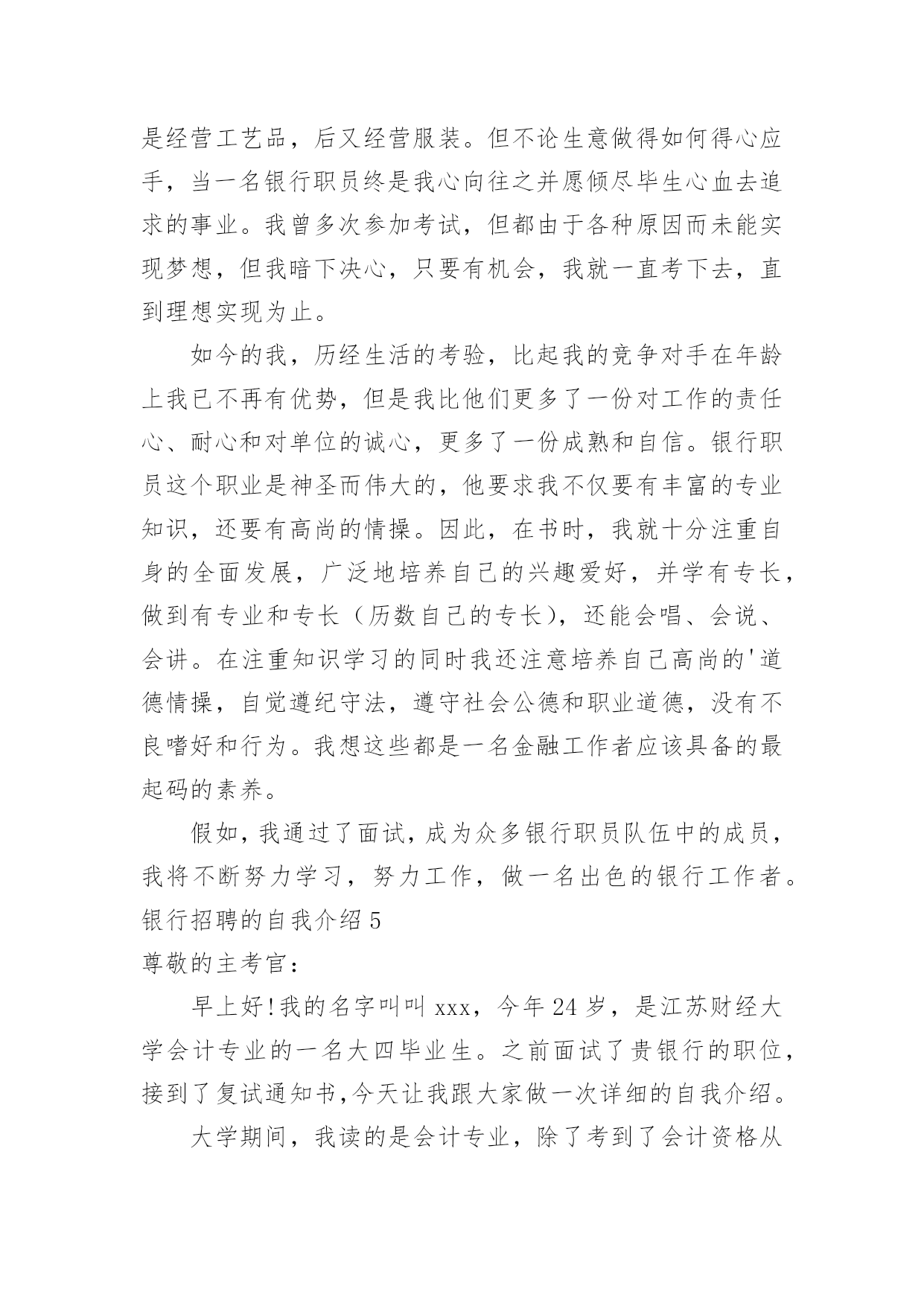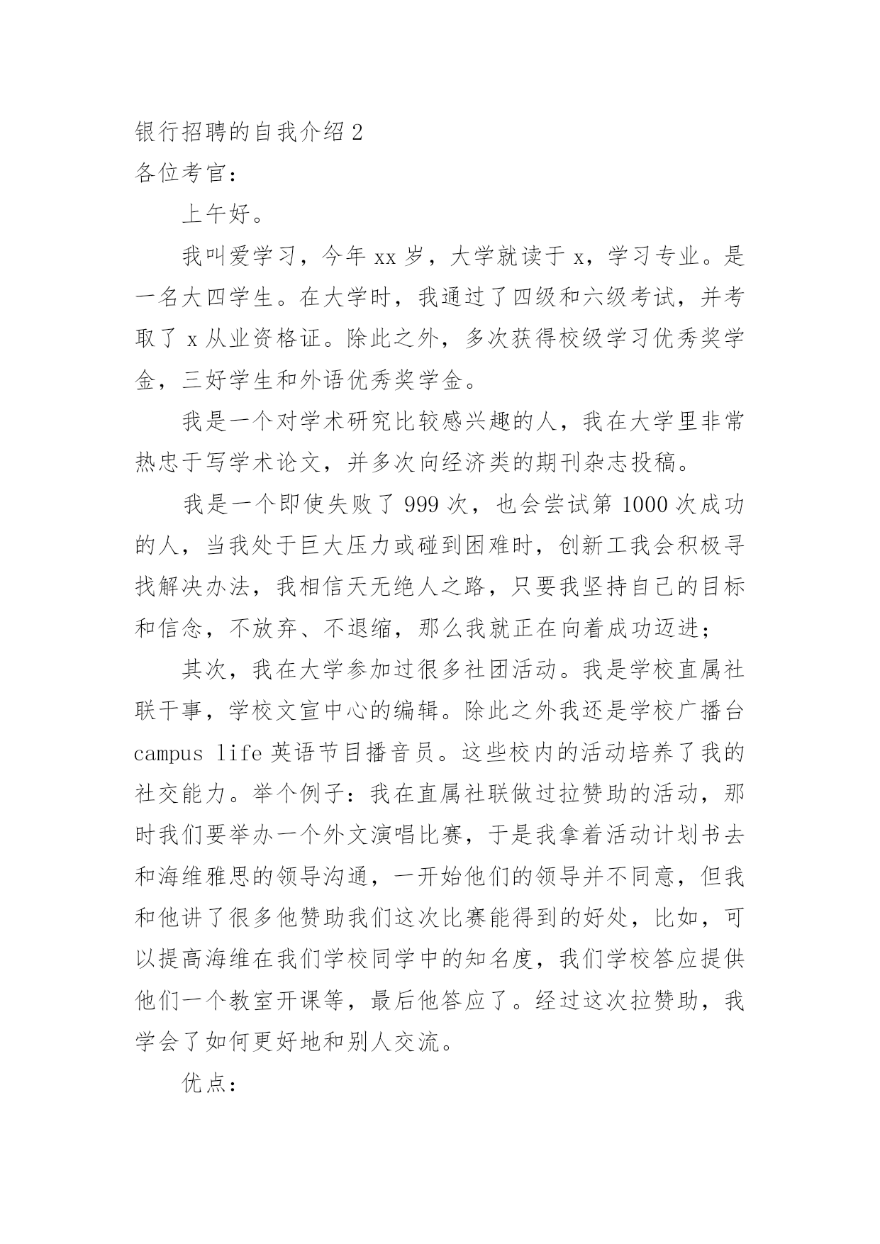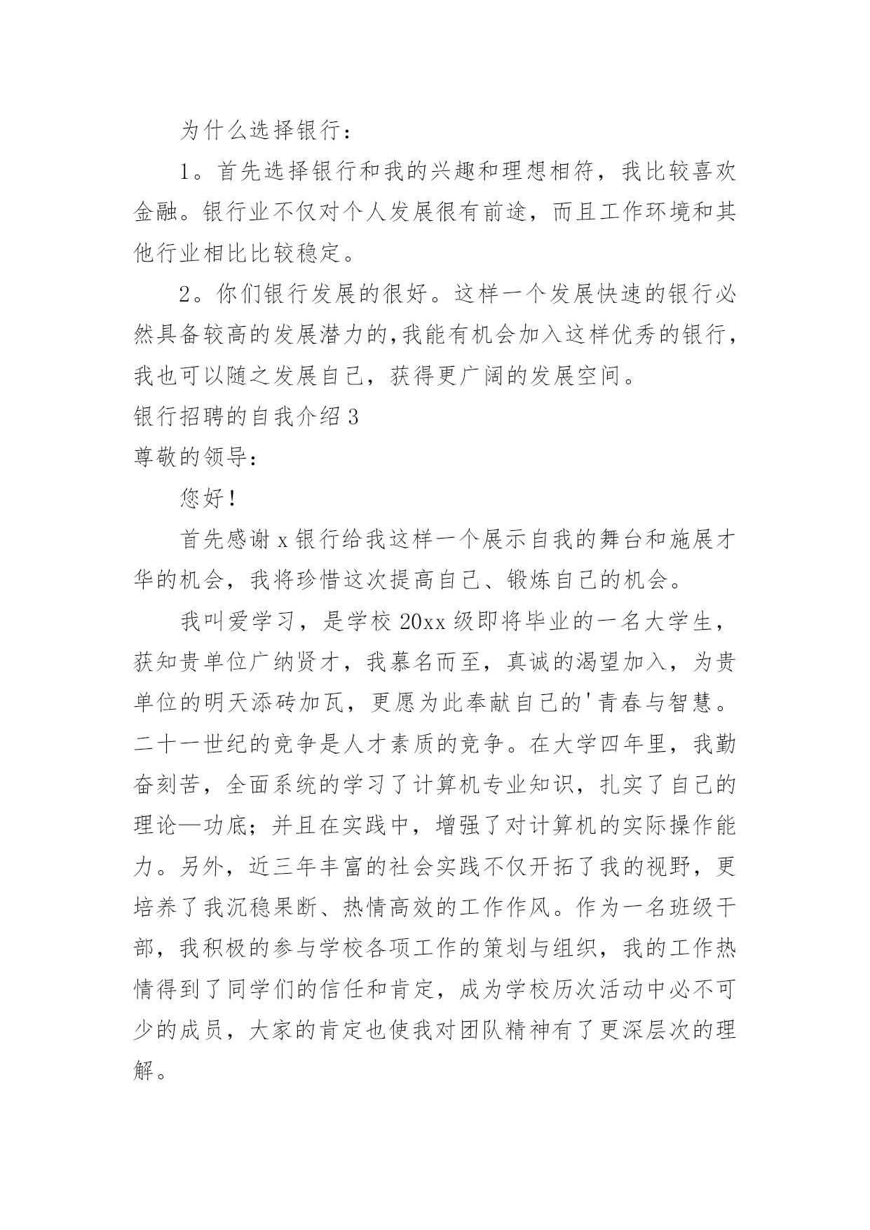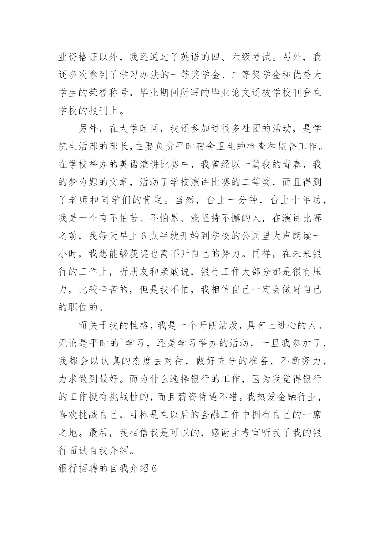 银行招聘的自我介绍银行招聘的自我介绍当到达一个陌生的环境后,常常要进行自我介绍,自我介绍是结识新朋友的重要手段。那么你真的会写自我介绍吗?下面是小编精心整理的银行招聘的自我介绍,仅供参考,大家一起来看看吧。银行招聘的自我介绍1各位考官:你们好!我叫xxx,今年x岁。毕业xxx于。我性格活泼开朗,大方热情,乐于助人,平时喜欢阅读、看书和上网流览信息。我曾经在学校参加过银行实习,在实习期间我严格按照正式银行的标准来要求自己。我深入学习,和他们相处融洽,和他们一起学习了各种知识,掌握了一定的'银行技巧,也对银行工作有了一定的认识,找到了自己的银行学习一套方法。同时,在实习当中,身边银行无私奉献的精神和天真、求知若渴,勤奋的学习态度深深地感染了我。我也深深体会到了作为一名银行的乐趣和重要意义,更加坚定了自己做一名银行的决心,成为一名银行也成了我的愿望。银行招聘的自我介绍2各位考官:上午好。我叫爱学习,今年xx岁,大学就读于x,学习专业。是一名大四学生。在大学时,我通过了四级和六级考试,并考取了x从业资格证。除此之外,多次获得校级学习优秀奖学金,三好学生和外语优秀奖学金。我是一个对学术研究比较感兴趣的人,我在大学里非常热忠于写学术论文,并多次向经济类的期刊杂志投稿。我是一个即使失败了999次,也会尝试第1000次成功的人,当我处于巨大压力或碰到困难时,创新工我会积极寻找解决办法,我相信天无绝人之路,只要我坚持自己的目标和信念,不放弃、不退缩,那么我就正在向着成功迈进;其次,我在大学参加过很多社团活动。我是学校直属社联干事,学校文宣中心的编辑。除此之外我还是学校广播台campuslife英语节目播音员。这些校内的活动培养了我的社交能力。举个例子:我在直属社联做过拉赞助的活动,那时我们要举办一个外文演唱比赛,于是我拿着活动计划书去和海维雅思的领导沟通,一开始他们的领导并不同意,但我和他讲了很多他赞助我们这次比赛能得到的好处,比如,可以提高海维在我们学校同学中的知名度,我们学校答应提供他们一个教室开课等,最后他答应了。经过这次拉赞助,我学会了如何更好地和别人交流。优点:我是一个乐观向上,勤奋刻苦的人。我对待学习和工作认真负责,耐心细致,有条理。我很不喜欢做事情求个大概,我觉得既然这件事是我的任务,那我一定要尽自己的能力做的最好,做的最精确,一步一个脚印地去做。在我看来,成功的人必须要对自己狠一点,比如苹果创始人乔布斯,之所以苹果公司会如此壮大,和他本人那种追求完美和精准的性格是分不开的`。大学有很多外教课,和许多中国老师不同的是:外教经常布置小组作业,这培养了我很好的团队合作意识。正所谓三个臭皮匠,顶个诸葛亮。我觉得某种意义上,合作可能更容易达到共赢。我在初中时强化训练过五笔打字法,因为一般平时绝大部分的学生都只会用拼音打字法,虽然有一段时间没练五笔字打字法,但我相信和别人相比,我熟悉起来更快。缺点:我的缺点是经验不足,作为一个应届毕业生,我只是有过一些实习和兼职的经历。和其他的有经验的前辈比起来,需要多多学习。除此之外,我觉得我的学习不够,在大学里,学的最多的是些理论知识,交往的人也大都是同龄人,所以对于社会上的一些工作单位和为人处事之道只是略知一二。俗话说“学无止境”,我学到的知识远远不够,但我会在今后的时间里不仅多读书,并且学着去了解在社会上,在单位里为人处事之道,为什么选择银行:1。首先选择银行和我的兴趣和理想相符,我比较喜欢金融。银行业不仅对个人发展很有前途,而且工作环境和其他行业相比比较稳定。2。你们银行发展的很好。这样一个发展快速的银行必然具备较高的发展潜力的,我能有机会加入这样优秀的银行,我也可以随之发展自己,获得更广阔的发展空间。银行招聘的自我介绍3尊敬的领导:您好!首先感谢x银行给我这样一个展示自我的舞台和施展才华的机会,我将珍惜这次提高自己、锻炼自己的机会。我叫爱学习,是学校20xx级即将毕业的一名大学生,获知贵单位广纳贤才,我慕名而至,真诚的渴望加入,为贵单位的明天添砖加瓦,更愿为此奉献自己的'青春与智慧。二十一世纪的竞争是人才素质的竞争。在大学四年里,我勤奋刻苦,全面系统的学习了计算机专业知识,扎实了自己的理论—功底;并且在实践中,增强了对计算机的实际操作能力。另外,近三年丰富的社会实践不仅开拓了我的视野,更培养了我沉稳果断、热情高效的工作作风。作为一名班级干部,我积极的参与学校各项工作的策划与组织,我的工作热情得到了同学们的信任和肯定,成为学校历次活动中必不可少的成员,大家的肯定也使我对团队精神有了更深层次的理解。现在,正值大学毕业之际,我渴望能在更广阔的天空里展现自己的才能,我不满足于现有的知识水平,渴望在质上有一个飞跃,我愿意尝试新的工作,通过我的想象力、创造力,一定能激发百倍的工作灵感。相信我的真诚,我会