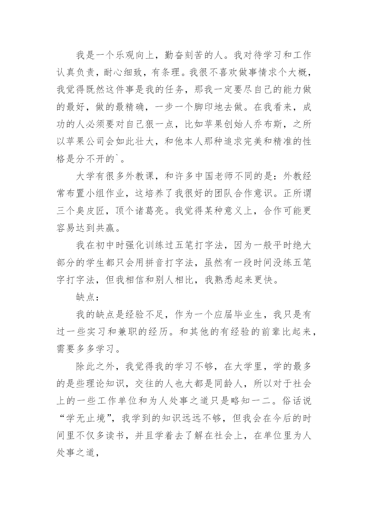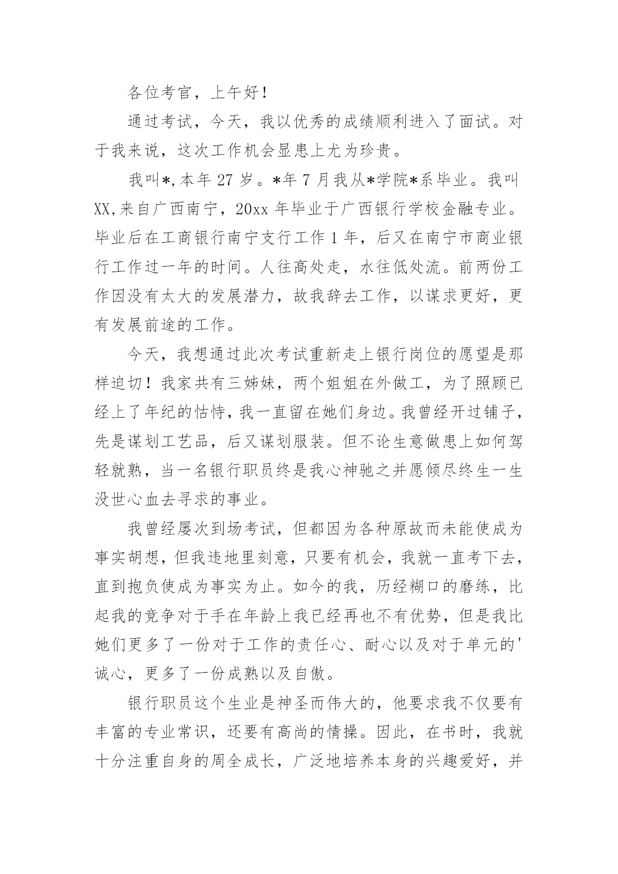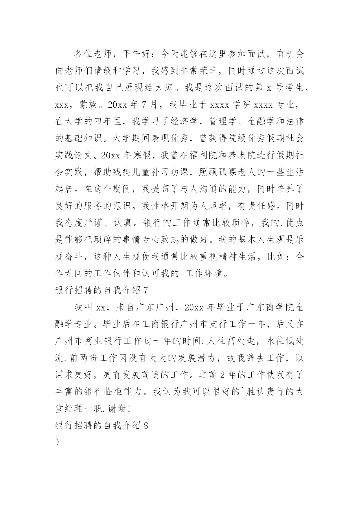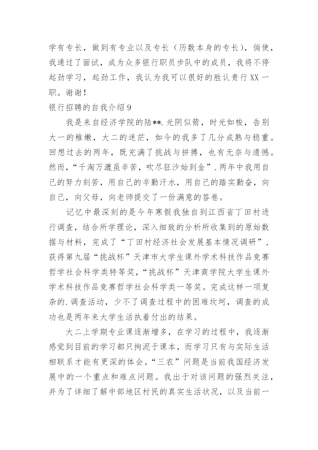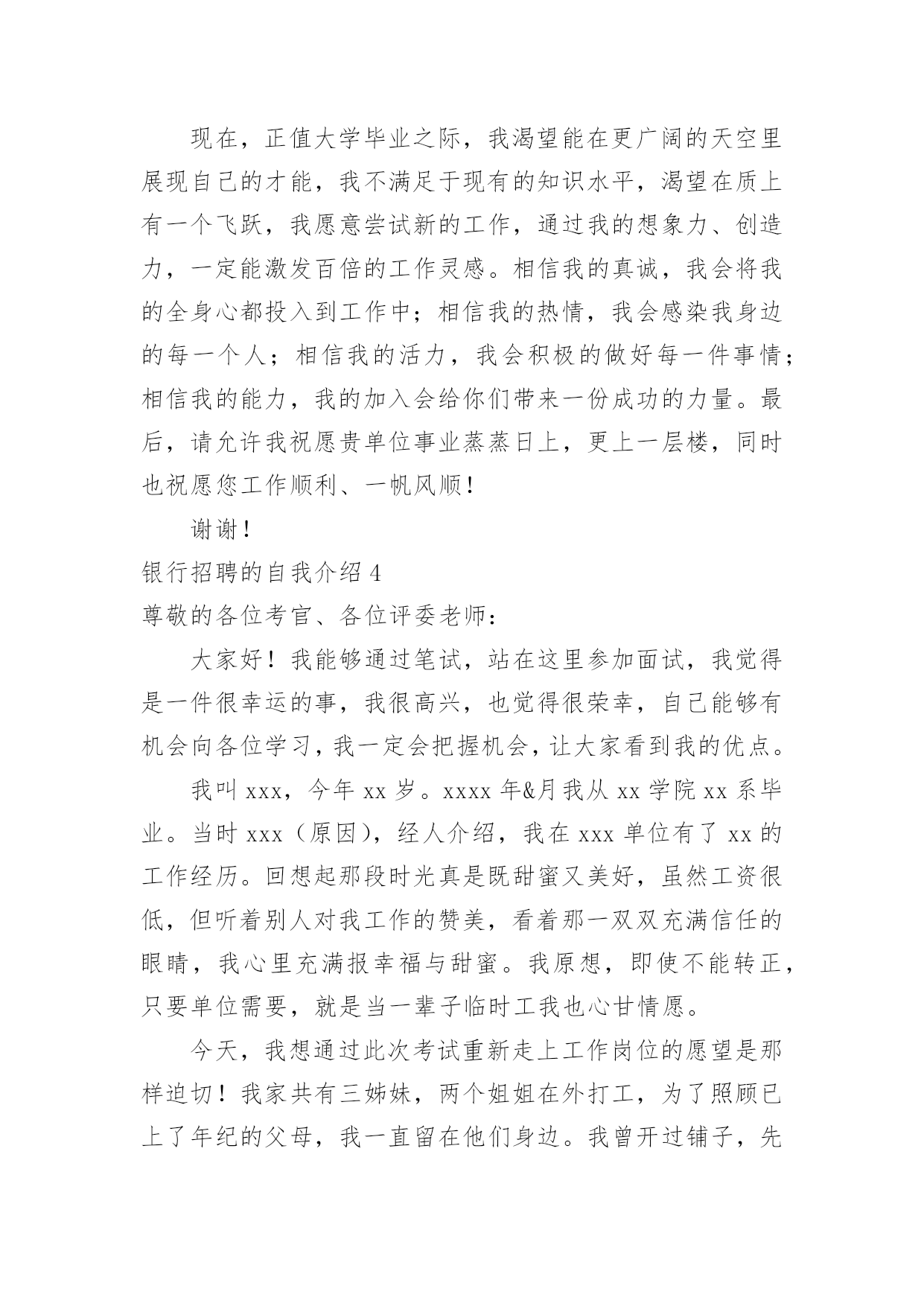 银行招聘的自我介绍银行招聘的自我介绍当到达一个陌生的环境后,常常要进行自我介绍,自我介绍是结识新朋友的重要手段。那么你真的会写自我介绍吗?下面是小编精心整理的银行招聘的自我介绍,仅供参考,大家一起来看看吧。银行招聘的自我介绍1各位考官:你们好!我叫xxx,今年x岁。毕业xxx于。我性格活泼开朗,大方热情,乐于助人,平时喜欢阅读、看书和上网流览信息。我曾经在学校参加过银行实习,在实习期间我严格按照正式银行的标准来要求自己。我深入学习,和他们相处融洽,和他们一起学习了各种知识,掌握了一定的'银行技巧,也对银行工作有了一定的认识,找到了自己的银行学习一套方法。同时,在实习当中,身边银行无私奉献的精神和天真、求知若渴,勤奋的学习态度深深地感染了我。我也深深体会到了作为一名银行的乐趣和重要意义,更加坚定了自己做一名银行的决心,成为一名银行也成了我的愿望。银行招聘的自我介绍2各位考官:上午好。我叫爱学习,今年xx岁,大学就读于x,学习专业。是一名大四学生。在大学时,我通过了四级和六级考试,并考取了x从业资格证。除此之外,多次获得校级学习优秀奖学金,三好学生和外语优秀奖学金。我是一个对学术研究比较感兴趣的人,我在大学里非常热忠于写学术论文,并多次向经济类的期刊杂志投稿。我是一个即使失败了999次,也会尝试第1000次成功的人,当我处于巨大压力或碰到困难时,创新工我会积极寻找解决办法,我相信天无绝人之路,只要我坚持自己的目标和信念,不放弃、不退缩,那么我就正在向着成功迈进;其次,我在大学参加过很多社团活动。我是学校直属社联干事,学校文宣中心的编辑。除此之外我还是学校广播台campuslife英语节目播音员。这些校内的活动培养了我的社交能力。举个例子:我在直属社联做过拉赞助的活动,那时我们要举办一个外文演唱比赛,于是我拿着活动计划书去和海维雅思的领导沟通,一开始他们的领导并不同意,但我和他讲了很多他赞助我们这次比赛能得到的好处,比如,可以提高海维在我们学校同学中的知名度,我们学校答应提供他们一个教室开课等,最后他答应了。经过这次拉赞助,我学会了如何更好地和别人交流。优点:我是一个乐观向上,勤奋刻苦的人。我对待学习和工作认真负责,耐心细致,有条理。我很不喜欢做事情求个大概,我觉得既然这件事是我的任务,那我一定要尽自己的能力做的最好,做的最精确,一步一个脚印地去做。在我看来,成功的人必须要对自己狠一点,比如苹果创始人乔布斯,之所以苹果公司会如此壮大,和他本人那种追求完美和精准的性格是分不开的`。大学有很多外教课,和许多中国老师不同的是:外教经常布置小组作业,这培养了我很好的团队合作意识。正所谓三个臭皮匠,顶个诸葛亮。我觉得某种意义上,合作可能更容易达到共赢。我在初中时强化训练过五笔打字法,因为一般平时绝大部分的学生都只会用拼音打字法,虽然有一段时间没练五笔字打字法,但我相信和别人相比,我熟悉起来更快。缺点:我的缺点是经验不足,作为一个应届毕业生,我只是有过一些实习和兼职的经历。和其他的有经验的前辈比起来,需要多多学习。除此之外,我觉得我的学习不够,在大学里,学的最多的是些理论知识,交往的人也大都是同龄人,所以对于社会上的一些工作单位和为人处事之道只是略知一二。俗话说“学无止境”,我学到的知识远远不够,但我会在今后的时间里不仅多读书,并且学着去了解在社会上,在单位里为人处事之道,为什么选择银行:1。首先选择银行和我的兴趣和理想相符,我比较喜欢金融。银行业不仅对个人发展很有前途,而且工作环境和其他行业相比比较稳定。2。你们银行发展的很好。这样一个发展快速的银行必然具备较高的发展潜力的,我能有机会加入这样优秀的银行,我也可以随之发展自己,获得更广阔的发展空间。银行招聘的自我介绍3尊敬的领导:您好!首先感谢x银行给我这样一个展示自我的舞台和施展才华的机会,我将珍惜这次提高自己、锻炼自己的机会。我叫爱学习,是学校20xx级即将毕业的一名大学生,获知贵单位广纳贤才,我慕名而至,真诚的渴望加入,为贵单位的明天添砖加瓦,更愿为此奉献自己的'青春与智慧。二十一世纪的竞争是人才素质的竞争。在大学四年里,我勤奋刻苦,全面系统的学习了计算机专业知识,扎实了自己的理论—功底;并且在实践中,增强了对计算机的实际操作能力。另外,近三年丰富的社会实践不仅开拓了我的视野,更培养了我沉稳果断、热情高效的工作作风。作为一名班级干部,我积极的参与学校各项工作的策划与组织,我的工作热情得到了同学们的信任和肯定,成为学校历次活动中必不可少的成员,大家的肯定也使我对团队精神有了更深层次的理解。现在,正值大学毕业之际,我渴望能在更广阔的天空里展现自己的才能,我不满足于现有的知识水平,渴望在质上有一个飞跃,我愿意尝试新的工作,通过我的想象力、创造力,一定能激发百倍的工作灵感。相信我的真诚,我会
