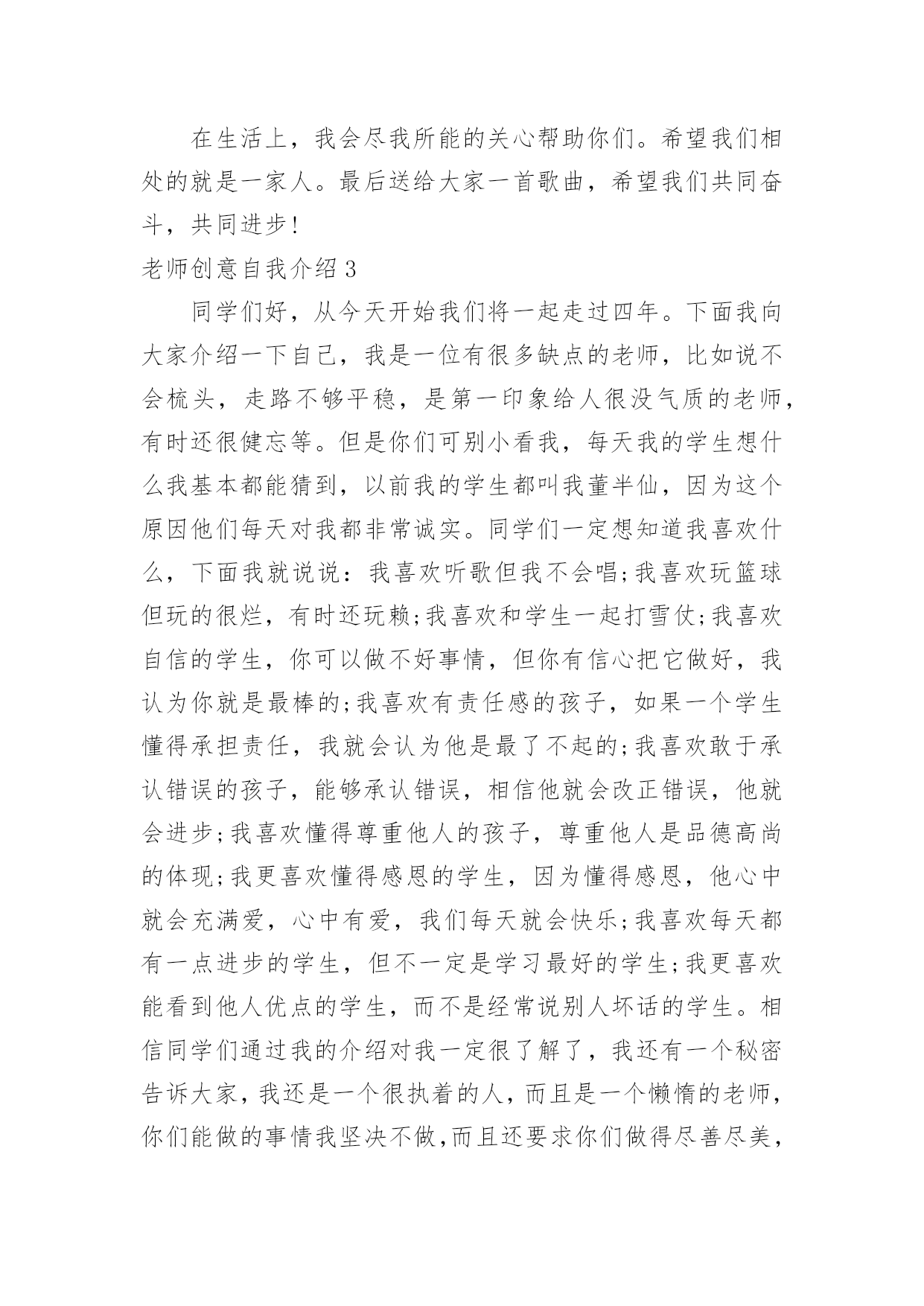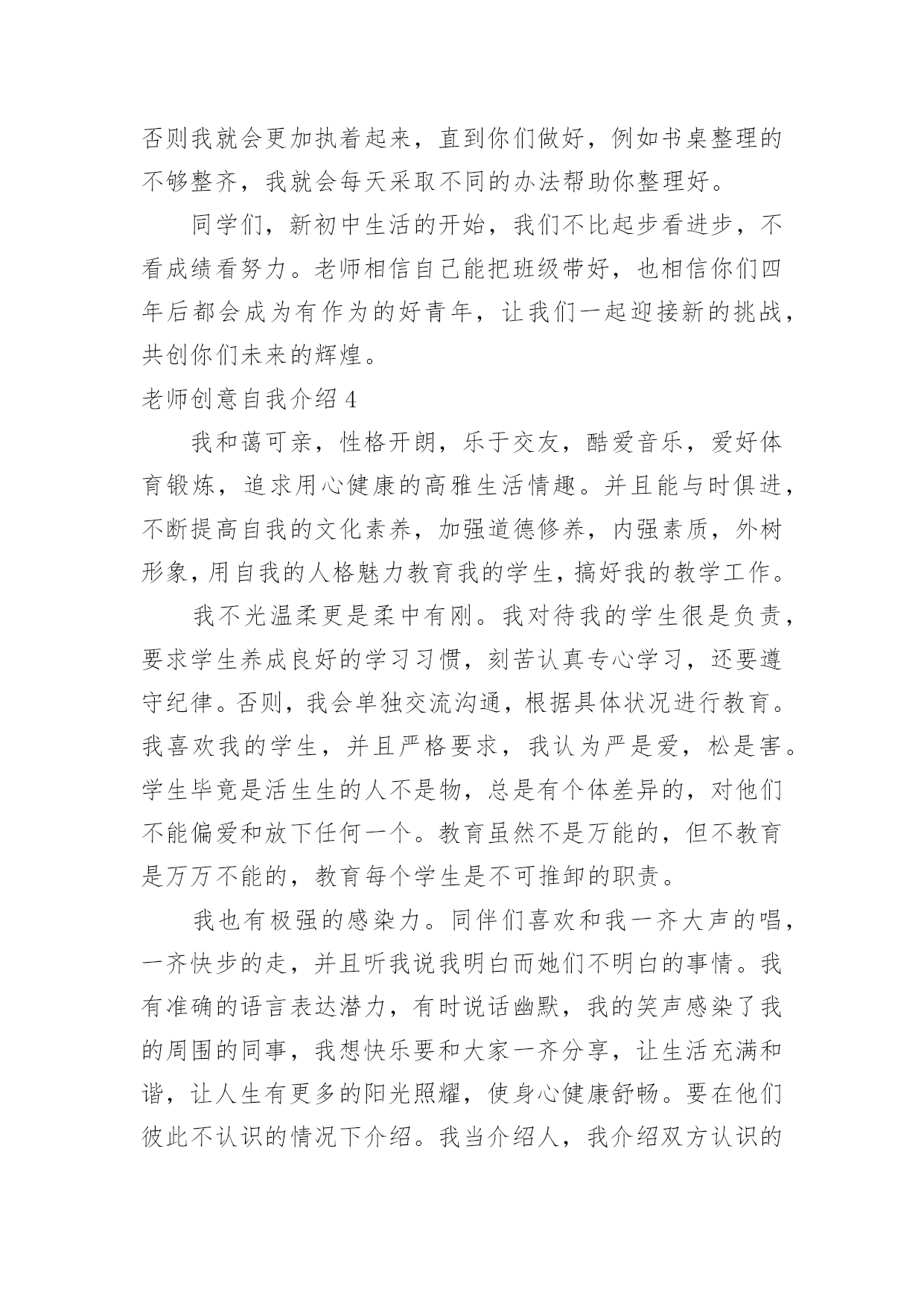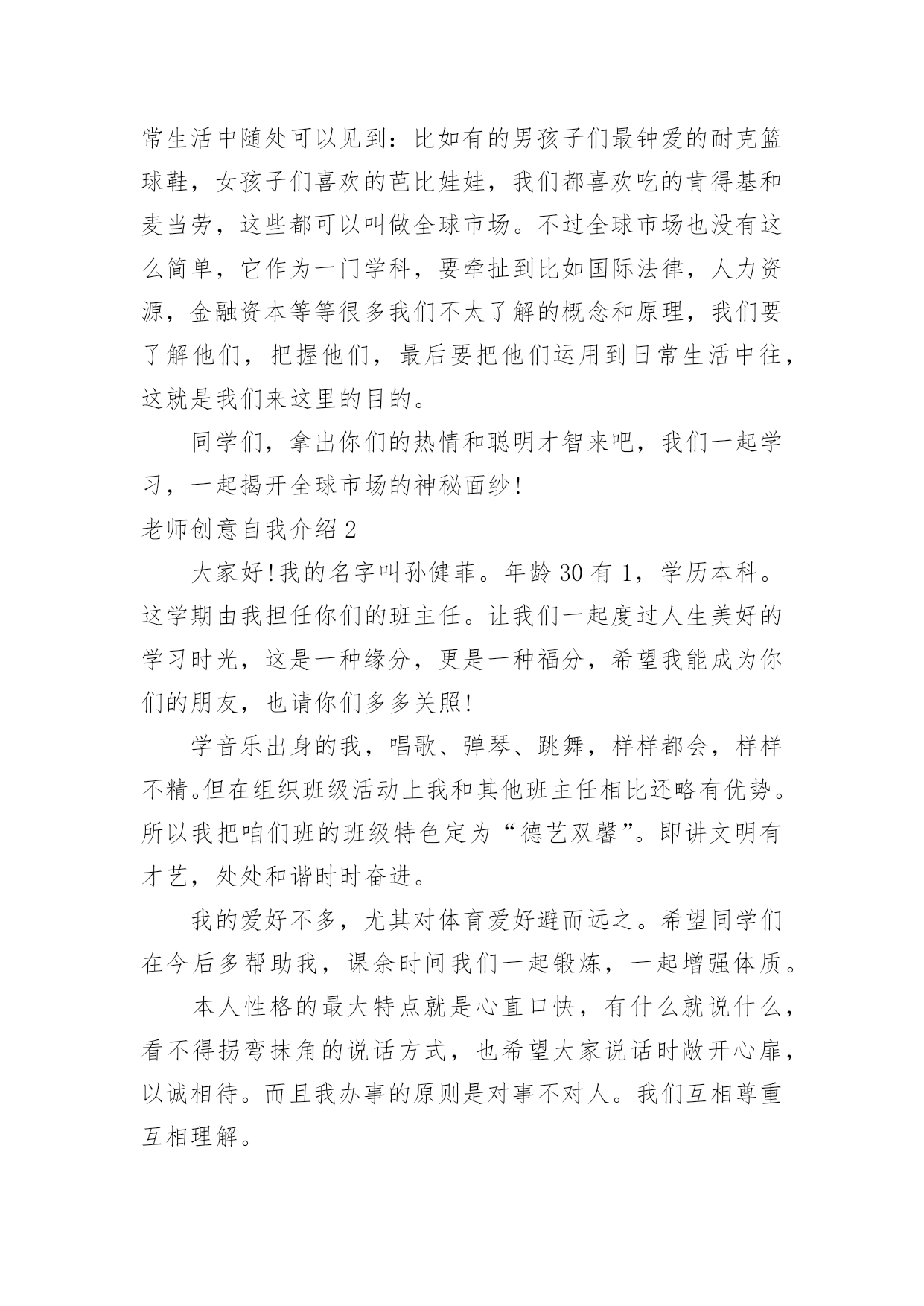 老师创意自我介绍老师创意自我介绍处在一个陌生场合时,我们不得不需要向他人介绍自己,自我介绍是一展示自己的手段。那么自我介绍有什么格式呢?下面是小编为大家收集的老师创意自我介绍,欢迎大家分享。老师创意自我介绍1同学们大家好!很兴奋熟悉大家,固然我们都是初次见面,但我已经迫不及待想要熟悉每一位同学了!首先让我先容下自己吧:我叫李,你们可以叫我李老师,但我更喜欢大家叫我姐,只要不要叫我阿姨就行了。我来自中国科学院电工研究所,天天打交道的东西是如何把我们身边无所不在却又变化莫测的风能变为我们无时无刻不在使用的电能,是不是听起来很玄妙啊!我一开始也是这么以为的,慢慢接触多了才知道无论什么领域的学问,都是从我们生活中最简单的事物和现象开始一步一步积累和发展起来的。就像这学期我们要和大家一同学习的《JA全球市场》这门课,同学们可能一听到这个名字就会产生很多疑问:市场是什么?看不见摸不着;全球市场又是什么?我连国还没出过呢,从小到大就见过那么几个扳着指头就能算过来外国人,这离我太远远了吧!实在同学们不知道,全球市场在我们日常生活中随处可以见到:比如有的男孩子们最钟爱的耐克篮球鞋,女孩子们喜欢的芭比娃娃,我们都喜欢吃的肯得基和麦当劳,这些都可以叫做全球市场。不过全球市场也没有这么简单,它作为一门学科,要牵扯到比如国际法律,人力资源,金融资本等等很多我们不太了解的概念和原理,我们要了解他们,把握他们,最后要把他们运用到日常生活中往,这就是我们来这里的目的。同学们,拿出你们的热情和聪明才智来吧,我们一起学习,一起揭开全球市场的神秘面纱!老师创意自我介绍2大家好!我的名字叫孙健菲。年龄30有1,学历本科。这学期由我担任你们的班主任。让我们一起度过人生美好的学习时光,这是一种缘分,更是一种福分,希望我能成为你们的朋友,也请你们多多关照!学音乐出身的我,唱歌、弹琴、跳舞,样样都会,样样不精。但在组织班级活动上我和其他班主任相比还略有优势。所以我把咱们班的班级特色定为“德艺双馨”。即讲文明有才艺,处处和谐时时奋进。我的爱好不多,尤其对体育爱好避而远之。希望同学们在今后多帮助我,课余时间我们一起锻炼,一起增强体质。本人性格的最大特点就是心直口快,有什么就说什么,看不得拐弯抹角的说话方式,也希望大家说话时敞开心扉,以诚相待。而且我办事的原则是对事不对人。我们互相尊重互相理解。在生活上,我会尽我所能的关心帮助你们。希望我们相处的就是一家人。最后送给大家一首歌曲,希望我们共同奋斗,共同进步!老师创意自我介绍3同学们好,从今天开始我们将一起走过四年。下面我向大家介绍一下自己,我是一位有很多缺点的老师,比如说不会梳头,走路不够平稳,是第一印象给人很没气质的老师,有时还很健忘等。但是你们可别小看我,每天我的学生想什么我基本都能猜到,以前我的学生都叫我董半仙,因为这个原因他们每天对我都非常诚实。同学们一定想知道我喜欢什么,下面我就说说:我喜欢听歌但我不会唱;我喜欢玩篮球但玩的很烂,有时还玩赖;我喜欢和学生一起打雪仗;我喜欢自信的学生,你可以做不好事情,但你有信心把它做好,我认为你就是最棒的;我喜欢有责任感的孩子,如果一个学生懂得承担责任,我就会认为他是最了不起的;我喜欢敢于承认错误的孩子,能够承认错误,相信他就会改正错误,他就会进步;我喜欢懂得尊重他人的孩子,尊重他人是品德高尚的体现;我更喜欢懂得感恩的学生,因为懂得感恩,他心中就会充满爱,心中有爱,我们每天就会快乐;我喜欢每天都有一点进步的学生,但不一定是学习最好的学生;我更喜欢能看到他人优点的学生,而不是经常说别人坏话的学生。相信同学们通过我的介绍对我一定很了解了,我还有一个秘密告诉大家,我还是一个很执着的人,而且是一个懒惰的老师,你们能做的事情我坚决不做,而且还要求你们做得尽善尽美,否则我就会更加执着起来,直到你们做好,例如书桌整理的不够整齐,我就会每天采取不同的办法帮助你整理好。同学们,新初中生活的开始,我们不比起步看进步,不看成绩看努力。老师相信自己能把班级带好,也相信你们四年后都会成为有作为的好青年,让我们一起迎接新的挑战,共创你们未来的辉煌。老师创意自我介绍4我和蔼可亲,性格开朗,乐于交友,酷爱音乐,爱好体育锻炼,追求用心健康的高雅生活情趣。并且能与时俱进,不断提高自我的文化素养,加强道德修养,内强素质,外树形象,用自我的人格魅力教育我的学生,搞好我的教学工作。我不光温柔更是柔中有刚。我对待我的学生很是负责,要求学生养成良好的学习习惯,刻苦认真专心学习,还要遵守纪律。否则,我会单独交流沟通,根据具体状况进行教育。我喜欢我的学生,并且严格要求,我认为严是爱,松是害。学生毕竟是活生生的人不是物,总是有个体差异的,对他们不能偏爱和放下任何一个。教育虽然不是万能的,但不教育是万万不能的,教育每个学生是不可推卸的职