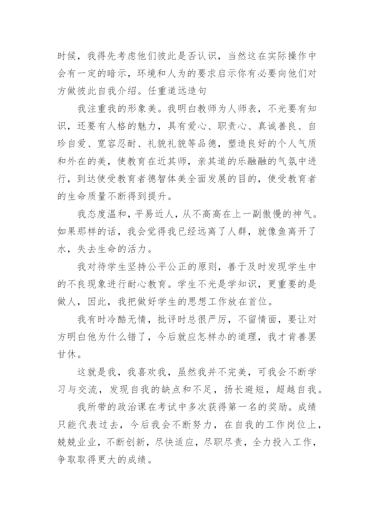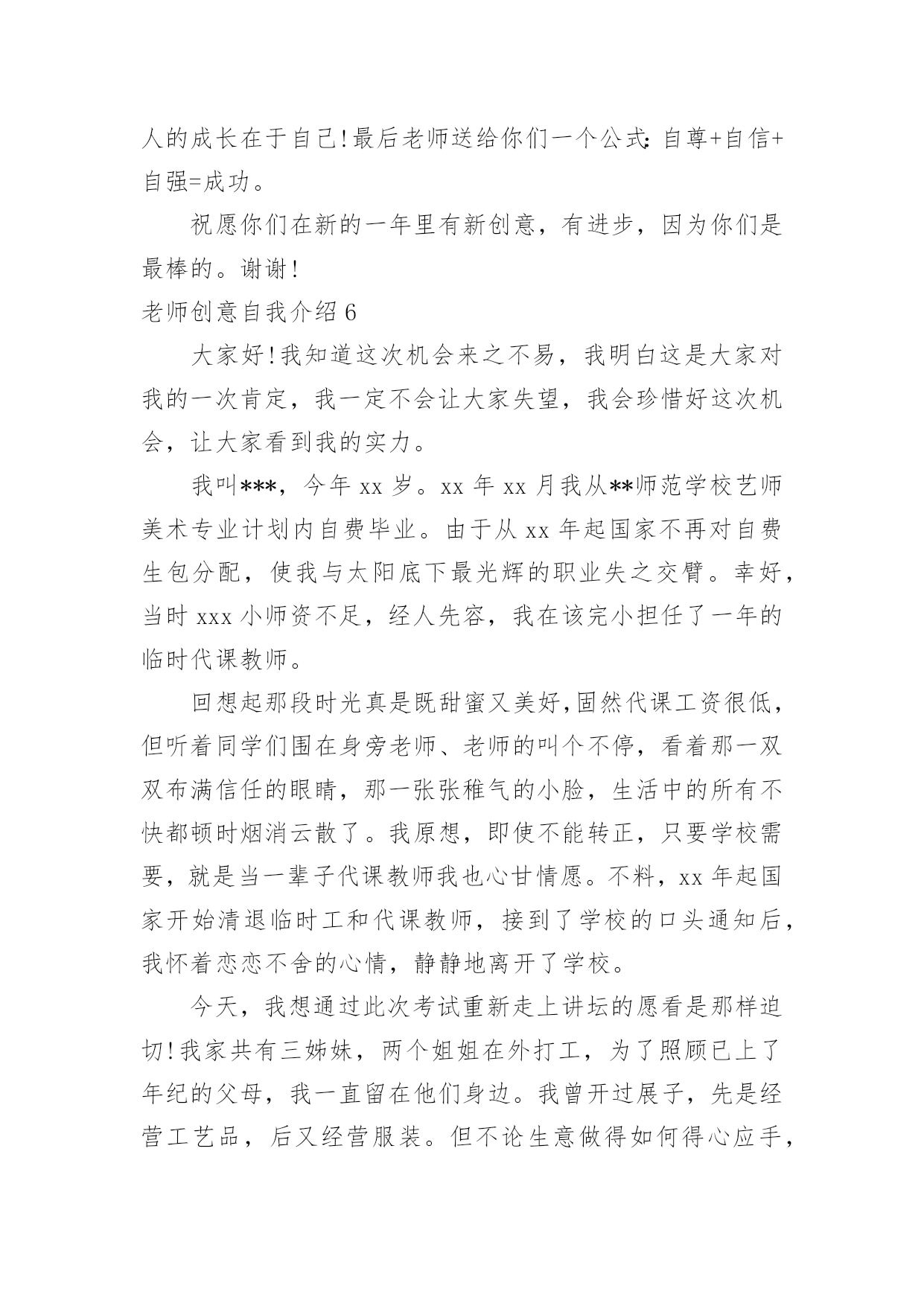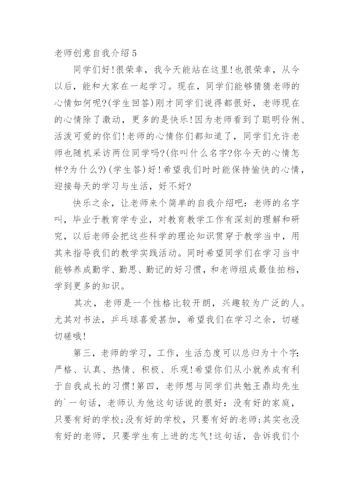 老师创意自我介绍老师创意自我介绍处在一个陌生场合时,我们不得不需要向他人介绍自己,自我介绍是一展示自己的手段。那么自我介绍有什么格式呢?下面是小编为大家收集的老师创意自我介绍,欢迎大家分享。老师创意自我介绍1同学们大家好!很兴奋熟悉大家,固然我们都是初次见面,但我已经迫不及待想要熟悉每一位同学了!首先让我先容下自己吧:我叫李,你们可以叫我李老师,但我更喜欢大家叫我姐,只要不要叫我阿姨就行了。我来自中国科学院电工研究所,天天打交道的东西是如何把我们身边无所不在却又变化莫测的风能变为我们无时无刻不在使用的电能,是不是听起来很玄妙啊!我一开始也是这么以为的,慢慢接触多了才知道无论什么领域的学问,都是从我们生活中最简单的事物和现象开始一步一步积累和发展起来的。就像这学期我们要和大家一同学习的《JA全球市场》这门课,同学们可能一听到这个名字就会产生很多疑问:市场是什么?看不见摸不着;全球市场又是什么?我连国还没出过呢,从小到大就见过那么几个扳着指头就能算过来外国人,这离我太远远了吧!实在同学们不知道,全球市场在我们日常生活中随处可以见到:比如有的男孩子们最钟爱的耐克篮球鞋,女孩子们喜欢的芭比娃娃,我们都喜欢吃的肯得基和麦当劳,这些都可以叫做全球市场。不过全球市场也没有这么简单,它作为一门学科,要牵扯到比如国际法律,人力资源,金融资本等等很多我们不太了解的概念和原理,我们要了解他们,把握他们,最后要把他们运用到日常生活中往,这就是我们来这里的目的。同学们,拿出你们的热情和聪明才智来吧,我们一起学习,一起揭开全球市场的神秘面纱!老师创意自我介绍2大家好!我的名字叫孙健菲。年龄30有1,学历本科。这学期由我担任你们的班主任。让我们一起度过人生美好的学习时光,这是一种缘分,更是一种福分,希望我能成为你们的朋友,也请你们多多关照!学音乐出身的我,唱歌、弹琴、跳舞,样样都会,样样不精。但在组织班级活动上我和其他班主任相比还略有优势。所以我把咱们班的班级特色定为“德艺双馨”。即讲文明有才艺,处处和谐时时奋进。我的爱好不多,尤其对体育爱好避而远之。希望同学们在今后多帮助我,课余时间我们一起锻炼,一起增强体质。本人性格的最大特点就是心直口快,有什么就说什么,看不得拐弯抹角的说话方式,也希望大家说话时敞开心扉,以诚相待。而且我办事的原则是对事不对人。我们互相尊重互相理解。在生活上,我会尽我所能的关心帮助你们。希望我们相处的就是一家人。最后送给大家一首歌曲,希望我们共同奋斗,共同进步!老师创意自我介绍3同学们好,从今天开始我们将一起走过四年。下面我向大家介绍一下自己,我是一位有很多缺点的老师,比如说不会梳头,走路不够平稳,是第一印象给人很没气质的老师,有时还很健忘等。但是你们可别小看我,每天我的学生想什么我基本都能猜到,以前我的学生都叫我董半仙,因为这个原因他们每天对我都非常诚实。同学们一定想知道我喜欢什么,下面我就说说:我喜欢听歌但我不会唱;我喜欢玩篮球但玩的很烂,有时还玩赖;我喜欢和学生一起打雪仗;我喜欢自信的学生,你可以做不好事情,但你有信心把它做好,我认为你就是最棒的;我喜欢有责任感的孩子,如果一个学生懂得承担责任,我就会认为他是最了不起的;我喜欢敢于承认错误的孩子,能够承认错误,相信他就会改正错误,他就会进步;我喜欢懂得尊重他人的孩子,尊重他人是品德高尚的体现;我更喜欢懂得感恩的学生,因为懂得感恩,他心中就会充满爱,心中有爱,我们每天就会快乐;我喜欢每天都有一点进步的学生,但不一定是学习最好的学生;我更喜欢能看到他人优点的学生,而不是经常说别人坏话的学生。相信同学们通过我的介绍对我一定很了解了,我还有一个秘密告诉大家,我还是一个很执着的人,而且是一个懒惰的老师,你们能做的事情我坚决不做,而且还要求你们做得尽善尽美,否则我就会更加执着起来,直到你们做好,例如书桌整理的不够整齐,我就会每天采取不同的办法帮助你整理好。同学们,新初中生活的开始,我们不比起步看进步,不看成绩看努力。老师相信自己能把班级带好,也相信你们四年后都会成为有作为的好青年,让我们一起迎接新的挑战,共创你们未来的辉煌。老师创意自我介绍4我和蔼可亲,性格开朗,乐于交友,酷爱音乐,爱好体育锻炼,追求用心健康的高雅生活情趣。并且能与时俱进,不断提高自我的文化素养,加强道德修养,内强素质,外树形象,用自我的人格魅力教育我的学生,搞好我的教学工作。我不光温柔更是柔中有刚。我对待我的学生很是负责,要求学生养成良好的学习习惯,刻苦认真专心学习,还要遵守纪律。否则,我会单独交流沟通,根据具体状况进行教育。我喜欢我的学生,并且严格要求,我认为严是爱,松是害。学生毕竟是活生生的人不是物,总是有个体差异的,对他们不能偏爱和放下任何一个。教育虽然不是万能的,但不教育是万万不能的,教育每个学生是不可推卸的职