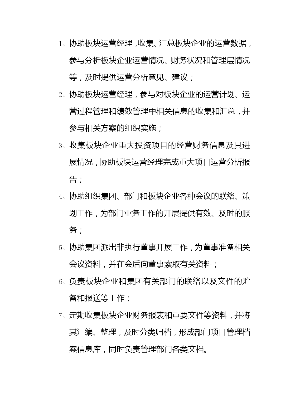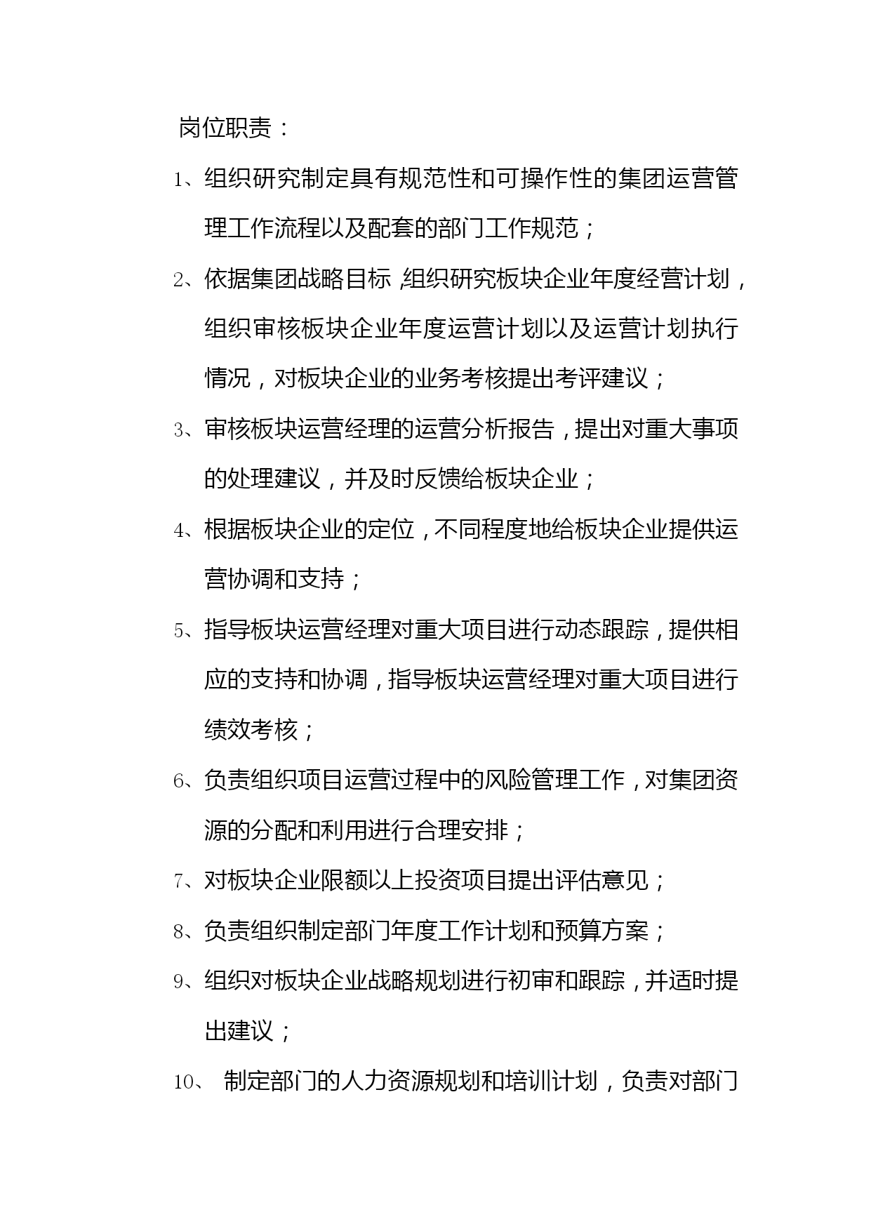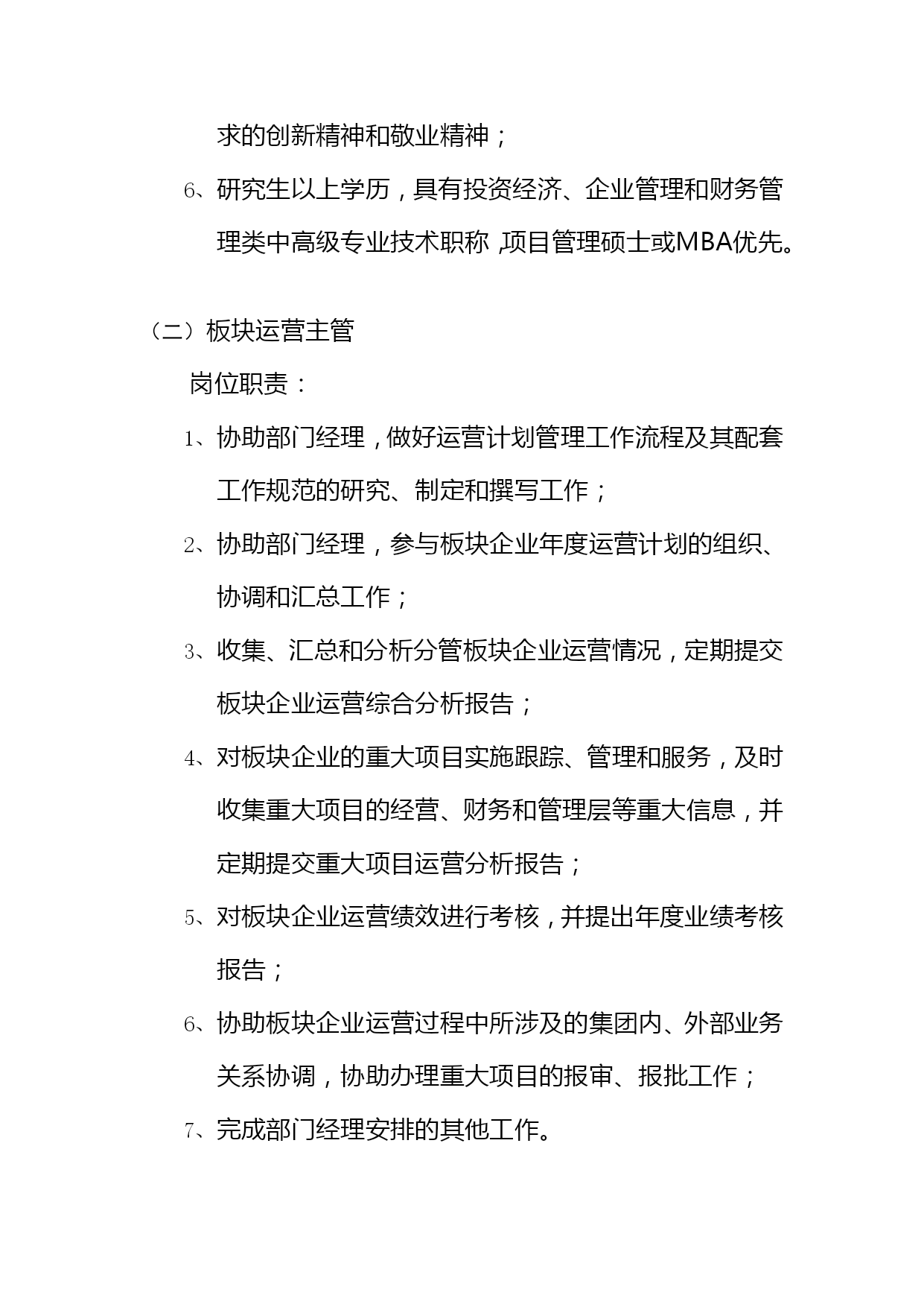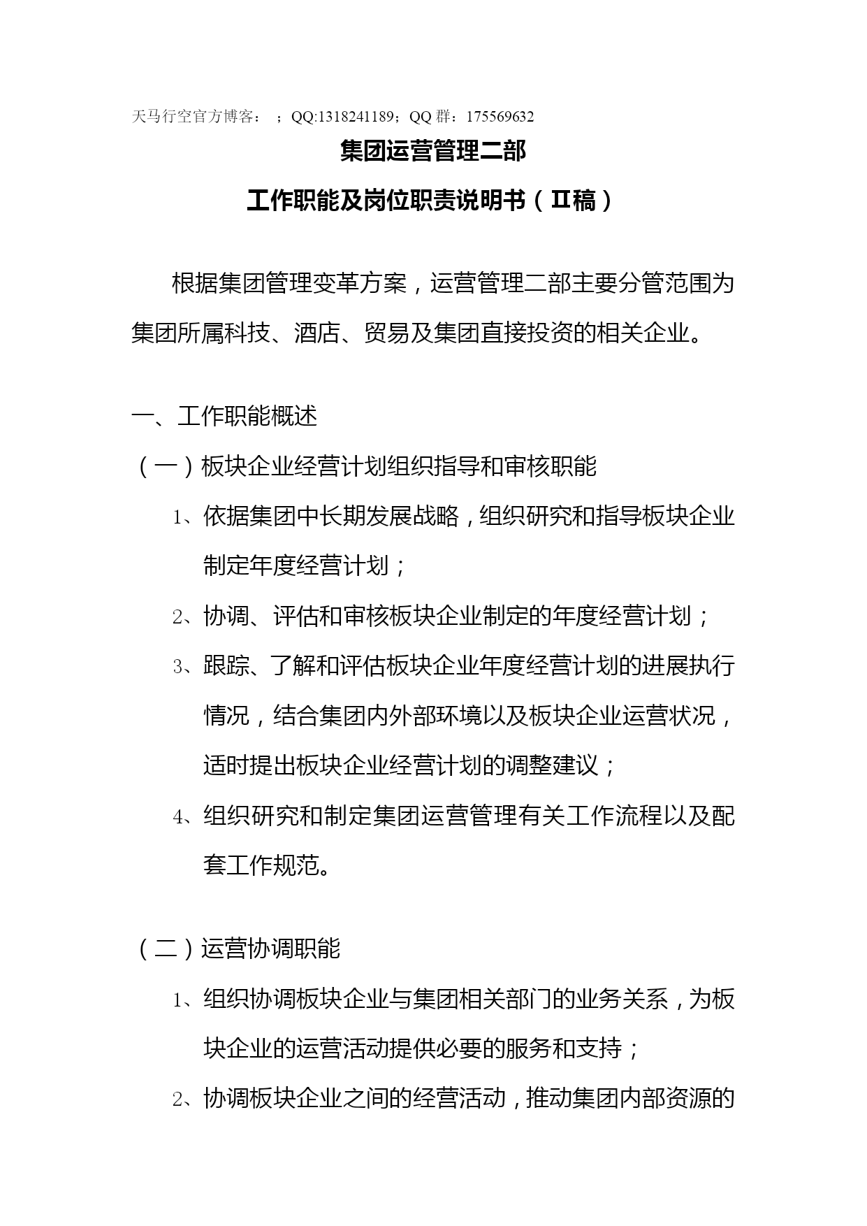 运营部工作职能及岗位职责说明书汇编(完整版)资料(可以直接使用,可编辑优秀版资料,欢迎下载)天马行空官方博客:;QQ:1318241189;QQ群:175569632集团运营管理二部工作职能及岗位职责说明书(Ⅱ稿)根据集团管理变革方案,运营管理二部主要分管范围为集团所属科技、酒店、贸易及集团直接投资的相关企业。一、工作职能概述(一)板块企业经营计划组织指导和审核职能依据集团中长期发展战略,组织研究和指导板块企业制定年度经营计划;协调、评估和审核板块企业制定的年度经营计划;跟踪、了解和评估板块企业年度经营计划的进展执行情况,结合集团内外部环境以及板块企业运营状况,适时提出板块企业经营计划的调整建议;组织研究和制定集团运营管理有关工作流程以及配套工作规范。(二)运营协调职能组织协调板块企业与集团相关部门的业务关系,为板块企业的运营活动提供必要的服务和支持;协调板块企业之间的经营活动,推动集团内部资源的共享与整合,实现整体价值的最大化;负责板块企业业务运营过程中需以集团名义与政府部门建立联系的业务协调,包括对外进行的运营联络及报审报批事项的协调工作。(三)运营风险监督职能收集、汇总板块企业的运营信息,为集团管理层提供决策信息支持;组织分析板块企业运营信息,对板块企业重大事项进行动态跟踪和管理;跟踪、了解板块企业的经营活动和进展情况,及时有效地发现运营风险;跟踪、检查集团董事会或集团管理层审批的有关板块企业运营方案的实施进展情况。运营绩效管理职能检查、监督板块企业实施集团运营管理工作流程及配套工作制度的执行情况;跟踪、检查和评估板块企业运营进展情况以及经营绩效指标的完成情况;负责对板块企业的运营业绩考核,并提出考核意见。重大项目跟踪管理职能跟踪管理集团重大项目实施进展情况,提供必要的运营支持。板块企业限额以上投资项目评审职能组织对板块企业限额以上投资项目进行项目评估和报审报批工作,确保板块业务与集团战略布局的一致性;跟踪、管理板块企业限额以上投资项目实施进展情况,提供必要的运营支持。集团派出非执行董事业务管理职能负责对集团派出非执行董事工作流程和工作规范的研究与制定工作;负责集团派出非执行董事的业务协调管理;负责对集团非执行董事业务绩效进行考核,并提出考核意见。二、岗位设置、岗位职责和任职条件部门经理岗位职责:组织研究制定具有规范性和可操作性的集团运营管理工作流程以及配套的部门工作规范;依据集团战略目标,组织研究板块企业年度经营计划,组织审核板块企业年度运营计划以及运营计划执行情况,对板块企业的业务考核提出考评建议;审核板块运营经理的运营分析报告,提出对重大事项的处理建议,并及时反馈给板块企业;根据板块企业的定位,不同程度地给板块企业提供运营协调和支持;指导板块运营经理对重大项目进行动态跟踪,提供相应的支持和协调,指导板块运营经理对重大项目进行绩效考核;负责组织项目运营过程中的风险管理工作,对集团资源的分配和利用进行合理安排;对板块企业限额以上投资项目提出评估意见;负责组织制定部门年度工作计划和预算方案;组织对板块企业战略规划进行初审和跟踪,并适时提出建议;制定部门的人力资源规划和培训计划,负责对部门人员的日常管理和工作协调,提出业绩考核指标和评价建议;根据集团战略,制定部门年度工作计划和预算方案;负责部门与集团其它部门、部门与板块企业之间的工作协调;对集团派出非执行董事进行统一管理,对其工作给予适当的指导;组织落实集团管理层交办的有关工作。任职资格及条件:10年及以上国家机关或大型企业工作经历,至少3年以上的中高层企业管理工作经验;熟悉现代企业的经营管理模式,精通大、中型企业的经营运作流程;具有较强的业务能力与丰富的的行业专业知识;善于沟通、交流,有较强的书面和口头表达能力,有较强的团队领导能力、分析判断能力、业务规划能力和综合协调能力;理解公司使命、价值观、经营理念和企业文化,忠诚敬业,使命感和责任心强,具有适应现代大型企业要求的创新精神和敬业精神;研究生以上学历,具有投资经济、企业管理和财务管理类中高级专业技术职称,项目管理硕士或MBA优先。板块运营主管岗位职责:协助部门经理,做好运营计划管理工作流程及其配套工作规范的研究、制定和撰写工作;协助部门经理,参与板块企业年度运营计划的组织、协调和汇总工作;收集、汇总和分析分管板块企业运营情况,定期提交板块企业运营综合分析报告;对板块企业的重大项目实施跟踪、管理和服务,及时收集重大项目的经营、财务和管理层等重大信息,并定期提交重大项目运营分析报告;对板块企业运营绩效进行考核,并提出年度业绩考核报告;协助板块企业运营过程中