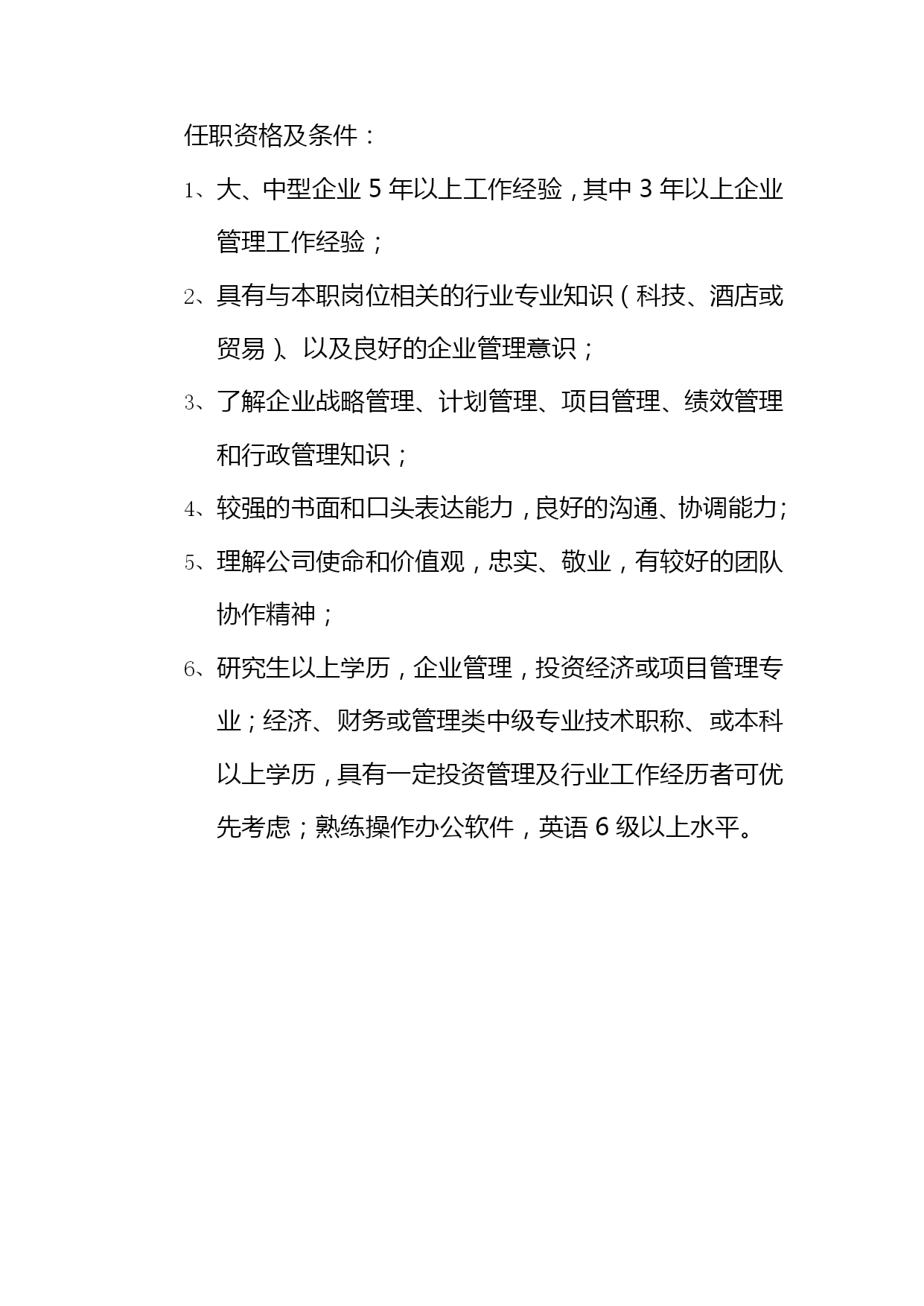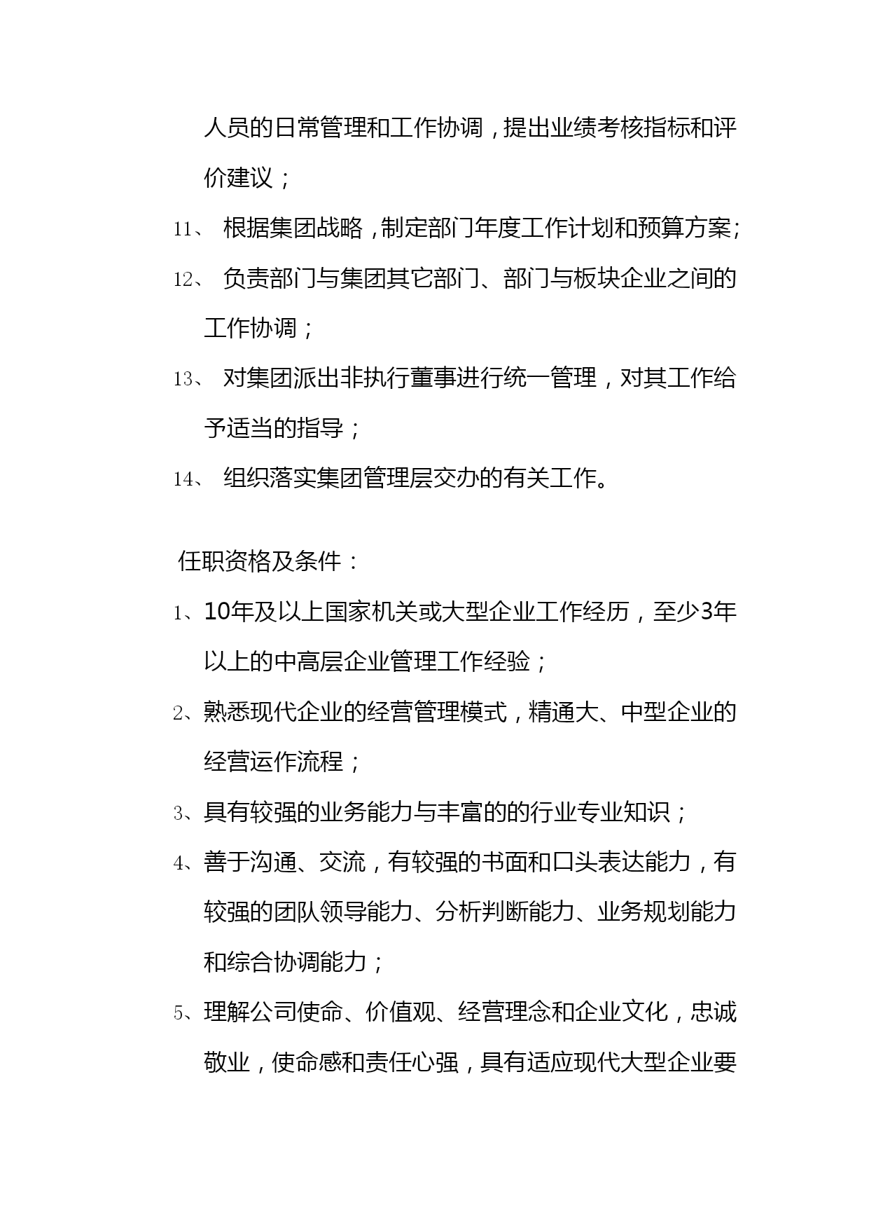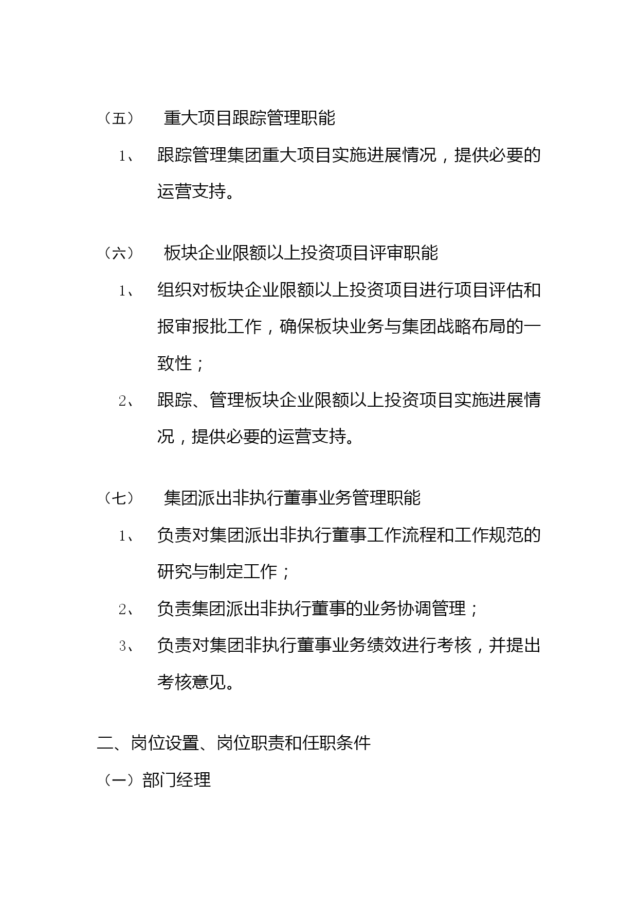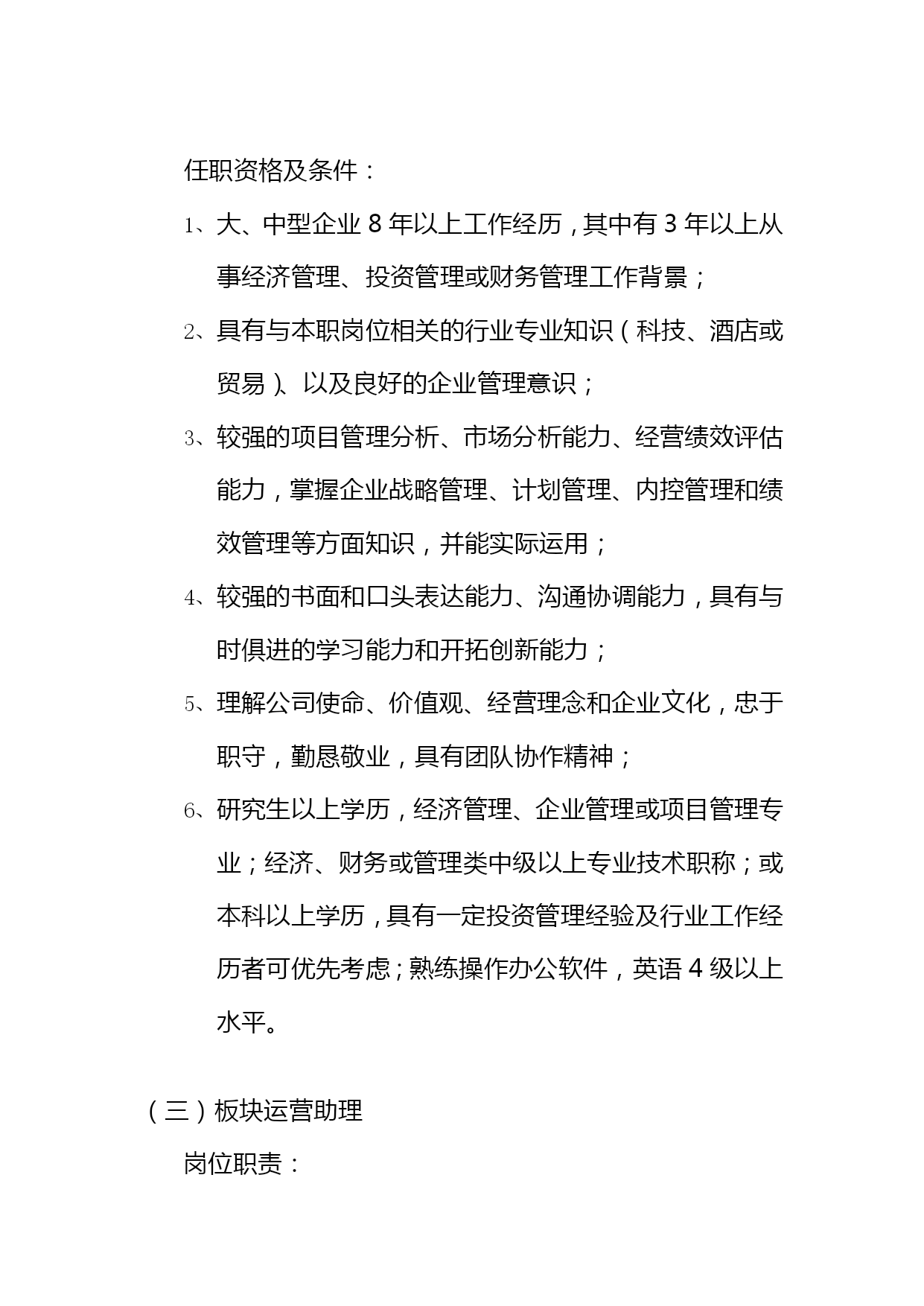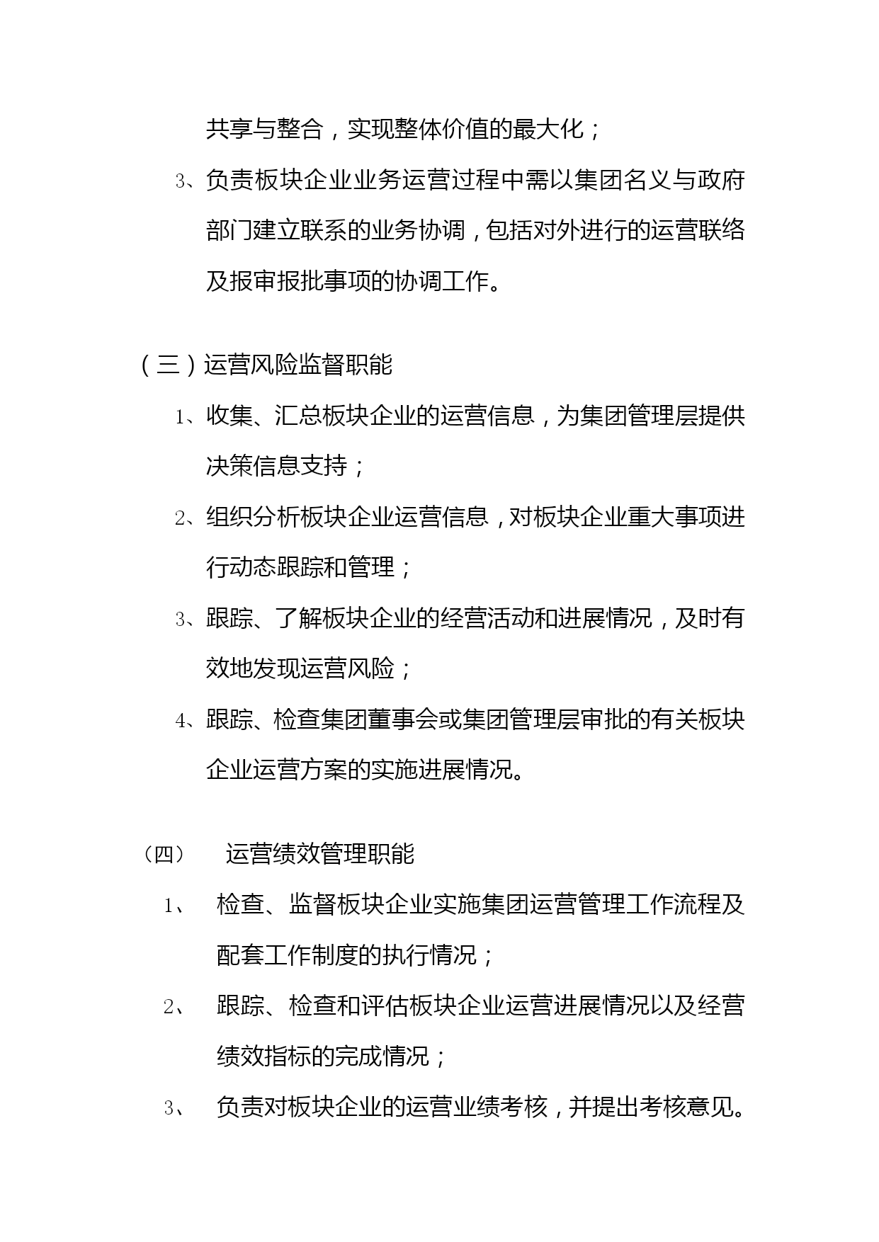 运营部工作职能及岗位职责说明书汇编(完整版)资料(可以直接使用,可编辑优秀版资料,欢迎下载)天马行空官方博客:;QQ:1318241189;QQ群:175569632集团运营管理二部工作职能及岗位职责说明书(Ⅱ稿)根据集团管理变革方案,运营管理二部主要分管范围为集团所属科技、酒店、贸易及集团直接投资的相关企业。一、工作职能概述(一)板块企业经营计划组织指导和审核职能依据集团中长期发展战略,组织研究和指导板块企业制定年度经营计划;协调、评估和审核板块企业制定的年度经营计划;跟踪、了解和评估板块企业年度经营计划的进展执行情况,结合集团内外部环境以及板块企业运营状况,适时提出板块企业经营计划的调整建议;组织研究和制定集团运营管理有关工作流程以及配套工作规范。(二)运营协调职能组织协调板块企业与集团相关部门的业务关系,为板块企业的运营活动提供必要的服务和支持;协调板块企业之间的经营活动,推动集团内部资源的共享与整合,实现整体价值的最大化;负责板块企业业务运营过程中需以集团名义与政府部门建立联系的业务协调,包括对外进行的运营联络及报审报批事项的协调工作。(三)运营风险监督职能收集、汇总板块企业的运营信息,为集团管理层提供决策信息支持;组织分析板块企业运营信息,对板块企业重大事项进行动态跟踪和管理;跟踪、了解板块企业的经营活动和进展情况,及时有效地发现运营风险;跟踪、检查集团董事会或集团管理层审批的有关板块企业运营方案的实施进展情况。运营绩效管理职能检查、监督板块企业实施集团运营管理工作流程及配套工作制度的执行情况;跟踪、检查和评估板块企业运营进展情况以及经营绩效指标的完成情况;负责对板块企业的运营业绩考核,并提出考核意见。重大项目跟踪管理职能跟踪管理集团重大项目实施进展情况,提供必要的运营支持。板块企业限额以上投资项目评审职能组织对板块企业限额以上投资项目进行项目评估和报审报批工作,确保板块业务与集团战略布局的一致性;跟踪、管理板块企业限额以上投资项目实施进展情况,提供必要的运营支持。集团派出非执行董事业务管理职能负责对集团派出非执行董事工作流程和工作规范的研究与制定工作;负责集团派出非执行董事的业务协调管理;负责对集团非执行董事业务绩效进行考核,并提出考核意见。二、岗位设置、岗位职责和任职条件部门经理岗位职责:组织研究制定具有规范性和可操作性的集团运营管理工作流程以及配套的部门工作规范;依据集团战略目标,组织研究板块企业年度经营计划,组织审核板块企业年度运营计划以及运营计划执行情况,对板块企业的业务考核提出考评建议;审核板块运营经理的运营分析报告,提出对重大事项的处理建议,并及时反馈给板块企业;根据板块企业的定位,不同程度地给板块企业提供运营协调和支持;指导板块运营经理对重大项目进行动态跟踪,提供相应的支持和协调,指导板块运营经理对重大项目进行绩效考核;负责组织项目运营过程中的风险管理工作,对集团资源的分配和利用进行合理安排;对板块企业限额以上投资项目提出评估意见;负责组织制定部门年度工作计划和预算方案;组织对板块企业战略规划进行初审和跟踪,并适时提出建议;制定部门的人力资源规划和培训计划,负责对部门人员的日常管理和工作协调,提出业绩考核指标和评价建议;根据集团战略,制定部门年度工作计划和预算方案;负责部门与集团其它部门、部门与板块企业之间的工作协调;对集团派出非执行董事进行统一管理,对其工作给予适当的指导;组织落实集团管理层交办的有关工作。任职资格及条件:10年及以上国家机关或大型企业工作经历,至少3年以上的中高层企业管理工作经验;熟悉现代企业的经营管理模式,精通大、中型企业的经营运作流程;具有较强的业务能力与丰富的的行业专业知识;善于沟通、交流,有较强的书面和口头表达能力,有较强的团队领导能力、分析判断能力、业务规划能力和综合协调能力;理解公司使命、价值观、经营理念和企业文化,忠诚敬业,使命感和责任心强,具有适应现代大型企业要求的创新精神和敬业精神;研究生以上学历,具有投资经济、企业管理和财务管理类中高级专业技术职称,项目管理硕士或MBA优先。板块运营主管岗位职责:协助部门经理,做好运营计划管理工作流程及其配套工作规范的研究、制定和撰写工作;协助部门经理,参与板块企业年度运营计划的组织、协调和汇总工作;收集、汇总和分析分管板块企业运营情况,定期提交板块企业运营综合分析报告;对板块企业的重大项目实施跟踪、管理和服务,及时收集重大项目的经营、财务和管理层等重大信息,并定期提交重大项目运营分析报告;对板块企业运营绩效进行考核,并提出年度业绩考核报告;协助板块企业运营过程中