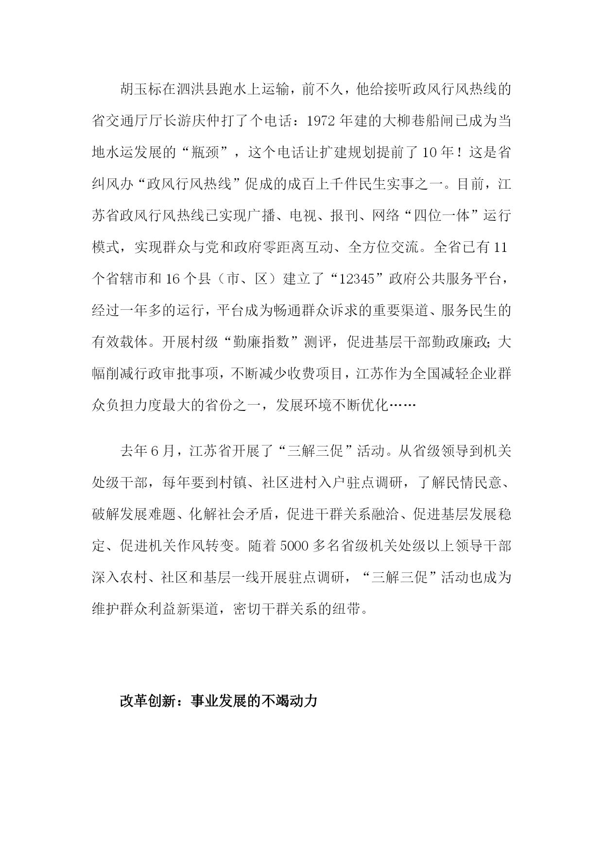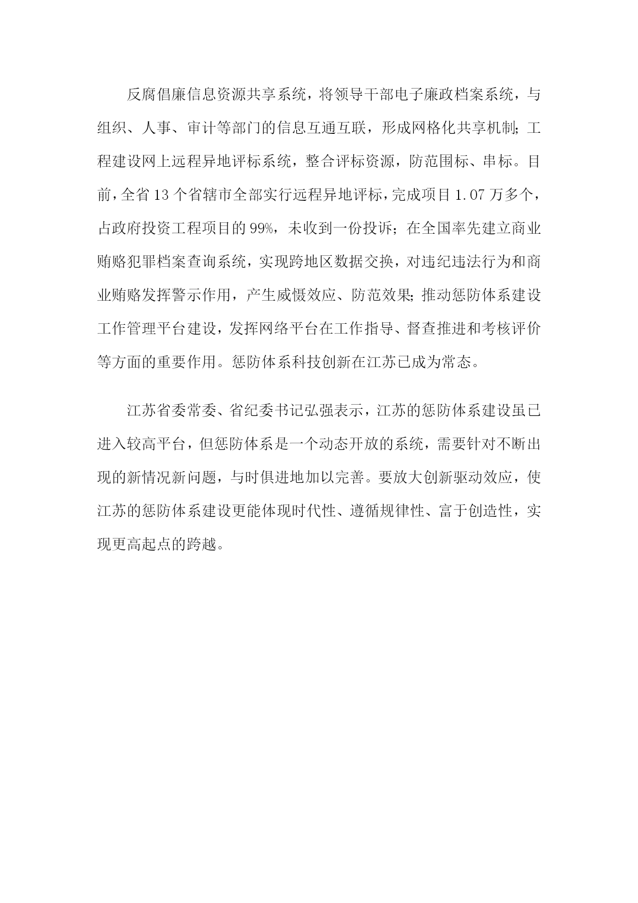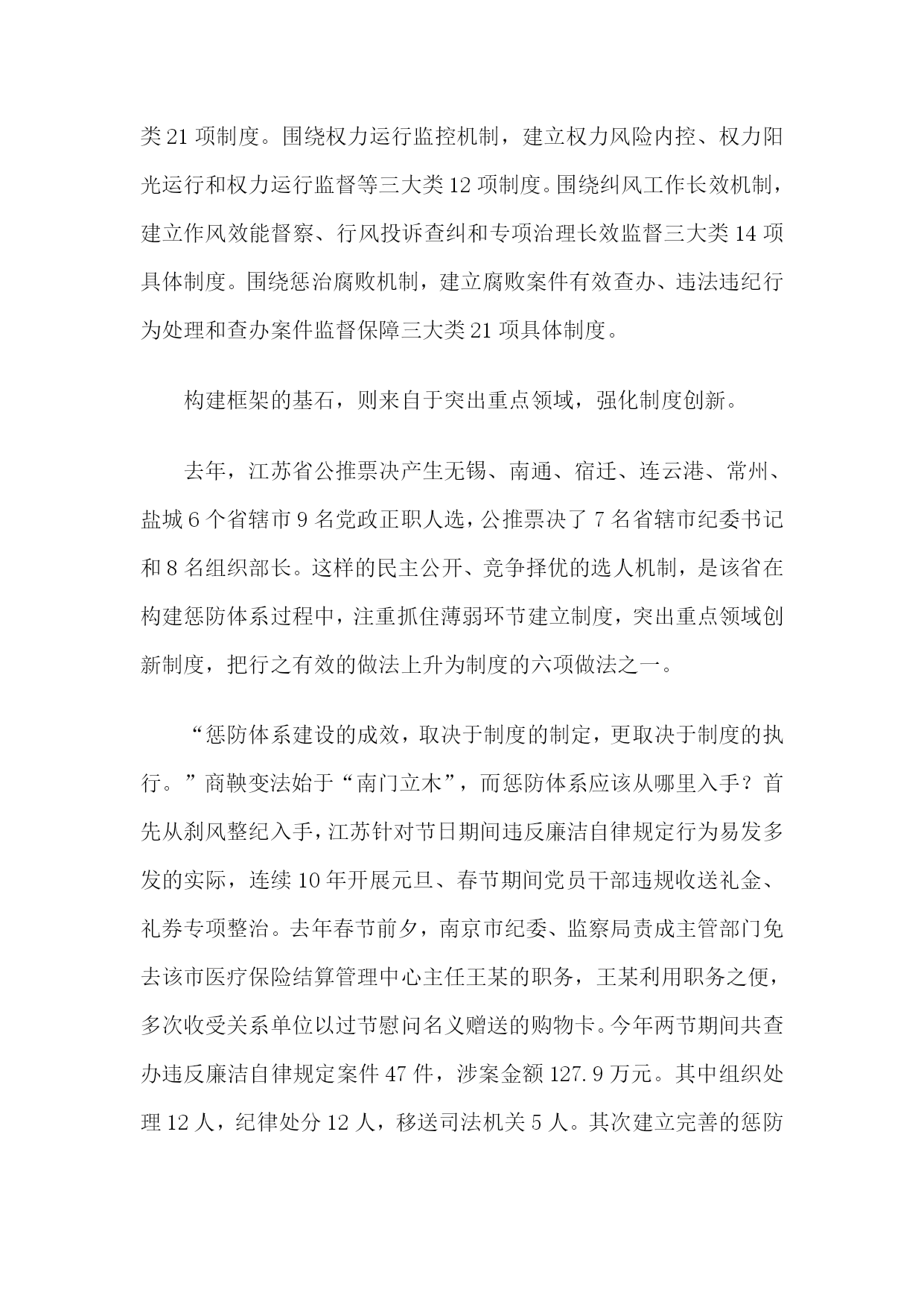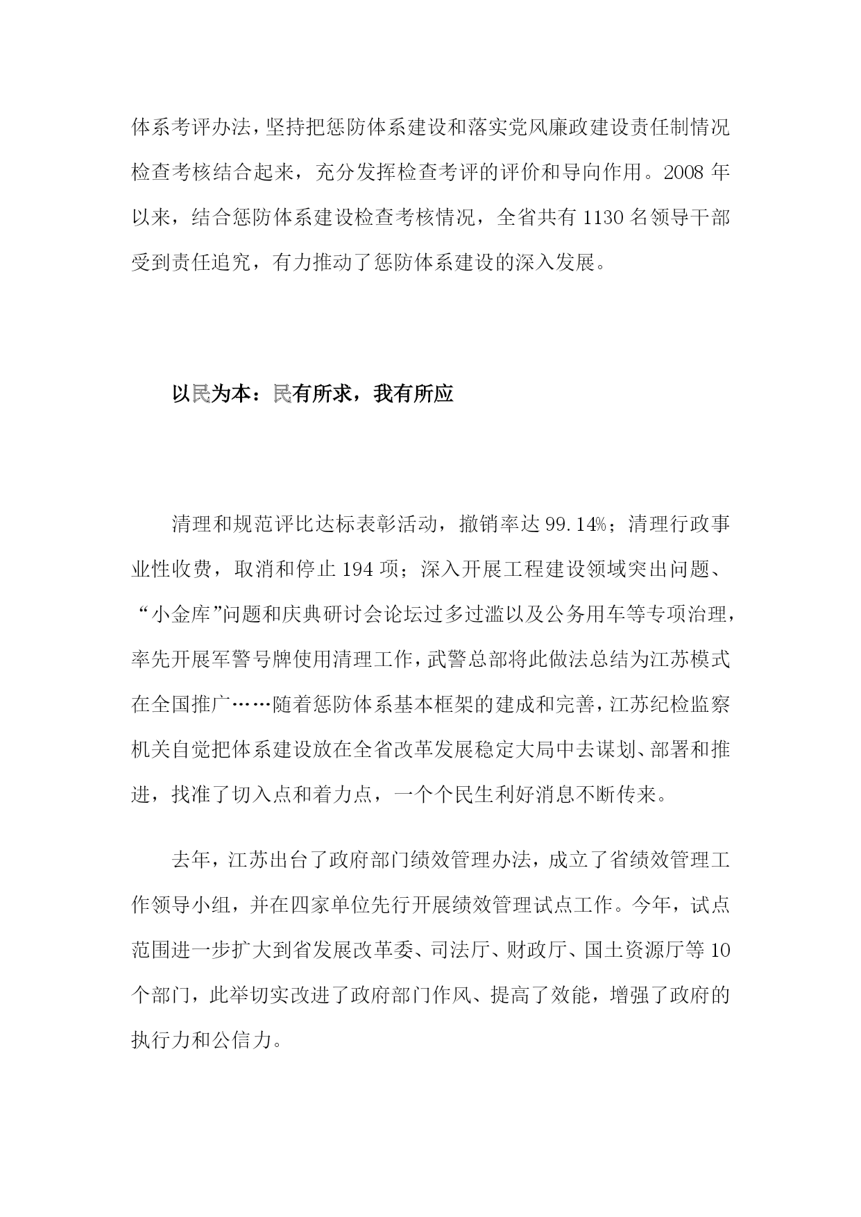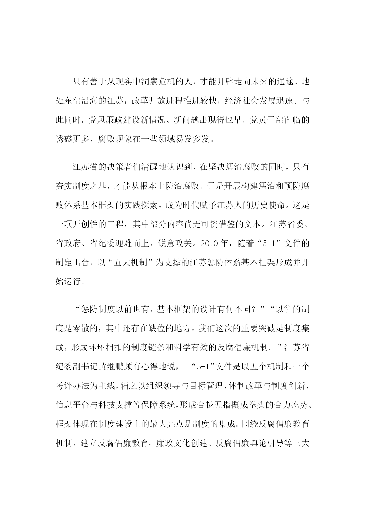江苏省构建惩治和预防腐败体系的创新实践来源:中国纪检监察报时间:2012-08-0709:19本报记者陈晓哲陈凌燕这是一组令人振奋的数据:江苏省以占全国1.06%的国土面积,承载着全国6%的人口和10%的经济总量,人均GDP超过7750美元,实现了率先进入小康社会的目标;这是令人感动的场景:从省委书记、省长到处级干部都要到基层蹲点调研,他们进村入户,吃农家饭、住农家屋、干农家活、话农家事,与基层干部群众共谋发展、共破难题;这是郑重的承诺:经济建设走在全国的前列,纪检监察工作决不能落后——与时俱进、引领风气之先的江苏人,于2010年率先构建了集反腐倡廉教育机制、权力运行监控机制、预防腐败工作机制、纠风工作长效机制、惩治腐败工作机制和工作考评办法的“5+1”体系,标志着惩治和预防腐败体系基本框架在江苏构建起来。这一目标的实现,比全国的时间表提前了两年。“南门立木”:既要科学构建制度,又要严格落实制度只有善于从现实中洞察危机的人,才能开辟走向未来的通途。地处东部沿海的江苏,改革开放进程推进较快,经济社会发展迅速。与此同时,党风廉政建设新情况、新问题出现得也早,党员干部面临的诱惑更多,腐败现象在一些领域易发多发。江苏省的决策者们清醒地认识到,在坚决惩治腐败的同时,只有夯实制度之基,才能从根本上防治腐败。于是开展构建惩治和预防腐败体系基本框架的实践探索,成为时代赋予江苏人的历史使命。这是一项开创性的工程,其中部分内容尚无可资借鉴的文本。江苏省委、省政府、省纪委迎难而上,锐意攻关。2010年,随着“5+1”文件的制定出台,以“五大机制”为支撑的江苏惩防体系基本框架形成并开始运行。“惩防制度以前也有,基本框架的设计有何不同?”“以往的制度是零散的,其中还存在缺位的地方。我们这次的重要突破是制度集成,形成环环相扣的制度链条和科学有效的反腐倡廉机制。”江苏省纪委副书记黄继鹏颇有心得地说,“5+1”文件是以五个机制和一个考评办法为主线,辅之以组织领导与目标管理、体制改革与制度创新、信息平台与科技支撑等保障系统,形成合拢五指攥成拳头的合力态势。框架体现在制度建设上的最大亮点是制度的集成。围绕反腐倡廉教育机制,建立反腐倡廉教育、廉政文化创建、反腐倡廉舆论引导等三大类21项制度。围绕权力运行监控机制,建立权力风险内控、权力阳光运行和权力运行监督等三大类12项制度。围绕纠风工作长效机制,建立作风效能督察、行风投诉查纠和专项治理长效监督三大类14项具体制度。围绕惩治腐败机制,建立腐败案件有效查办、违法违纪行为处理和查办案件监督保障三大类21项具体制度。构建框架的基石,则来自于突出重点领域,强化制度创新。去年,江苏省公推票决产生无锡、南通、宿迁、连云港、常州、盐城6个省辖市9名党政正职人选,公推票决了7名省辖市纪委书记和8名组织部长。这样的民主公开、竞争择优的选人机制,是该省在构建惩防体系过程中,注重抓住薄弱环节建立制度,突出重点领域创新制度,把行之有效的做法上升为制度的六项做法之一。“惩防体系建设的成效,取决于制度的制定,更取决于制度的执行。”商鞅变法始于“南门立木”,而惩防体系应该从哪里入手?首先从刹风整纪入手,江苏针对节日期间违反廉洁自律规定行为易发多发的实际,连续10年开展元旦、春节期间党员干部违规收送礼金、礼券专项整治。去年春节前夕,南京市纪委、监察局责成主管部门免去该市医疗保险结算管理中心主任王某的职务,王某利用职务之便,多次收受关系单位以过节慰问名义赠送的购物卡。今年两节期间共查办违反廉洁自律规定案件47件,涉案金额127.9万元。其中组织处理12人,纪律处分12人,移送司法机关5人。其次建立完善的惩防体系考评办法,坚持把惩防体系建设和落实党风廉政建设责任制情况检查考核结合起来,充分发挥检查考评的评价和导向作用。2008年以来,结合惩防体系建设检查考核情况,全省共有1130名领导干部受到责任追究,有力推动了惩防体系建设的深入发展。以民为本:民有所求,我有所应清理和规范评比达标表彰活动,撤销率达99.14%;清理行政事业性收费,取消和停止194项;深入开展工程建设领域突出问题、“小金库”问题和庆典研讨会论坛过多过滥以及公务用车等专项治理,率先开展军警号牌使用清理工作,武警总部将此做法总结为江苏模式在全国推广……随着惩防体系基本框架的建成和完善,江苏纪检监察机关自觉把体系建设放在全省改革发展稳定大局中去谋划、部署和推进,找准了切入点和着力点,一个个民生利好消息不断传来。去年,江苏出台了政府部门绩效管理办法,成立了省绩效管理工作领导小组,并在四家单位先行开展绩效管理试点工作。今年,试点范围进一步扩大到省发展改革委、司法厅、财政厅、国土资源厅等10个部门,此举切实改进了政府部门作风、提高了效能,增强了政府的执行力和